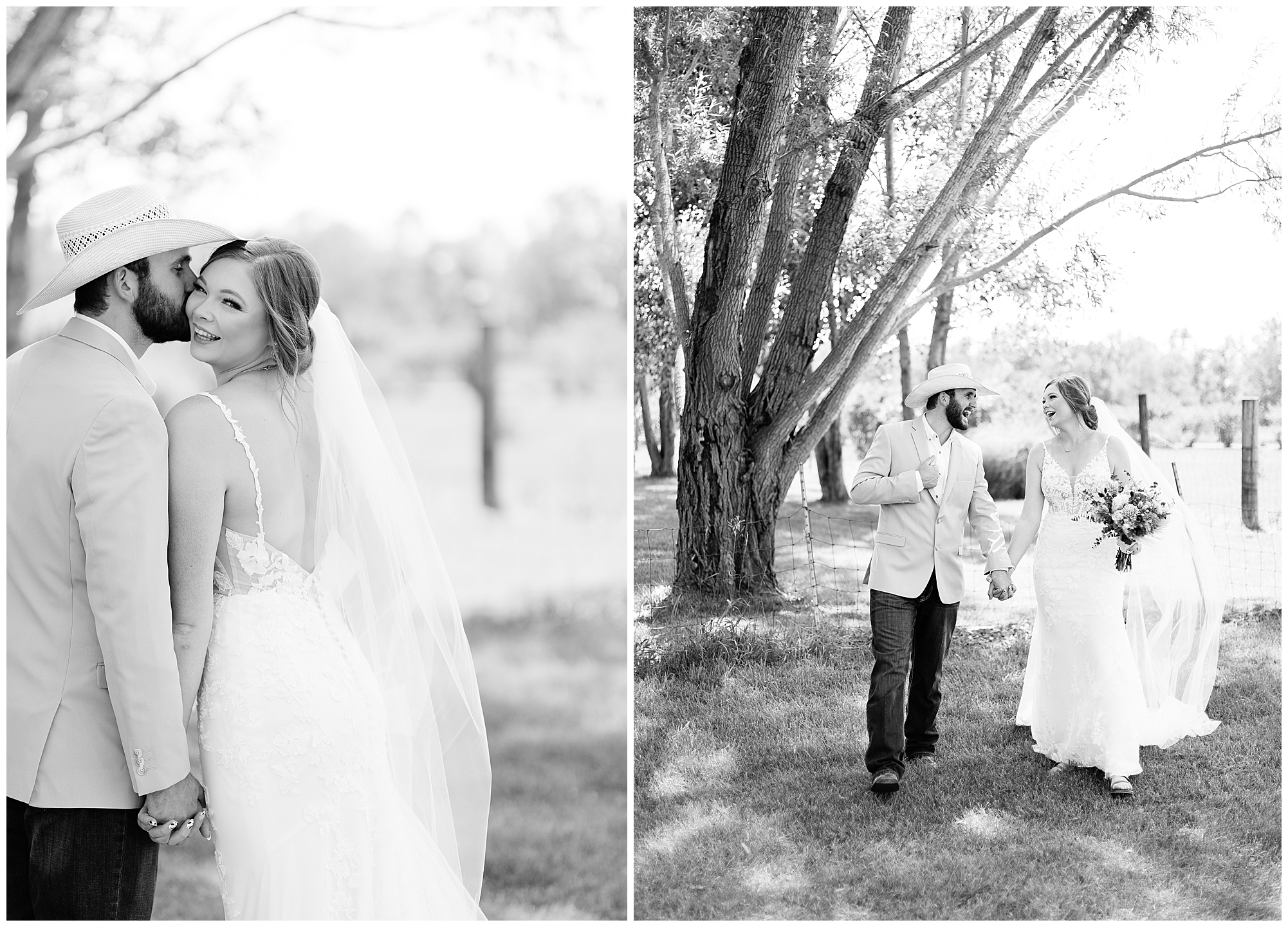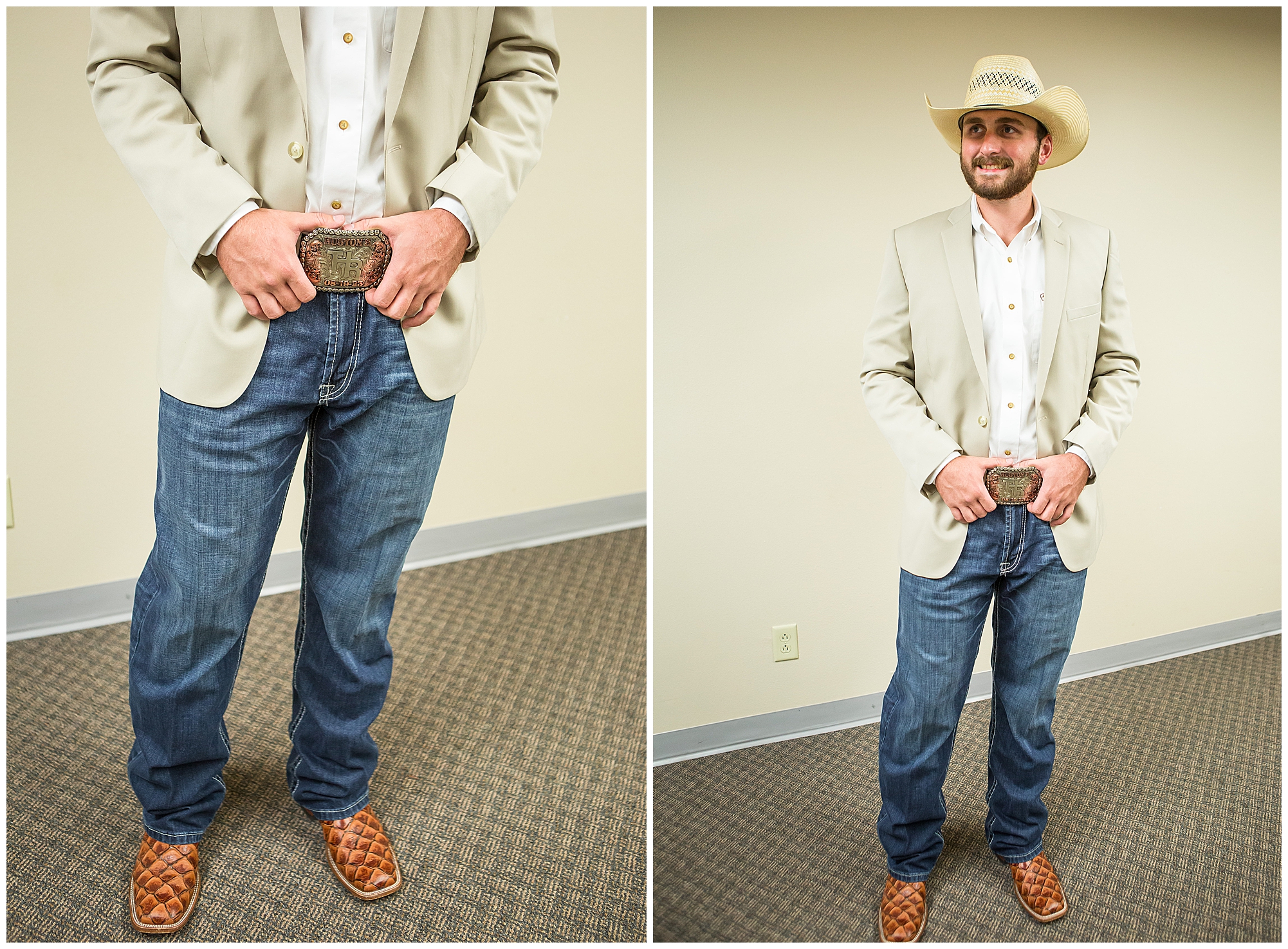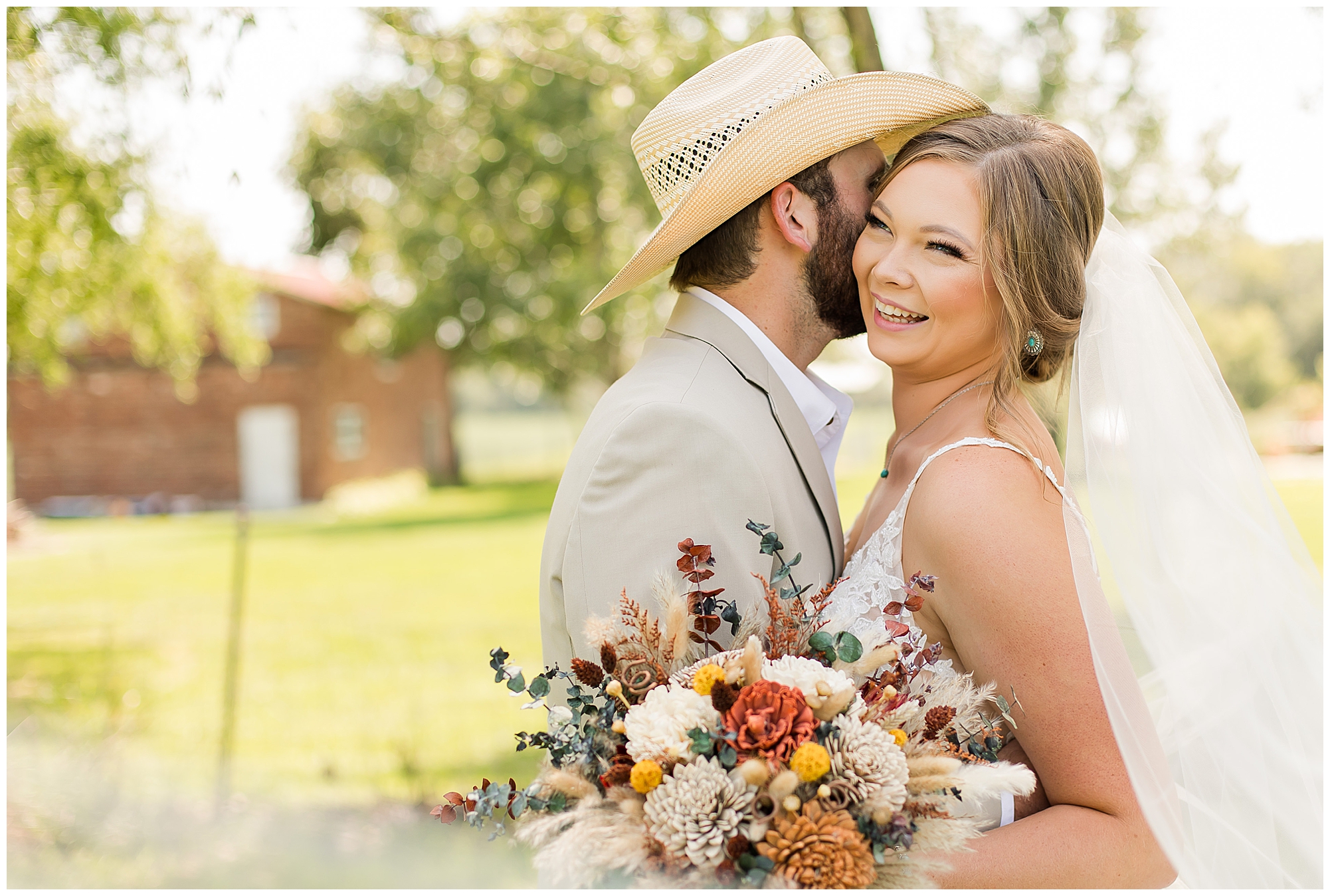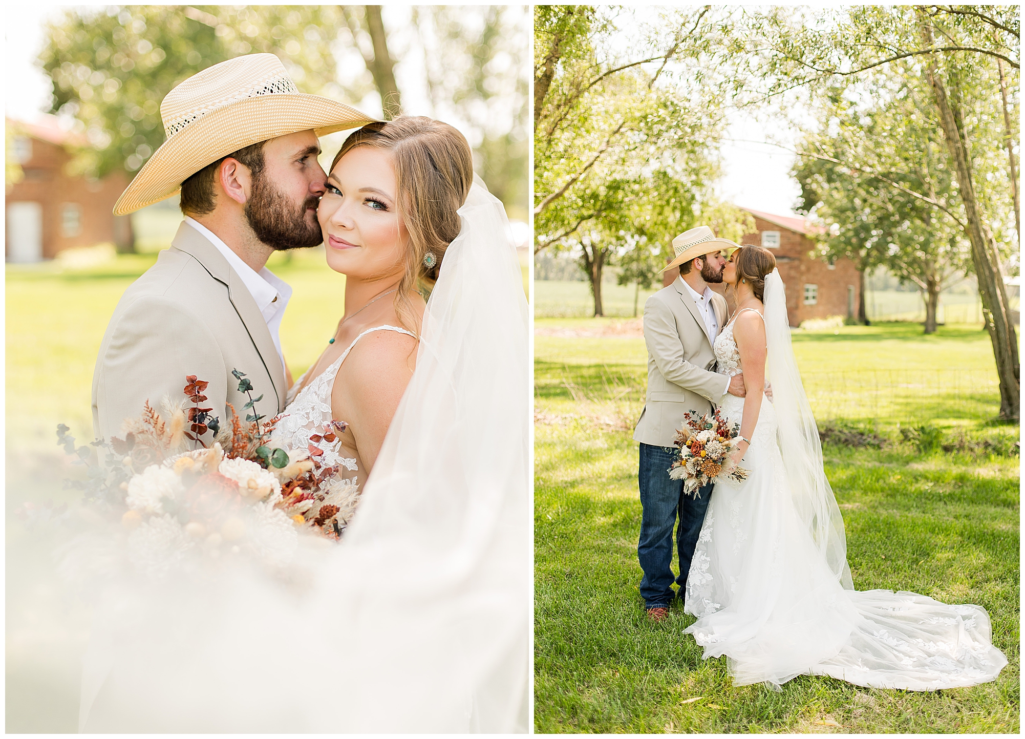 Then it was Trace’s turn. In true cowboy fashion, he donned his blue jeans, a crisp button-down collared shirt, a tan suit jacket, and his trusty hat. And of course, he couldn’t forget his belt buckle, which was custom made with his and Becca’s brand. If you look closely, you can see his “T” for Trace, their “H” for Huston, and her “R” for Rebecca in the brand. This amazing touch was found throughout the day on the groomsmen’s hats, the save the dates, and their iron brand seared on several items of meaning. The time then came for Becca and Trace to see one another. Becca couldn’t resist giving Trace a little pinch on the butt to get his attention before he turned around to see his bride! They took a few moments to check one another out and steal a few kisses before we began portrait time. Their crew brought a fun element to the day and looked awesome with their combination of orange, tan, and fall colors in the bouquets, which were handmade by the bride! And even though it was hot and a tad windy, everyone did fantastic and their true joy showed! Once we were done with the whole bridal party, we took some time with just Becca and Trace and they were simply delightful together. The way he looks at her, takes her hand, and the way she giggles at all things he does are so genuinely sweet. And boy…did we have fun playing with that veil!