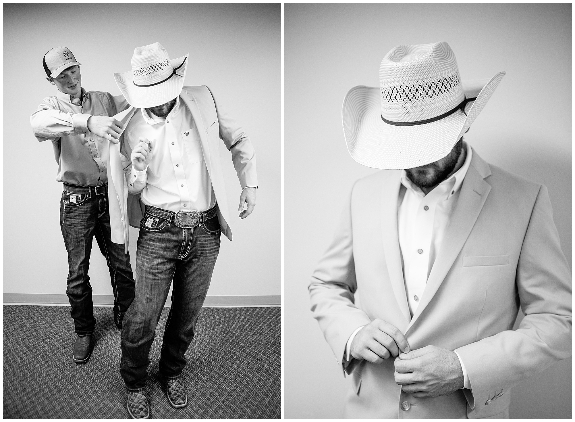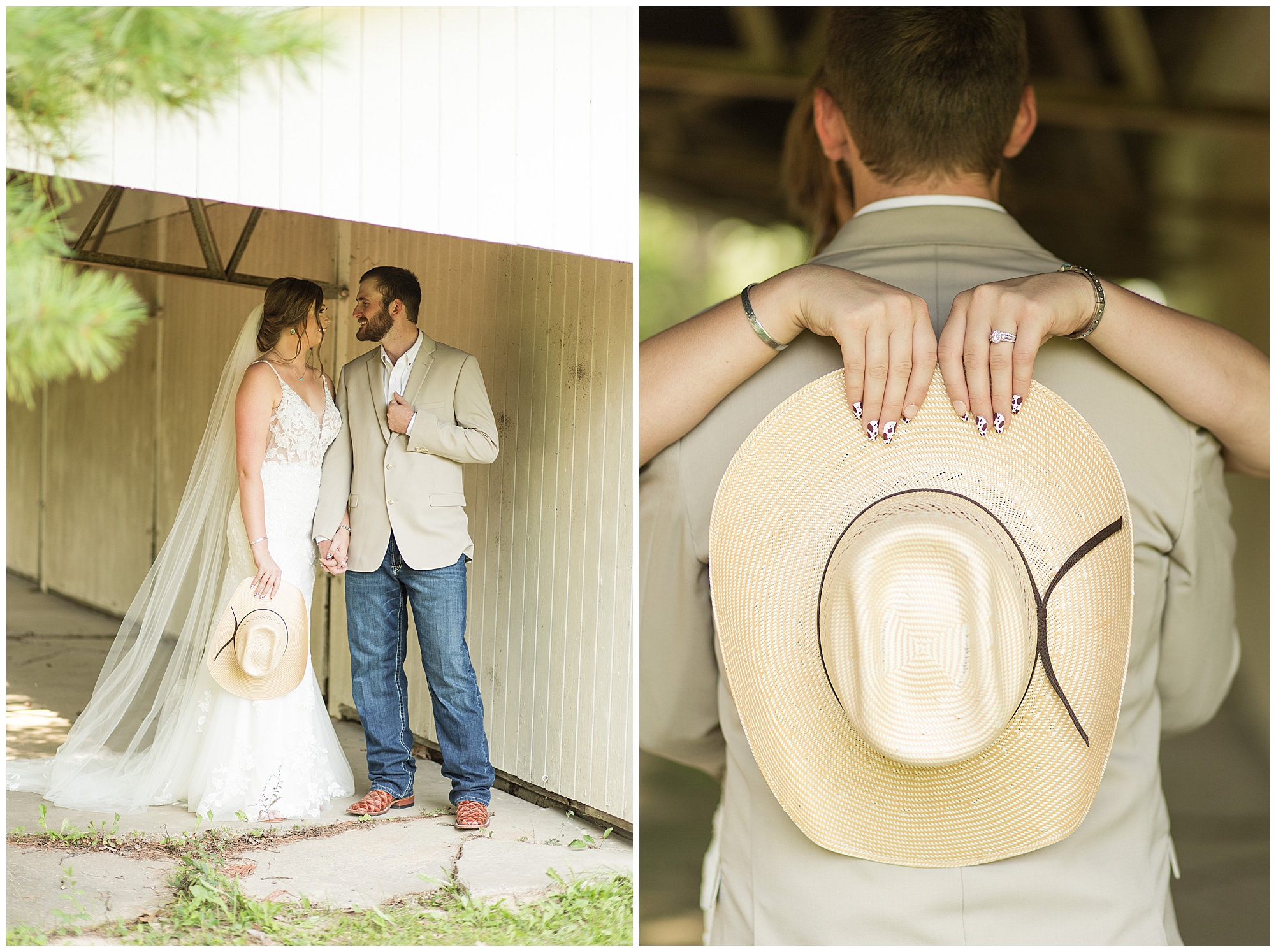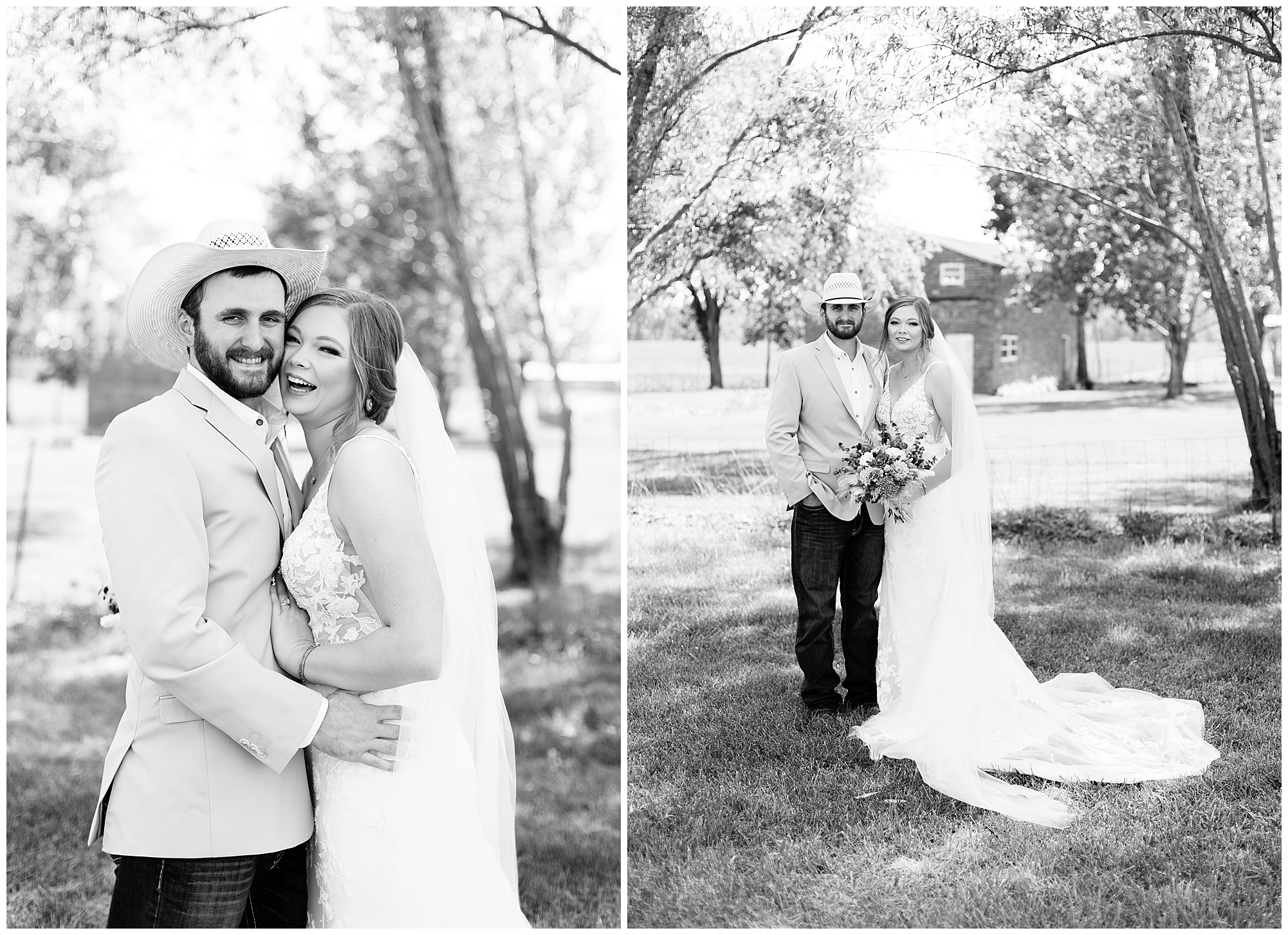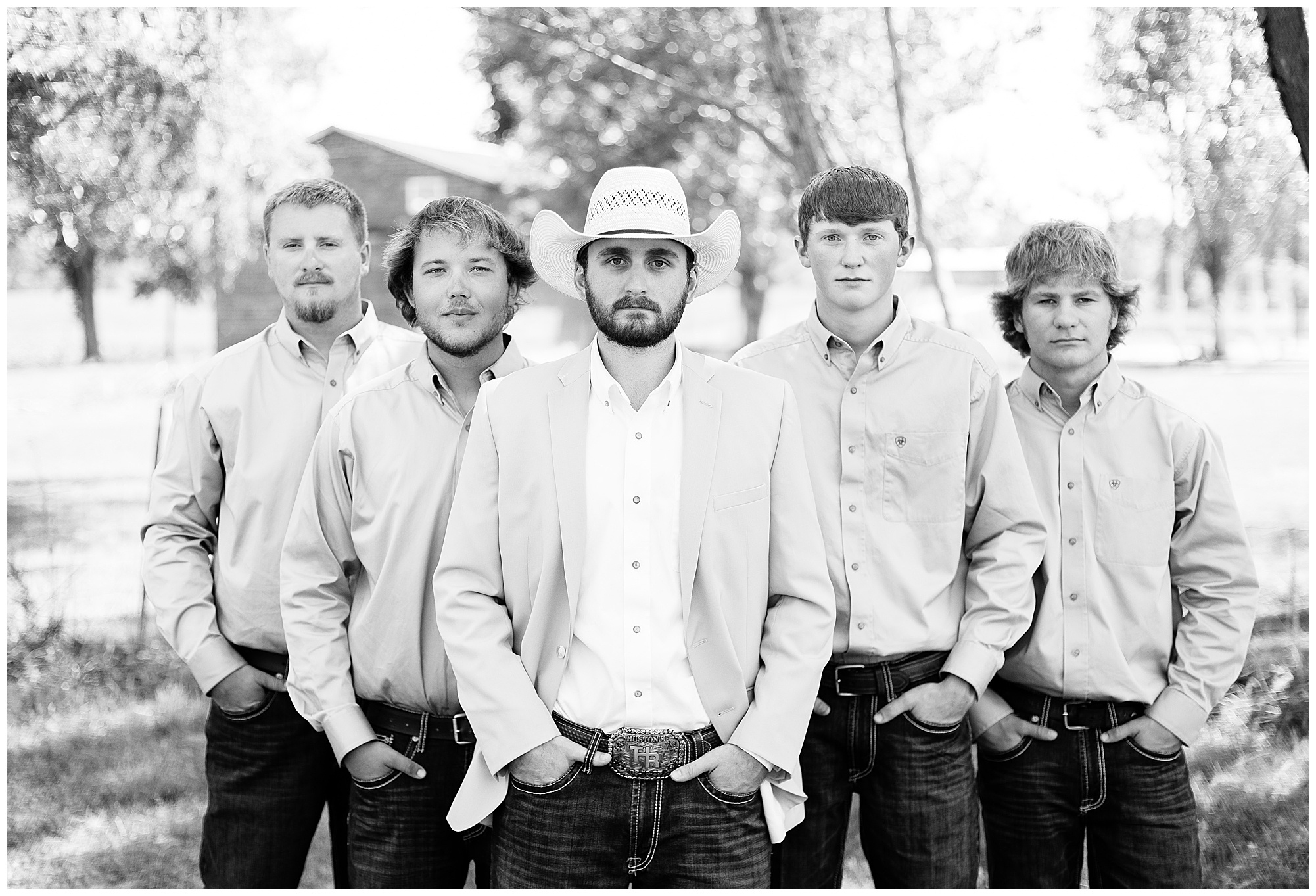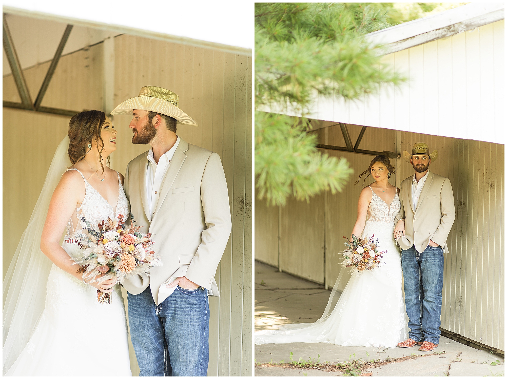 Then it was Trace’s turn. In true cowboy fashion, he donned his blue jeans, a crisp button-down collared shirt, a tan suit jacket, and his trusty hat. And of course, he couldn’t forget his belt buckle, which was custom made with his and Becca’s brand. If you look closely, you can see his “T” for Trace, their “H” for Huston, and her “R” for Rebecca in the brand. This amazing touch was found throughout the day on the groomsmen’s hats, the save the dates, and their iron brand seared on several items of meaning. The time then came for Becca and Trace to see one another. Becca couldn’t resist giving Trace a little pinch on the butt to get his attention before he turned around to see his bride! They took a few moments to check one another out and steal a few kisses before we began portrait time. Their crew brought a fun element to the day and looked awesome with their combination of orange, tan, and fall colors in the bouquets, which were handmade by the bride! And even though it was hot and a tad windy, everyone did fantastic and their true joy showed! Once we were done with the whole bridal party, we took some time with just Becca and Trace and they were simply delightful together. The way he looks at her, takes her hand, and the way she giggles at all things he does are so genuinely sweet. And boy…did we have fun playing with that veil!