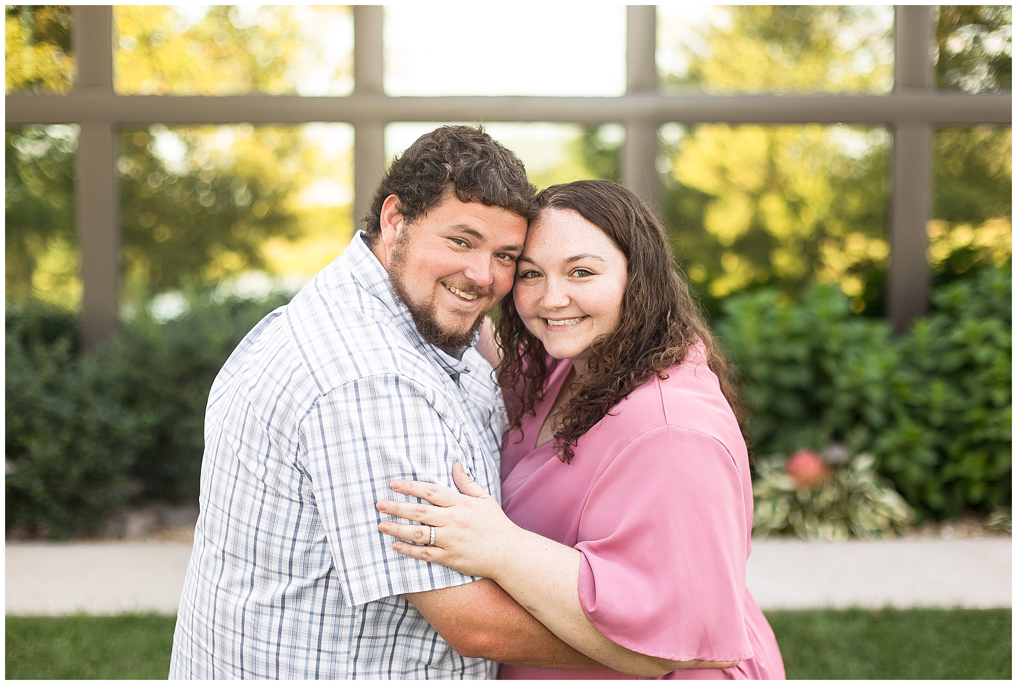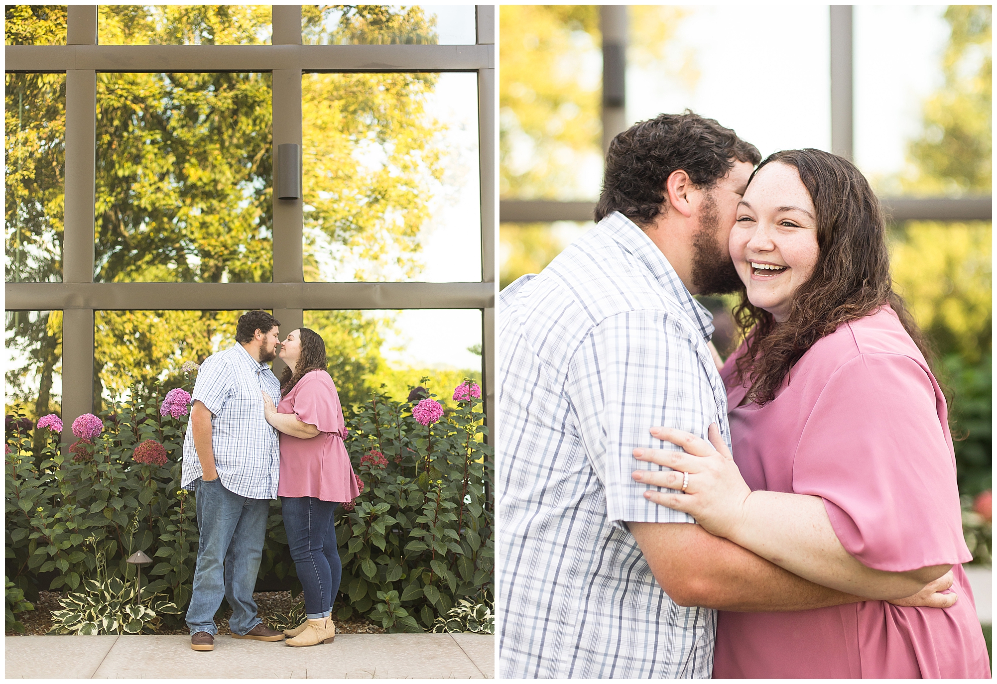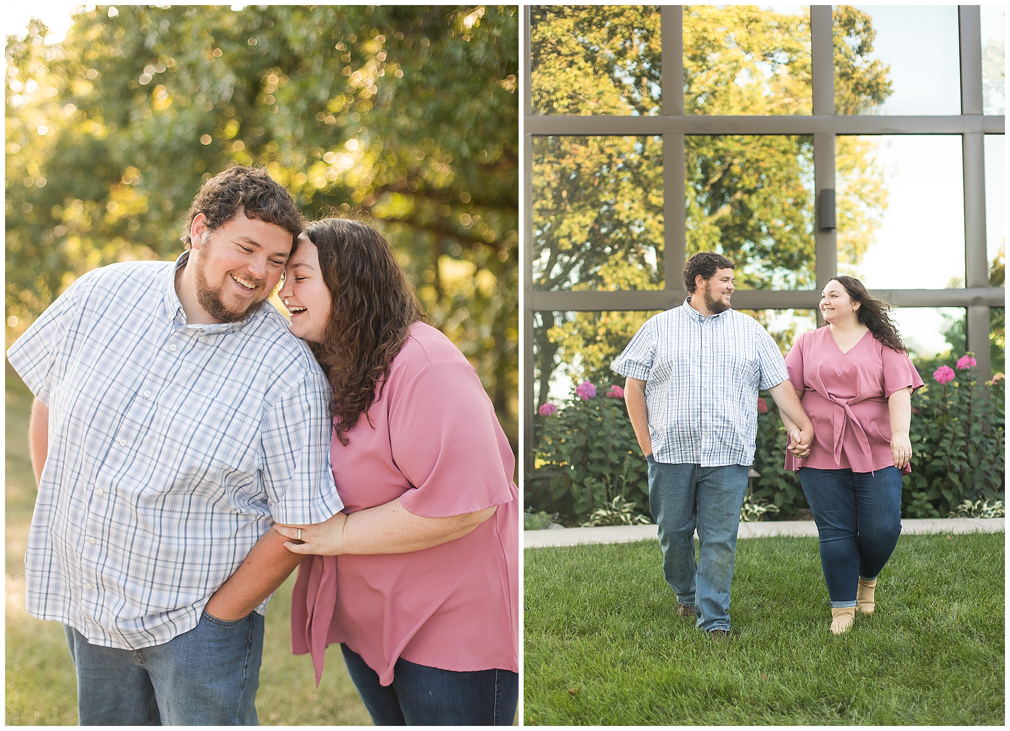 I met up with Samantha and Paul at their gorgeous venue for their big day, Lakeview Weddings in Camp Point, Illinois. This couple loves this spot so much they not only chose it for their nuptials, but they wanted to use it for the backdrop of their engagement photos. And even though it was my first visit to the venue, I can understand why! It’s absolutely delightful out there! Then you add in Samantha and Paul’s laid back and lovely personalities and it was all perfect on a sunny evening! They started out in a more casual outfit and looked amazing in front of the mirrored building on the property. We still had a few flowers that were popped for them in the middle of September. Samantha and Paul are absolutely adorable together and he does anything he can to make sure she smiles.
