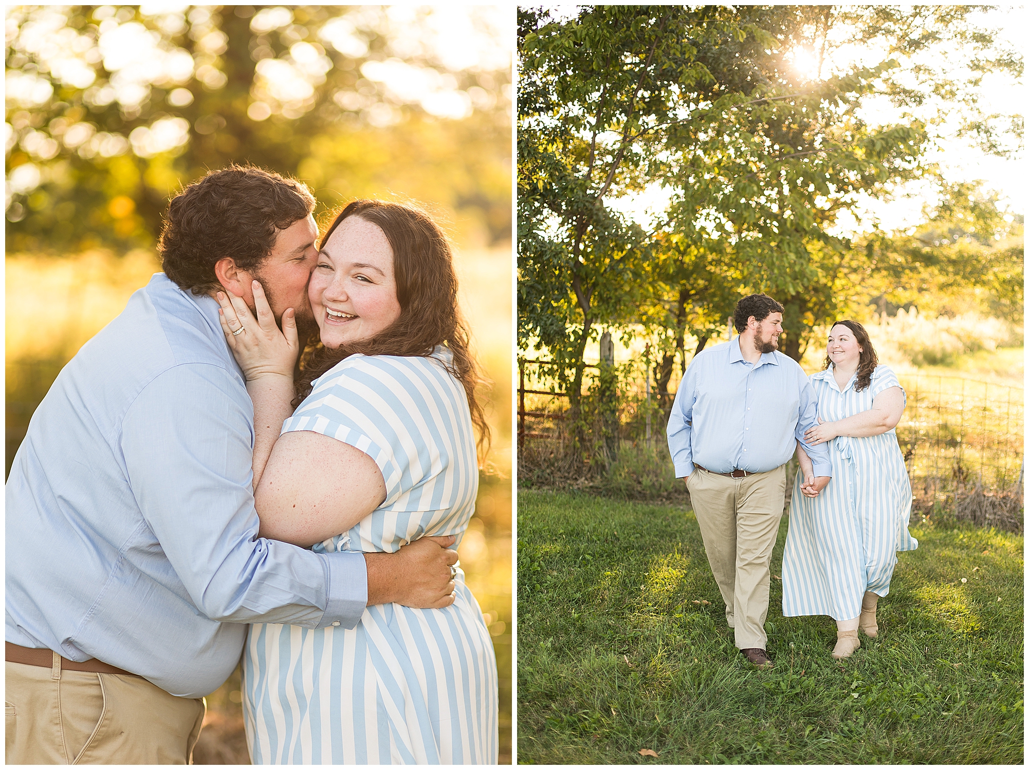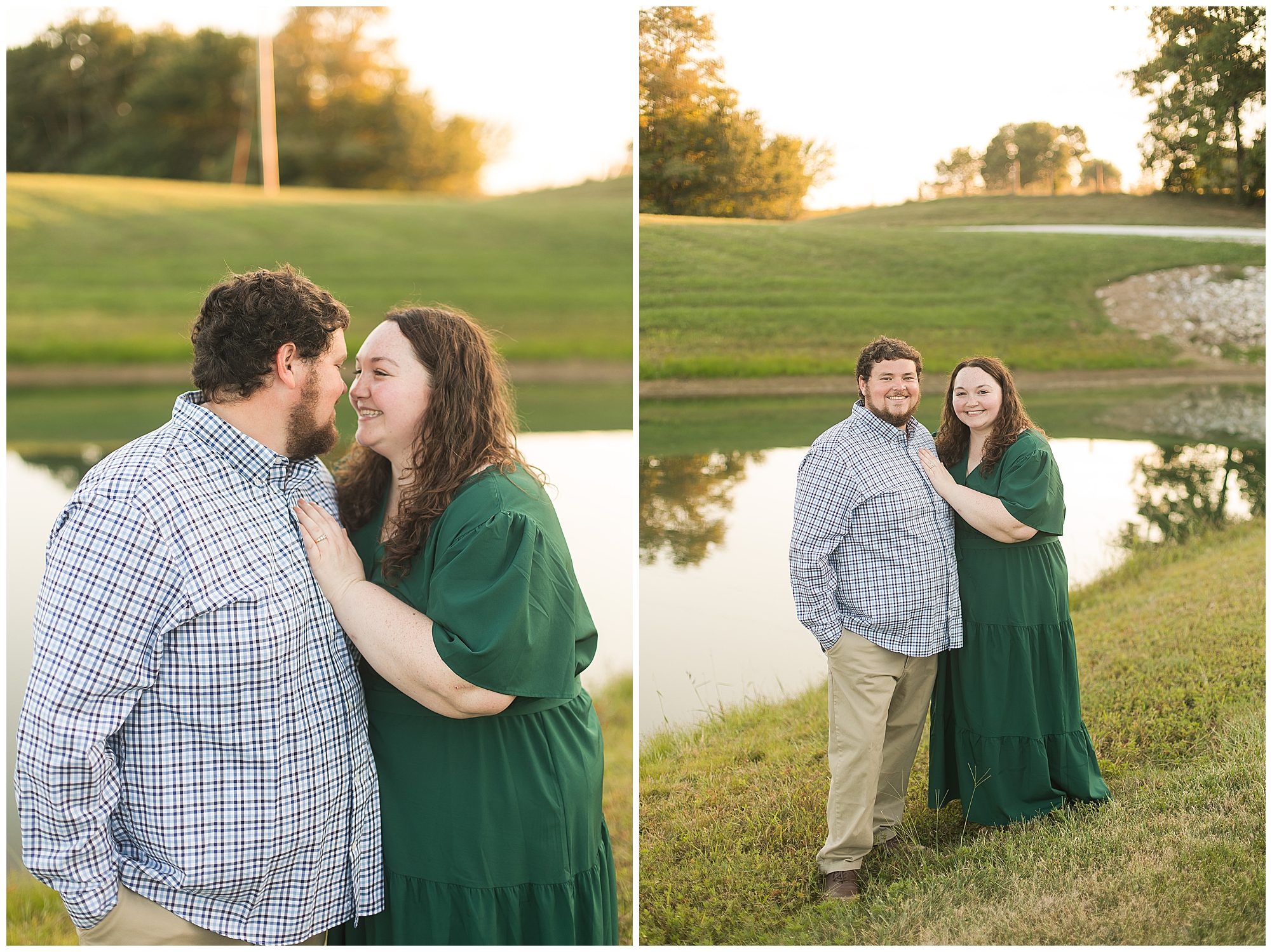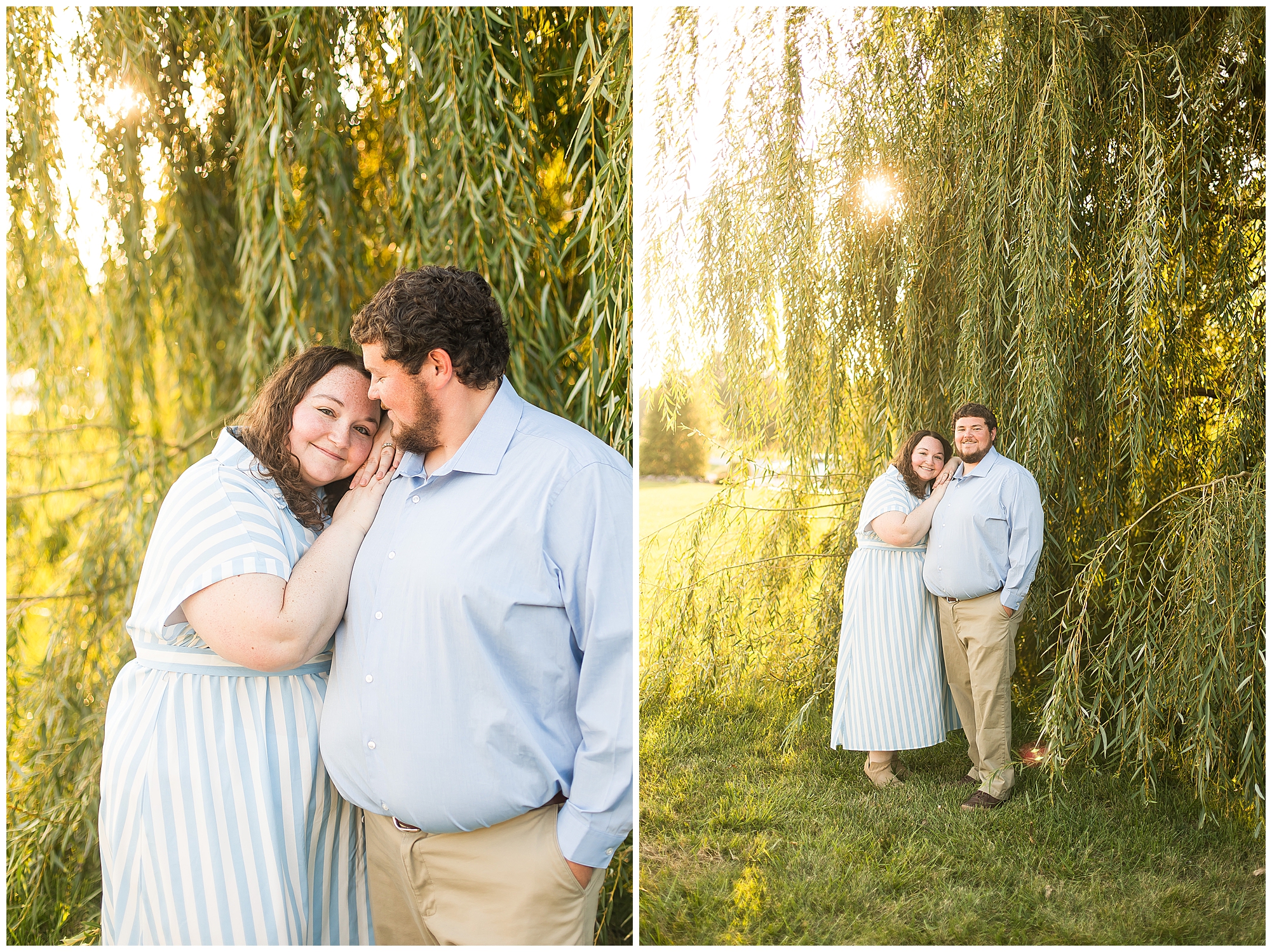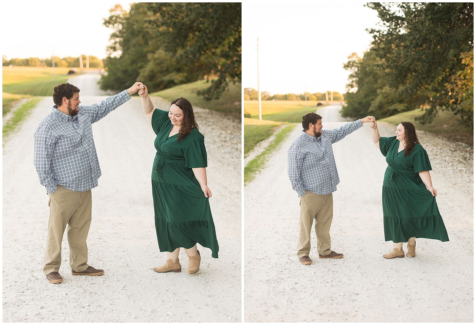We found a beautiful willow tree to highlight these cuties where the light was perfectly peeking through. Then after an outfit change to a wonderful hue of blue the smiles continued as we wandered the area. I loved when they giggled together, which was a lot! It brought out Samantha’s little nose wrinkle from her pure joy! So adorable! For their last outfit, Samantha had a fantastic emerald green dress that paired perfectly with Paul’s plaid shirt. The sun was glowing magically for these two as we found a few more awesome spots near the pond and along the fence line. We ended the evening with a few spins to give this couple plenty of practice before the big day! I can’t wait to capture Samantha and Paul on their wedding day back in this same spot next year!