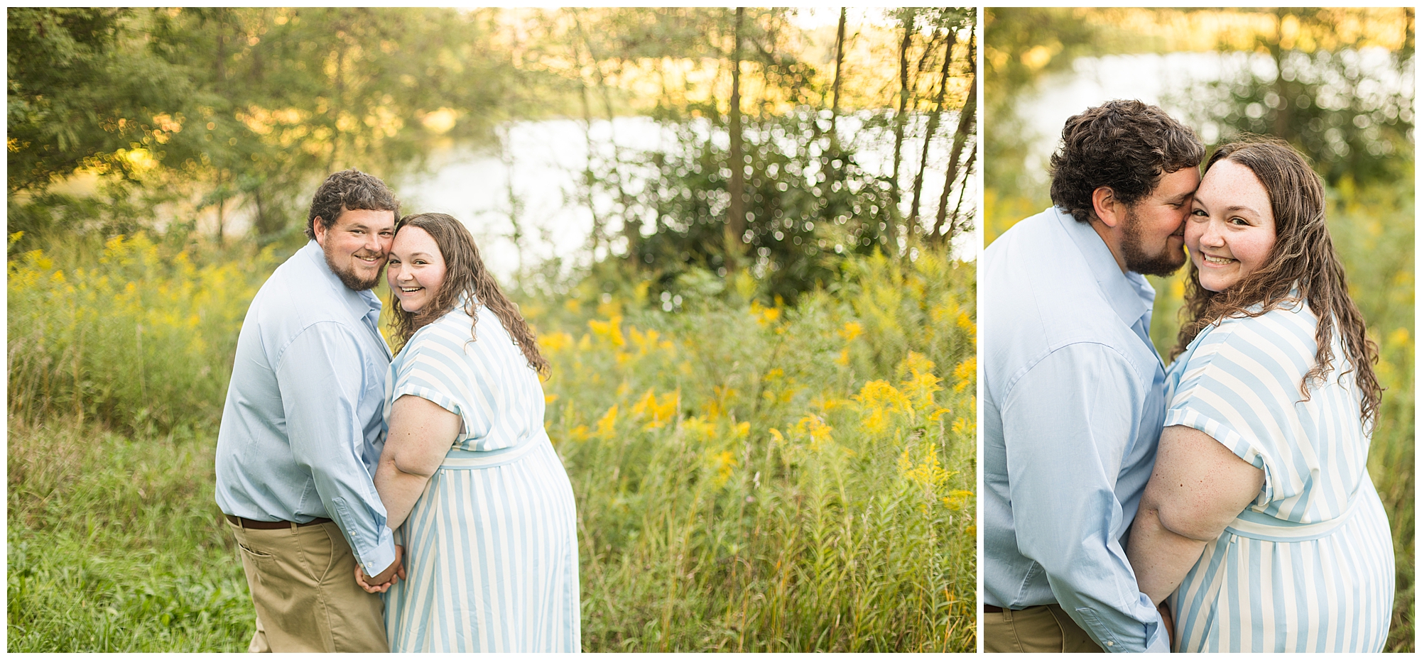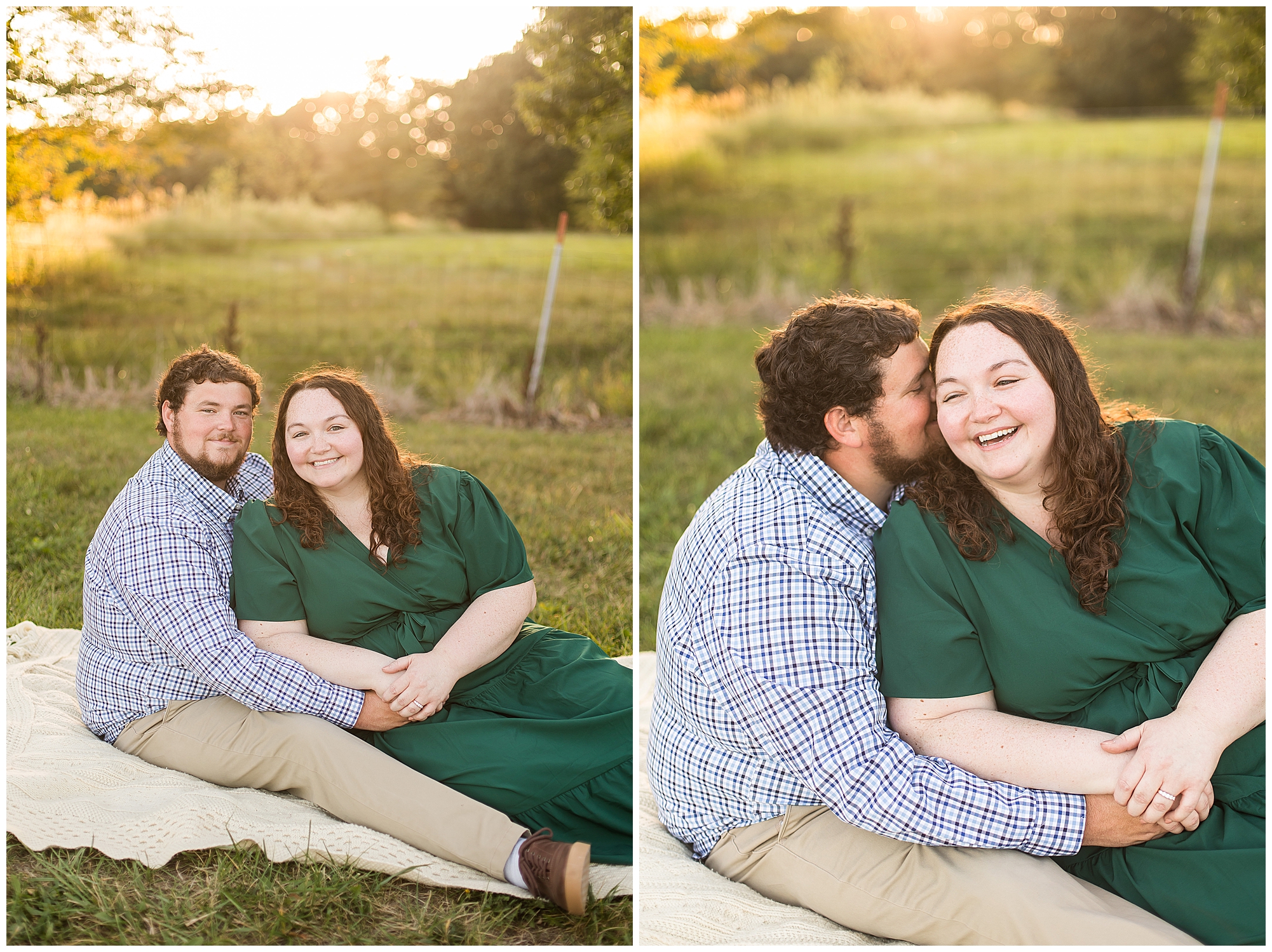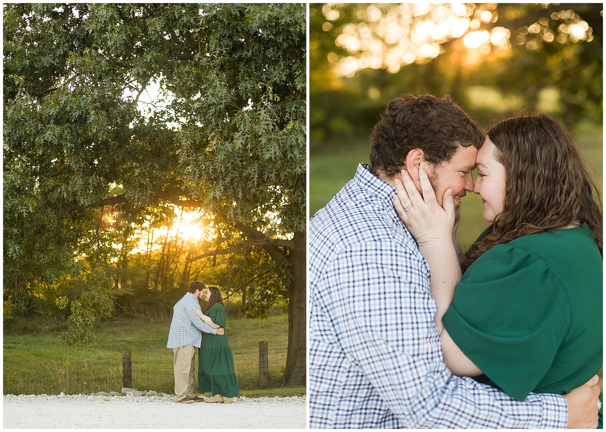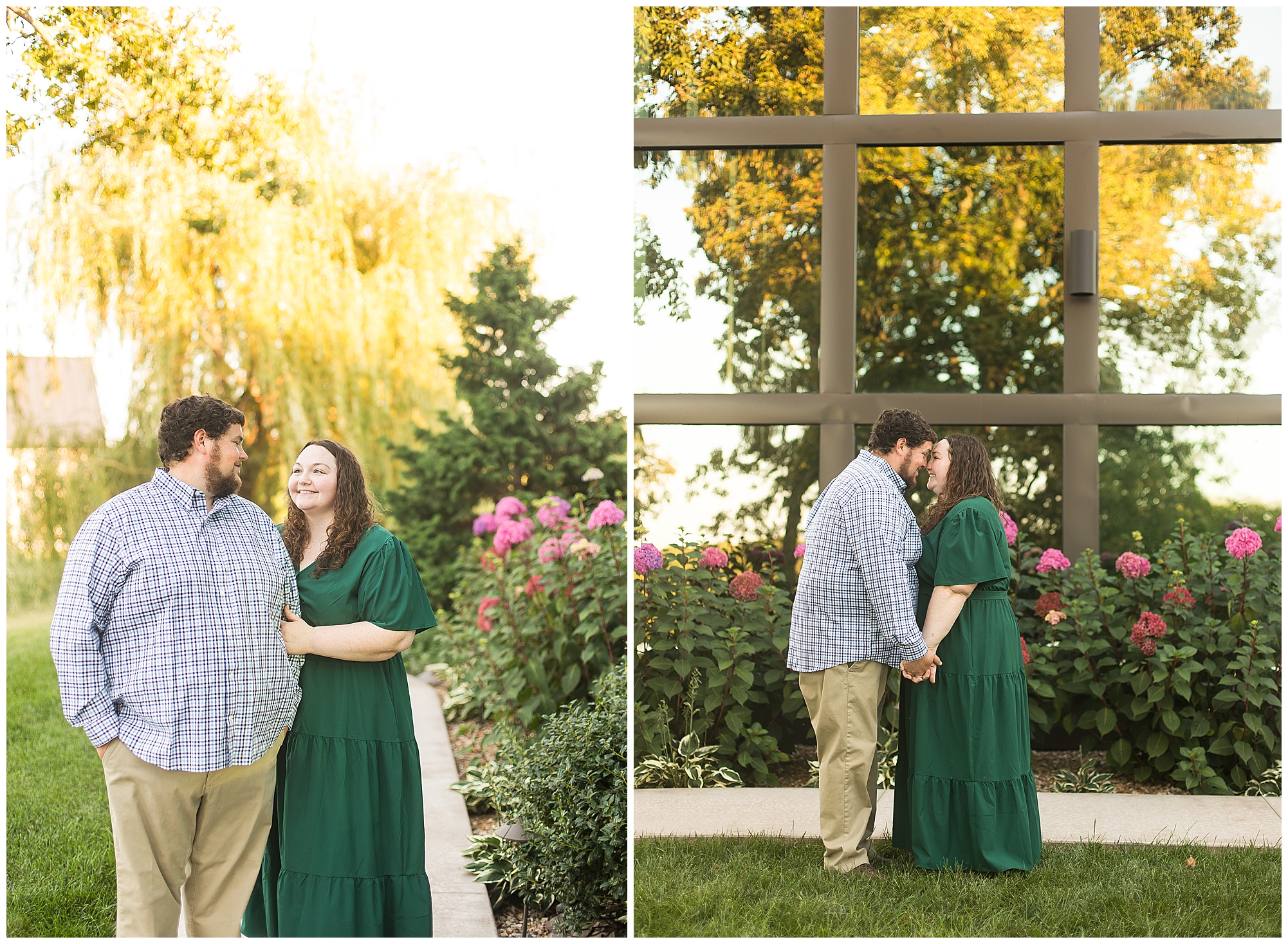 We found a beautiful willow tree to highlight these cuties where the light was perfectly peeking through. Then after an outfit change to a wonderful hue of blue the smiles continued as we wandered the area. I loved when they giggled together, which was a lot! It brought out Samantha’s little nose wrinkle from her pure joy! So adorable! For their last outfit, Samantha had a fantastic emerald green dress that paired perfectly with Paul’s plaid shirt. The sun was glowing magically for these two as we found a few more awesome spots near the pond and along the fence line. We ended the evening with a few spins to give this couple plenty of practice before the big day! I can’t wait to capture Samantha and Paul on their wedding day back in this same spot next year!