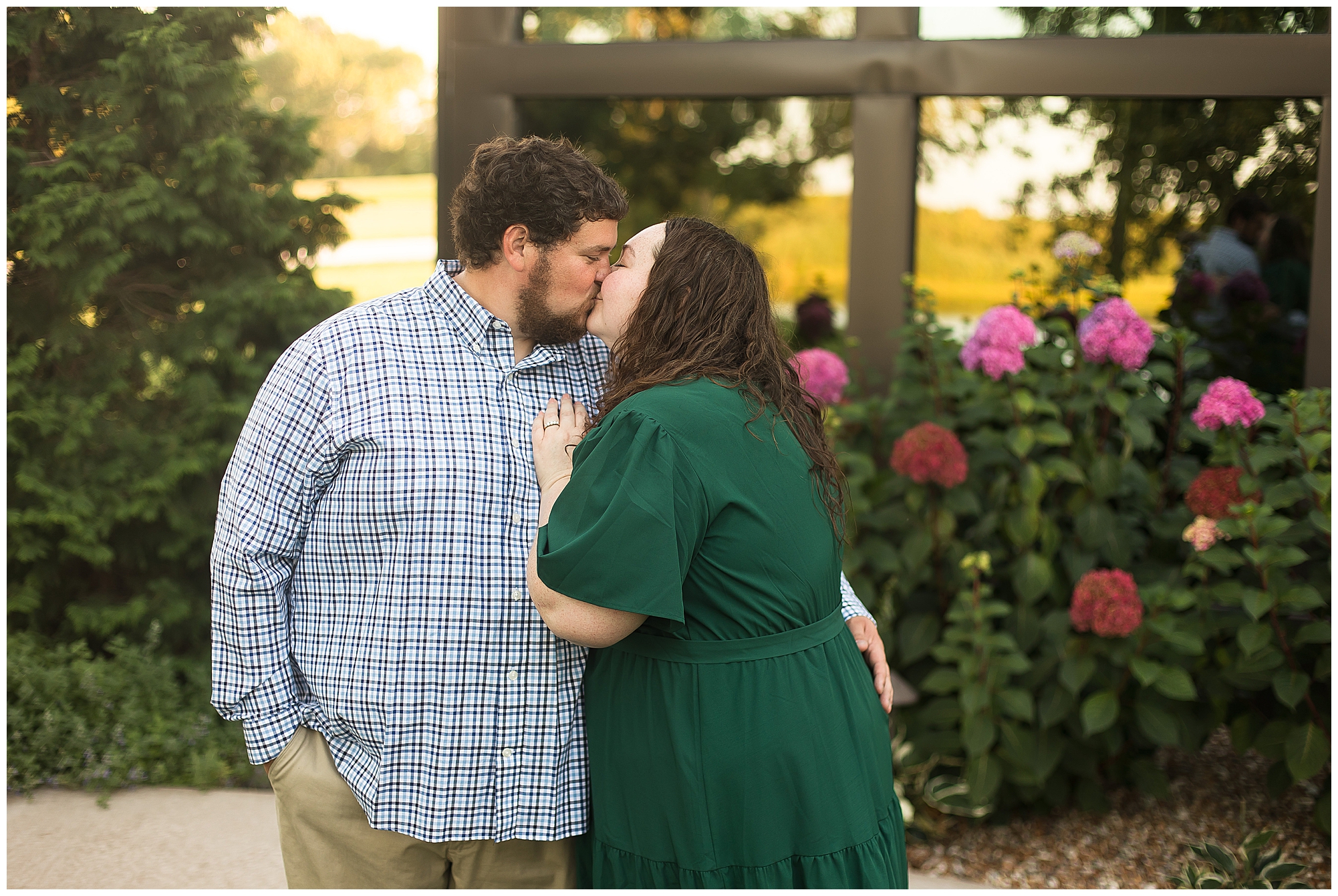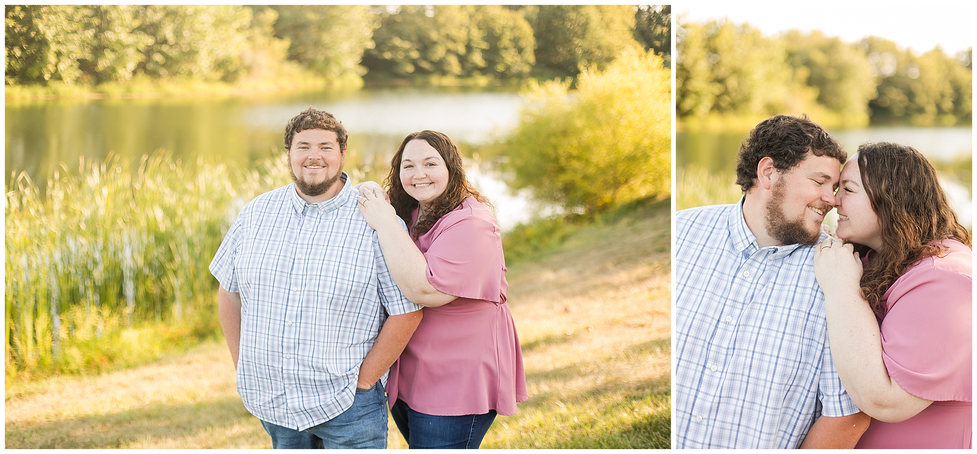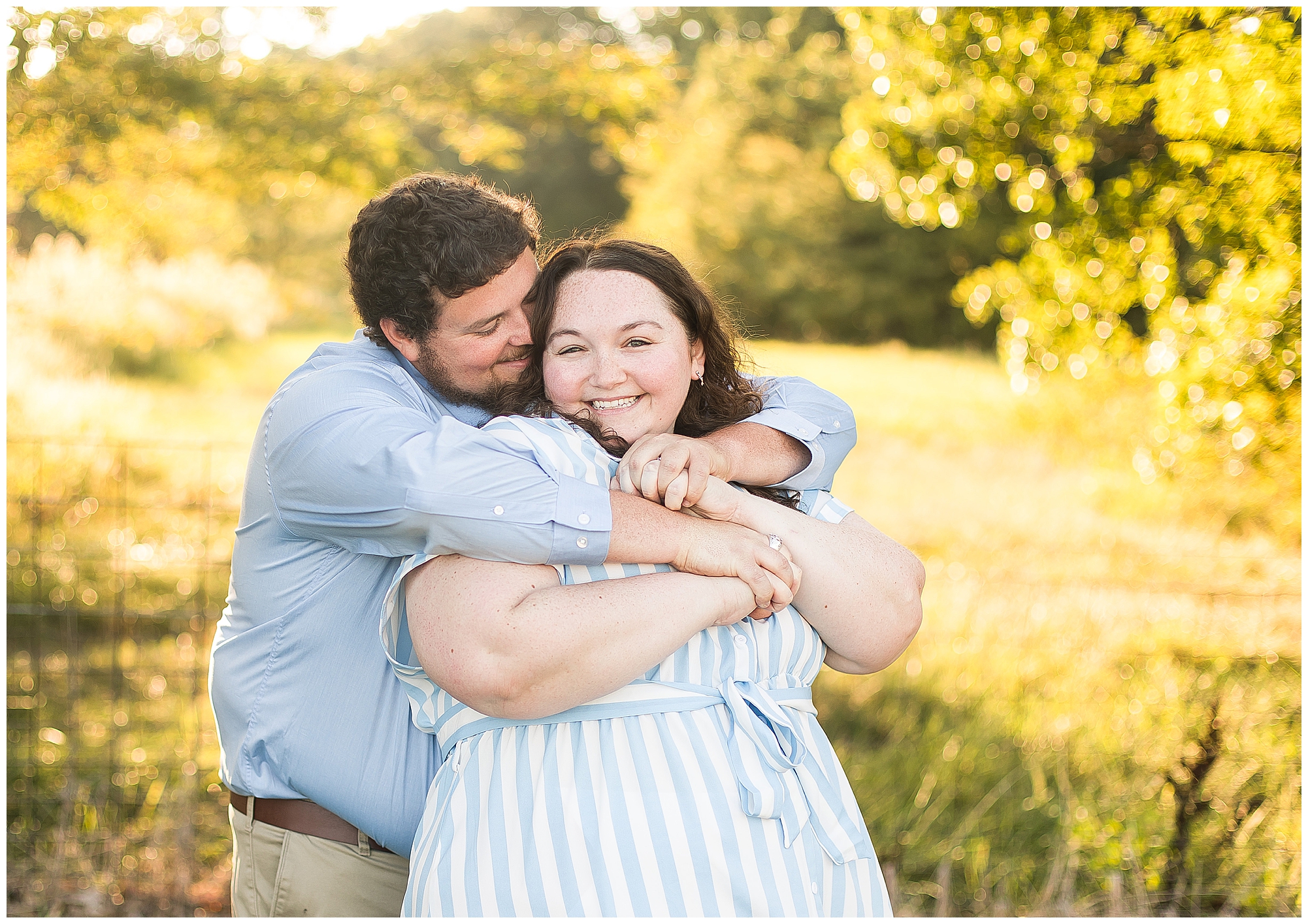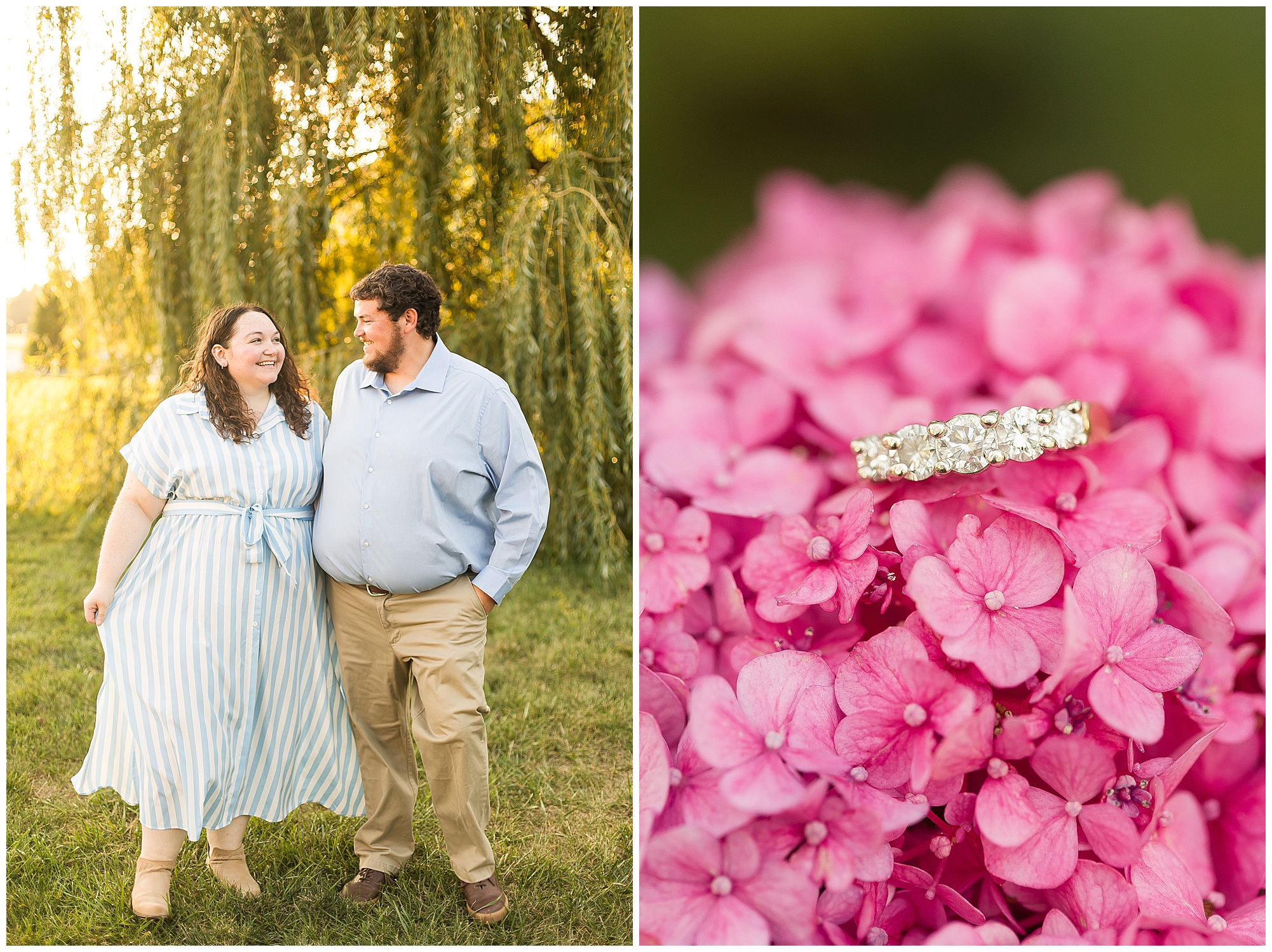 We found a beautiful willow tree to highlight these cuties where the light was perfectly peeking through. Then after an outfit change to a wonderful hue of blue the smiles continued as we wandered the area. I loved when they giggled together, which was a lot! It brought out Samantha’s little nose wrinkle from her pure joy! So adorable! For their last outfit, Samantha had a fantastic emerald green dress that paired perfectly with Paul’s plaid shirt. The sun was glowing magically for these two as we found a few more awesome spots near the pond and along the fence line. We ended the evening with a few spins to give this couple plenty of practice before the big day! I can’t wait to capture Samantha and Paul on their wedding day back in this same spot next year!