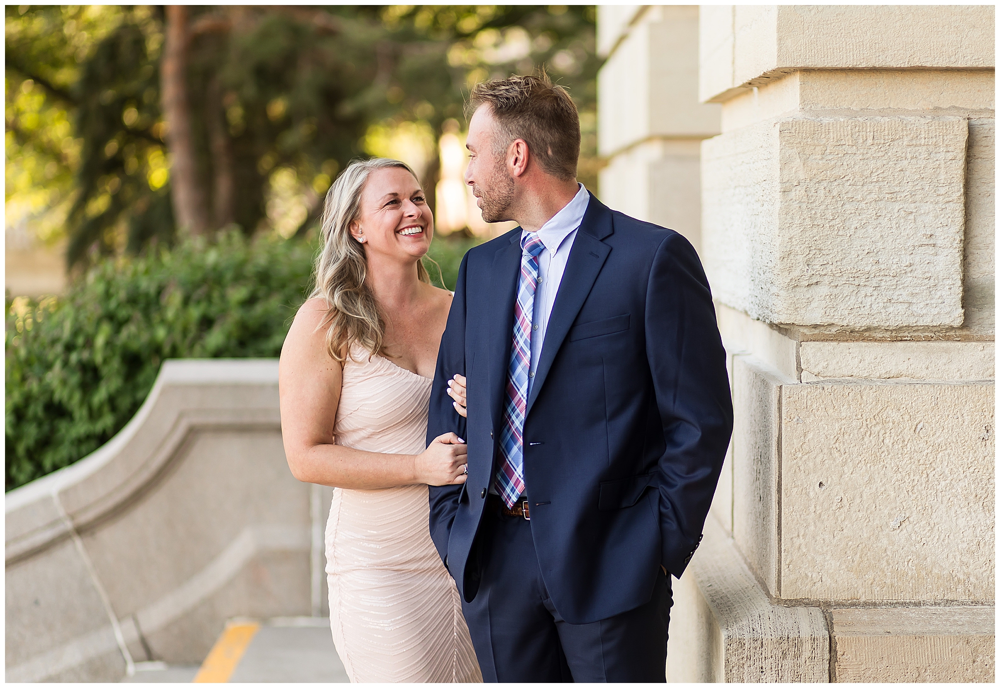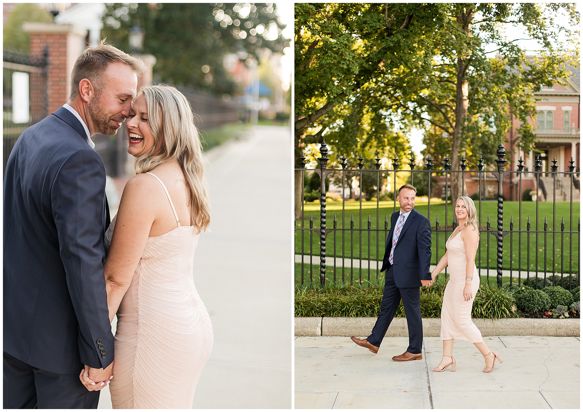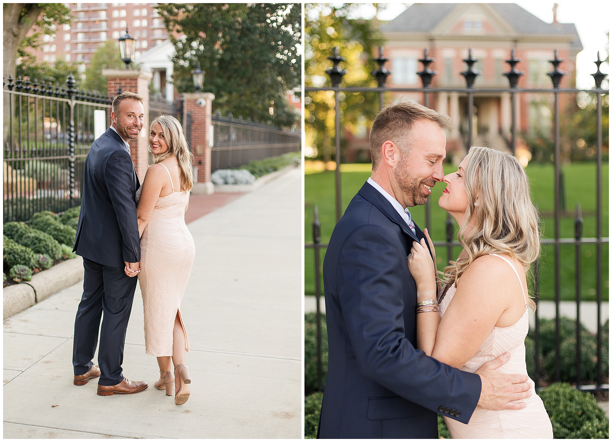 For their engagement session, Lisa and Greg had a few stops in mind other than the State Capitol. After we wandered around the capitol grounds with Lisa looking gorgeous in a pink dress with a few shimmering touches and Greg looking fancy in a navy suit, we headed over to a spot where they made their mark before they got engaged. In an alleyway outside of one of their favorite watering holes, J.P. Kelly’s, there is a heart mural where couples write their names to show off their love. Once we snagged a few photos there, we then made our way over to the Govenor’s Mansion for some fun with Lisa and Greg with the wrought iron fence and historic lamp posts. Greg is always looking out for Lisa, holding her hand as they walked to the next spot or making sure she safely makes it up the stairs. He even opens and closes the car door for her. Chivalry is not dead, people! We finished up together, at Washington Park to capture these two as the foliage was in the beginning stages of change. The light was glowy and Lisa and Greg dressed a bit more casual, but still took plenty of opportunities to snuggle in tight. I loved capturing this delightful couple before their nuptials next year! This is definitely one I’m super excited about!