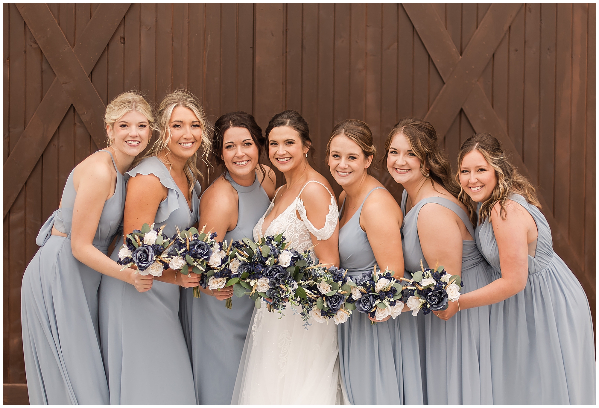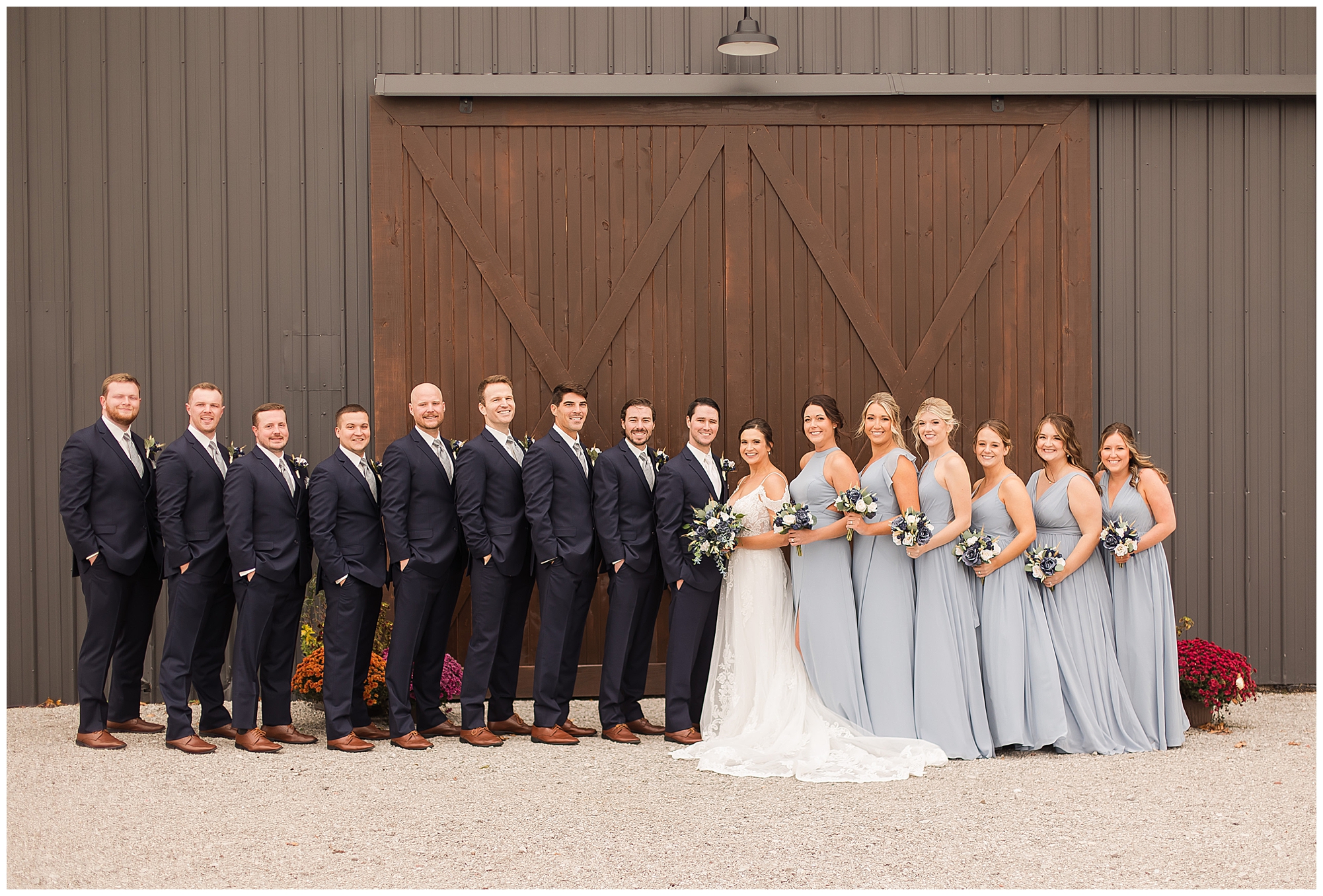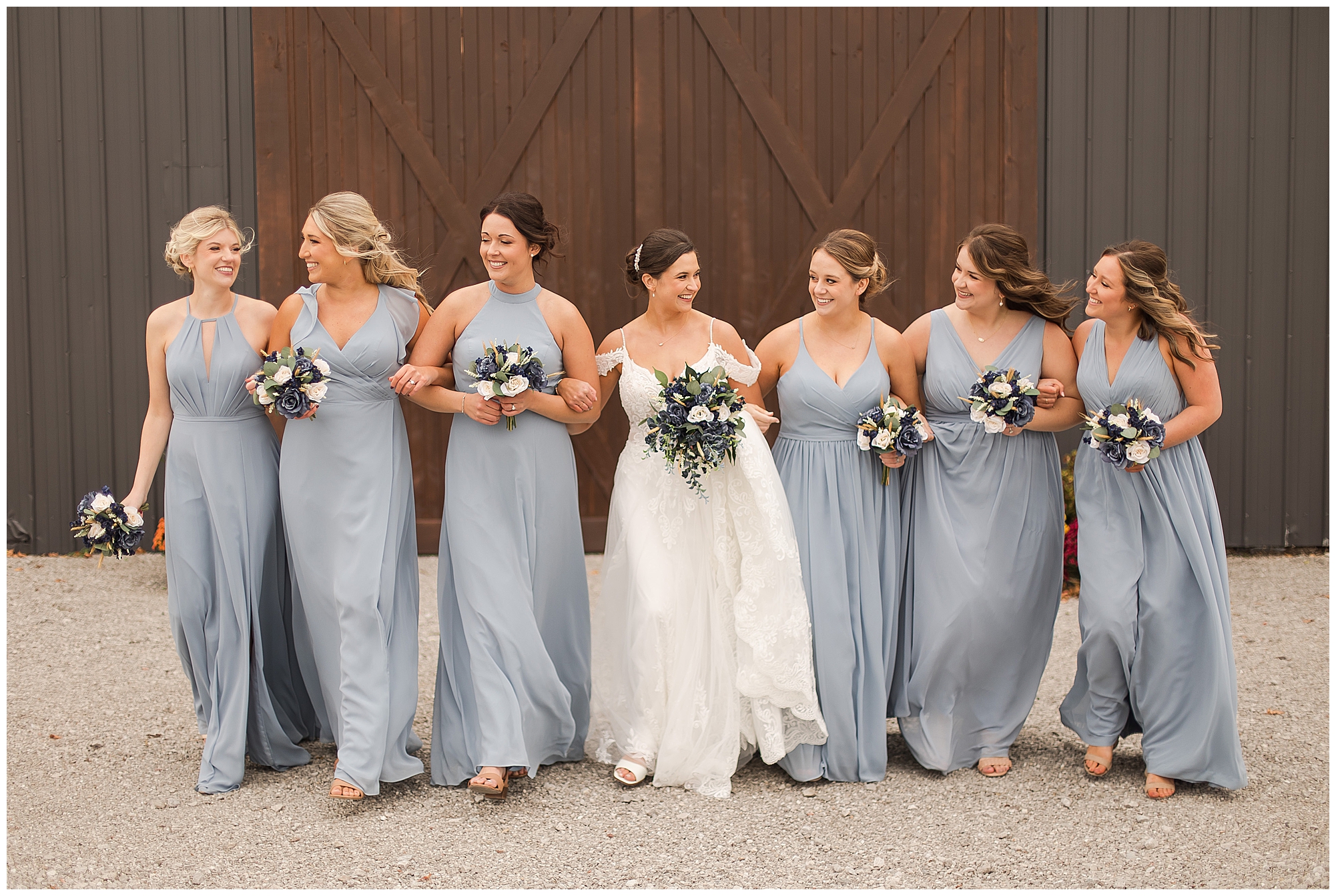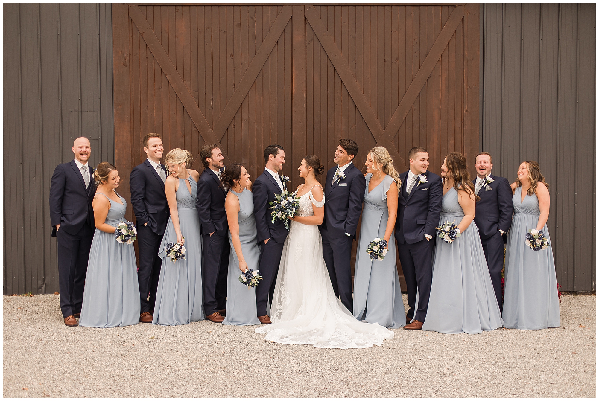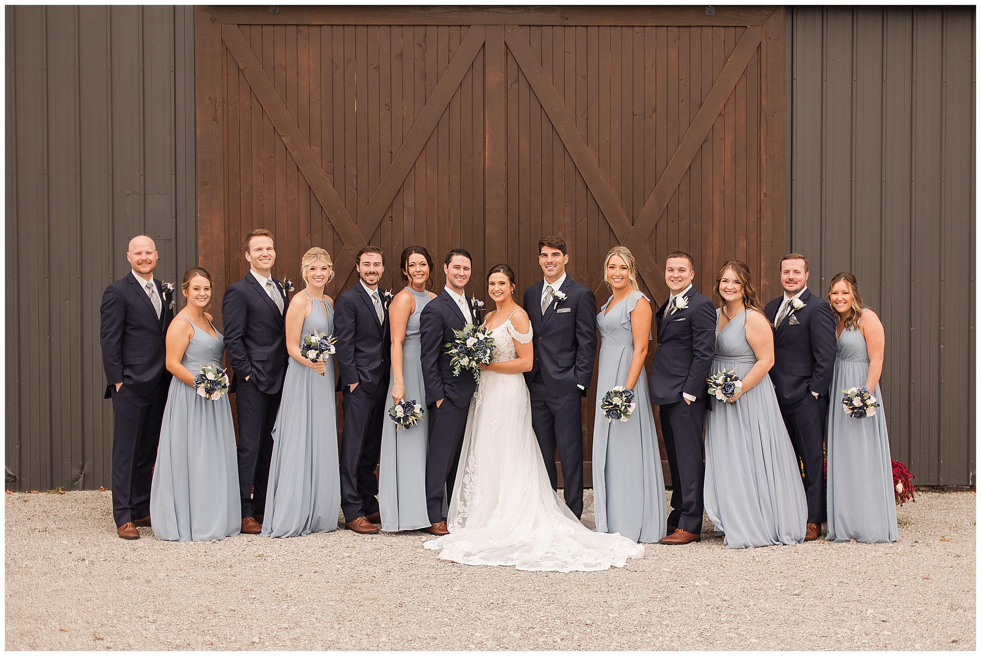 Morgan and Michael held their ceremony and reception at the gorgeous The Rustic Venues in Girard, Illinois on a chilly October day. The bridal suite was bustling with Morgan and her ladies when I arrived. So much excitement surrounding this delightful bride on her special day! When it came time for Morgan to step into her gown she was absolutely stunning! The floral details and sparkle sprinkled about gave this bride the best part of her look…Her smile! And with the touches of dusty blues and navy in the bridesmaids dresses and flowers it was literal perfection all the way around! Michael and his guys absolutely brought the class dressed in navy suits, with Michael in a cream tie, while his groomsmen donned grey ones. Now that everyone glowed up, it was time for Morgan and Michael to see one another! However, before the bride and groom’s first look, it was only fair that Morgan’s dad, Matt, had his opportunity to see his daughter in her wedding dress. When I was getting Matt set up right before Morgan came out, he told me he was really nervous. So sweet! He took a deep breath before he turned to see Morgan and the emotions were all over his face! What a lovely moment! Next it was Michael’s turn. The smile on his face when he saw Morgan was priceless! These two shared a few quiet moments together and then it was on to bridal party photos!