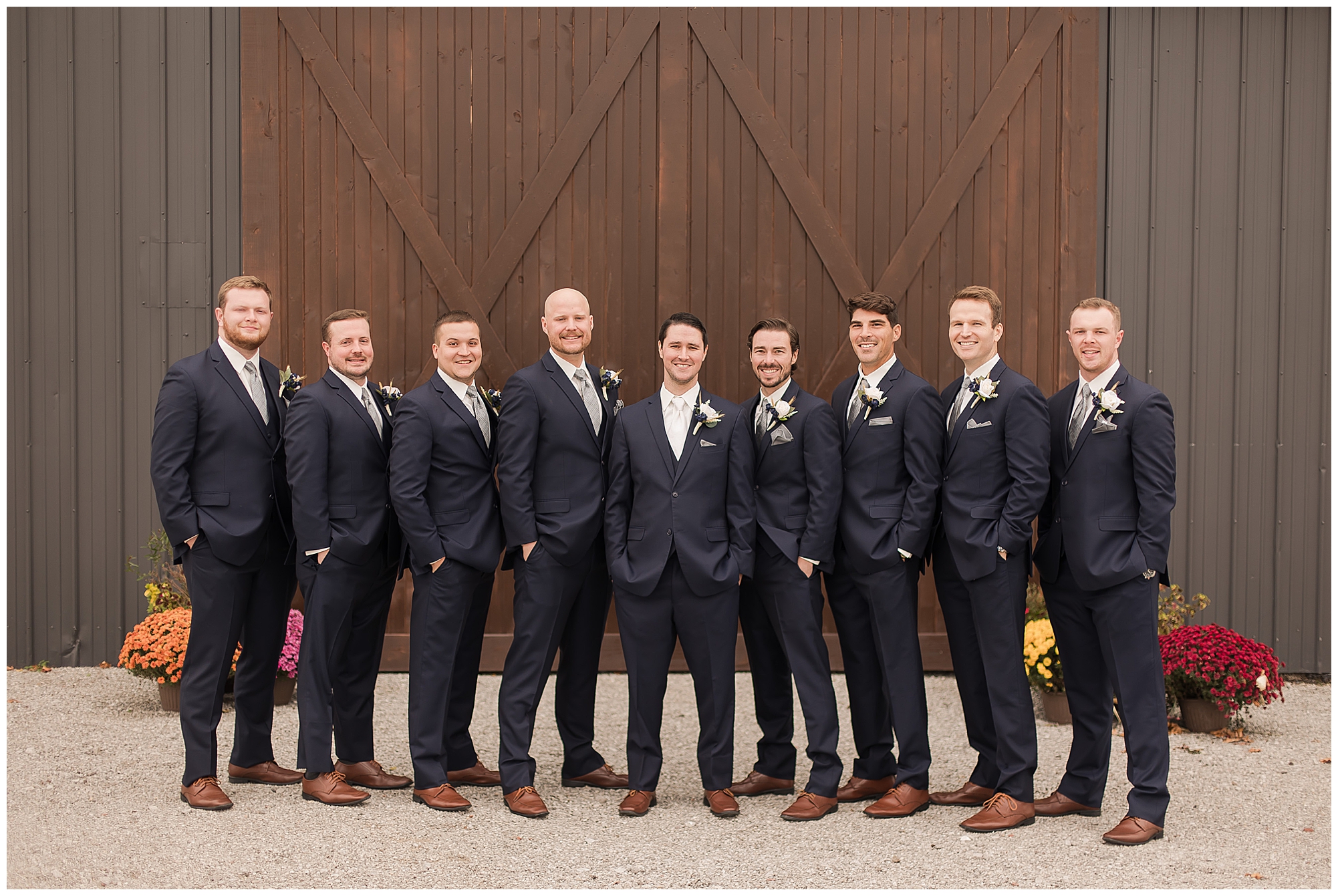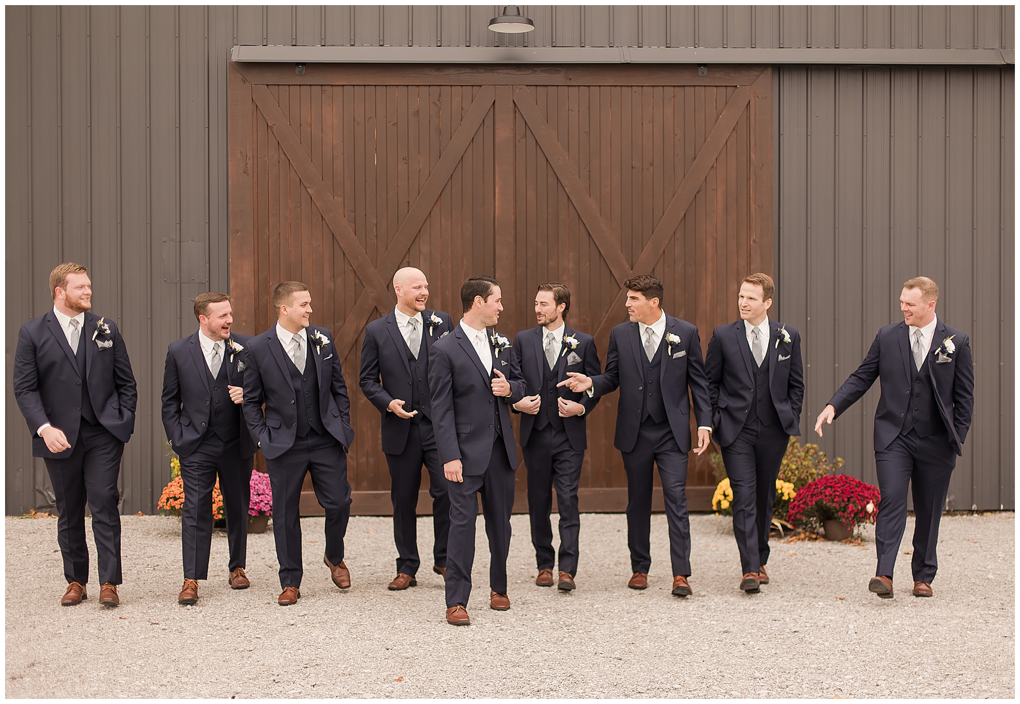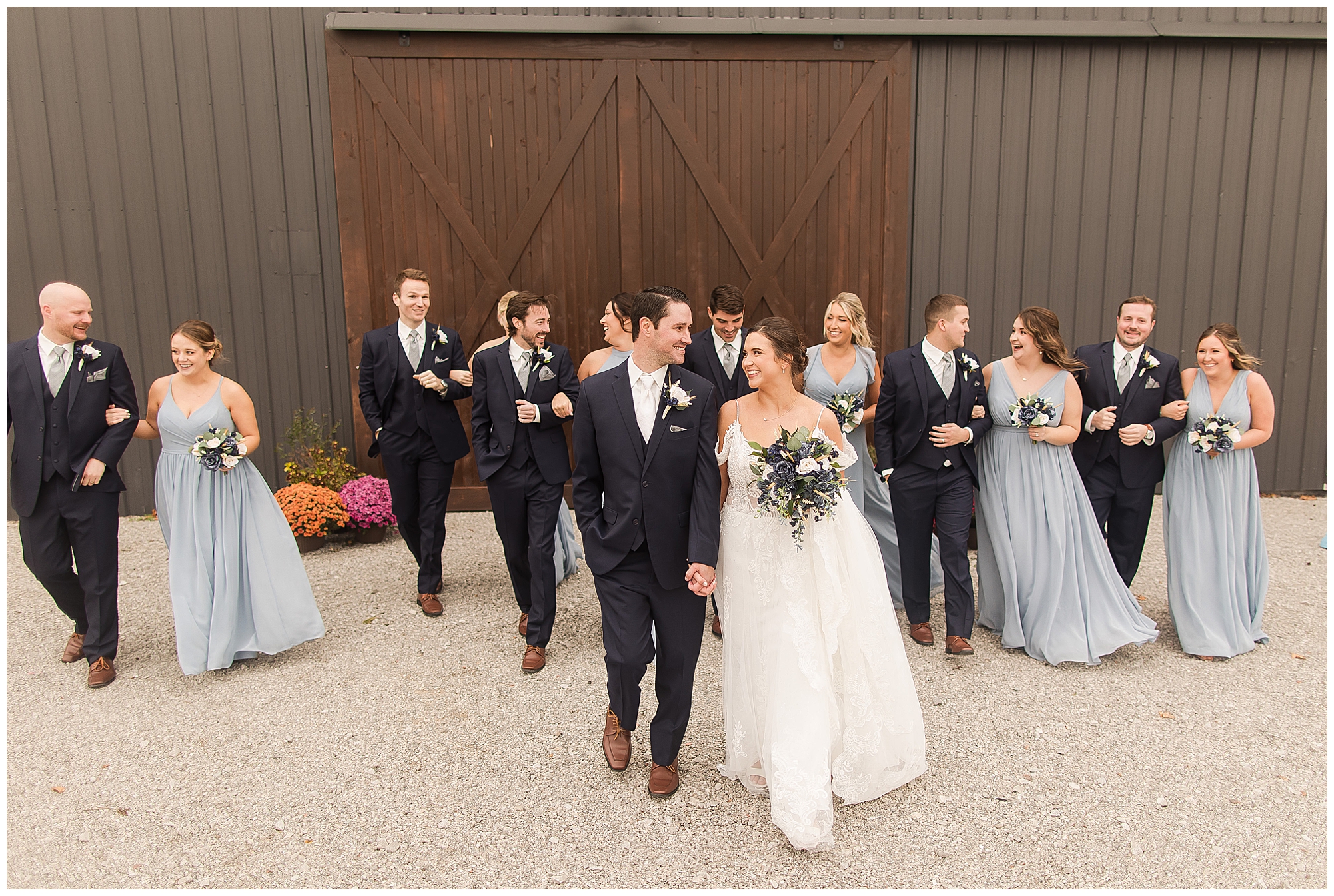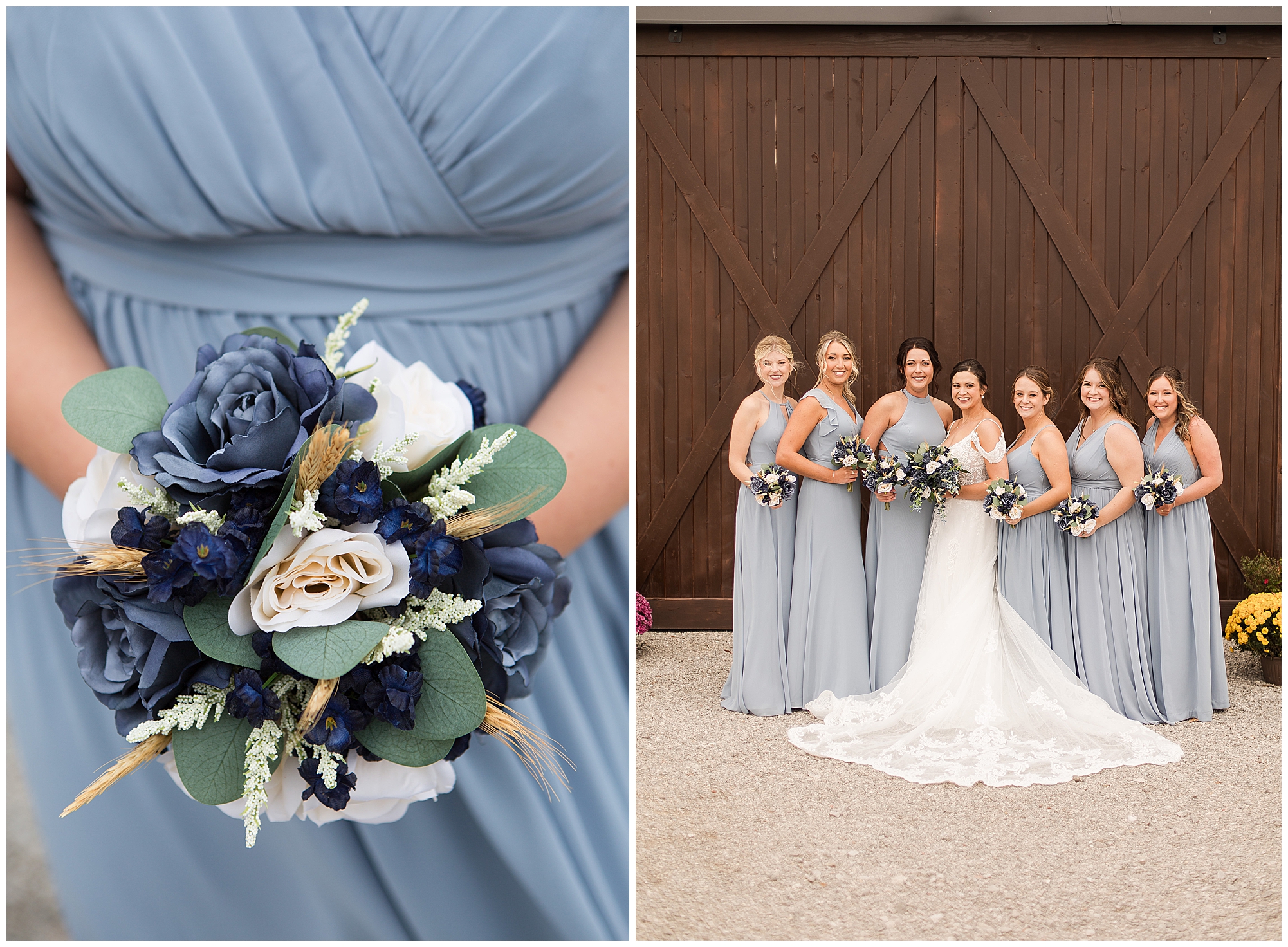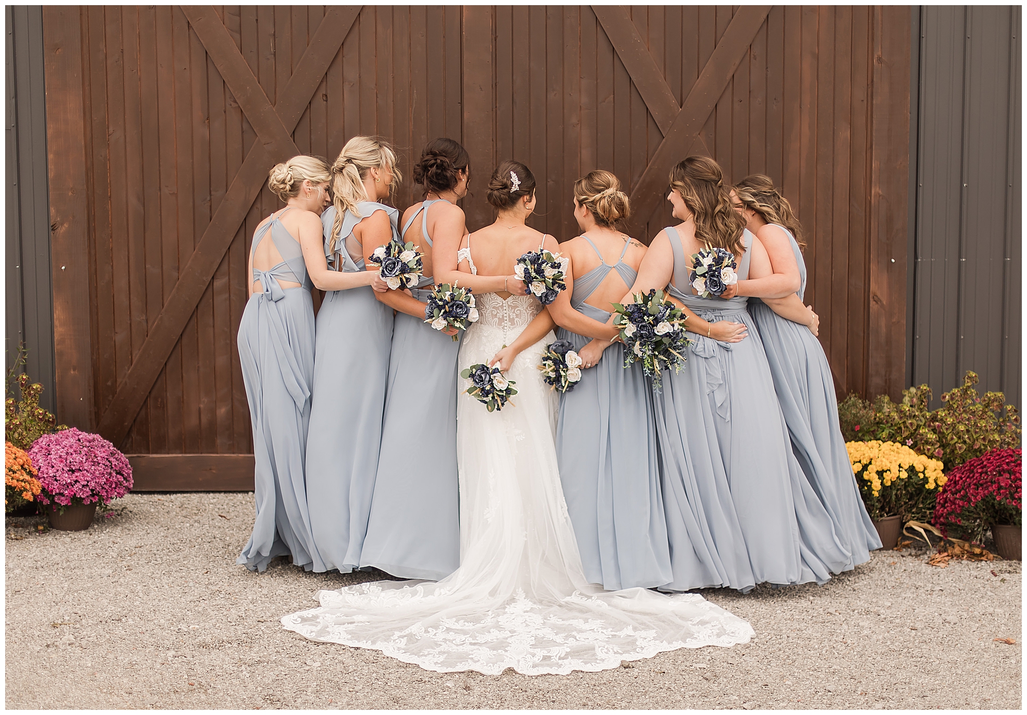 Morgan and Michael held their ceremony and reception at the gorgeous The Rustic Venues in Girard, Illinois on a chilly October day. The bridal suite was bustling with Morgan and her ladies when I arrived. So much excitement surrounding this delightful bride on her special day! When it came time for Morgan to step into her gown she was absolutely stunning! The floral details and sparkle sprinkled about gave this bride the best part of her look…Her smile! And with the touches of dusty blues and navy in the bridesmaids dresses and flowers it was literal perfection all the way around! Michael and his guys absolutely brought the class dressed in navy suits, with Michael in a cream tie, while his groomsmen donned grey ones. Now that everyone glowed up, it was time for Morgan and Michael to see one another! However, before the bride and groom’s first look, it was only fair that Morgan’s dad, Matt, had his opportunity to see his daughter in her wedding dress. When I was getting Matt set up right before Morgan came out, he told me he was really nervous. So sweet! He took a deep breath before he turned to see Morgan and the emotions were all over his face! What a lovely moment! Next it was Michael’s turn. The smile on his face when he saw Morgan was priceless! These two shared a few quiet moments together and then it was on to bridal party photos!