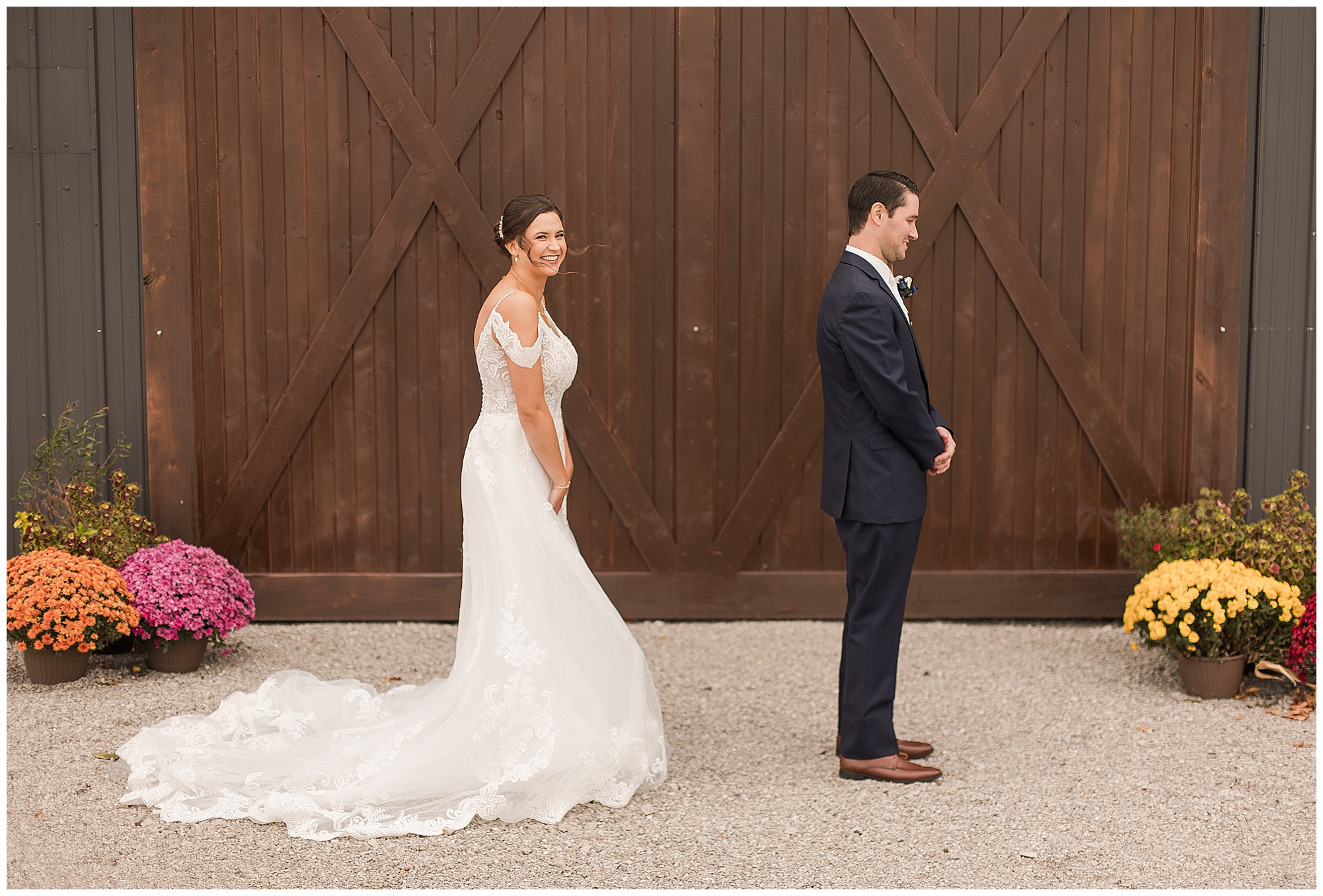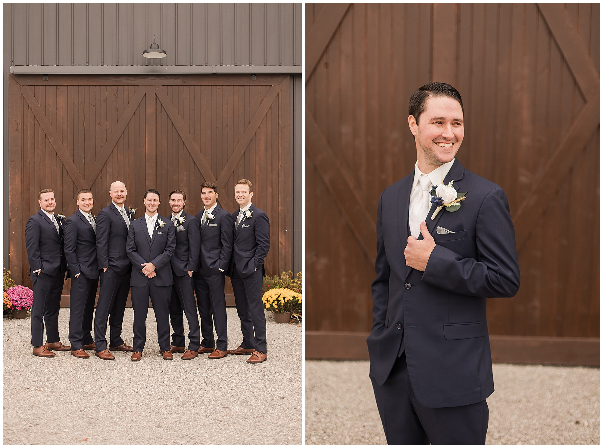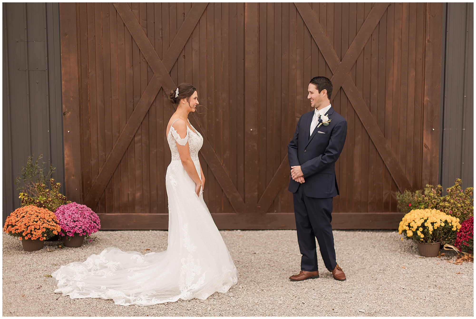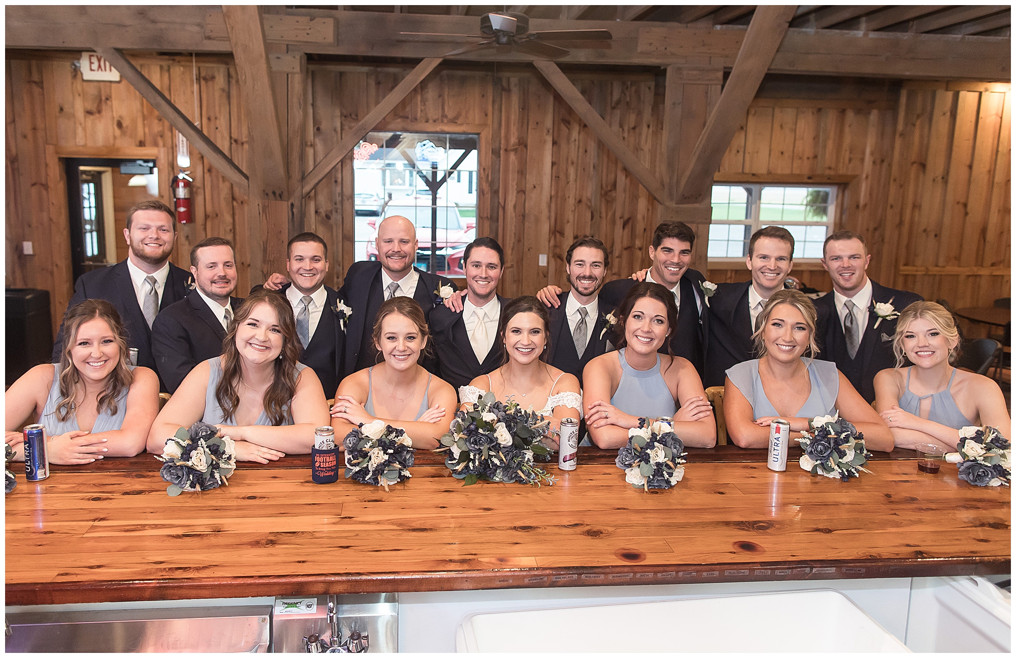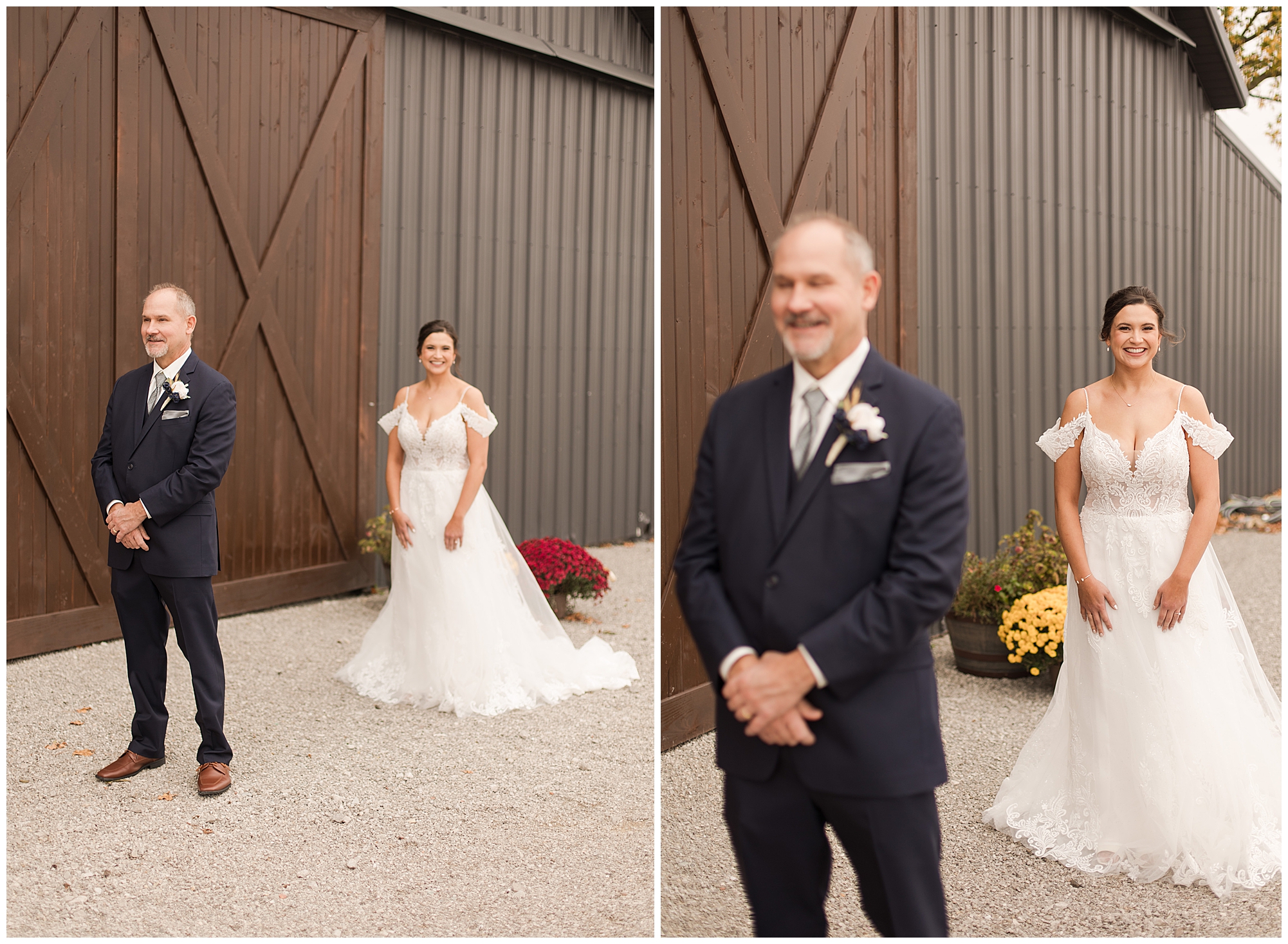 Morgan and Michael held their ceremony and reception at the gorgeous The Rustic Venues in Girard, Illinois on a chilly October day. The bridal suite was bustling with Morgan and her ladies when I arrived. So much excitement surrounding this delightful bride on her special day! When it came time for Morgan to step into her gown she was absolutely stunning! The floral details and sparkle sprinkled about gave this bride the best part of her look…Her smile! And with the touches of dusty blues and navy in the bridesmaids dresses and flowers it was literal perfection all the way around! Michael and his guys absolutely brought the class dressed in navy suits, with Michael in a cream tie, while his groomsmen donned grey ones. Now that everyone glowed up, it was time for Morgan and Michael to see one another! However, before the bride and groom’s first look, it was only fair that Morgan’s dad, Matt, had his opportunity to see his daughter in her wedding dress. When I was getting Matt set up right before Morgan came out, he told me he was really nervous. So sweet! He took a deep breath before he turned to see Morgan and the emotions were all over his face! What a lovely moment! Next it was Michael’s turn. The smile on his face when he saw Morgan was priceless! These two shared a few quiet moments together and then it was on to bridal party photos!
