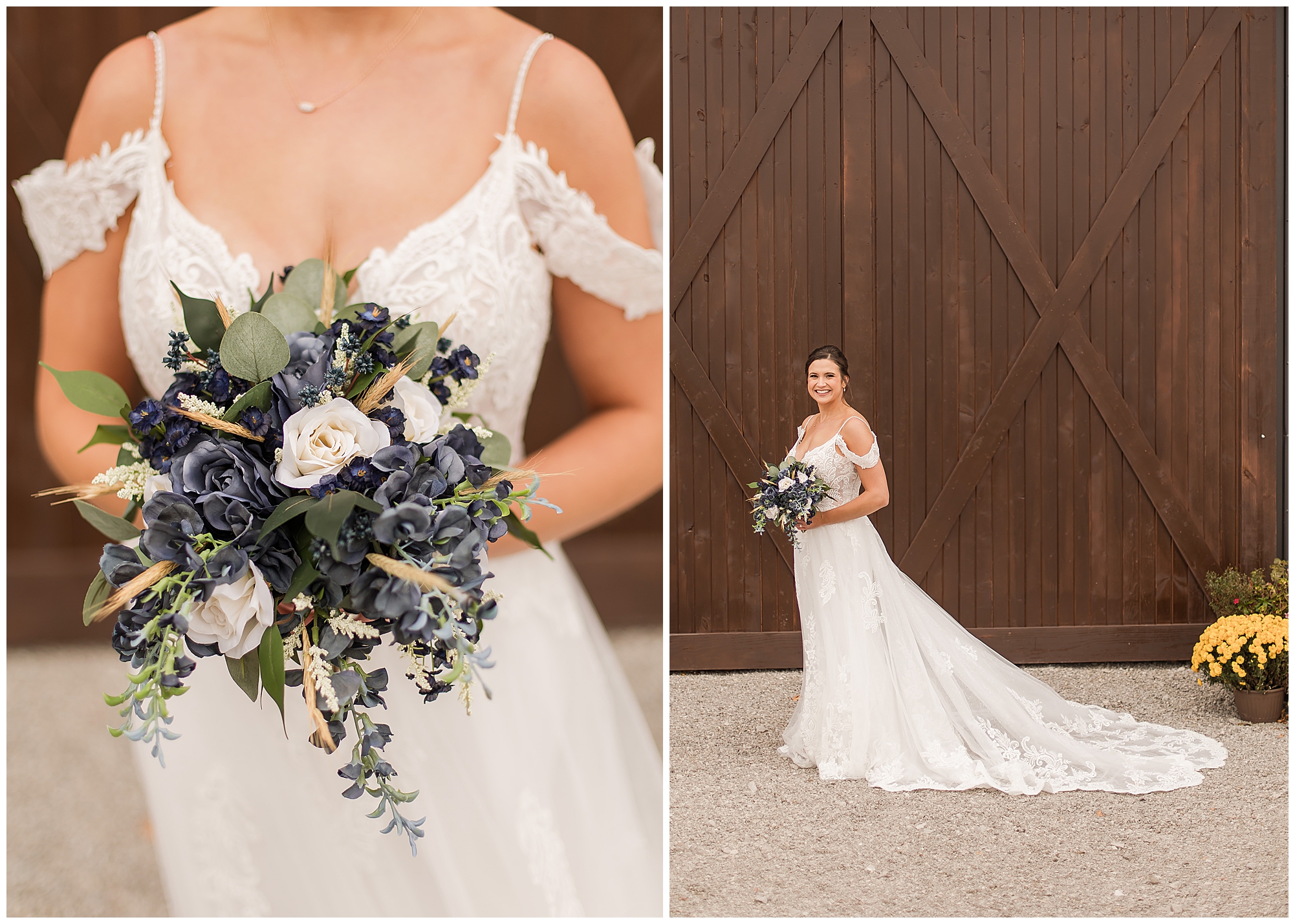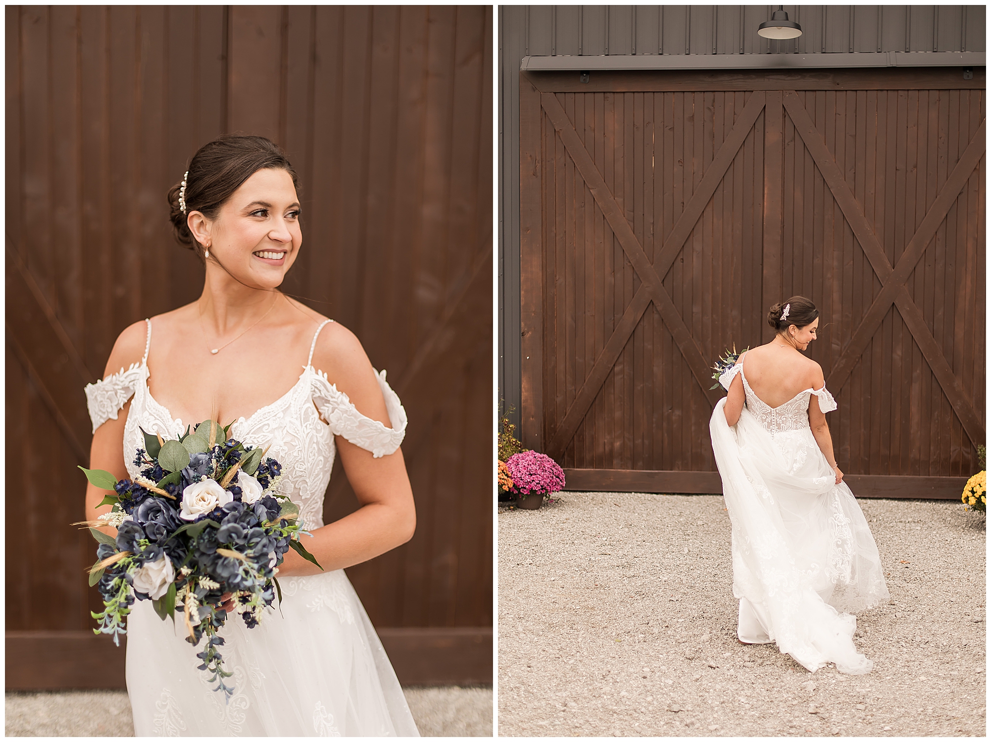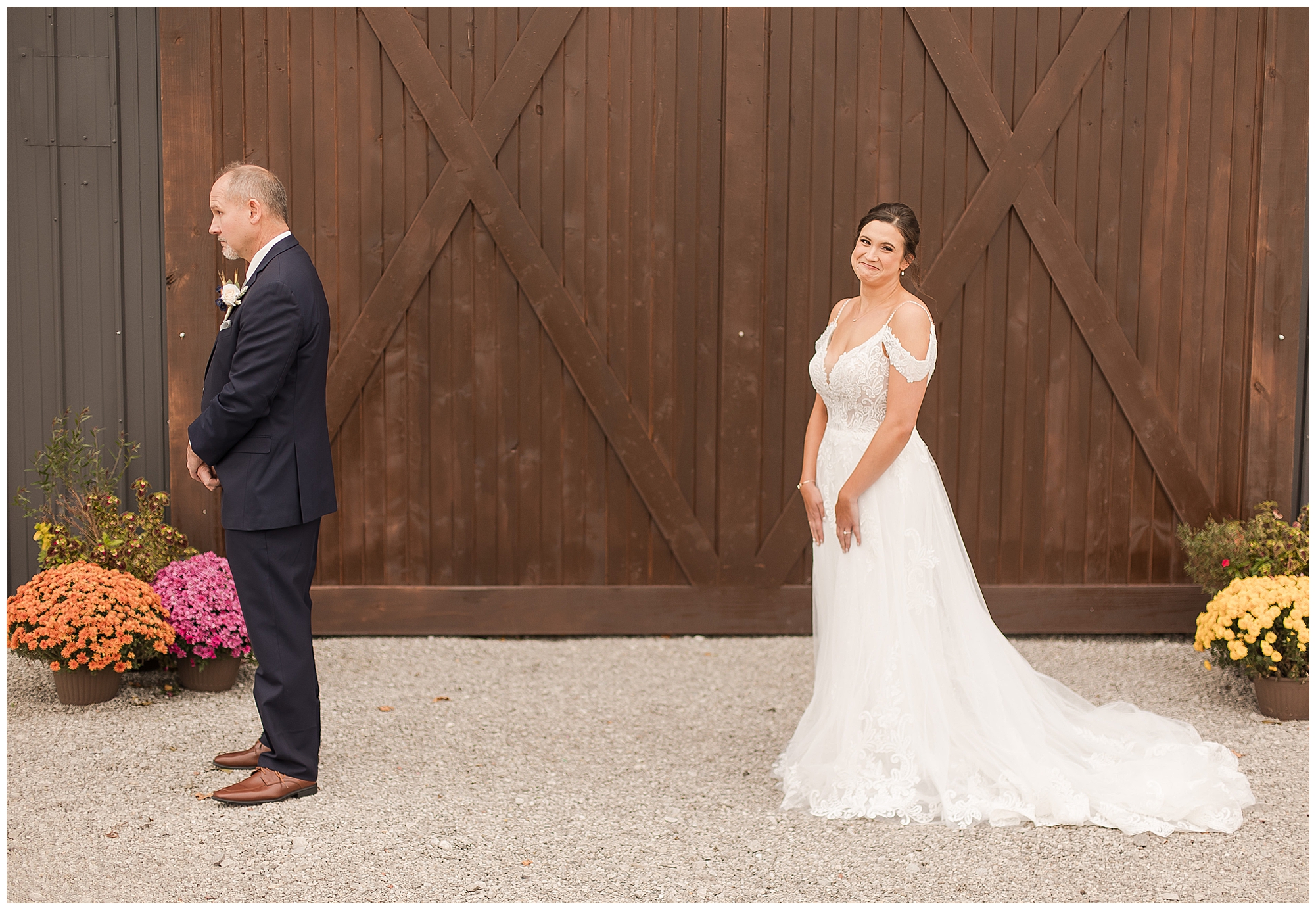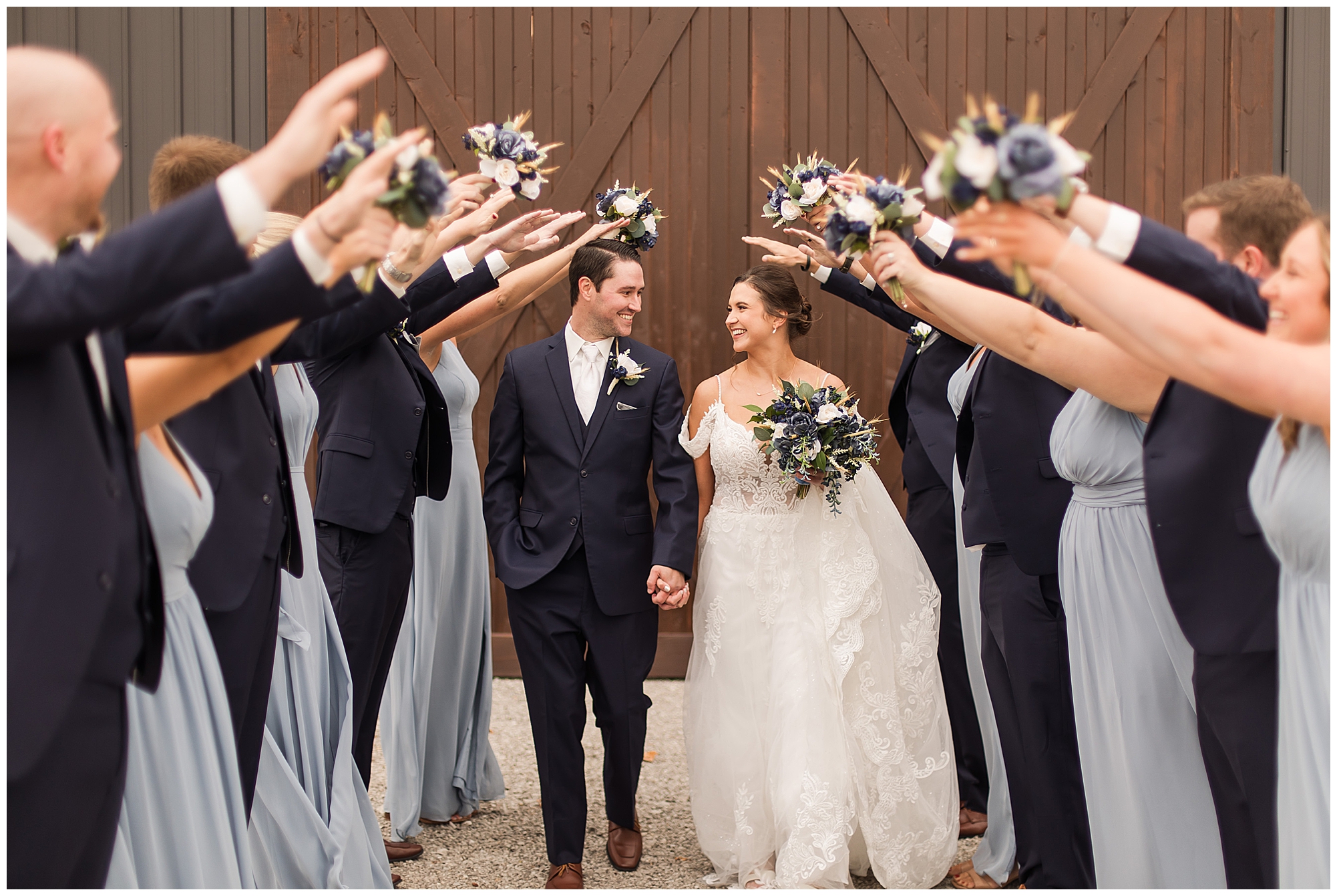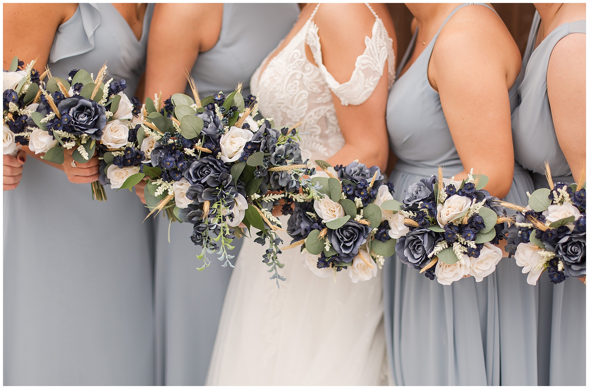 Morgan and Michael held their ceremony and reception at the gorgeous The Rustic Venues in Girard, Illinois on a chilly October day. The bridal suite was bustling with Morgan and her ladies when I arrived. So much excitement surrounding this delightful bride on her special day! When it came time for Morgan to step into her gown she was absolutely stunning! The floral details and sparkle sprinkled about gave this bride the best part of her look…Her smile! And with the touches of dusty blues and navy in the bridesmaids dresses and flowers it was literal perfection all the way around! Michael and his guys absolutely brought the class dressed in navy suits, with Michael in a cream tie, while his groomsmen donned grey ones. Now that everyone glowed up, it was time for Morgan and Michael to see one another! However, before the bride and groom’s first look, it was only fair that Morgan’s dad, Matt, had his opportunity to see his daughter in her wedding dress. When I was getting Matt set up right before Morgan came out, he told me he was really nervous. So sweet! He took a deep breath before he turned to see Morgan and the emotions were all over his face! What a lovely moment! Next it was Michael’s turn. The smile on his face when he saw Morgan was priceless! These two shared a few quiet moments together and then it was on to bridal party photos!