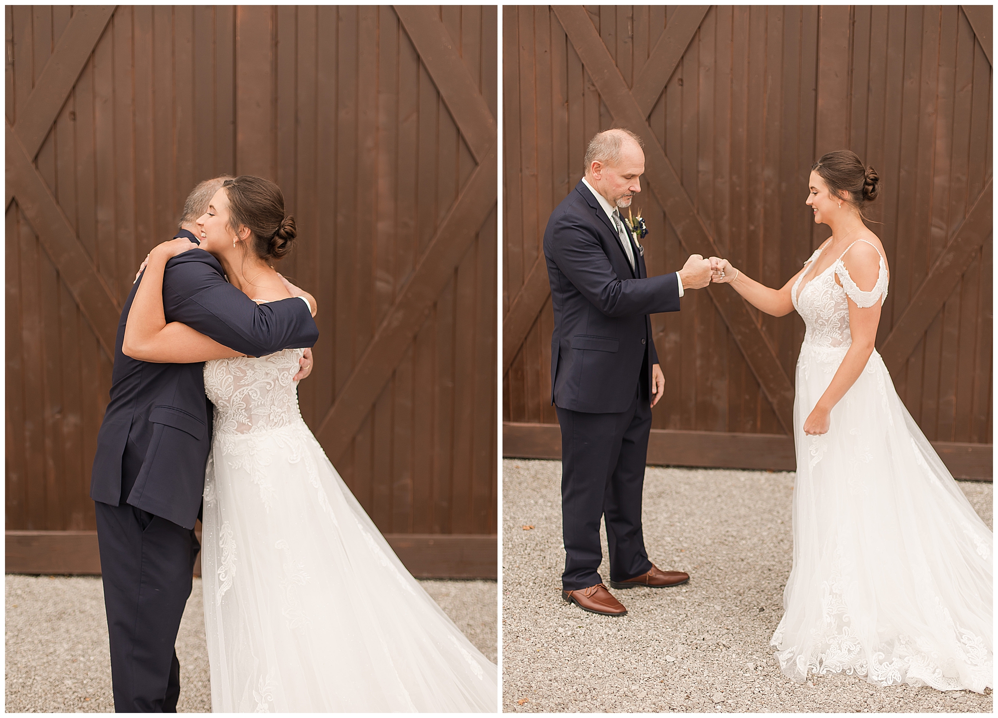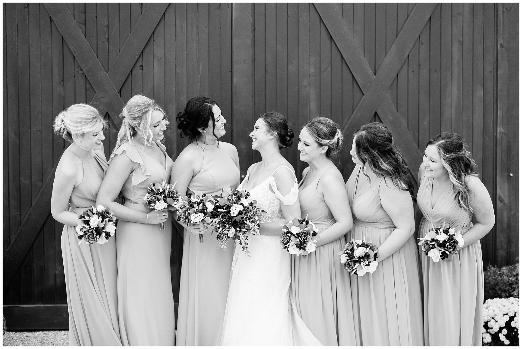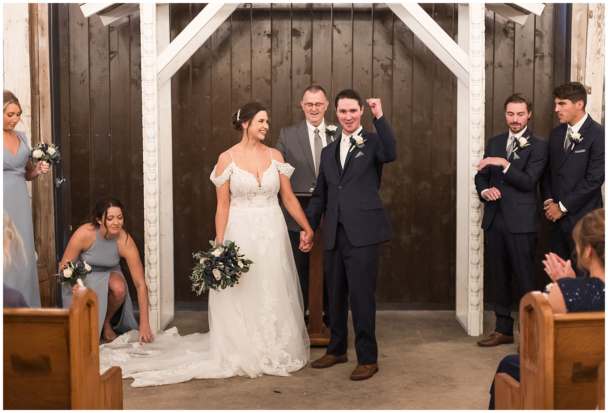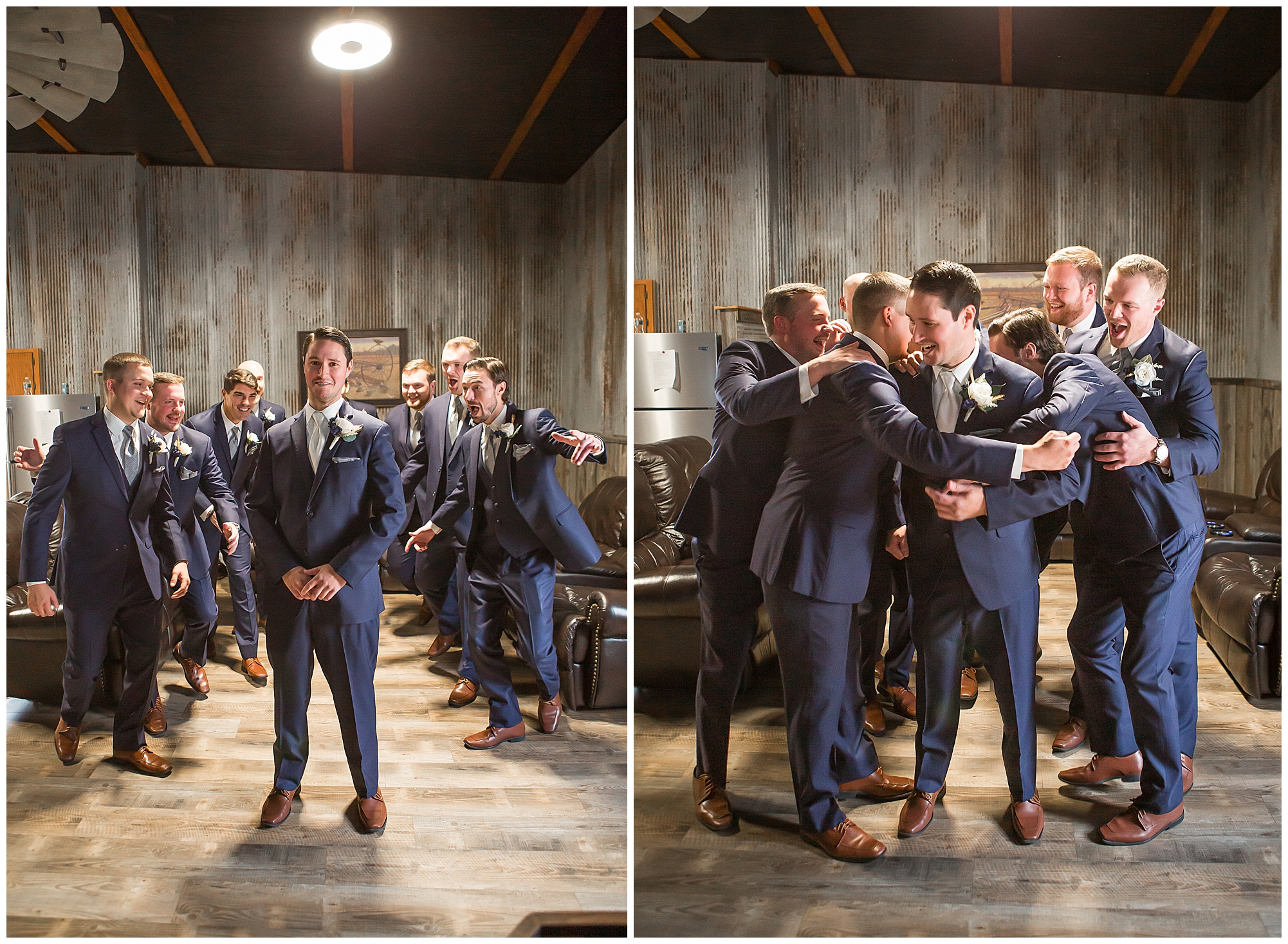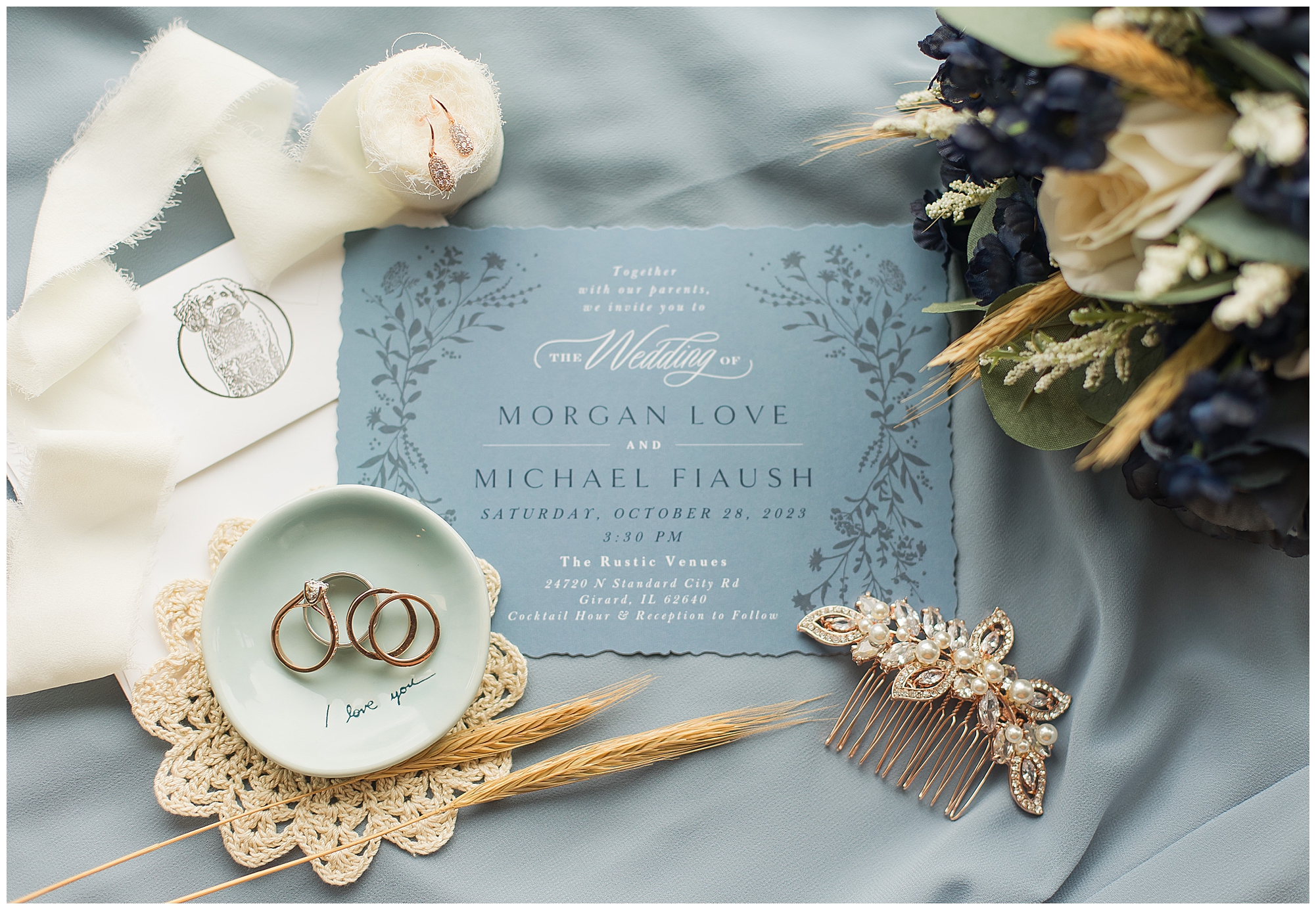 Morgan and Michael held their ceremony and reception at the gorgeous The Rustic Venues in Girard, Illinois on a chilly October day. The bridal suite was bustling with Morgan and her ladies when I arrived. So much excitement surrounding this delightful bride on her special day! When it came time for Morgan to step into her gown she was absolutely stunning! The floral details and sparkle sprinkled about gave this bride the best part of her look…Her smile! And with the touches of dusty blues and navy in the bridesmaids dresses and flowers it was literal perfection all the way around! Michael and his guys absolutely brought the class dressed in navy suits, with Michael in a cream tie, while his groomsmen donned grey ones. Now that everyone glowed up, it was time for Morgan and Michael to see one another! However, before the bride and groom’s first look, it was only fair that Morgan’s dad, Matt, had his opportunity to see his daughter in her wedding dress. When I was getting Matt set up right before Morgan came out, he told me he was really nervous. So sweet! He took a deep breath before he turned to see Morgan and the emotions were all over his face! What a lovely moment! Next it was Michael’s turn. The smile on his face when he saw Morgan was priceless! These two shared a few quiet moments together and then it was on to bridal party photos!