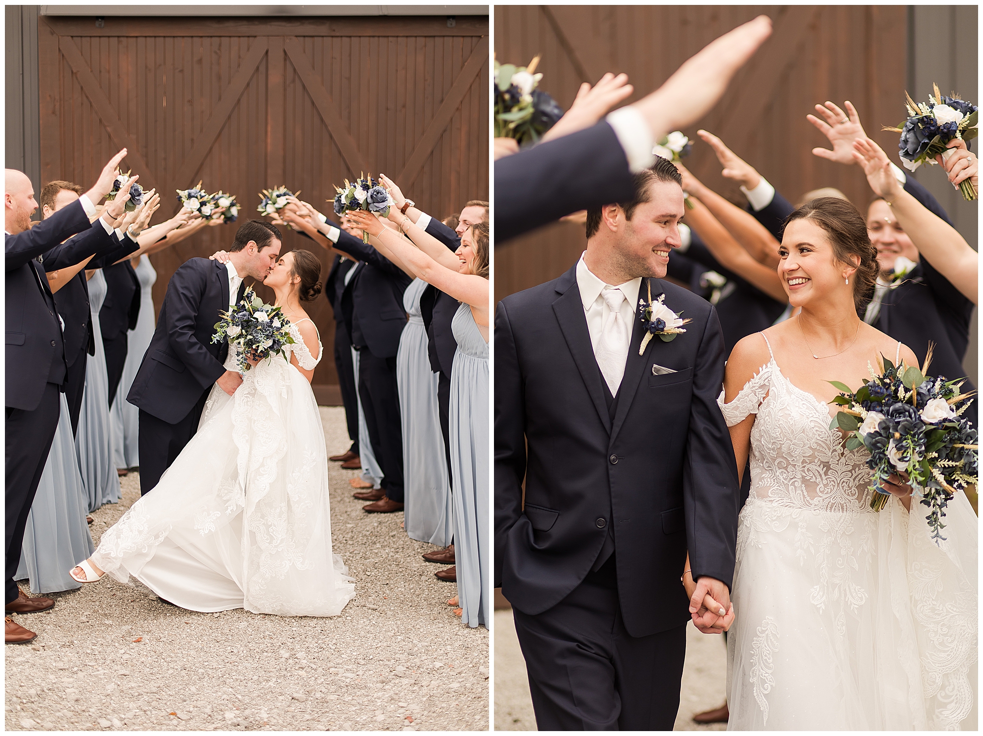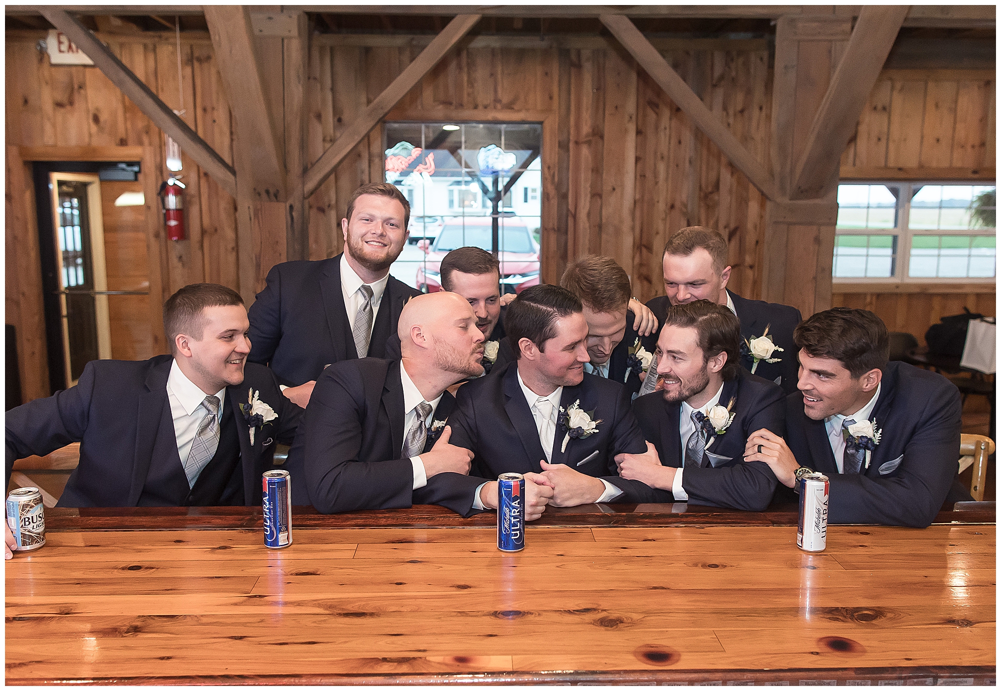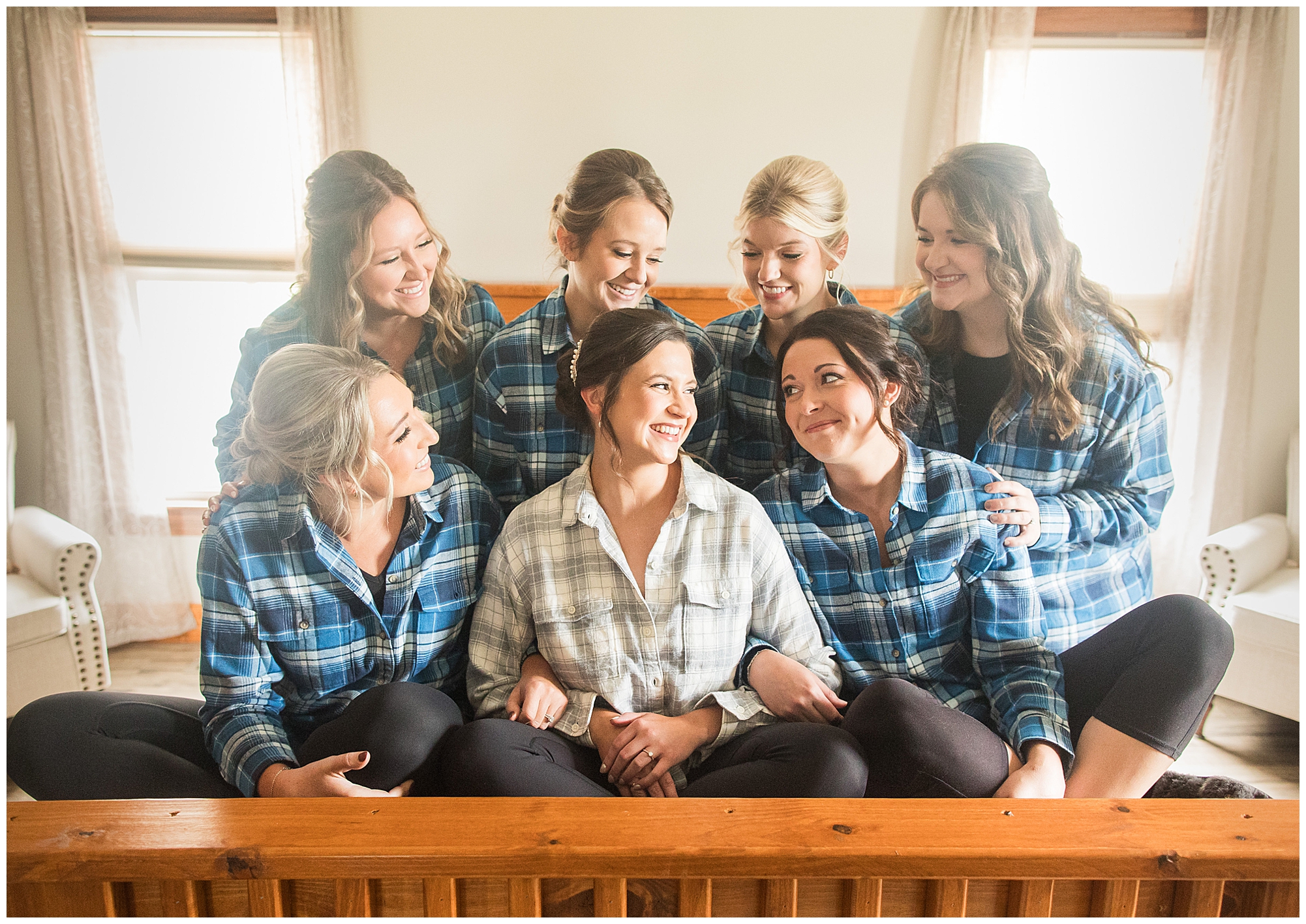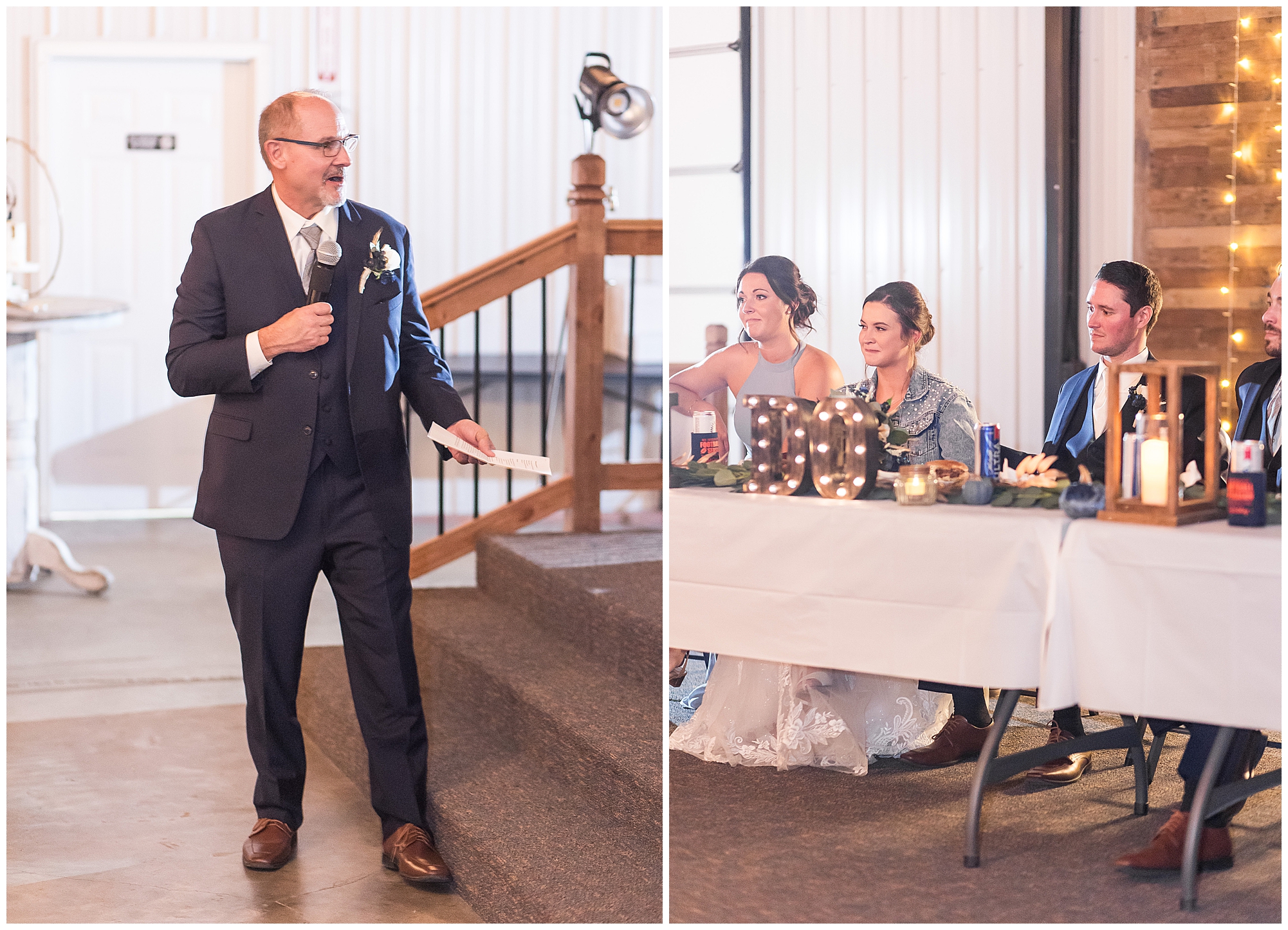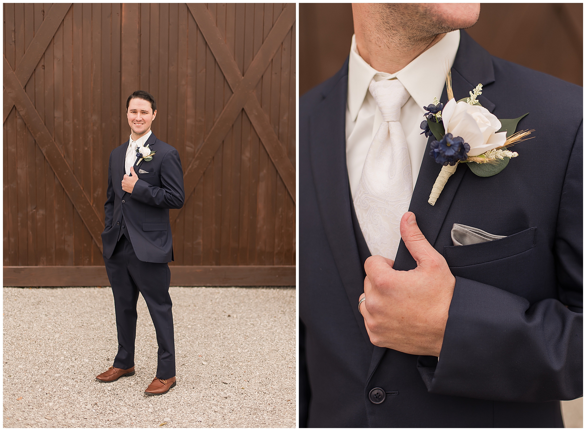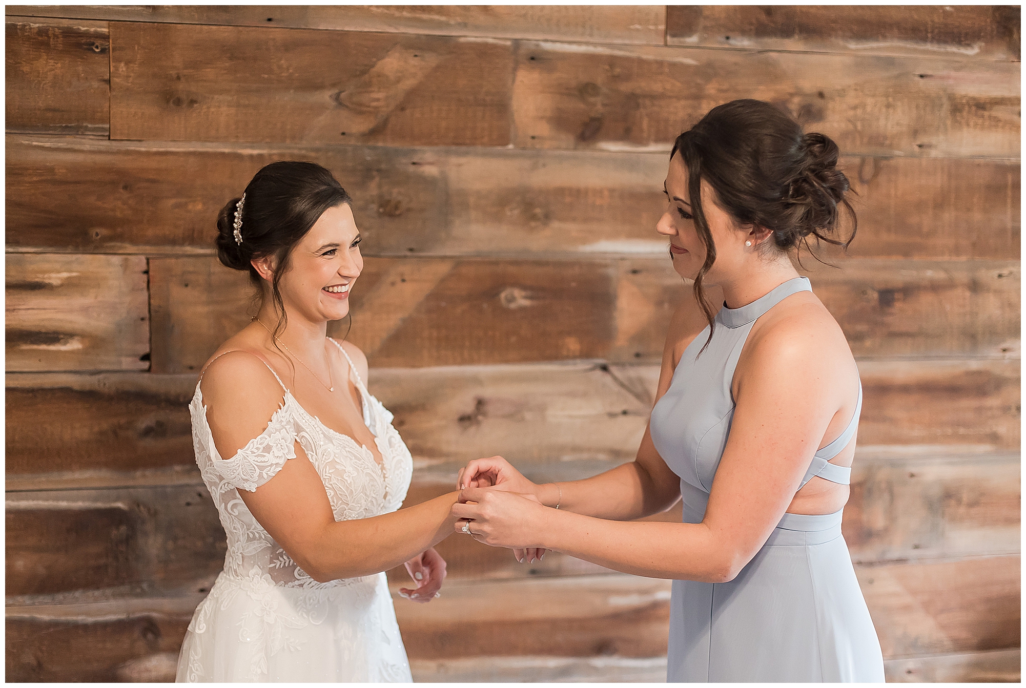 Morgan and Michael held their ceremony and reception at the gorgeous The Rustic Venues in Girard, Illinois on a chilly October day. The bridal suite was bustling with Morgan and her ladies when I arrived. So much excitement surrounding this delightful bride on her special day! When it came time for Morgan to step into her gown she was absolutely stunning! The floral details and sparkle sprinkled about gave this bride the best part of her look…Her smile! And with the touches of dusty blues and navy in the bridesmaids dresses and flowers it was literal perfection all the way around! Michael and his guys absolutely brought the class dressed in navy suits, with Michael in a cream tie, while his groomsmen donned grey ones. Now that everyone glowed up, it was time for Morgan and Michael to see one another! However, before the bride and groom’s first look, it was only fair that Morgan’s dad, Matt, had his opportunity to see his daughter in her wedding dress. When I was getting Matt set up right before Morgan came out, he told me he was really nervous. So sweet! He took a deep breath before he turned to see Morgan and the emotions were all over his face! What a lovely moment! Next it was Michael’s turn. The smile on his face when he saw Morgan was priceless! These two shared a few quiet moments together and then it was on to bridal party photos!