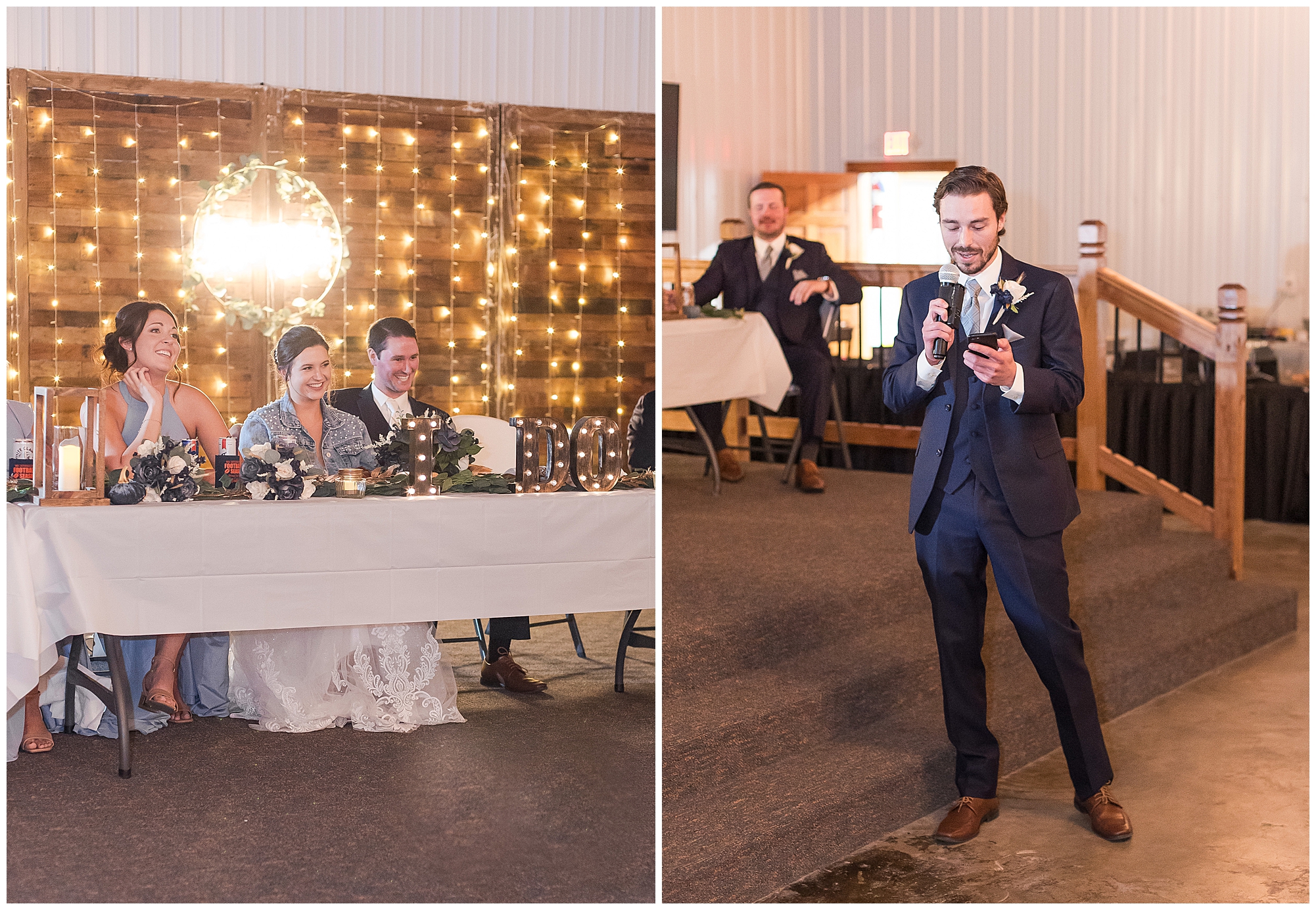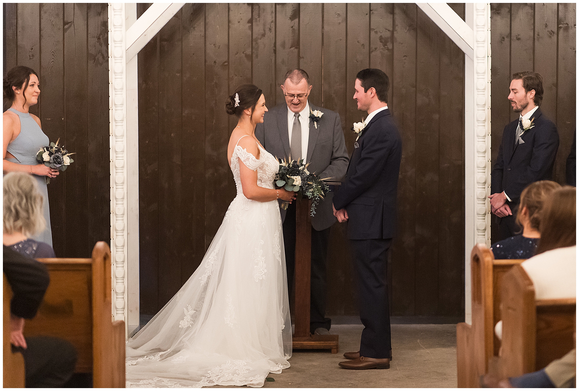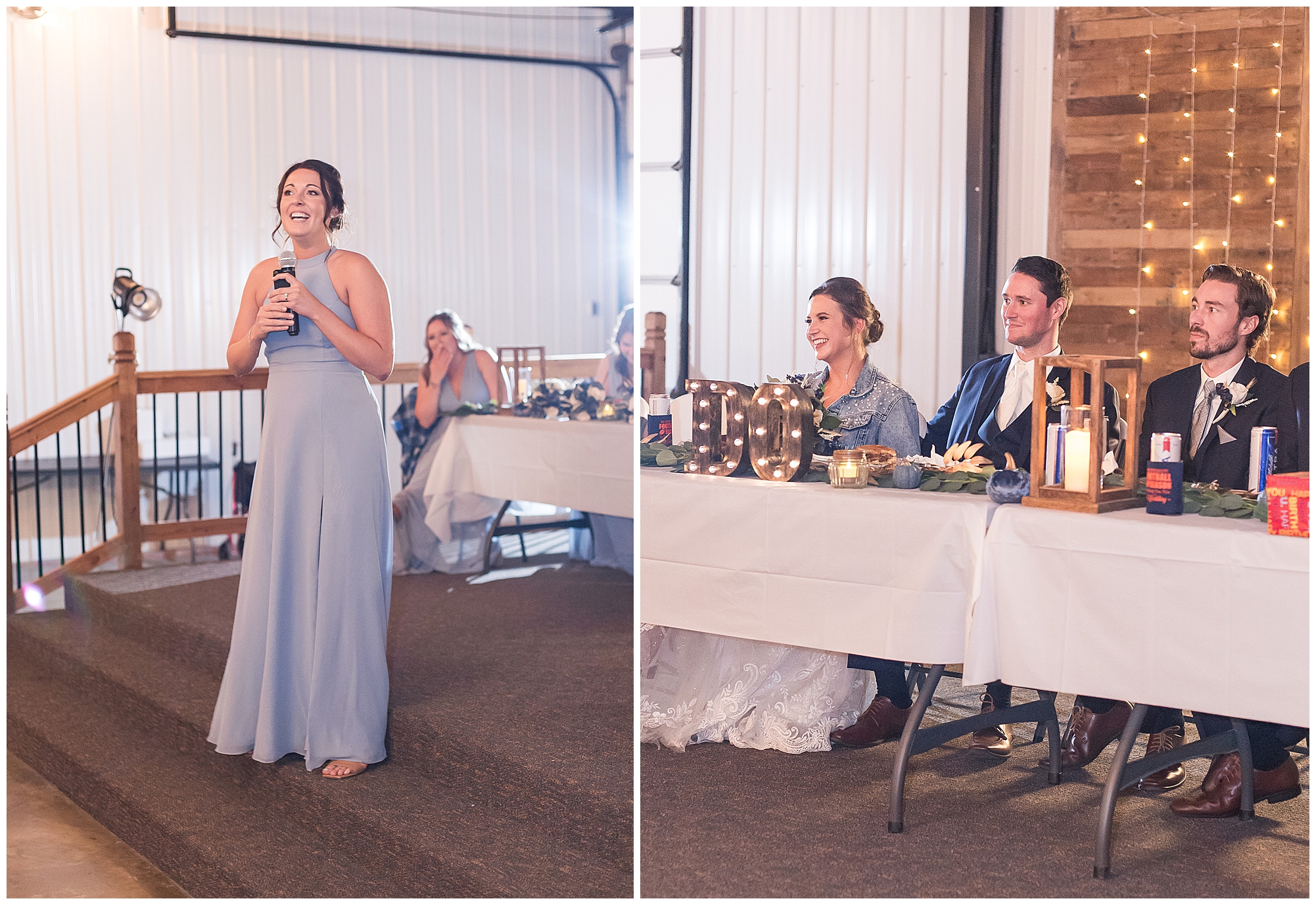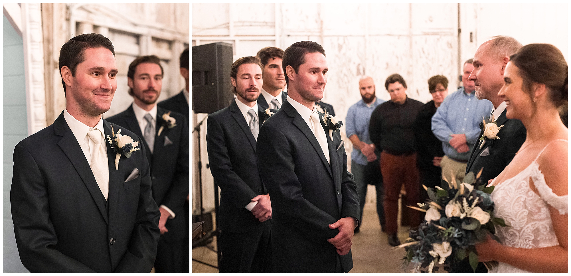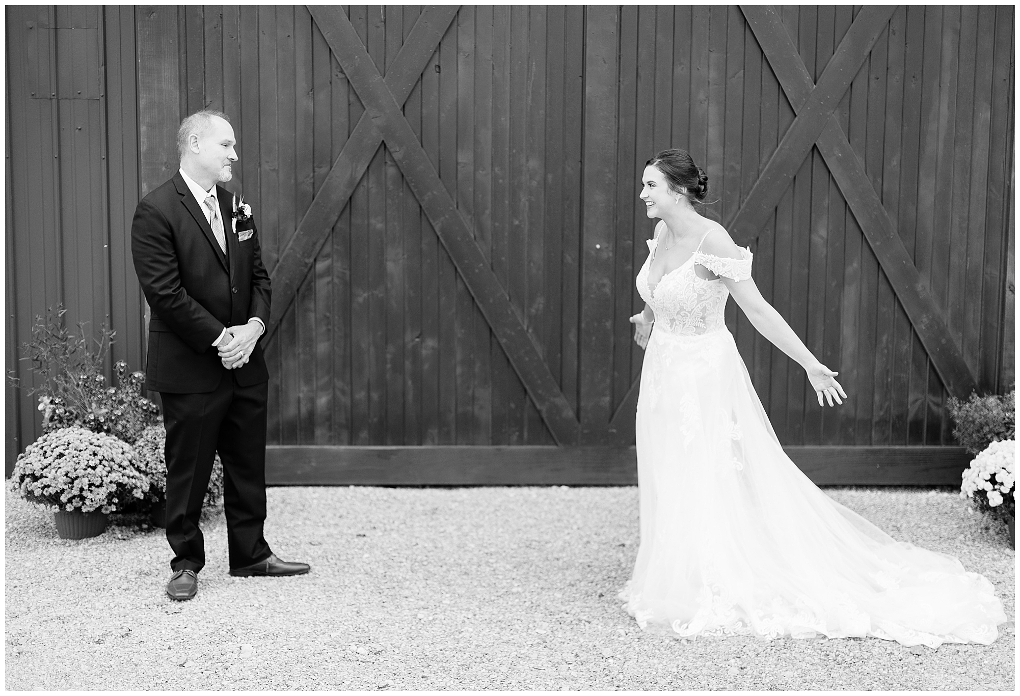 Morgan and Michael held their ceremony and reception at the gorgeous The Rustic Venues in Girard, Illinois on a chilly October day. The bridal suite was bustling with Morgan and her ladies when I arrived. So much excitement surrounding this delightful bride on her special day! When it came time for Morgan to step into her gown she was absolutely stunning! The floral details and sparkle sprinkled about gave this bride the best part of her look…Her smile! And with the touches of dusty blues and navy in the bridesmaids dresses and flowers it was literal perfection all the way around! Michael and his guys absolutely brought the class dressed in navy suits, with Michael in a cream tie, while his groomsmen donned grey ones. Now that everyone glowed up, it was time for Morgan and Michael to see one another! However, before the bride and groom’s first look, it was only fair that Morgan’s dad, Matt, had his opportunity to see his daughter in her wedding dress. When I was getting Matt set up right before Morgan came out, he told me he was really nervous. So sweet! He took a deep breath before he turned to see Morgan and the emotions were all over his face! What a lovely moment! Next it was Michael’s turn. The smile on his face when he saw Morgan was priceless! These two shared a few quiet moments together and then it was on to bridal party photos!