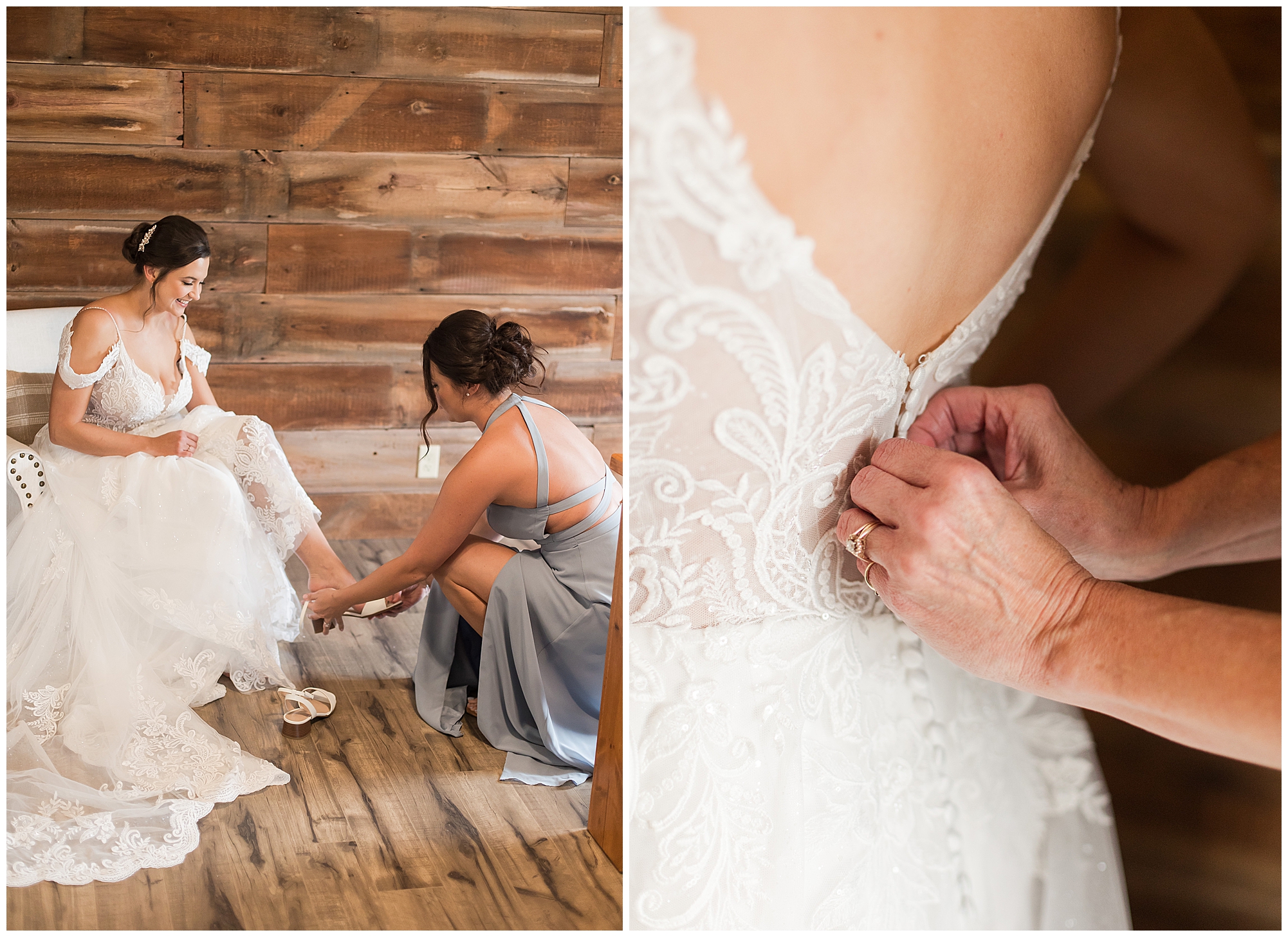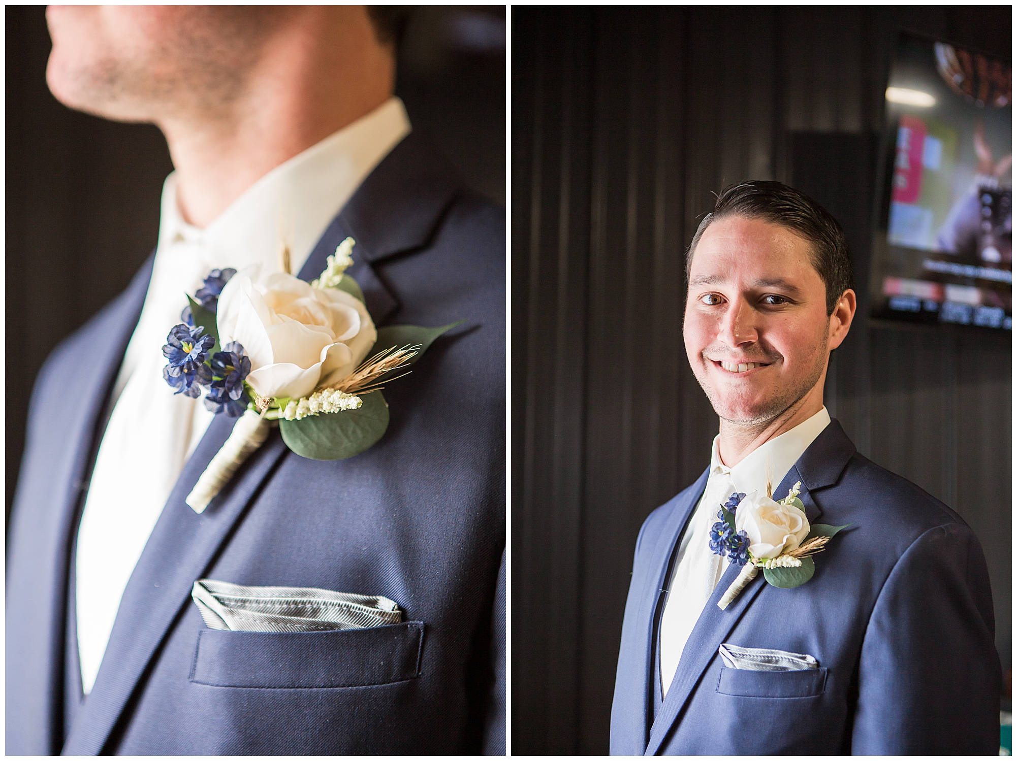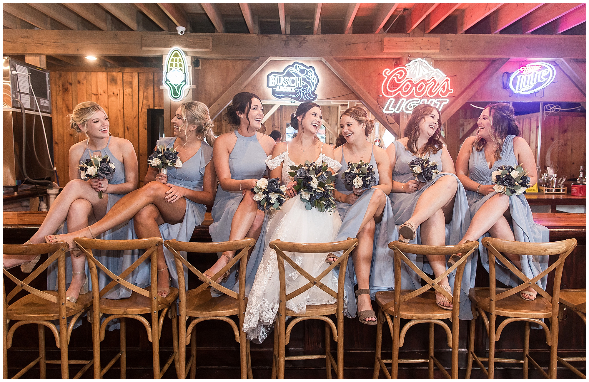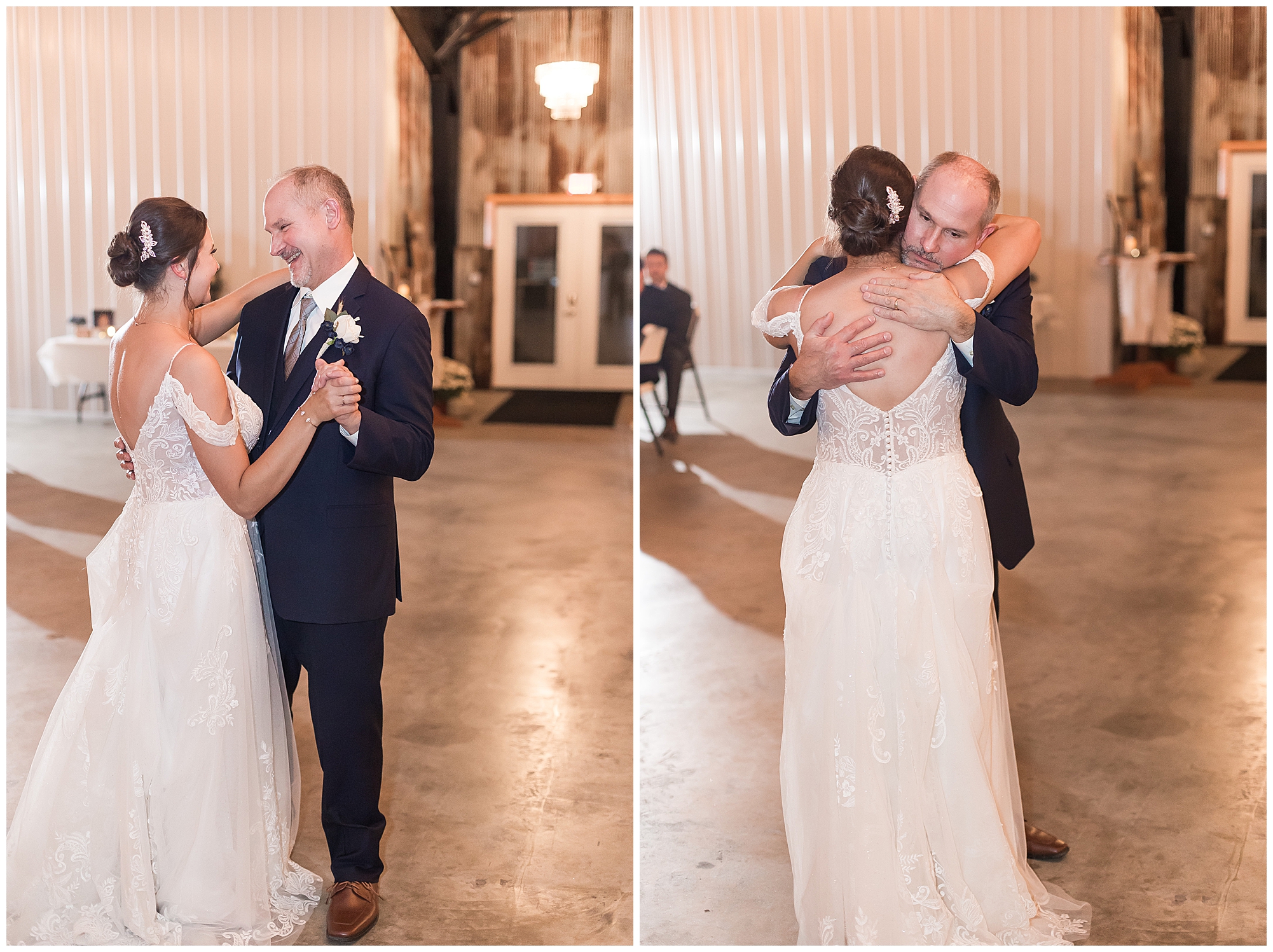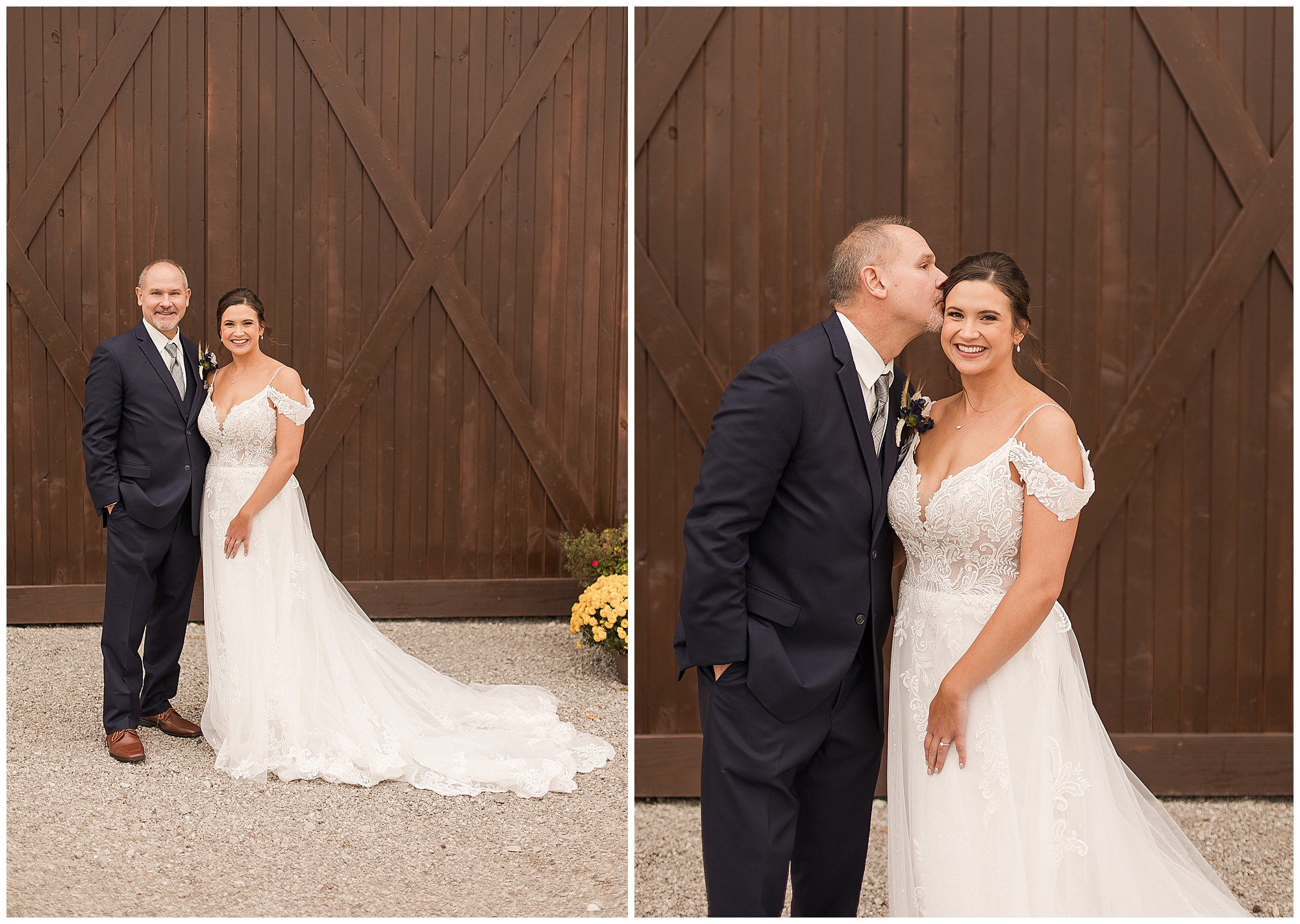 Morgan and Michael held their ceremony and reception at the gorgeous The Rustic Venues in Girard, Illinois on a chilly October day. The bridal suite was bustling with Morgan and her ladies when I arrived. So much excitement surrounding this delightful bride on her special day! When it came time for Morgan to step into her gown she was absolutely stunning! The floral details and sparkle sprinkled about gave this bride the best part of her look…Her smile! And with the touches of dusty blues and navy in the bridesmaids dresses and flowers it was literal perfection all the way around! Michael and his guys absolutely brought the class dressed in navy suits, with Michael in a cream tie, while his groomsmen donned grey ones. Now that everyone glowed up, it was time for Morgan and Michael to see one another! However, before the bride and groom’s first look, it was only fair that Morgan’s dad, Matt, had his opportunity to see his daughter in her wedding dress. When I was getting Matt set up right before Morgan came out, he told me he was really nervous. So sweet! He took a deep breath before he turned to see Morgan and the emotions were all over his face! What a lovely moment! Next it was Michael’s turn. The smile on his face when he saw Morgan was priceless! These two shared a few quiet moments together and then it was on to bridal party photos!