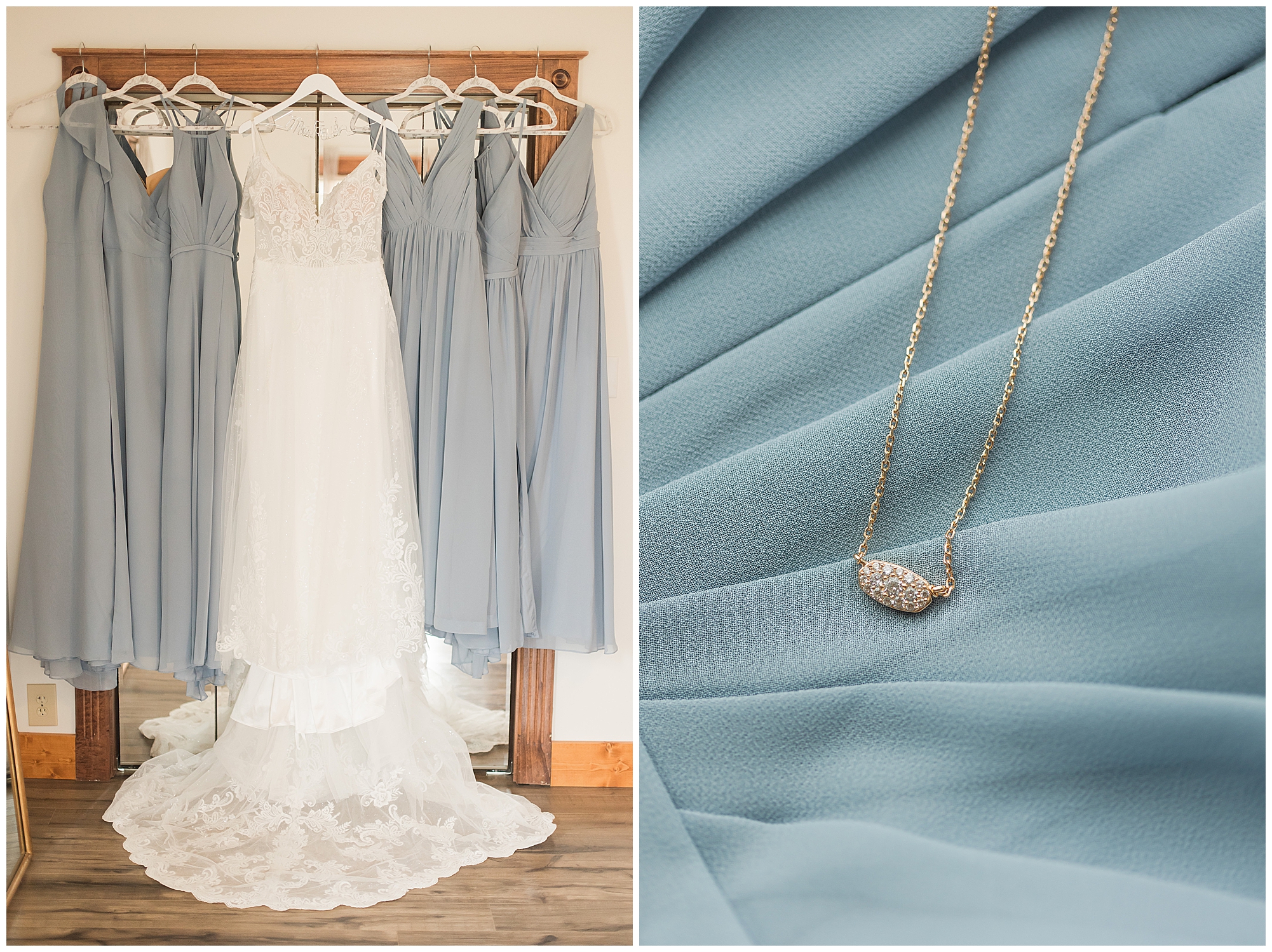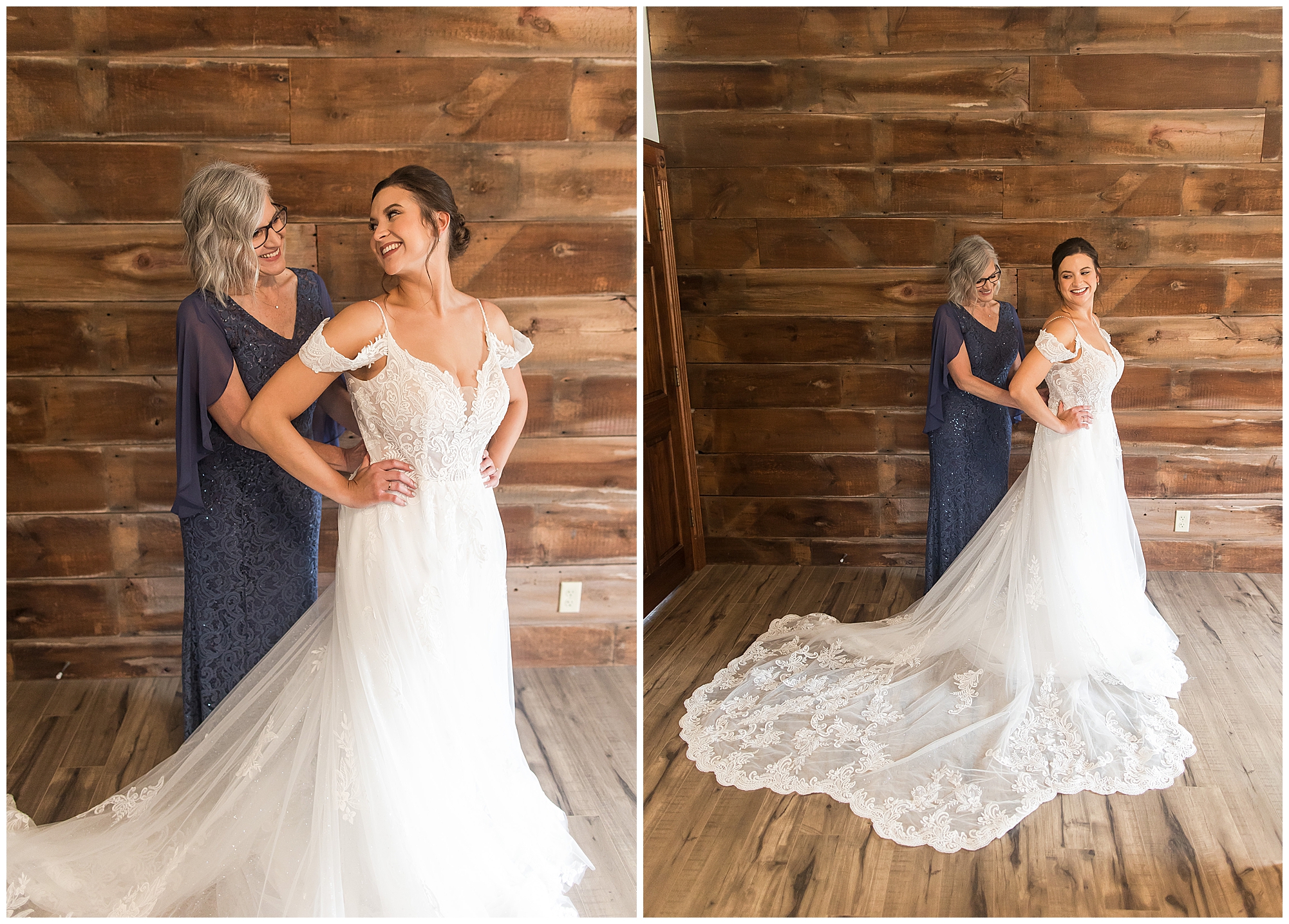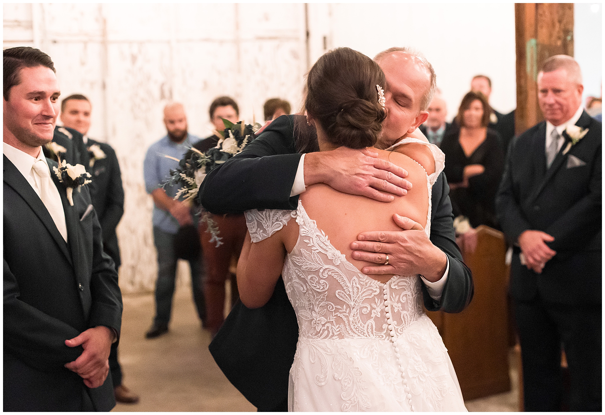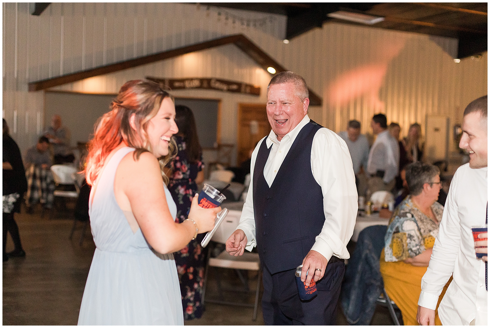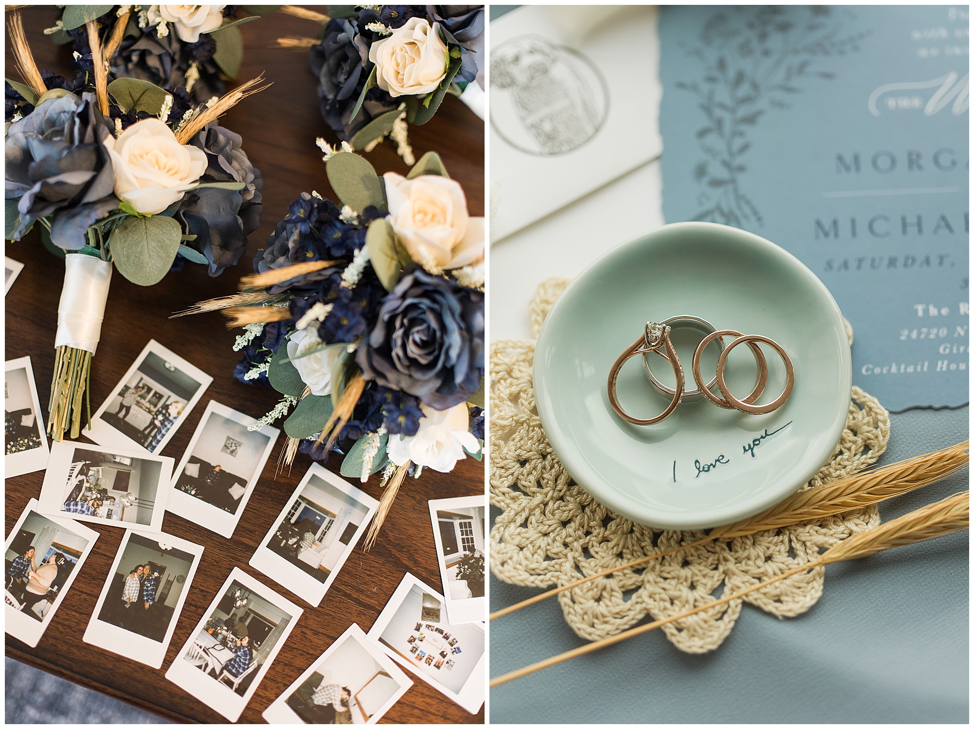 Morgan and Michael held their ceremony and reception at the gorgeous The Rustic Venues in Girard, Illinois on a chilly October day. The bridal suite was bustling with Morgan and her ladies when I arrived. So much excitement surrounding this delightful bride on her special day! When it came time for Morgan to step into her gown she was absolutely stunning! The floral details and sparkle sprinkled about gave this bride the best part of her look…Her smile! And with the touches of dusty blues and navy in the bridesmaids dresses and flowers it was literal perfection all the way around! Michael and his guys absolutely brought the class dressed in navy suits, with Michael in a cream tie, while his groomsmen donned grey ones. Now that everyone glowed up, it was time for Morgan and Michael to see one another! However, before the bride and groom’s first look, it was only fair that Morgan’s dad, Matt, had his opportunity to see his daughter in her wedding dress. When I was getting Matt set up right before Morgan came out, he told me he was really nervous. So sweet! He took a deep breath before he turned to see Morgan and the emotions were all over his face! What a lovely moment! Next it was Michael’s turn. The smile on his face when he saw Morgan was priceless! These two shared a few quiet moments together and then it was on to bridal party photos!