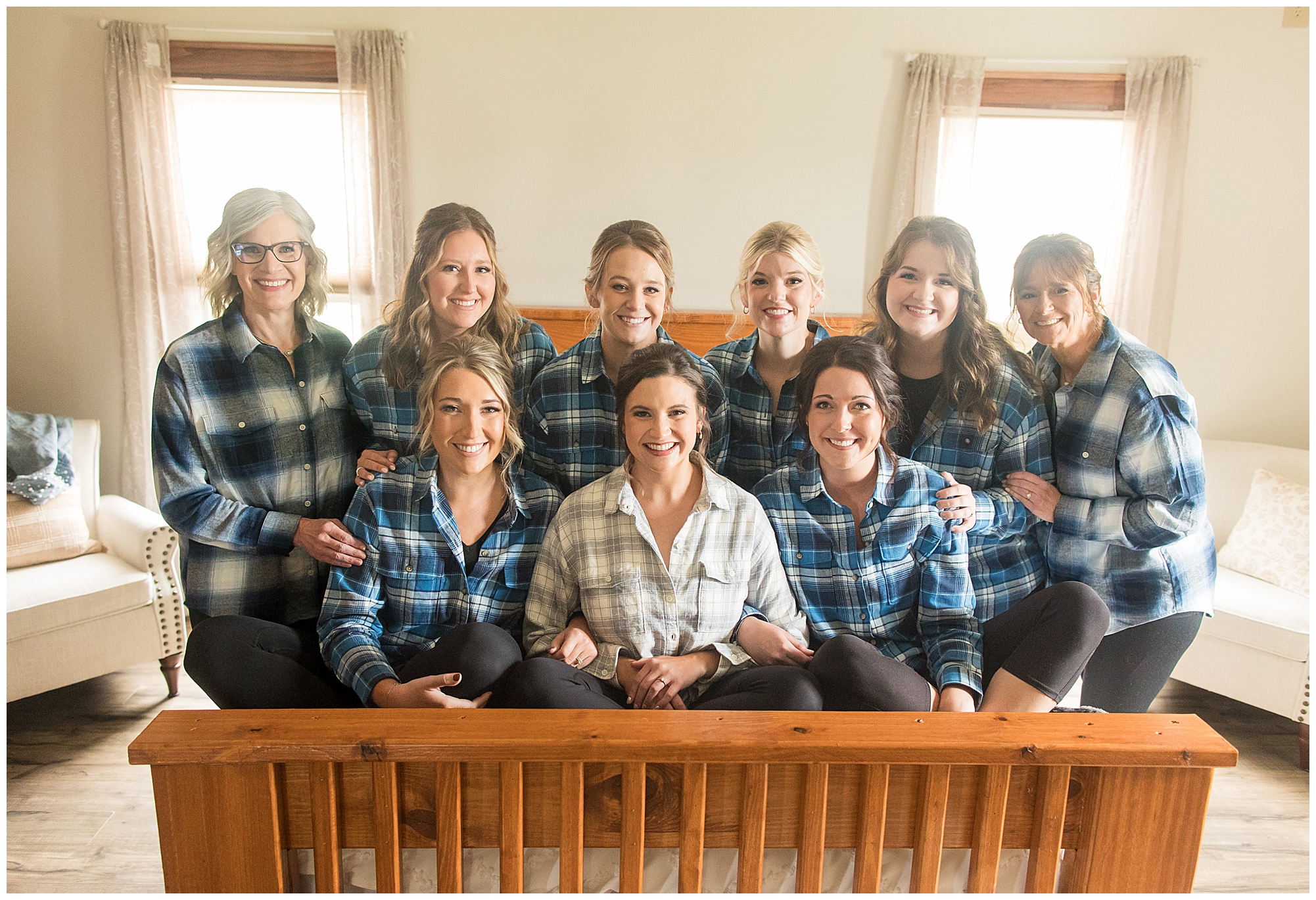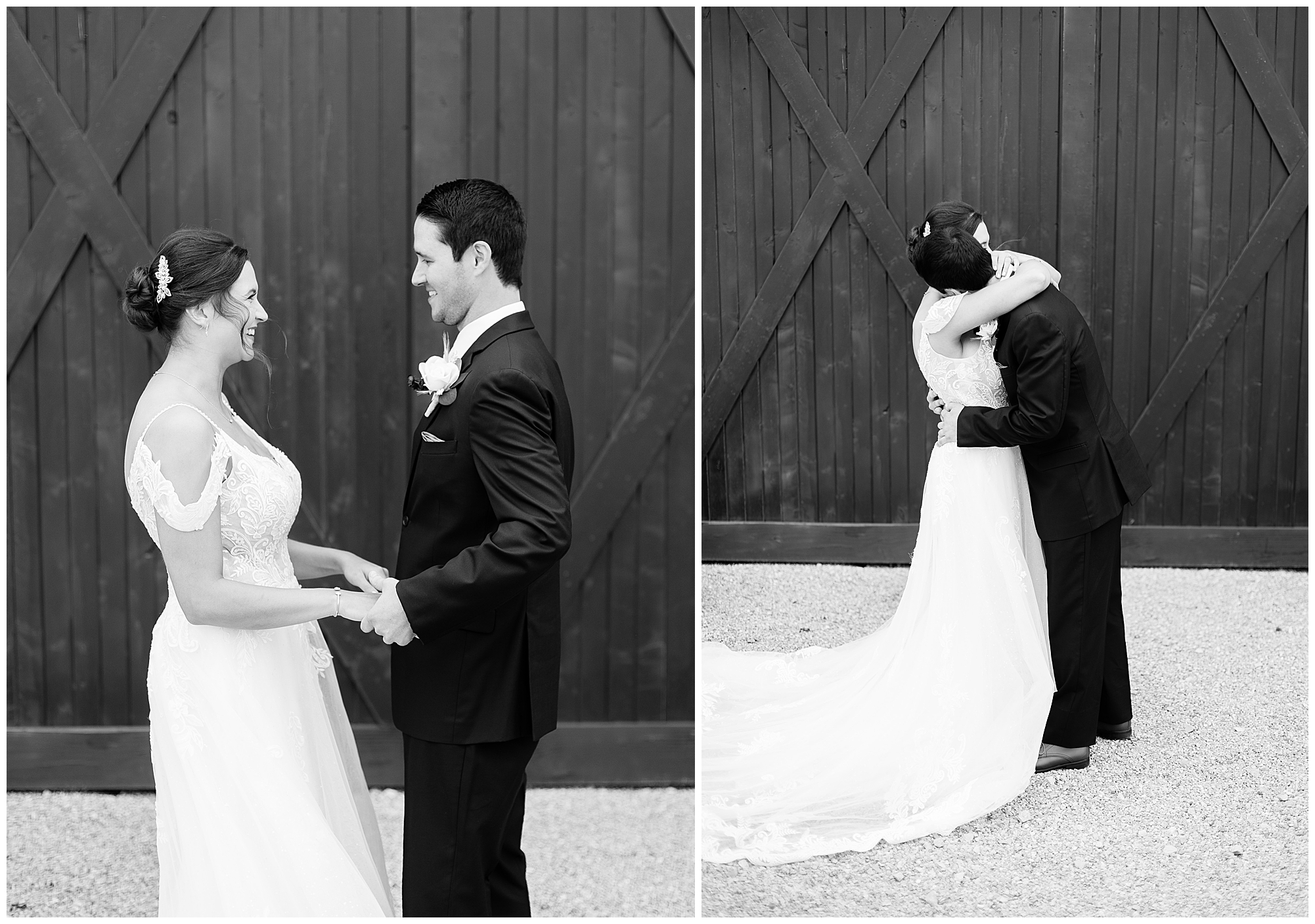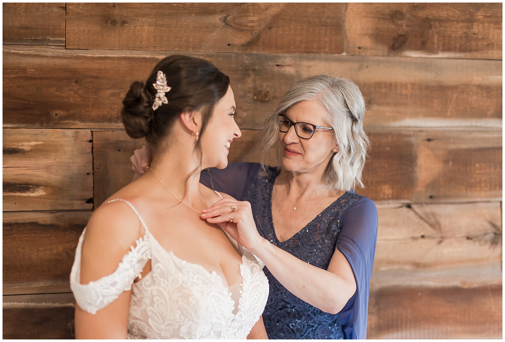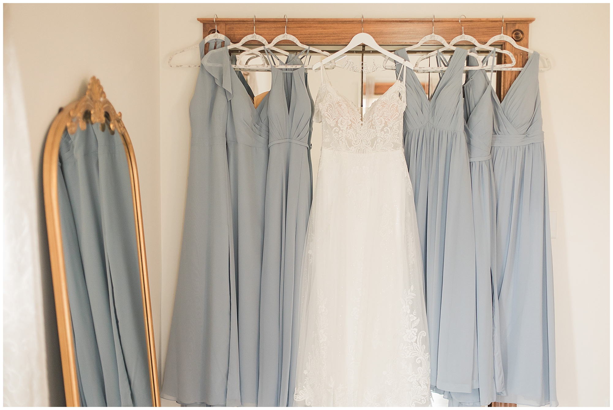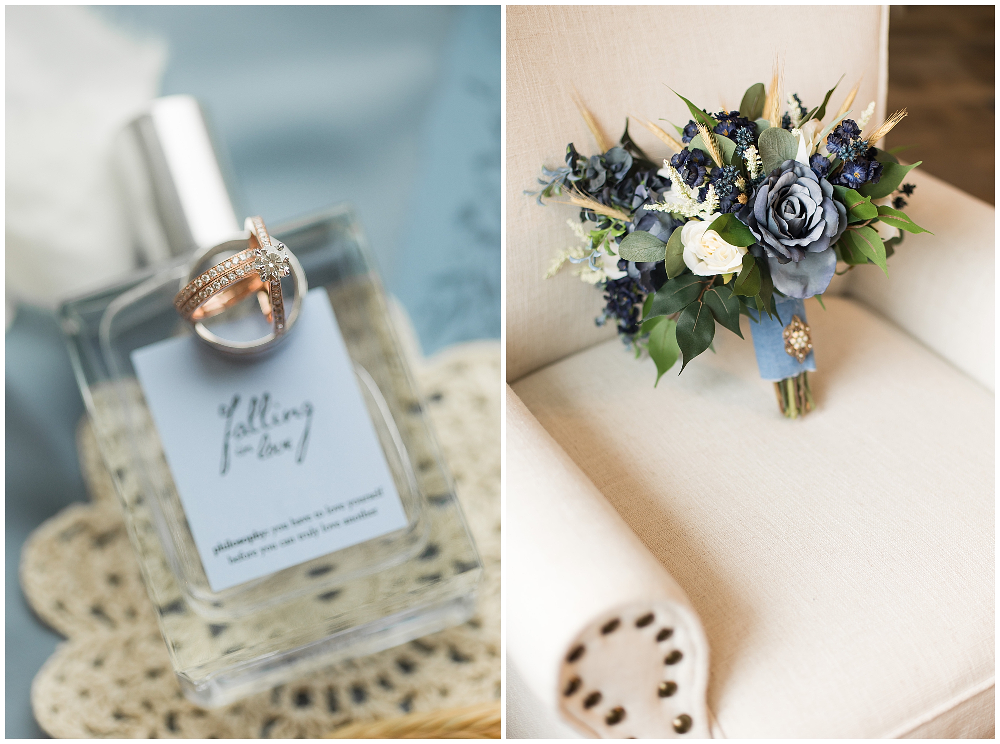 Morgan and Michael held their ceremony and reception at the gorgeous The Rustic Venues in Girard, Illinois on a chilly October day. The bridal suite was bustling with Morgan and her ladies when I arrived. So much excitement surrounding this delightful bride on her special day! When it came time for Morgan to step into her gown she was absolutely stunning! The floral details and sparkle sprinkled about gave this bride the best part of her look…Her smile! And with the touches of dusty blues and navy in the bridesmaids dresses and flowers it was literal perfection all the way around! Michael and his guys absolutely brought the class dressed in navy suits, with Michael in a cream tie, while his groomsmen donned grey ones. Now that everyone glowed up, it was time for Morgan and Michael to see one another! However, before the bride and groom’s first look, it was only fair that Morgan’s dad, Matt, had his opportunity to see his daughter in her wedding dress. When I was getting Matt set up right before Morgan came out, he told me he was really nervous. So sweet! He took a deep breath before he turned to see Morgan and the emotions were all over his face! What a lovely moment! Next it was Michael’s turn. The smile on his face when he saw Morgan was priceless! These two shared a few quiet moments together and then it was on to bridal party photos!