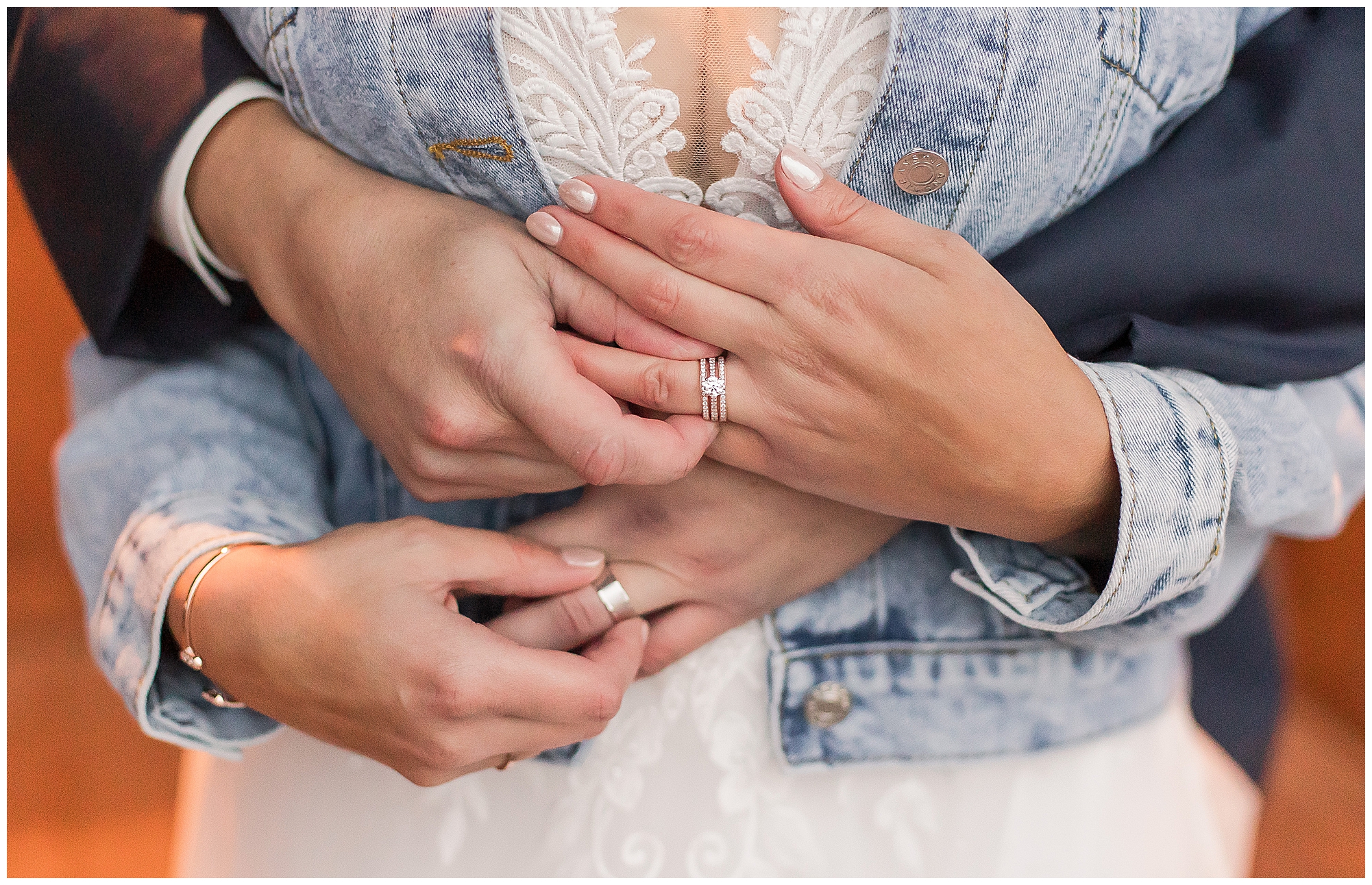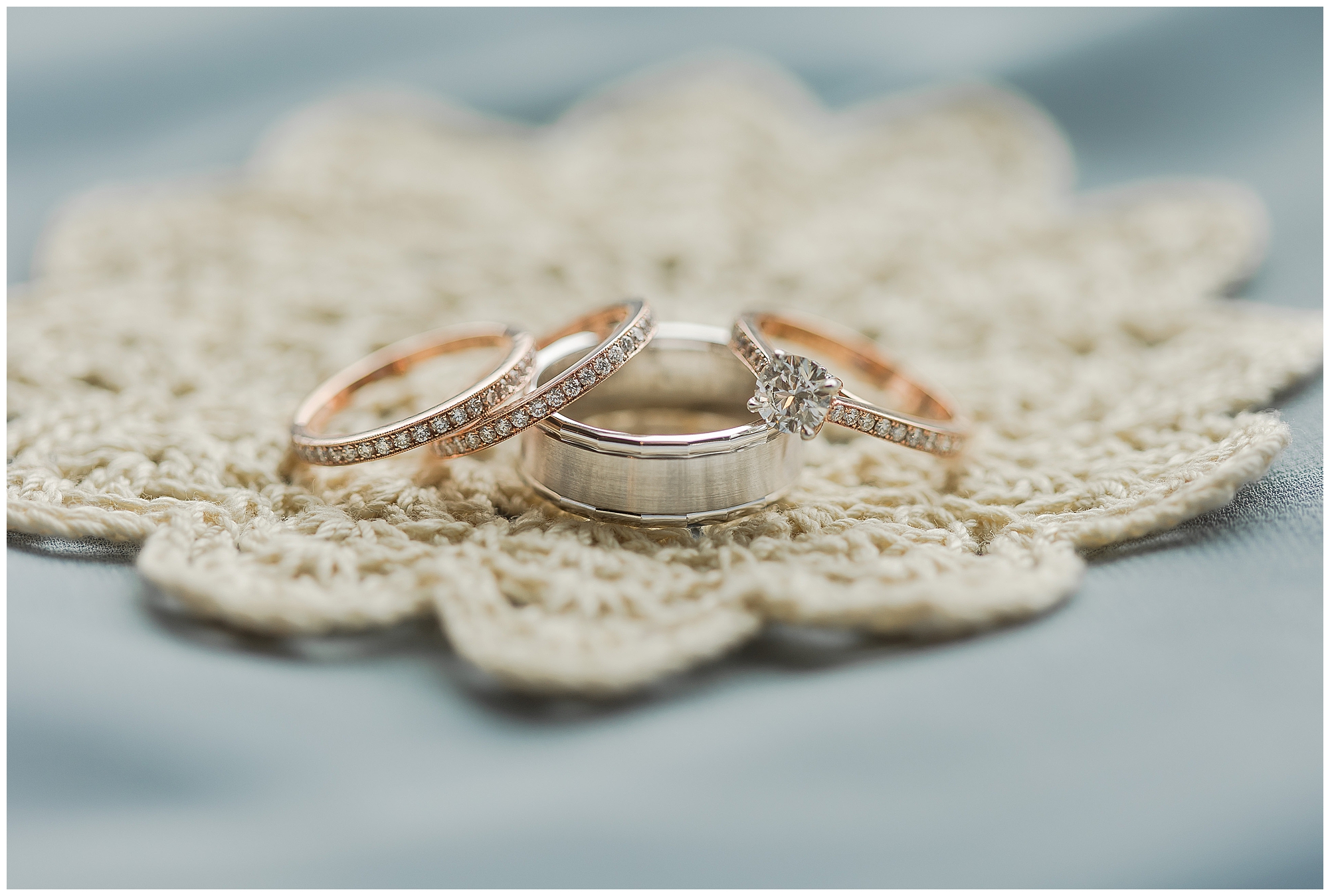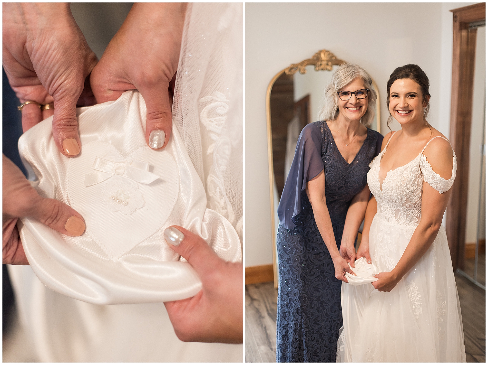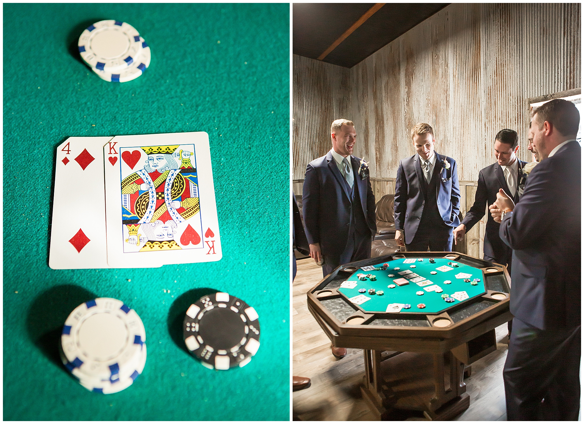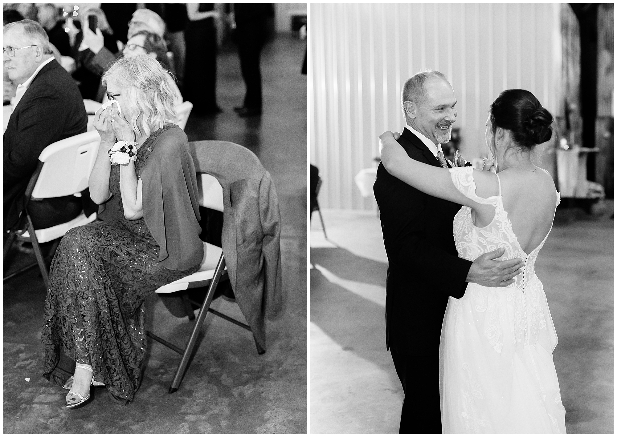 Morgan and Michael held their ceremony and reception at the gorgeous The Rustic Venues in Girard, Illinois on a chilly October day. The bridal suite was bustling with Morgan and her ladies when I arrived. So much excitement surrounding this delightful bride on her special day! When it came time for Morgan to step into her gown she was absolutely stunning! The floral details and sparkle sprinkled about gave this bride the best part of her look…Her smile! And with the touches of dusty blues and navy in the bridesmaids dresses and flowers it was literal perfection all the way around! Michael and his guys absolutely brought the class dressed in navy suits, with Michael in a cream tie, while his groomsmen donned grey ones. Now that everyone glowed up, it was time for Morgan and Michael to see one another! However, before the bride and groom’s first look, it was only fair that Morgan’s dad, Matt, had his opportunity to see his daughter in her wedding dress. When I was getting Matt set up right before Morgan came out, he told me he was really nervous. So sweet! He took a deep breath before he turned to see Morgan and the emotions were all over his face! What a lovely moment! Next it was Michael’s turn. The smile on his face when he saw Morgan was priceless! These two shared a few quiet moments together and then it was on to bridal party photos!