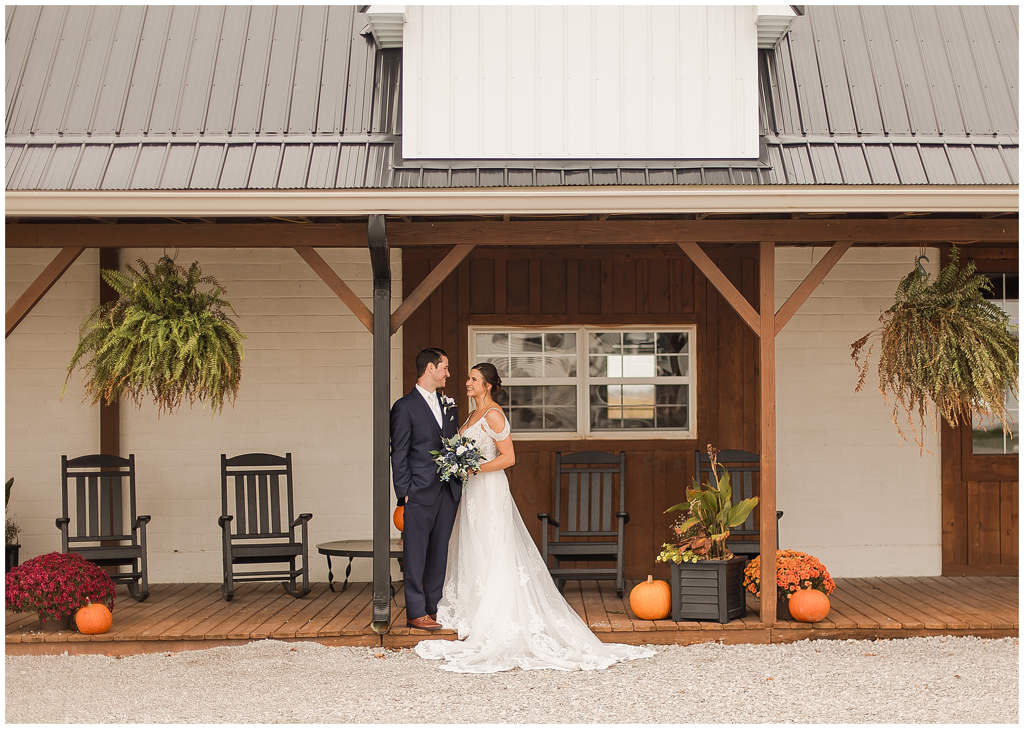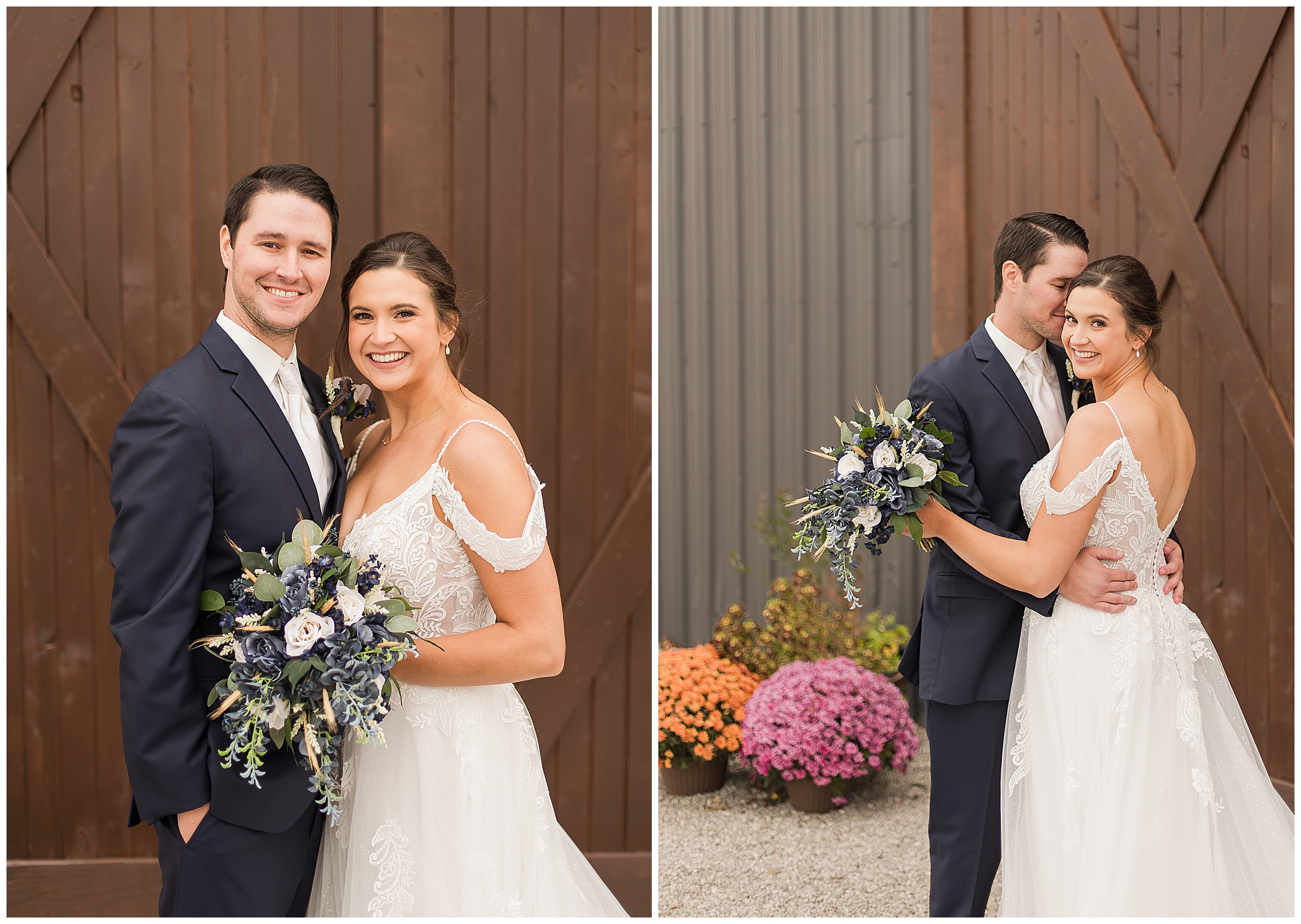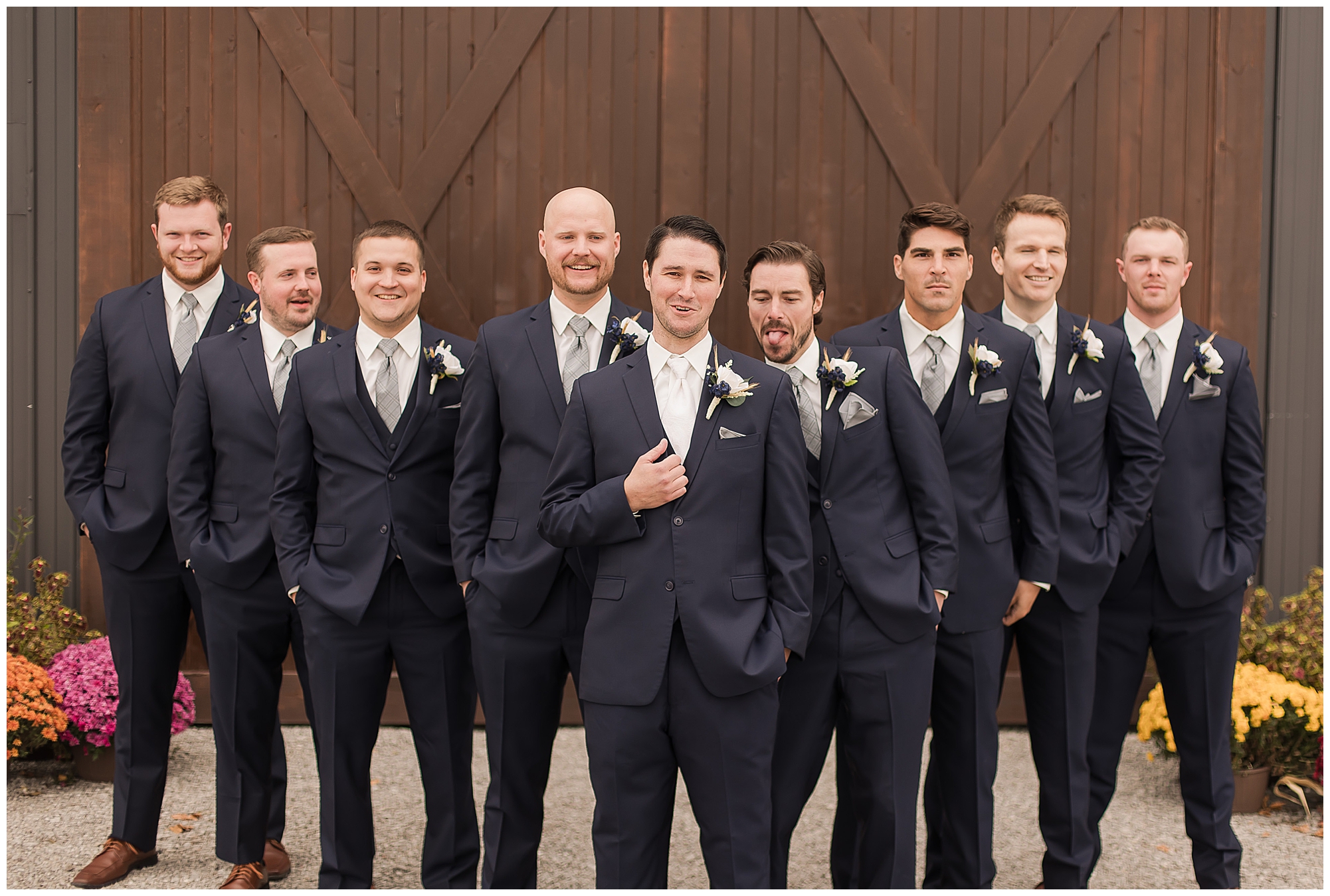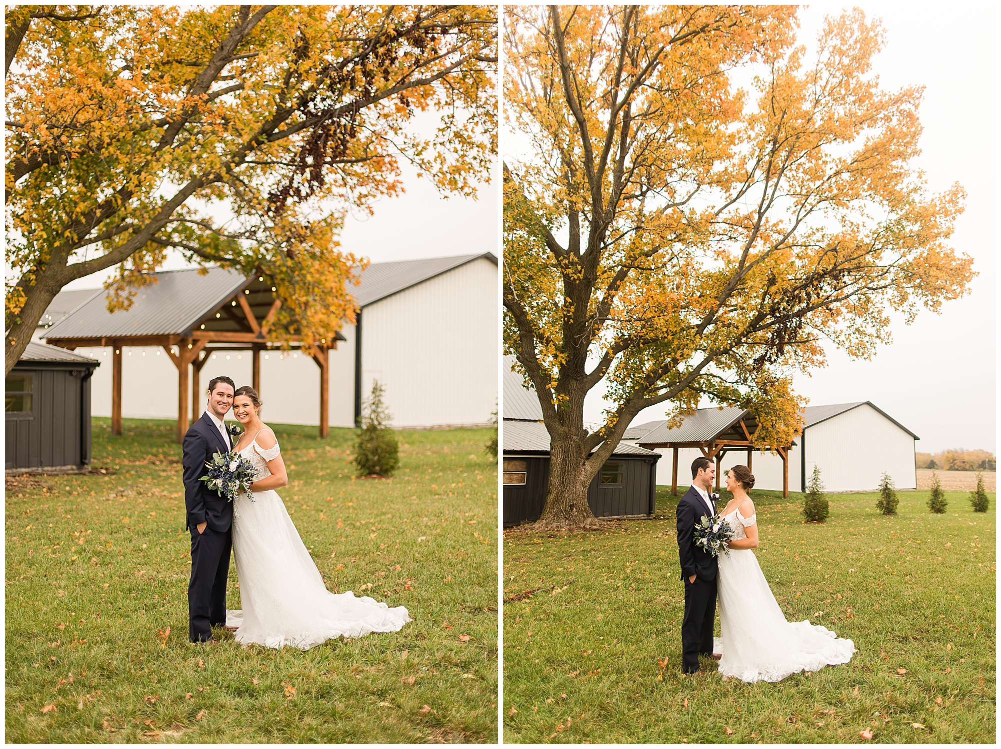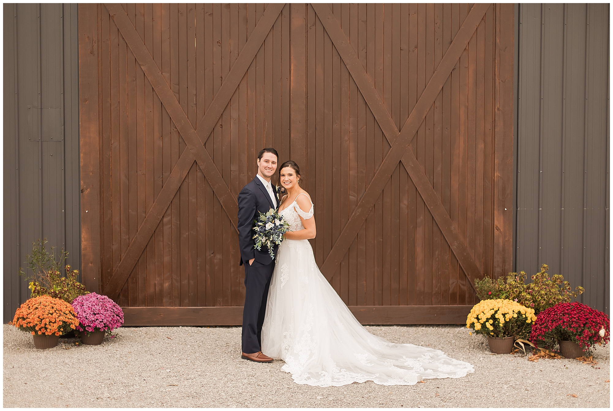 Now this crew of friends and family surrounding Morgan and Michael all day were incredible! They were helpful, attentive, and absolutely brought the energy! Plus, they did it all in pretty chilly temperatures! They were more than I could have asked for! I then had some time with this awesome couple for some photos, which didn’t disappoint! We wandered around the beautiful venue using the barn doors, long porch, and even found the one tree on the property that had some stunning fall colors left! Every moment I spent with this couple made my heart happy! Now, let’s get these two married!