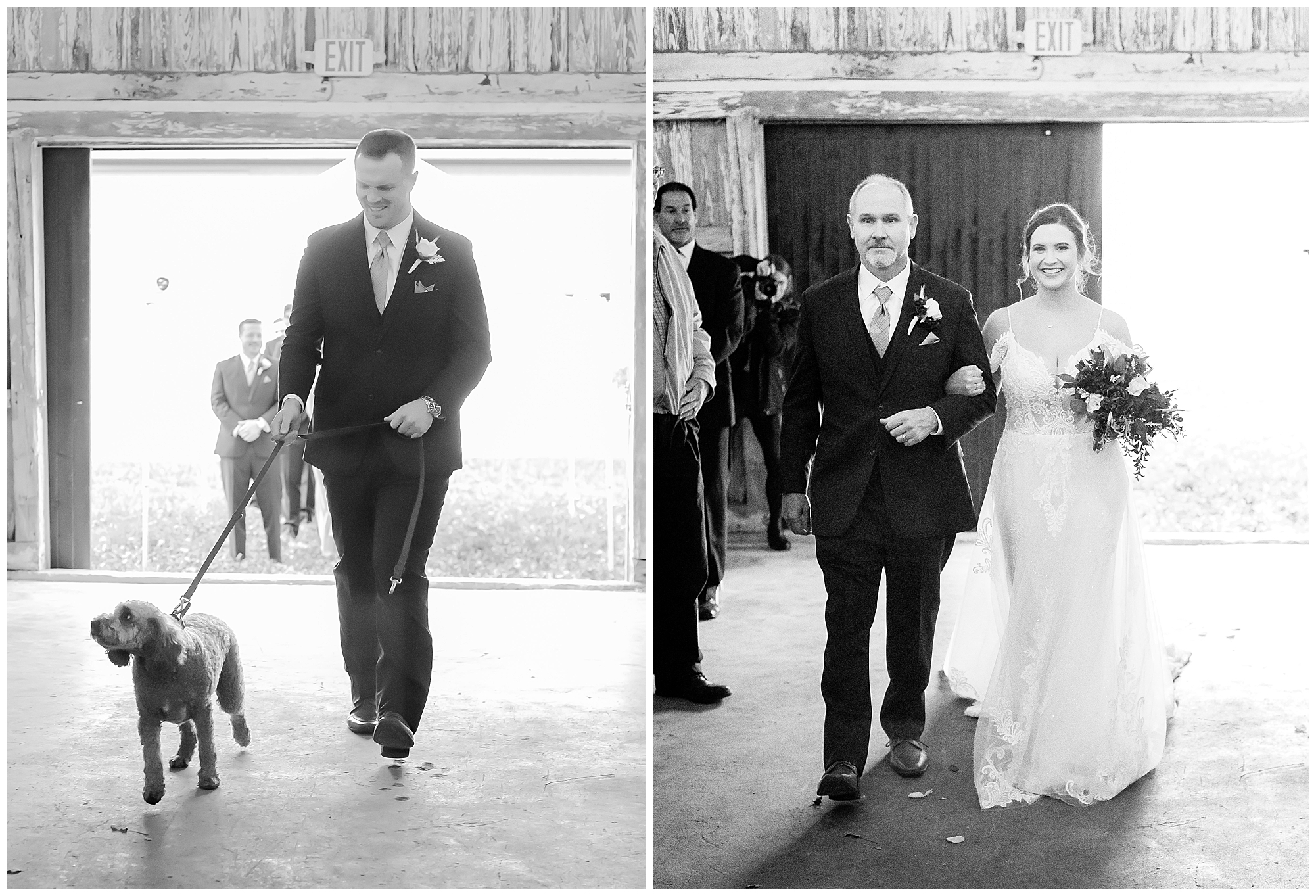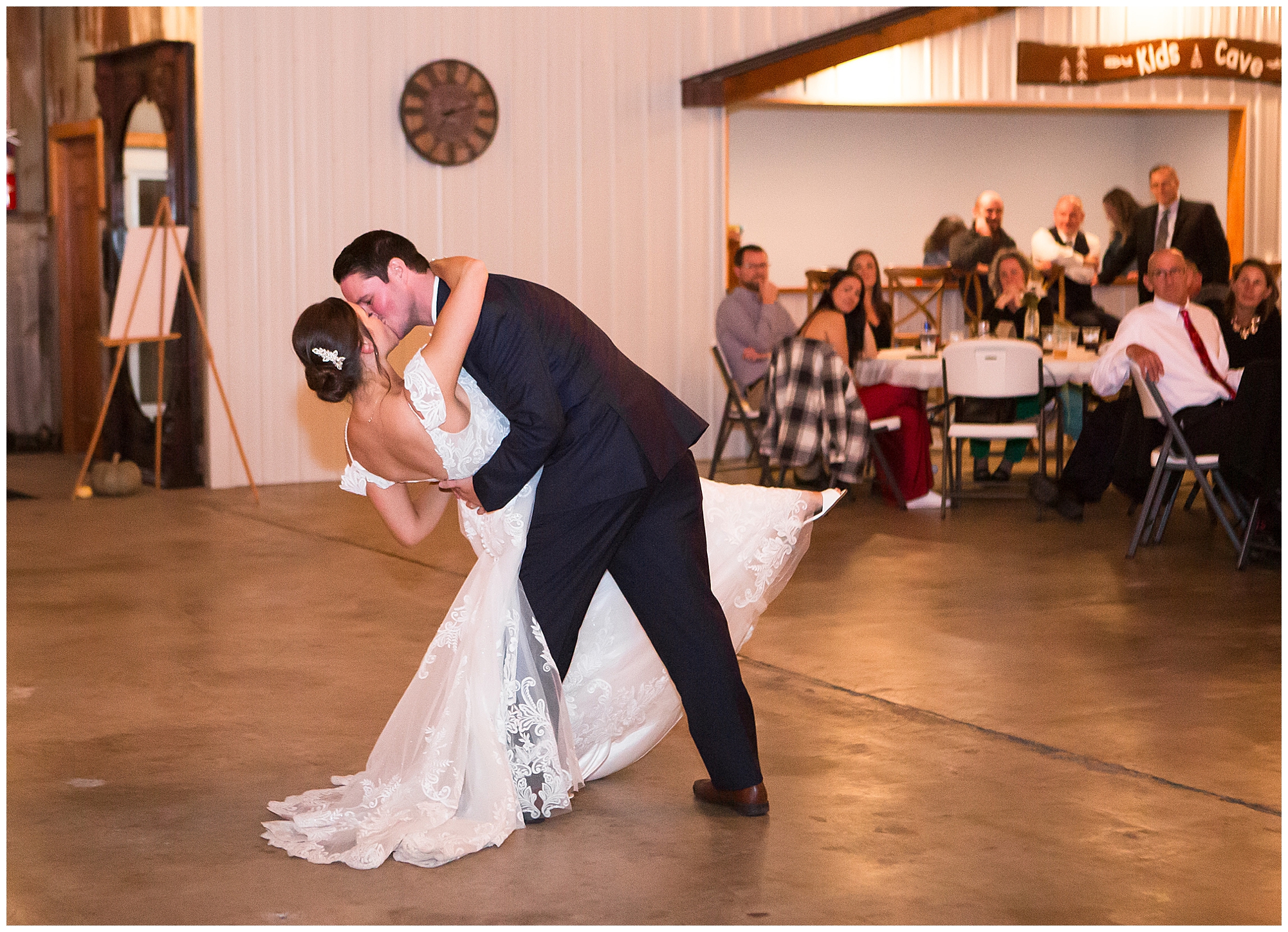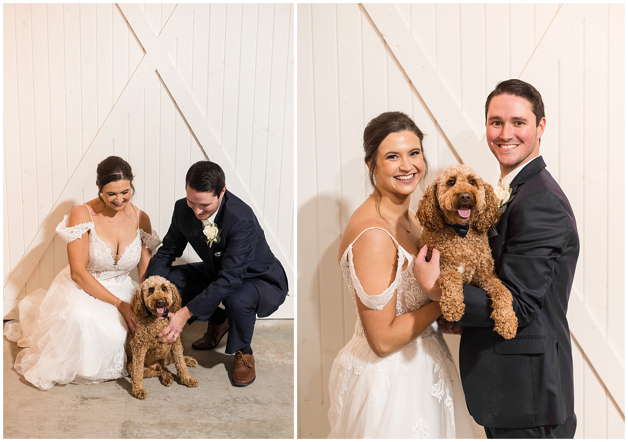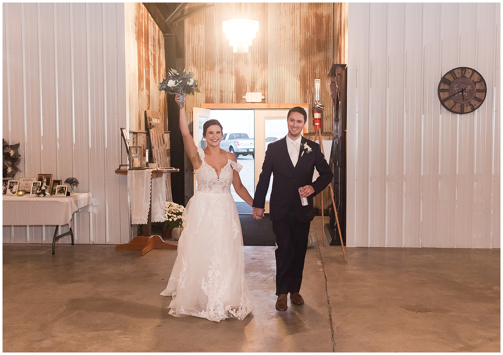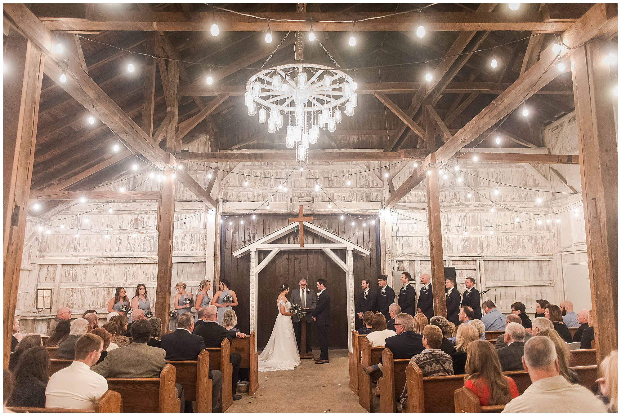The nuptials were held in the barn on the property where the rustic charm continued. The beamed ceilings were draped with lights and a huge chandelier and church pews were set for guests to sit. The barn was filled with loved ones there to support Morgan and Michael as they began this new chapter in their lives. Cooper, the pup, lead the way for his mom to make her way down the aisle to Michael with her dad. And with a maiden name of “LOVE” as Morgan’s was, you know you are in for a sentimental ceremony! It was reveled by their officiant, who is a long time family friend of the Love’s, that they discovered that between both of their parents and grandparents, there is a combined number of 269 years of marriage! WOW! What an example for these newlyweds! Morgan and Michael exchanged rings and vows then sealed it all with a kiss! Congrats to the new Mr. & Mrs. Fiaush!