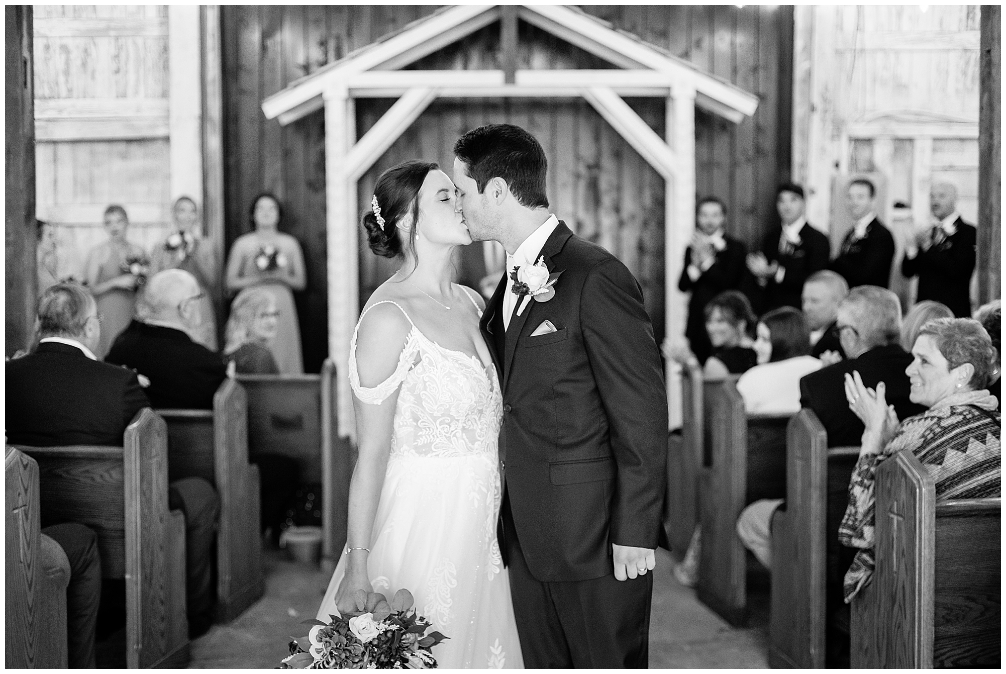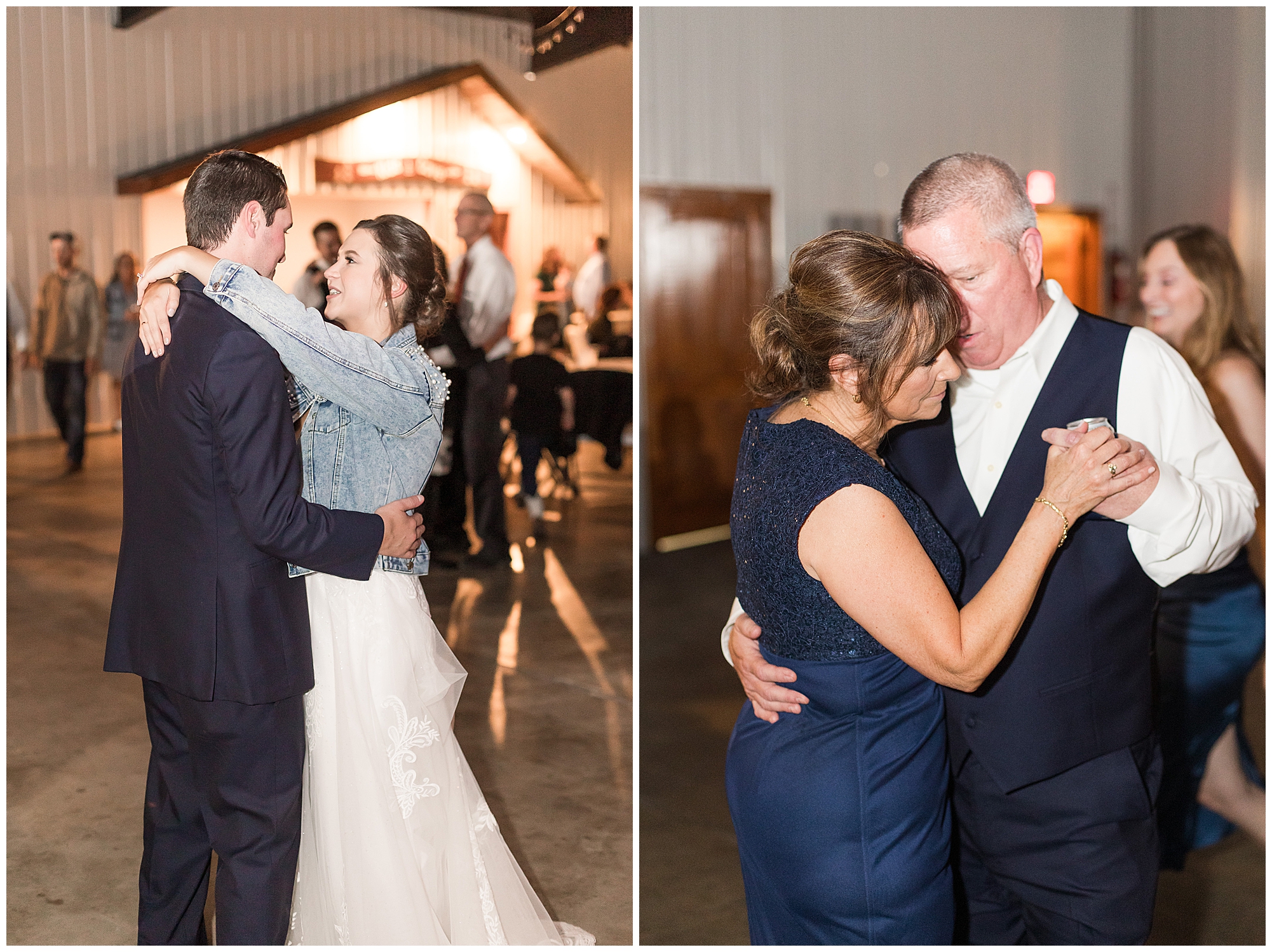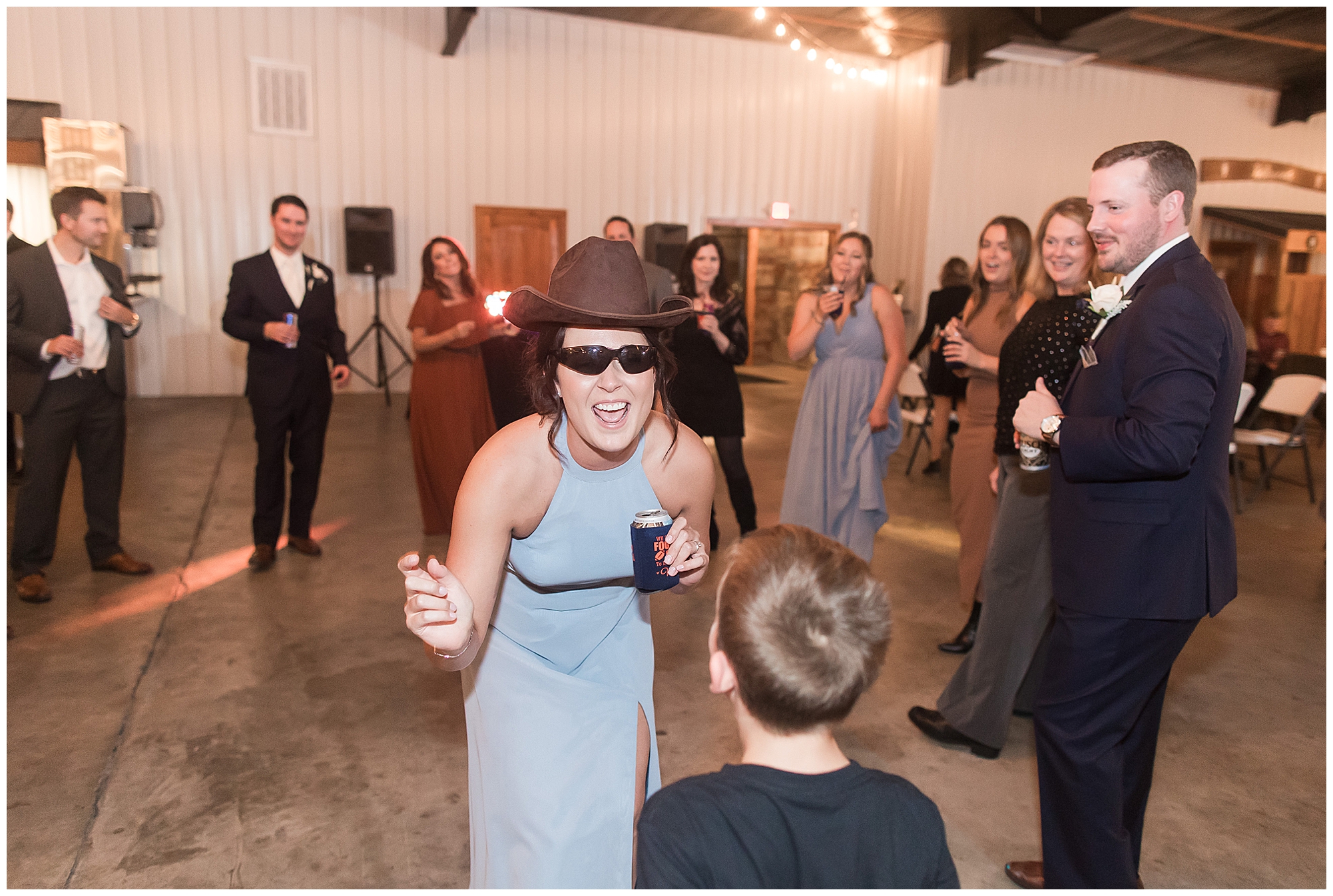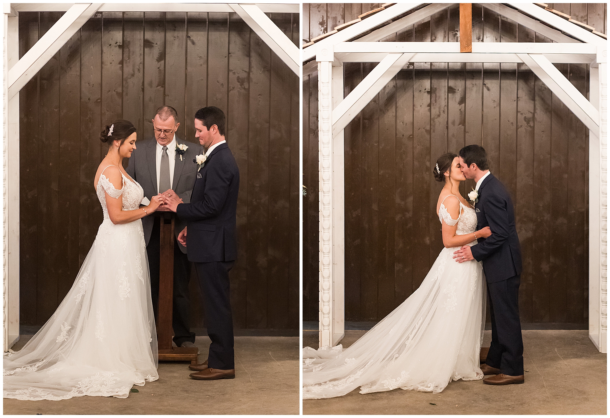 The nuptials were held in the barn on the property where the rustic charm continued. The beamed ceilings were draped with lights and a huge chandelier and church pews were set for guests to sit. The barn was filled with loved ones there to support Morgan and Michael as they began this new chapter in their lives. Cooper, the pup, lead the way for his mom to make her way down the aisle to Michael with her dad. And with a maiden name of “LOVE” as Morgan’s was, you know you are in for a sentimental ceremony! It was reveled by their officiant, who is a long time family friend of the Love’s, that they discovered that between both of their parents and grandparents, there is a combined number of 269 years of marriage! WOW! What an example for these newlyweds! Morgan and Michael exchanged rings and vows then sealed it all with a kiss! Congrats to the new Mr. & Mrs. Fiaush!