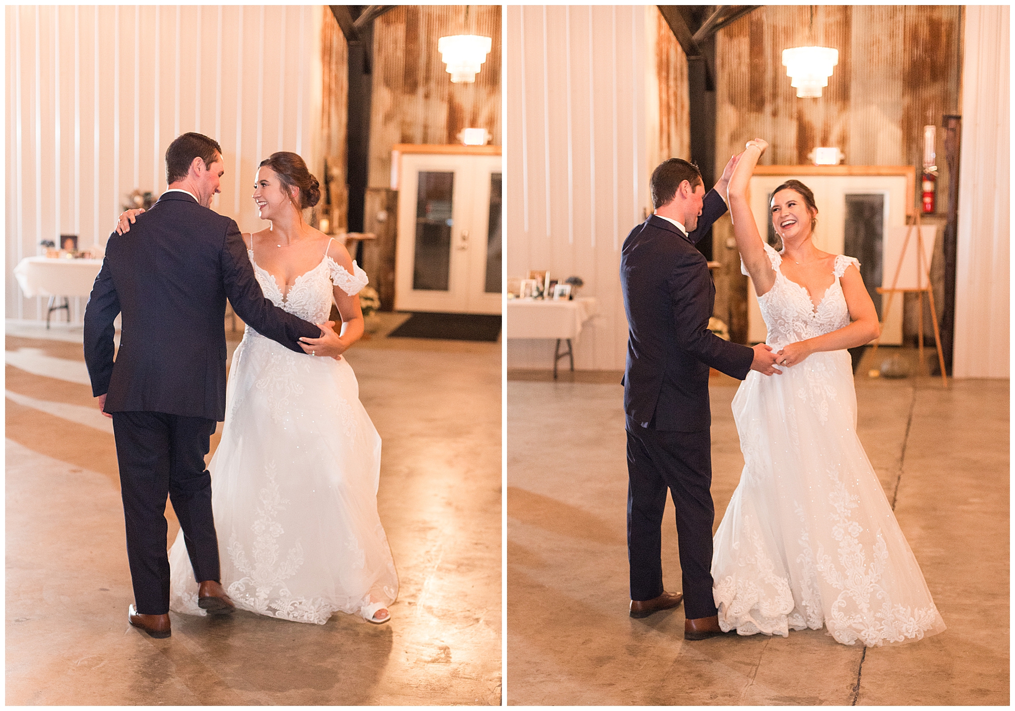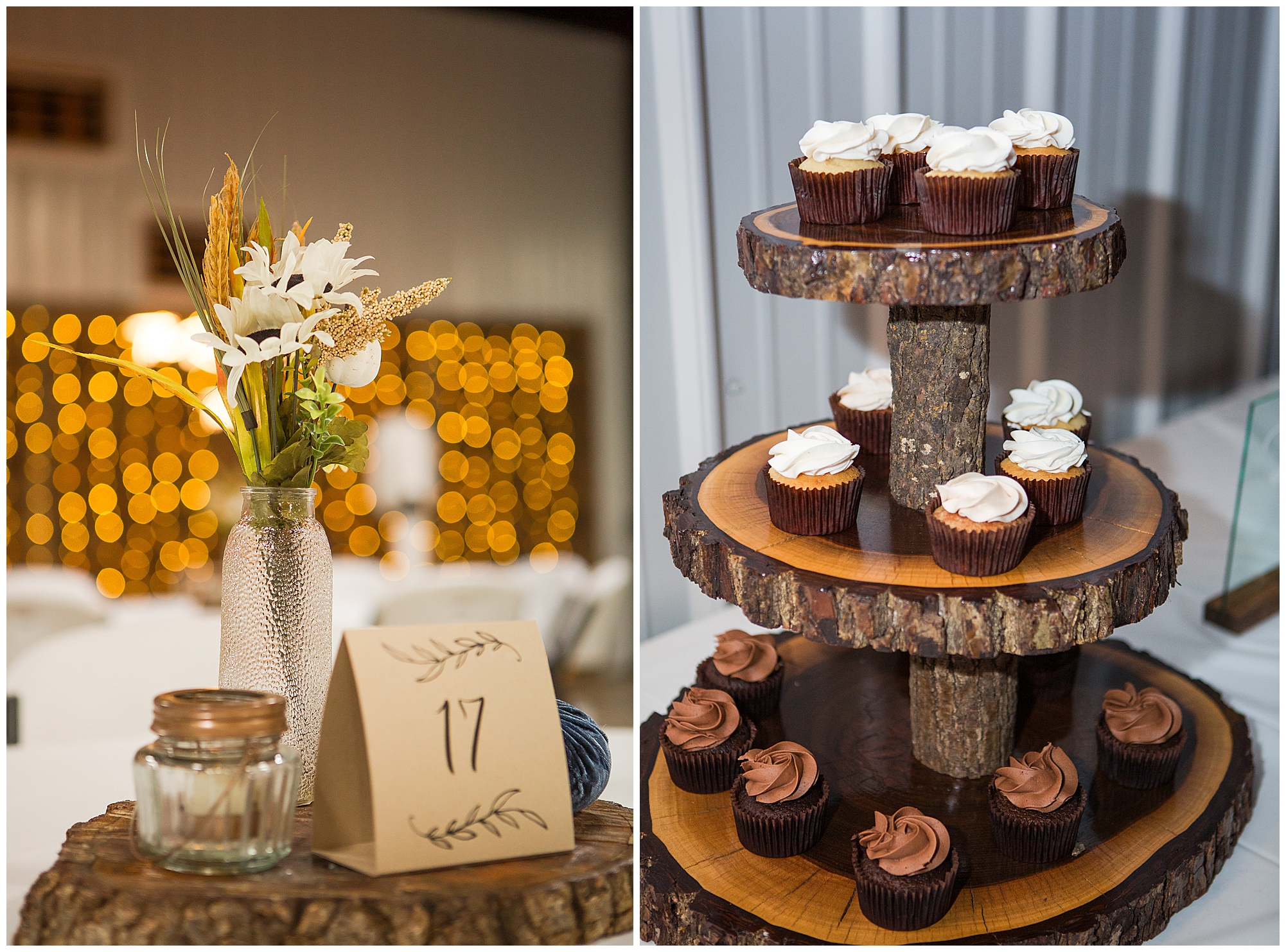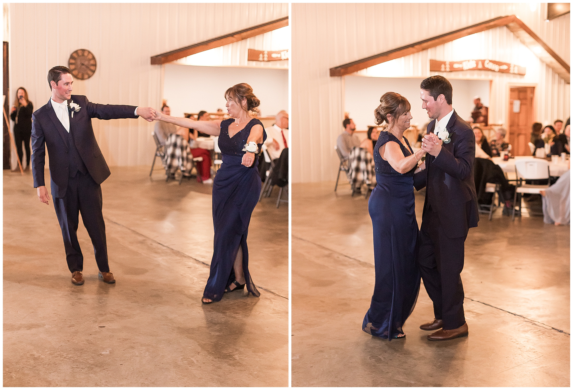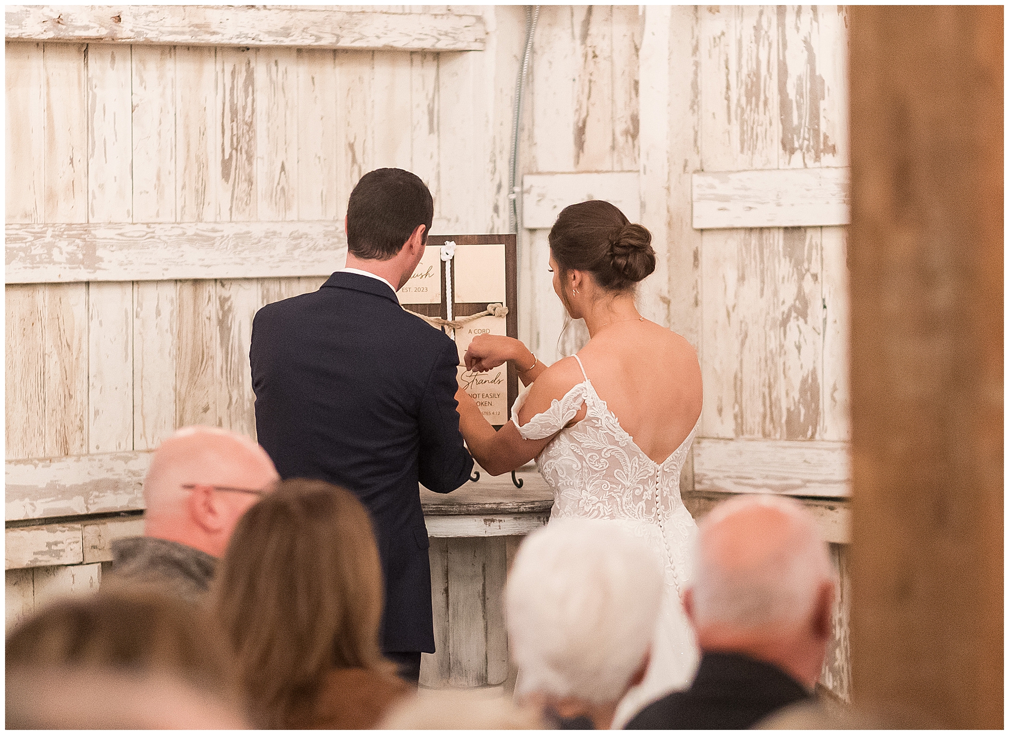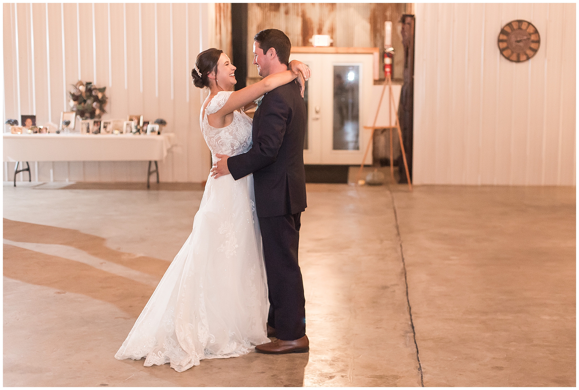The nuptials were held in the barn on the property where the rustic charm continued. The beamed ceilings were draped with lights and a huge chandelier and church pews were set for guests to sit. The barn was filled with loved ones there to support Morgan and Michael as they began this new chapter in their lives. Cooper, the pup, lead the way for his mom to make her way down the aisle to Michael with her dad. And with a maiden name of “LOVE” as Morgan’s was, you know you are in for a sentimental ceremony! It was reveled by their officiant, who is a long time family friend of the Love’s, that they discovered that between both of their parents and grandparents, there is a combined number of 269 years of marriage! WOW! What an example for these newlyweds! Morgan and Michael exchanged rings and vows then sealed it all with a kiss! Congrats to the new Mr. & Mrs. Fiaush!