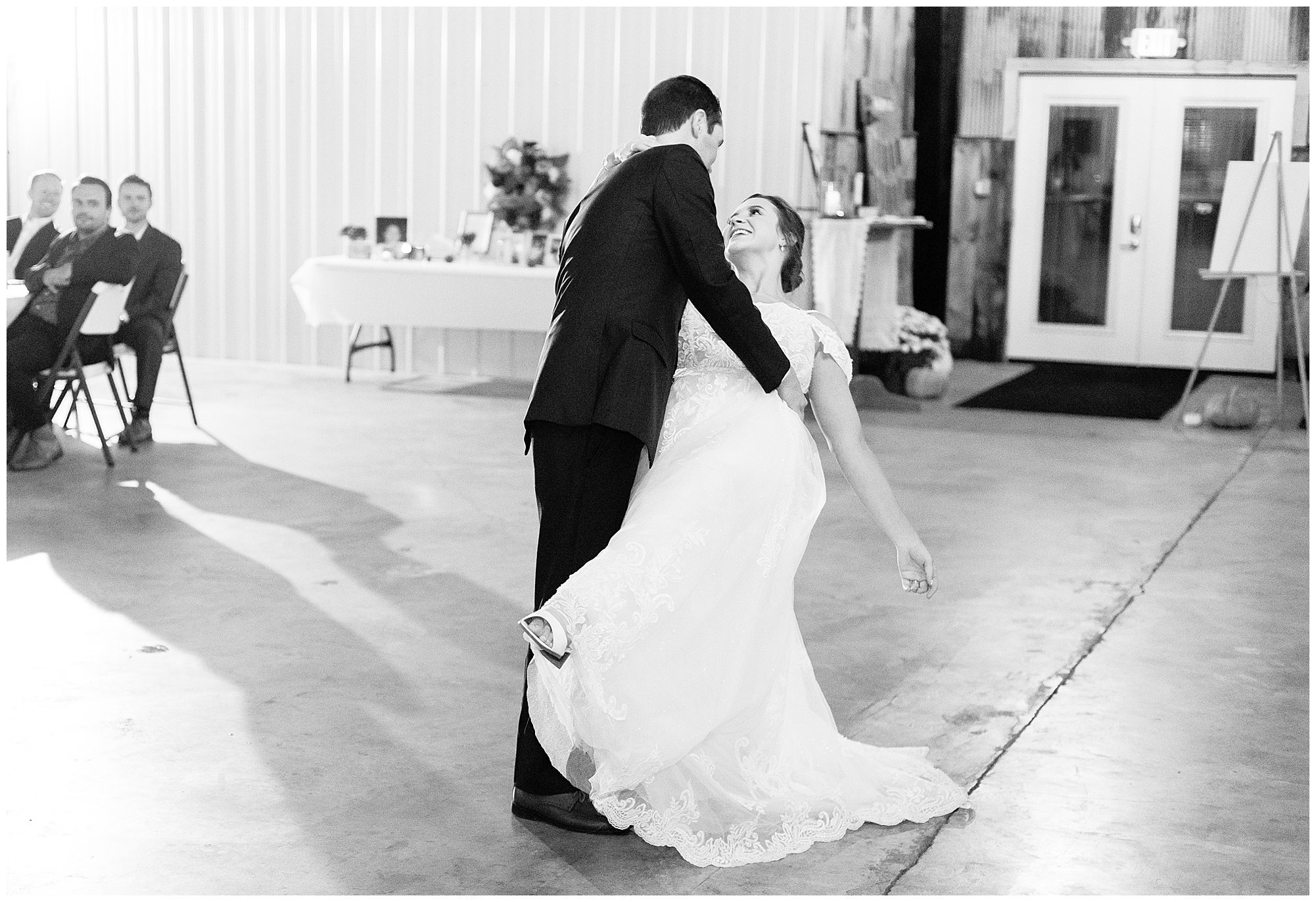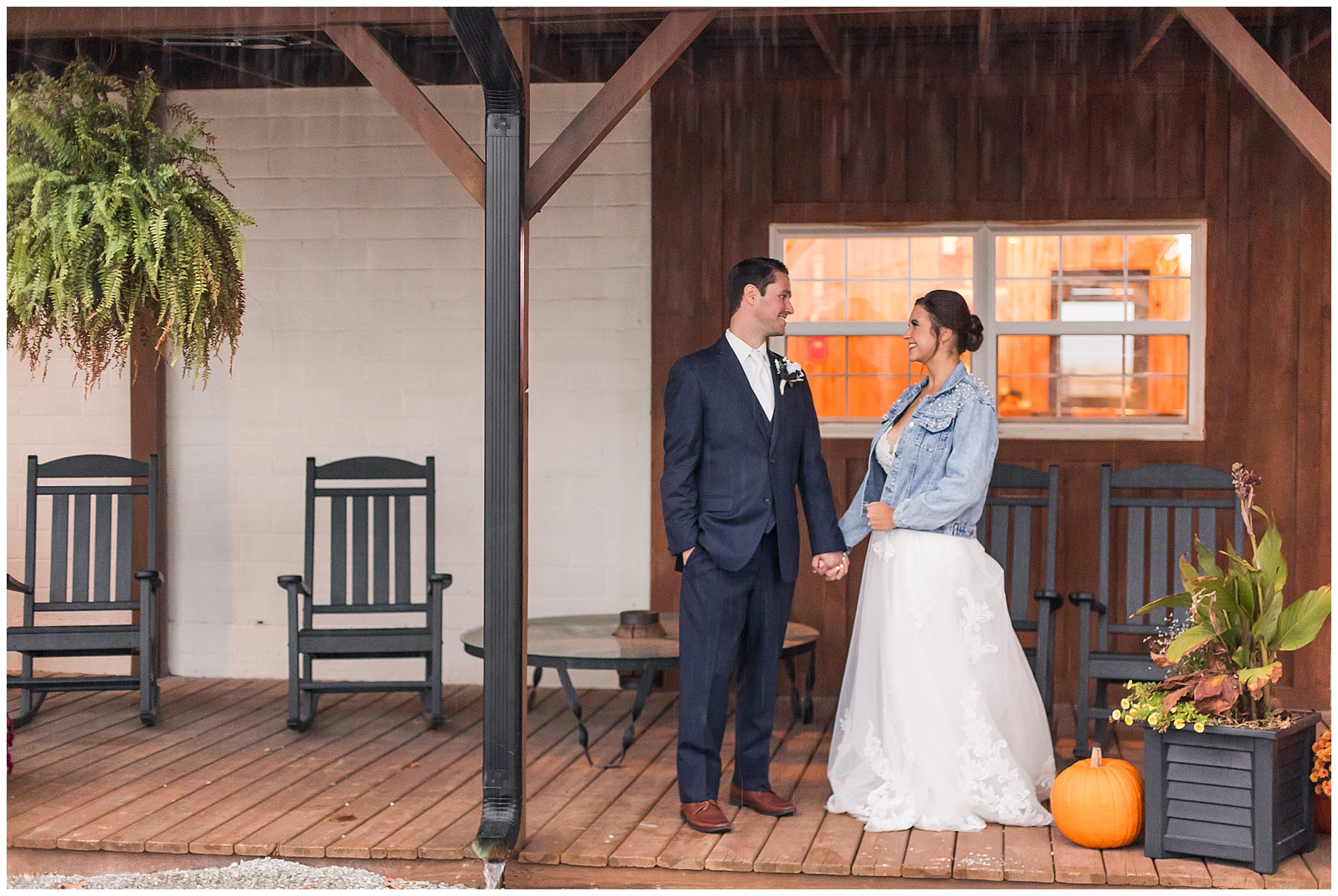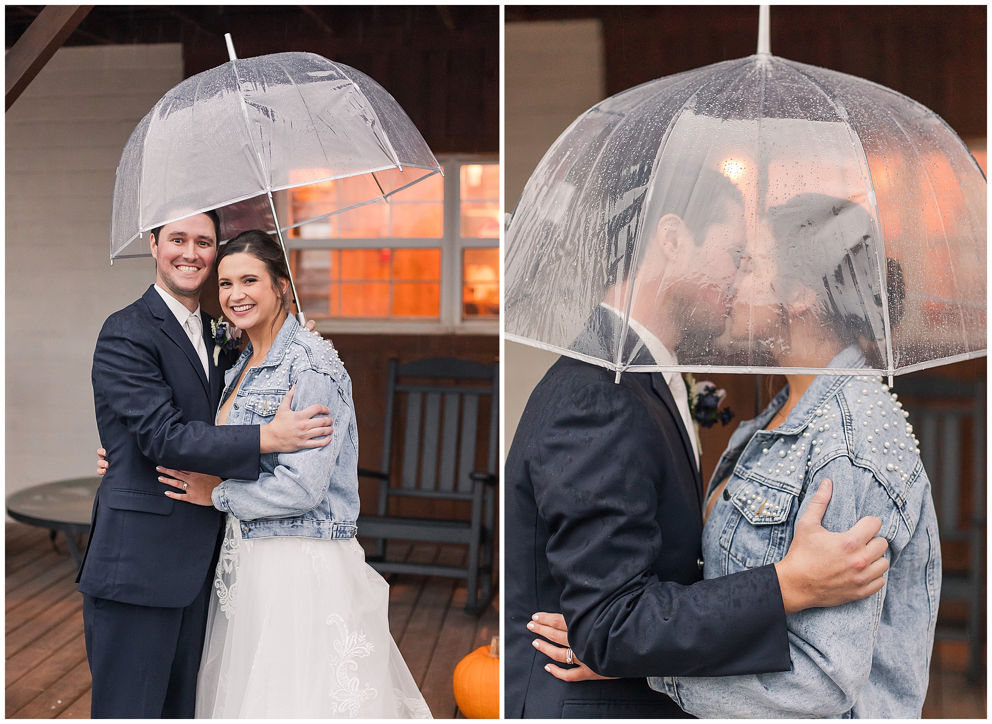 Before the party really kicked off, the bridal party headed over to the Seed House to celebrate the new married couple and for a few fun bar photos! Everyone was in high spirits, especially since it was warm inside! Then it was time to get the party started over at the reception hall with all of their guests! The reception space was decorated with lovely touches of florals in vintage vases, wooden accents, white pumpkins, and mums. The celebration of The Fiaushs brought many sweet moments in emotional toasts and memorable dances. Morgan and Michael WOW’ed their guests with a incredible choreographed dance as they spun and dipped around the floor. Morgan surprised her dad before their father/daughter dance with a video of the two of them dancing during a dance recital when she was little! Ummm…How adorable!?! Then Michael and his mom, Amy, took a spin around the dance floor with energetic dance moves getting the crowd ready to enjoy the night! But, before my time with this couple was over and even though it had sadly begun to rain so sunset photos weren’t going to happen, the newlyweds wanted to sneak out one more time to document this last part of the evening! Morgan said, “Well, this is what happened on our wedding day, right?” Plus, rain on your wedding day is good luck! So they went for it! We used the fantastic porch of the Seed House to keep these two out of the rain, but then threw in a few with an umbrella to really drive home the environment! Morgan and Michael have been a phenomenal couple to work with and I’m wishing them all the blessings in the world for their marriage! Cheers to The Fiaushs!
