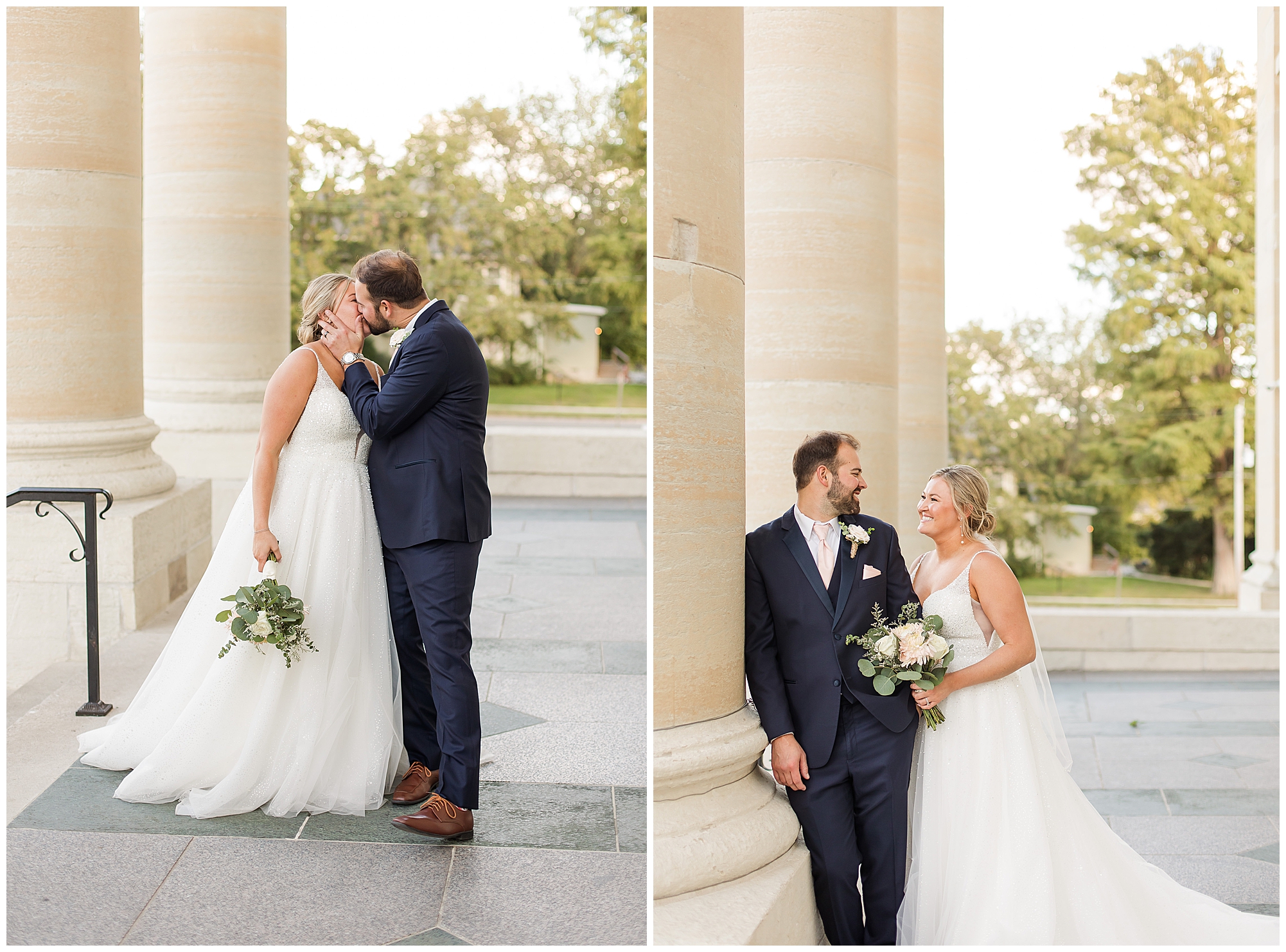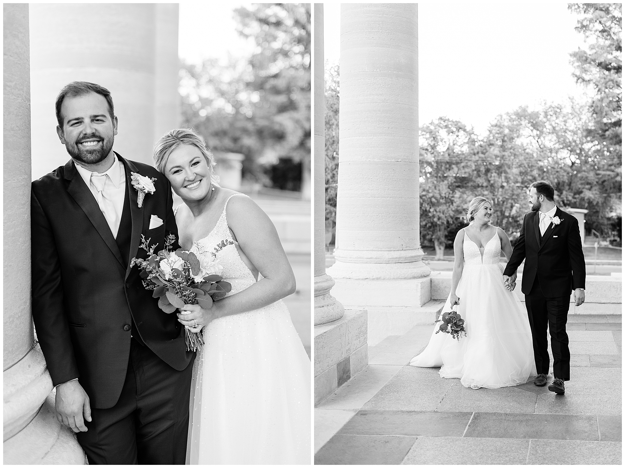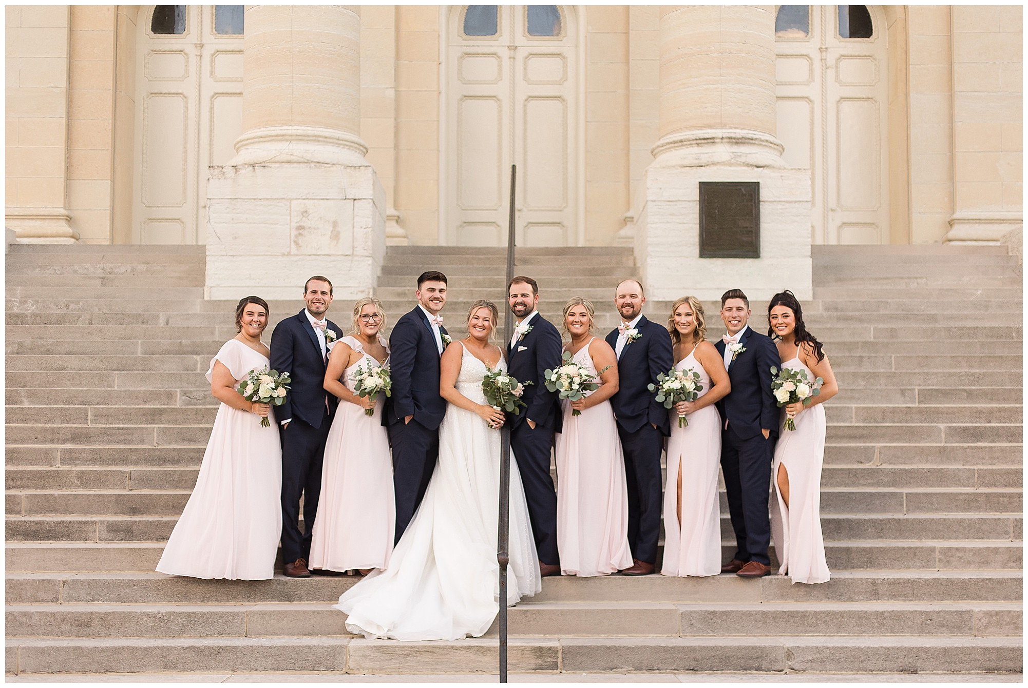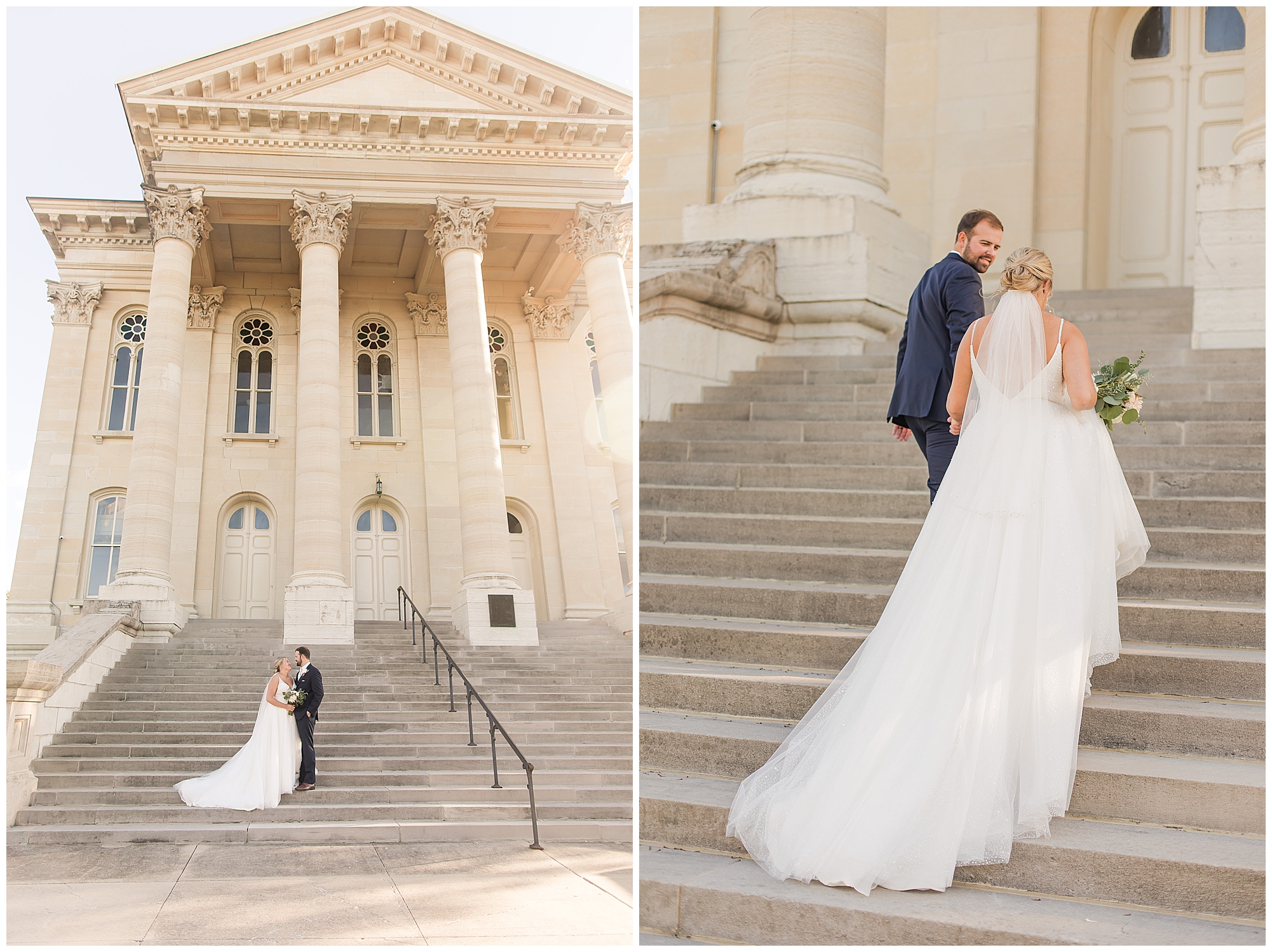 Next it was time for these two to say, “I Do!” For this part of the day, Tori and Cooper decided to head off property into nearby Carlinville to hold their nuptials. Their ceremony encompassed scripture, emotional vows, and the start of the rest of their lives together. After they sealed it all with a kiss, they were pronounced husband and wife! Following the ceremony, we took the newlyweds to the gorgeous Carlinville courthouse for a few more photos. I love how these turned out especially getting to see the new Mr. & Mrs. Etter showing off their style up against the columns, stairs, and impactful architecture! What a statement! Then it was time to head back to The Rustic Venues to get the party started!