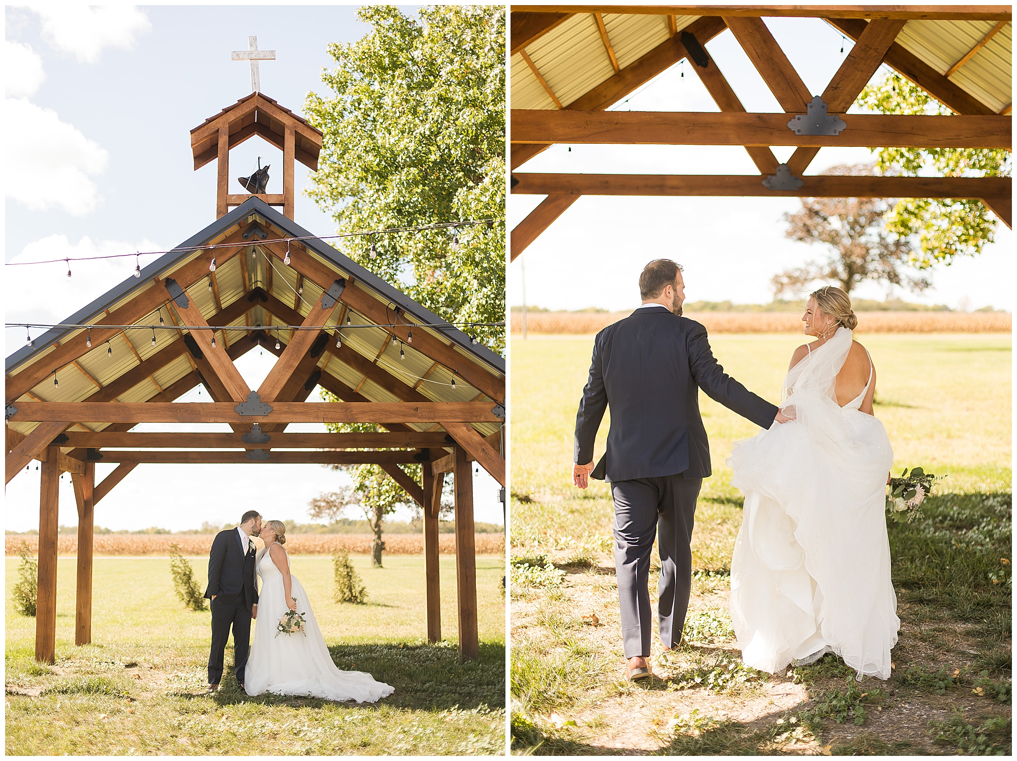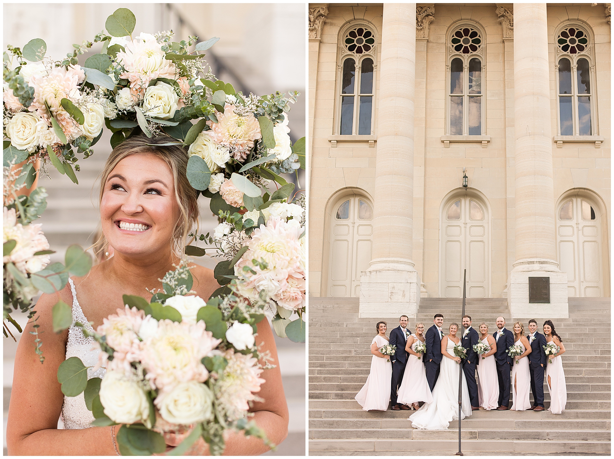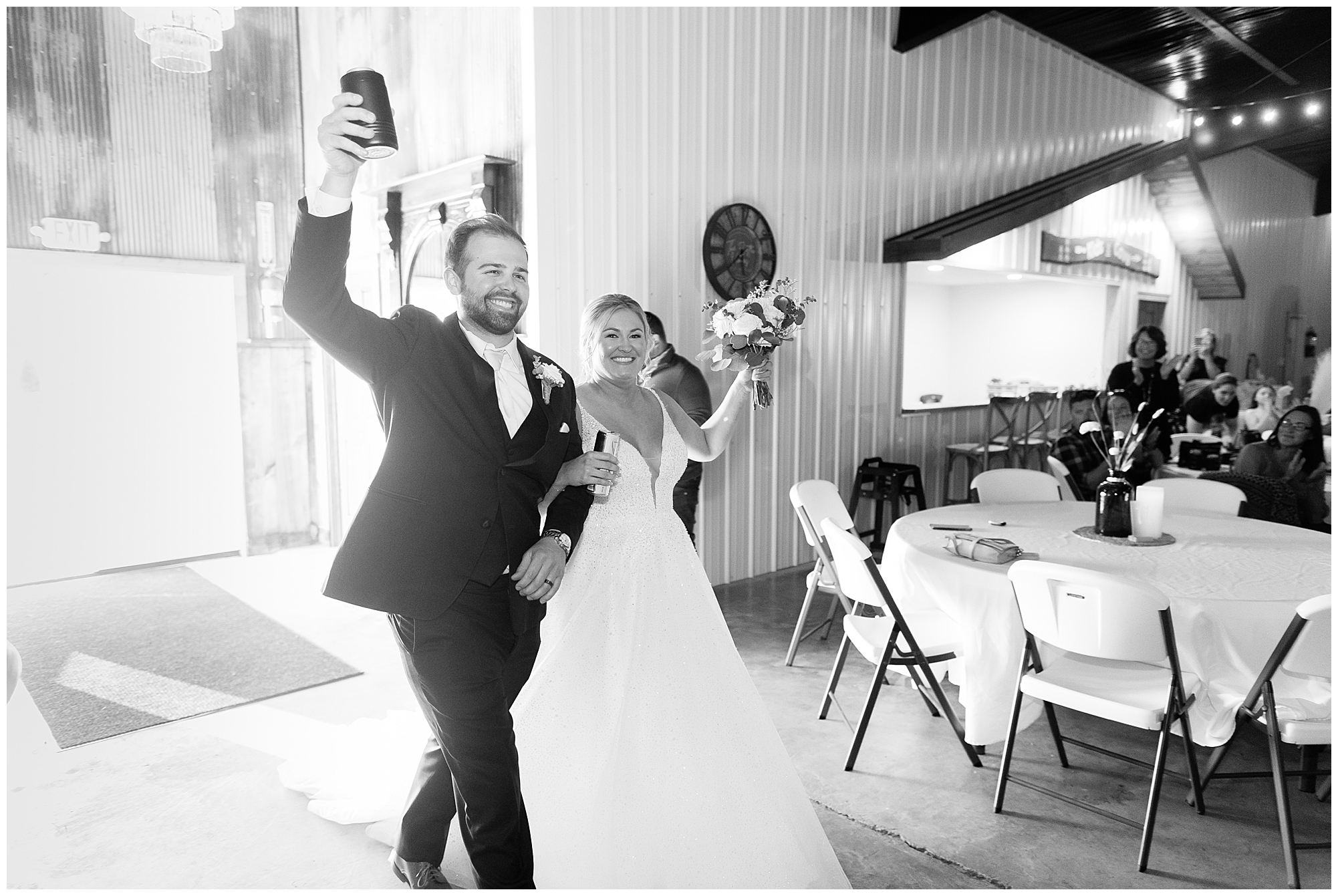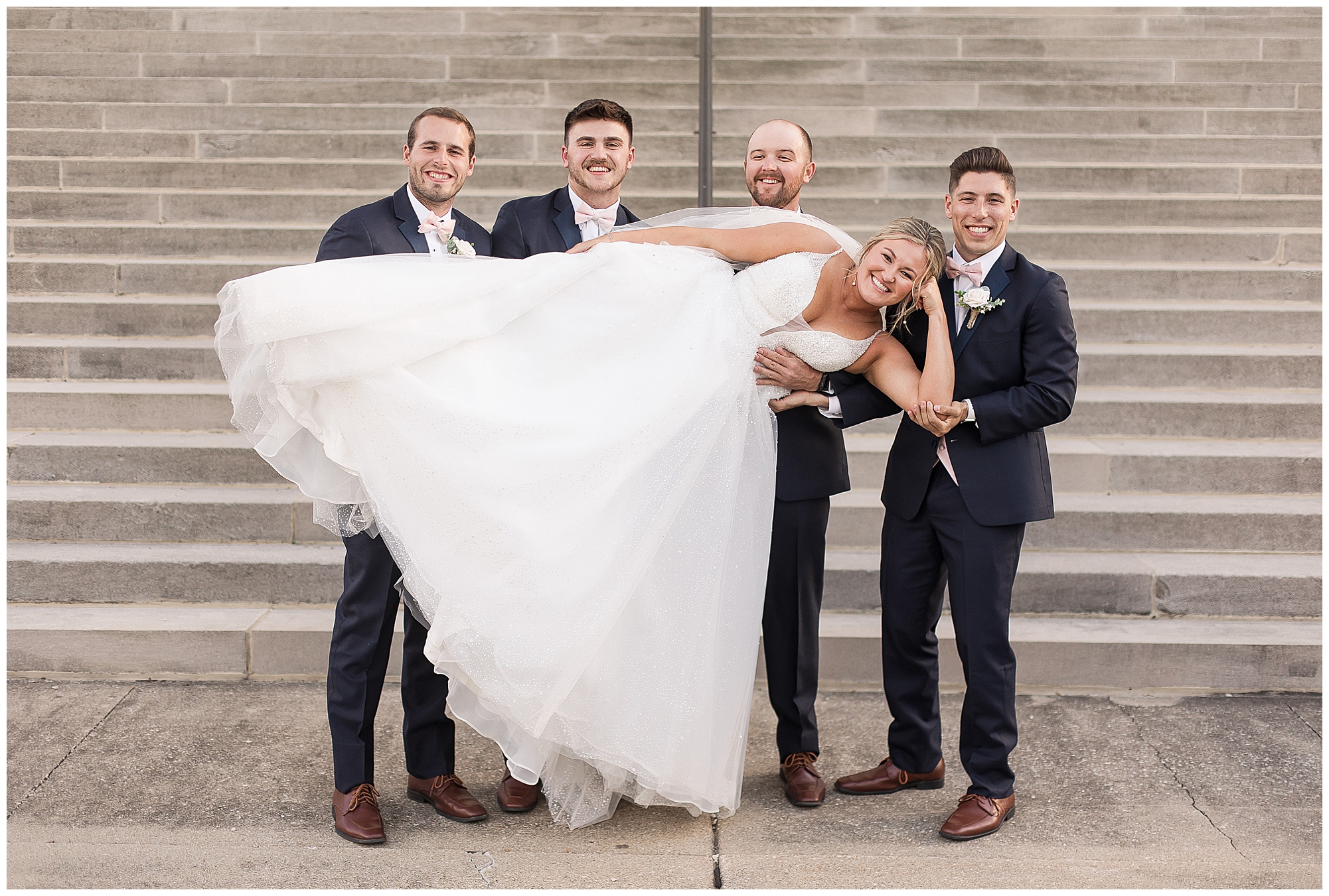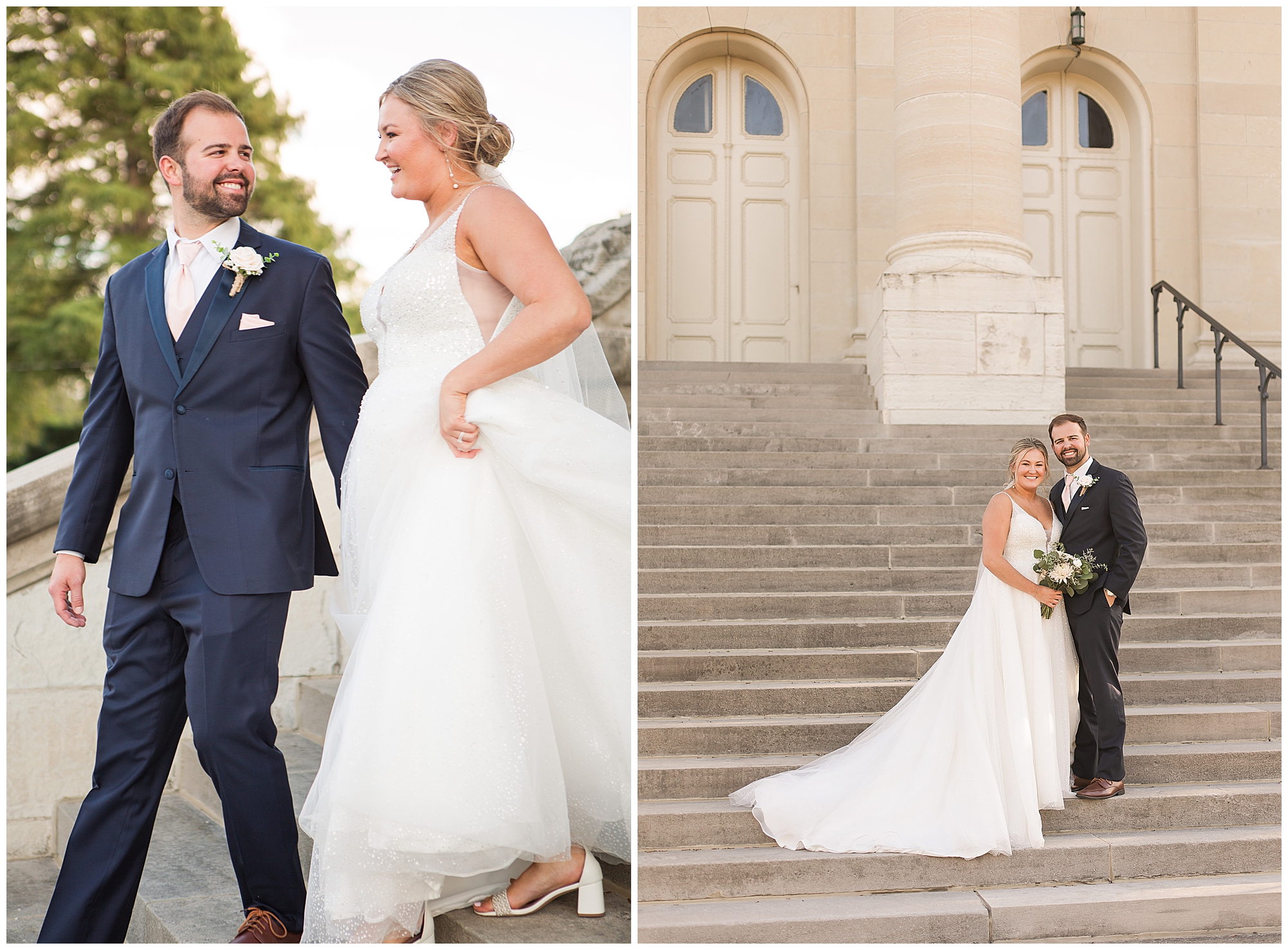 Next it was time for these two to say, “I Do!” For this part of the day, Tori and Cooper decided to head off property into nearby Carlinville to hold their nuptials. Their ceremony encompassed scripture, emotional vows, and the start of the rest of their lives together. After they sealed it all with a kiss, they were pronounced husband and wife! Following the ceremony, we took the newlyweds to the gorgeous Carlinville courthouse for a few more photos. I love how these turned out especially getting to see the new Mr. & Mrs. Etter showing off their style up against the columns, stairs, and impactful architecture! What a statement! Then it was time to head back to The Rustic Venues to get the party started!