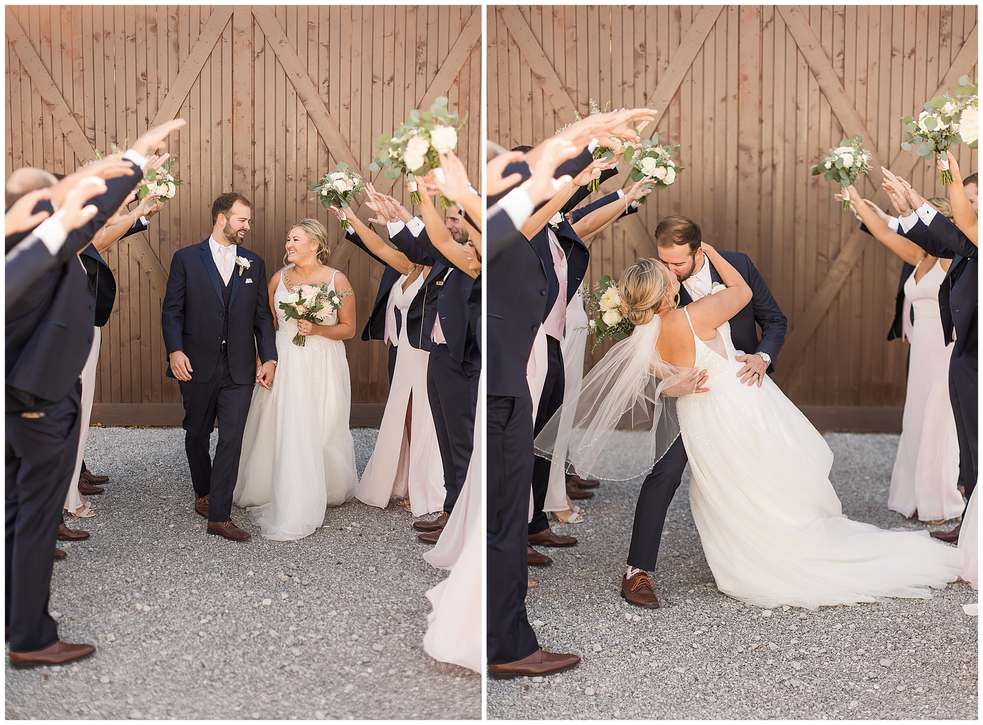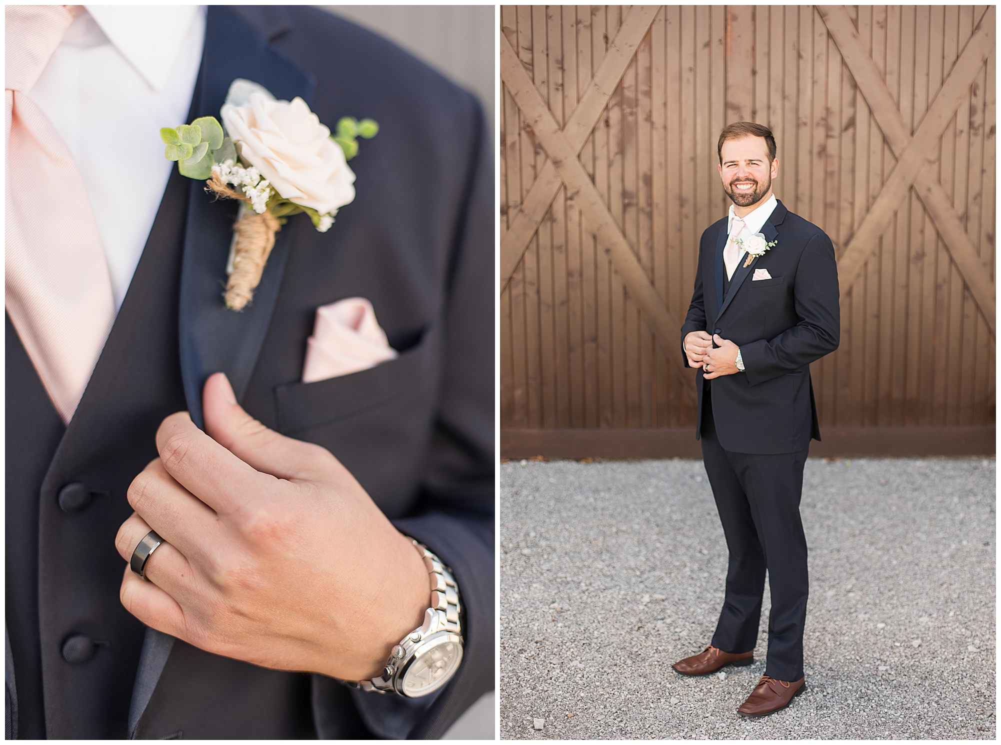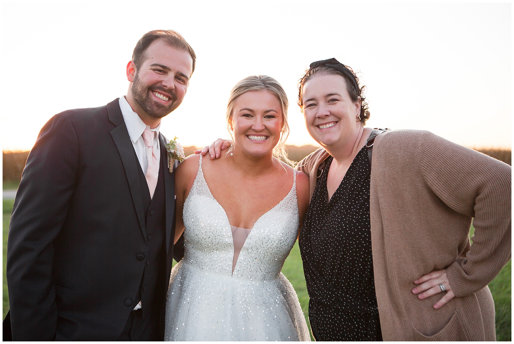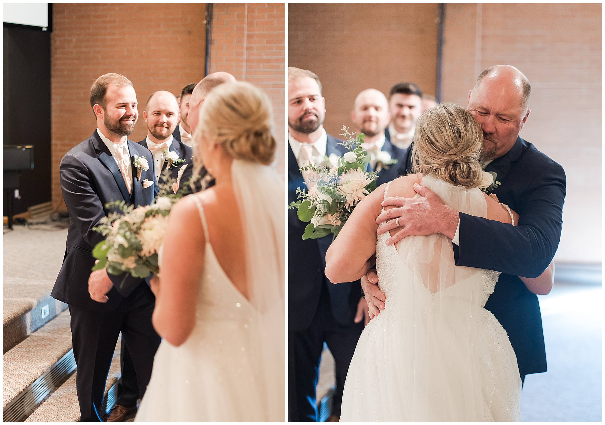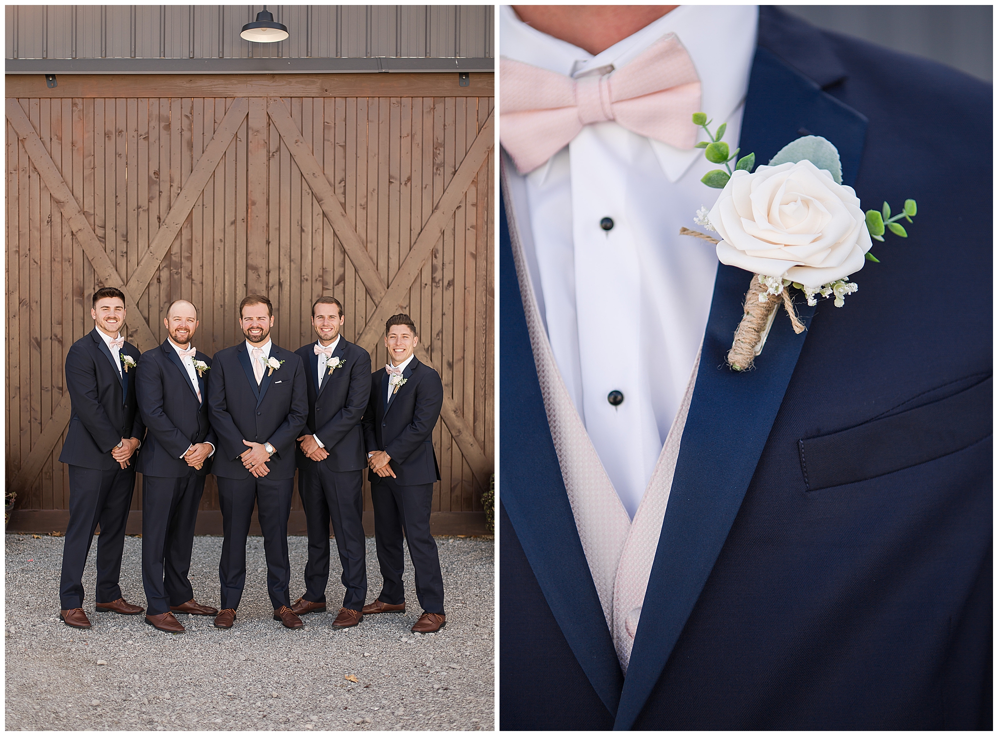 Tori and Cooper’s incredible fall wedding was simply put…Perfect! They chose to have the majority of their event at The Rustic Venues in Girard, Illinois, which is an amazing location spread out in the country surrounded by cornfields. This was my first time visiting this spot and it was a gorgeous place for this pair to celebrate their nuptials. Tori was the absolute epitome of chill bride! When I arrived, she was lounged back in the salon chair getting her hair done with a huge smile on her face! Her bridesmaids were helping prepare for the day in anyway they could and the atmosphere was full of positive energy. When it came time to get Tori dressed she was a stunner to say the least! She was sparkling in her chic gown that glided as she walked about. She was radiant for sure! Her besties were all dressed in blush pink dresses with various styles that fit each girl’s personality! I love this trend! Cooper and his gentlemen cleaned up nicely as well with navy suits and pops of pink with their accessories. Before Cooper got his first glance of his bride-to-be, he had to wait for Tori’s dad to have his chance. Within seconds of Tori and her dad seeing one another the tears started flowing. Such a sweet moment! Then when it was Cooper’s turn, he couldn’t hold back his emotions either. He said, “He didn’t think he would get emotional!” However, seeing his beautiful bride really got the feels going throughout the day.