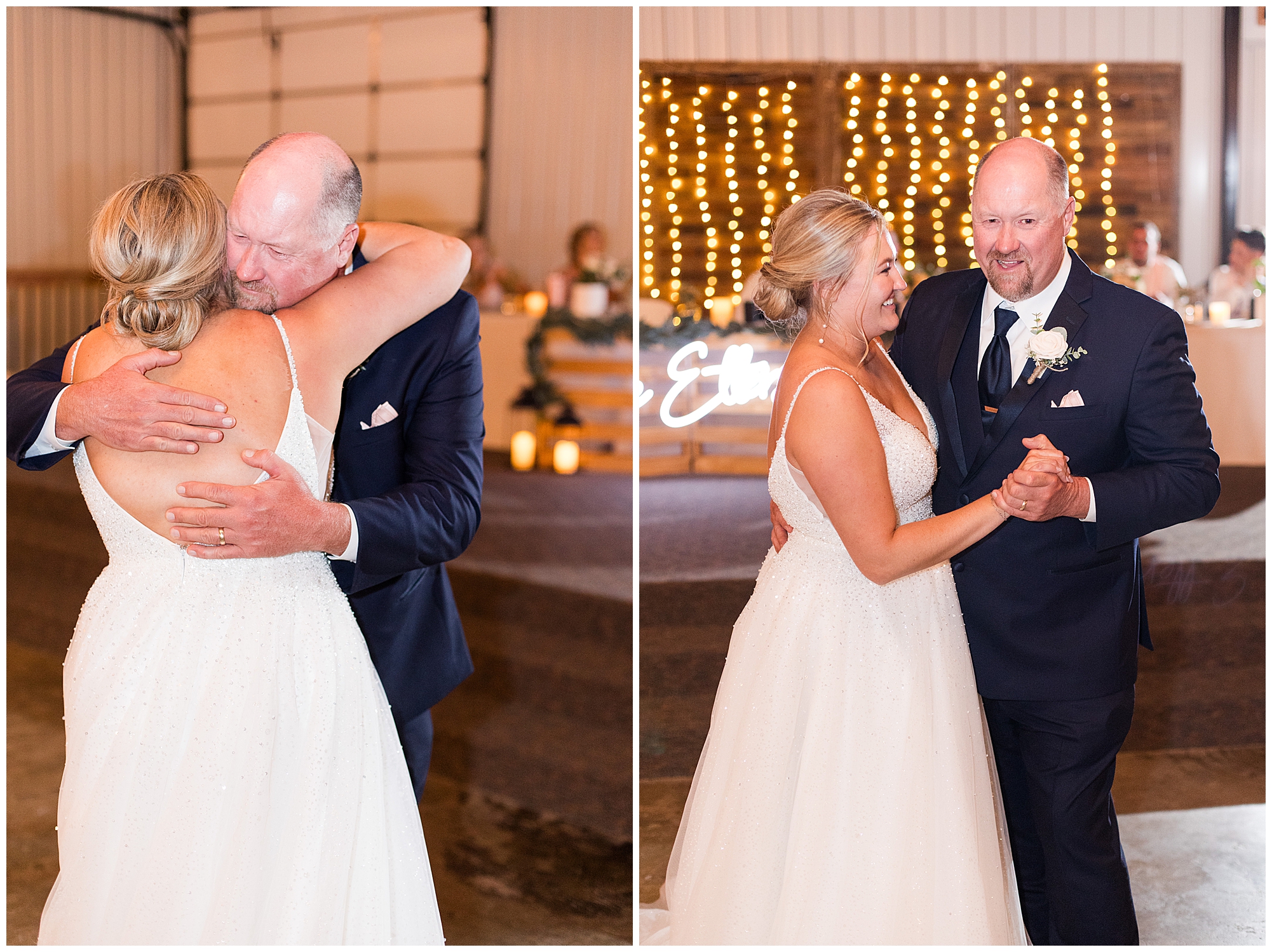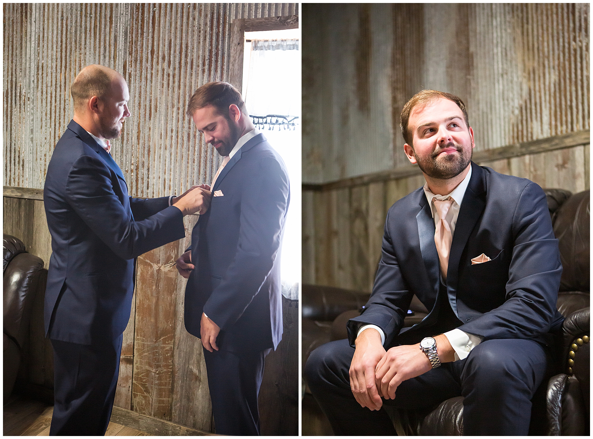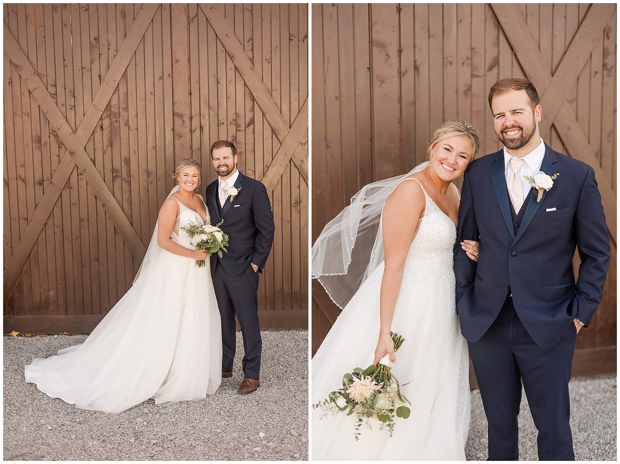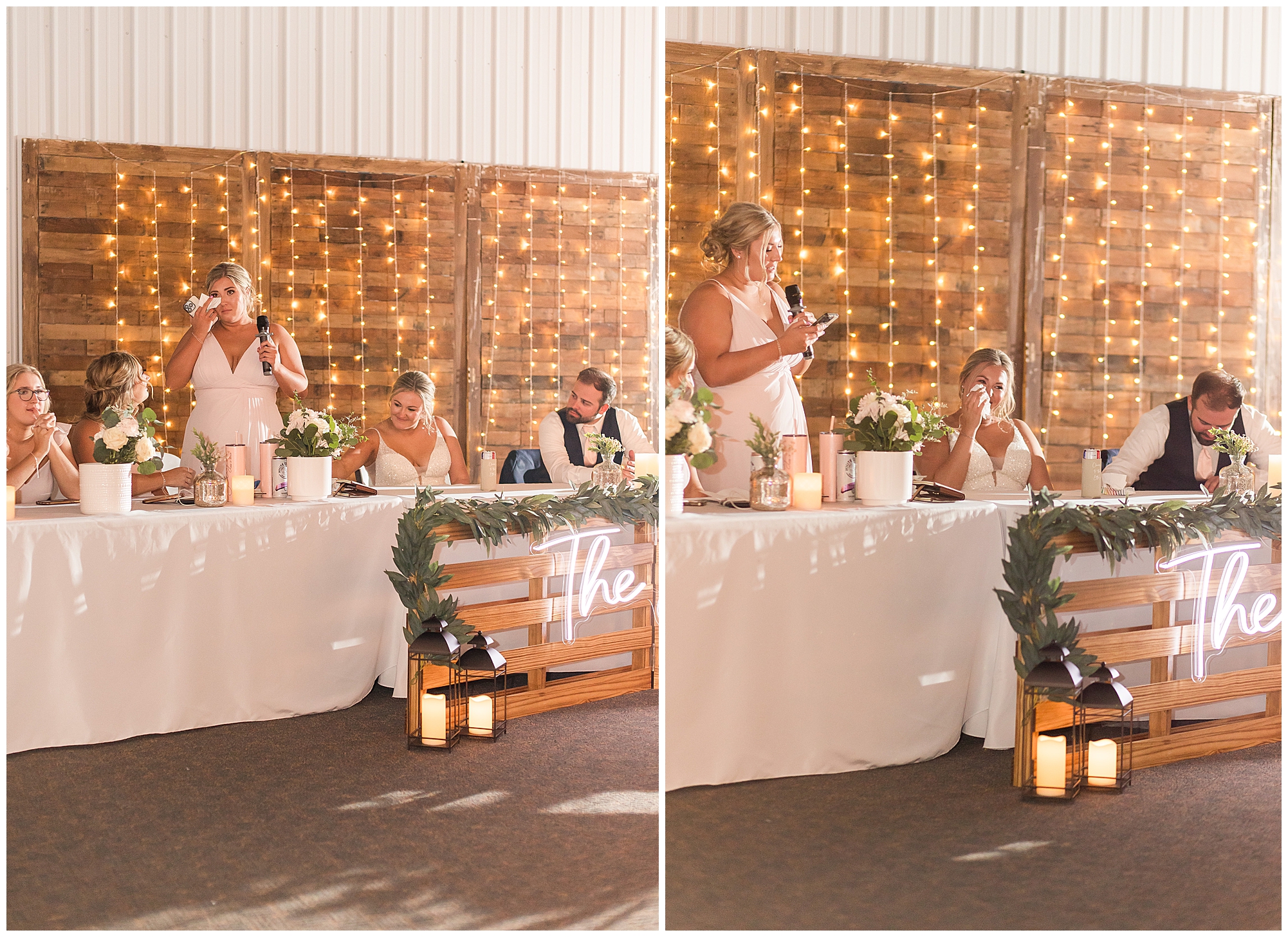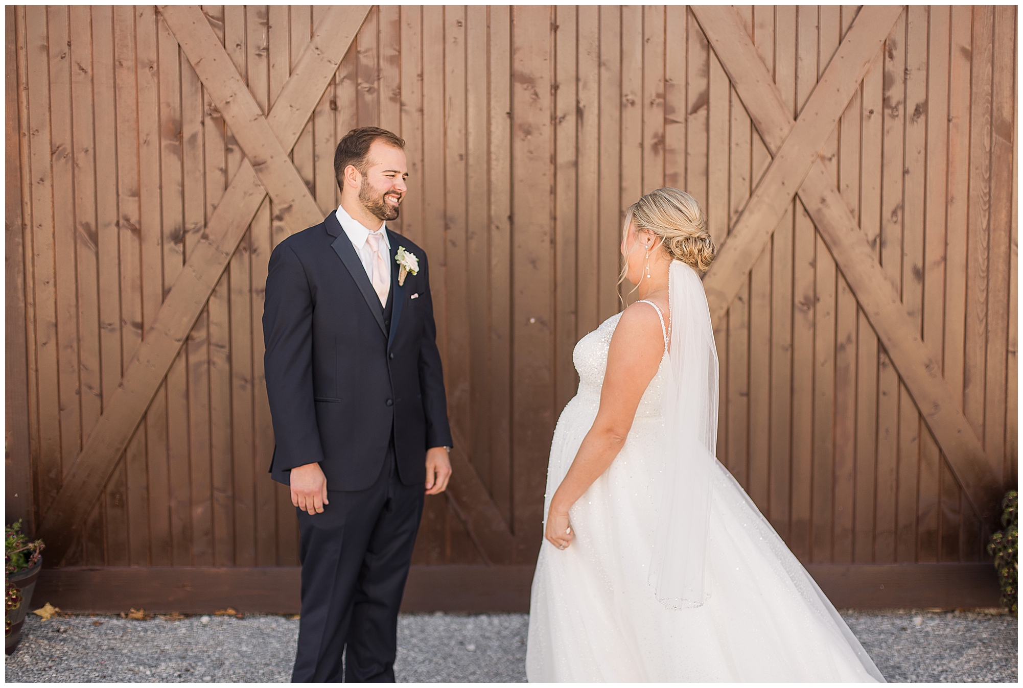 Tori and Cooper’s incredible fall wedding was simply put…Perfect! They chose to have the majority of their event at The Rustic Venues in Girard, Illinois, which is an amazing location spread out in the country surrounded by cornfields. This was my first time visiting this spot and it was a gorgeous place for this pair to celebrate their nuptials. Tori was the absolute epitome of chill bride! When I arrived, she was lounged back in the salon chair getting her hair done with a huge smile on her face! Her bridesmaids were helping prepare for the day in anyway they could and the atmosphere was full of positive energy. When it came time to get Tori dressed she was a stunner to say the least! She was sparkling in her chic gown that glided as she walked about. She was radiant for sure! Her besties were all dressed in blush pink dresses with various styles that fit each girl’s personality! I love this trend! Cooper and his gentlemen cleaned up nicely as well with navy suits and pops of pink with their accessories. Before Cooper got his first glance of his bride-to-be, he had to wait for Tori’s dad to have his chance. Within seconds of Tori and her dad seeing one another the tears started flowing. Such a sweet moment! Then when it was Cooper’s turn, he couldn’t hold back his emotions either. He said, “He didn’t think he would get emotional!” However, seeing his beautiful bride really got the feels going throughout the day.