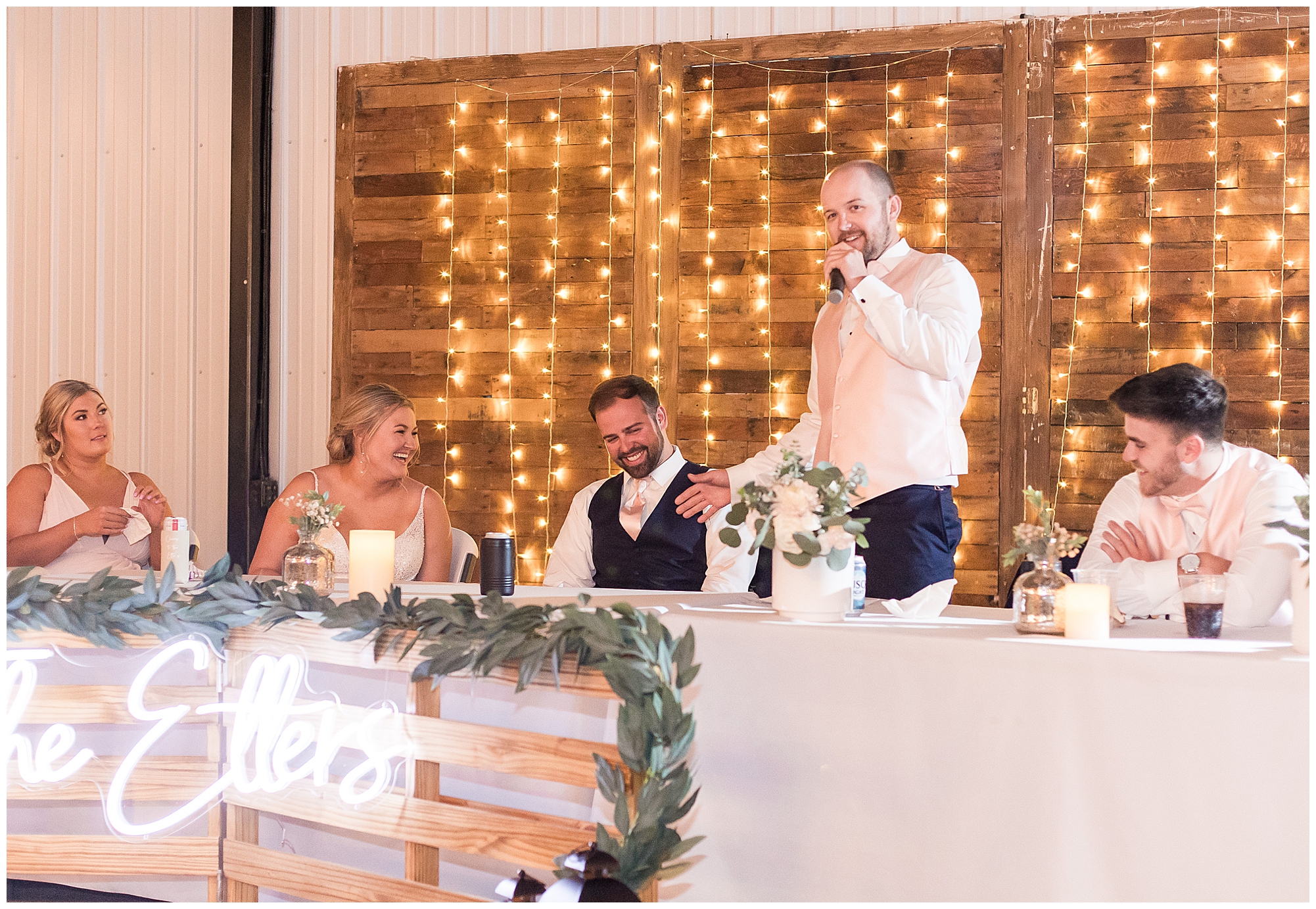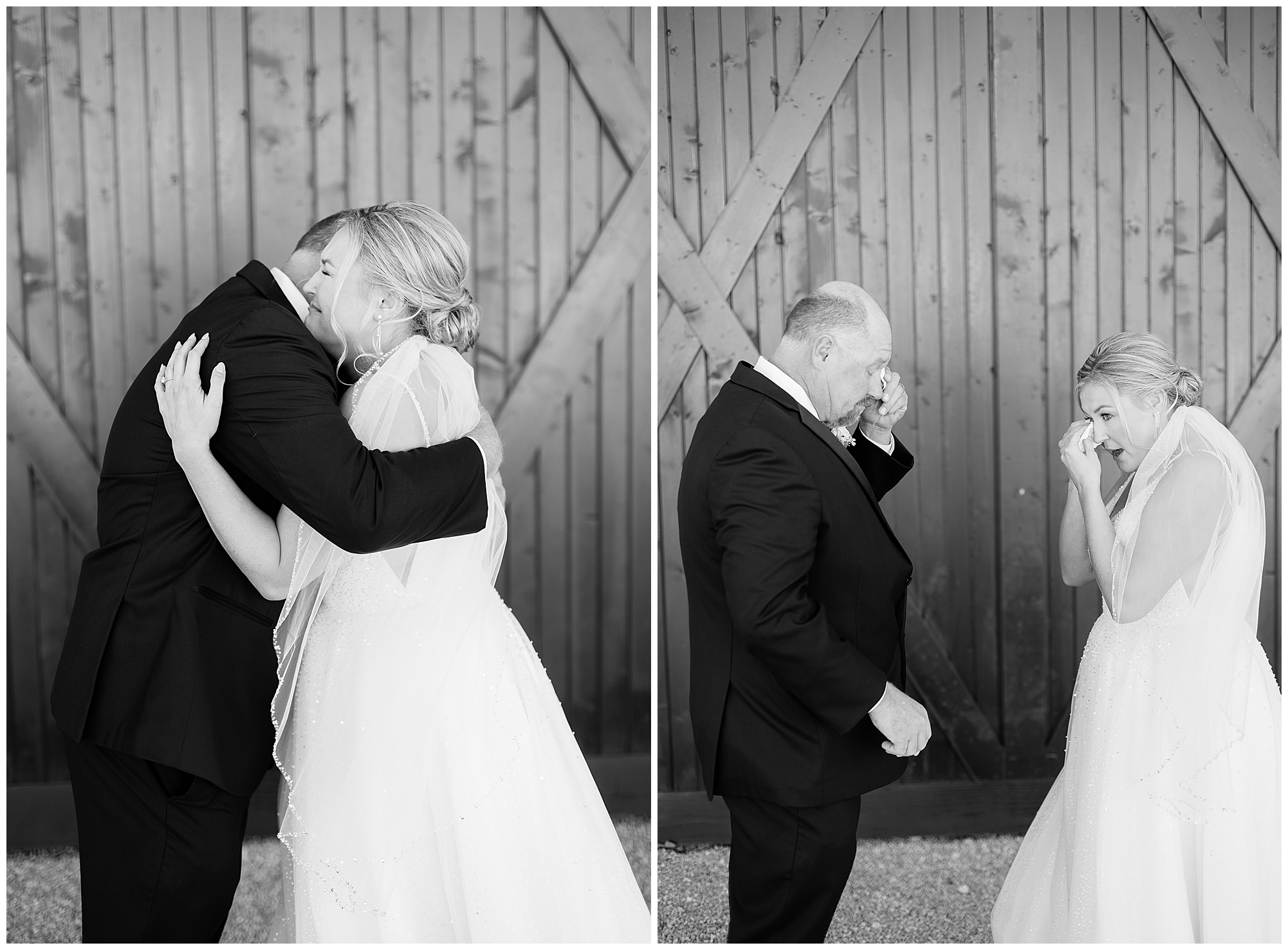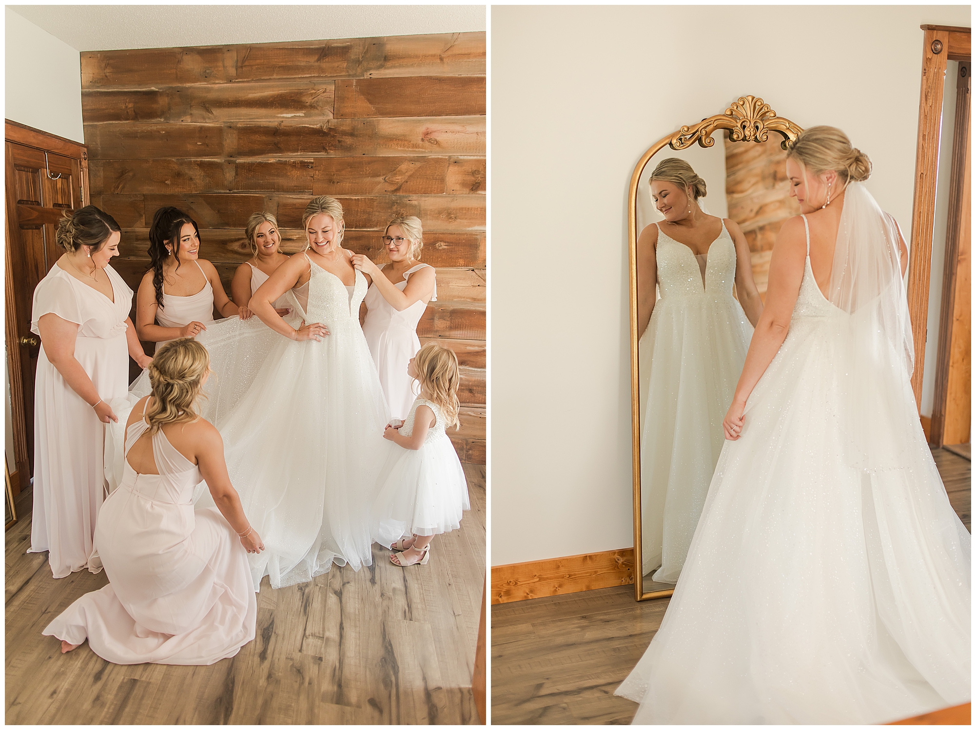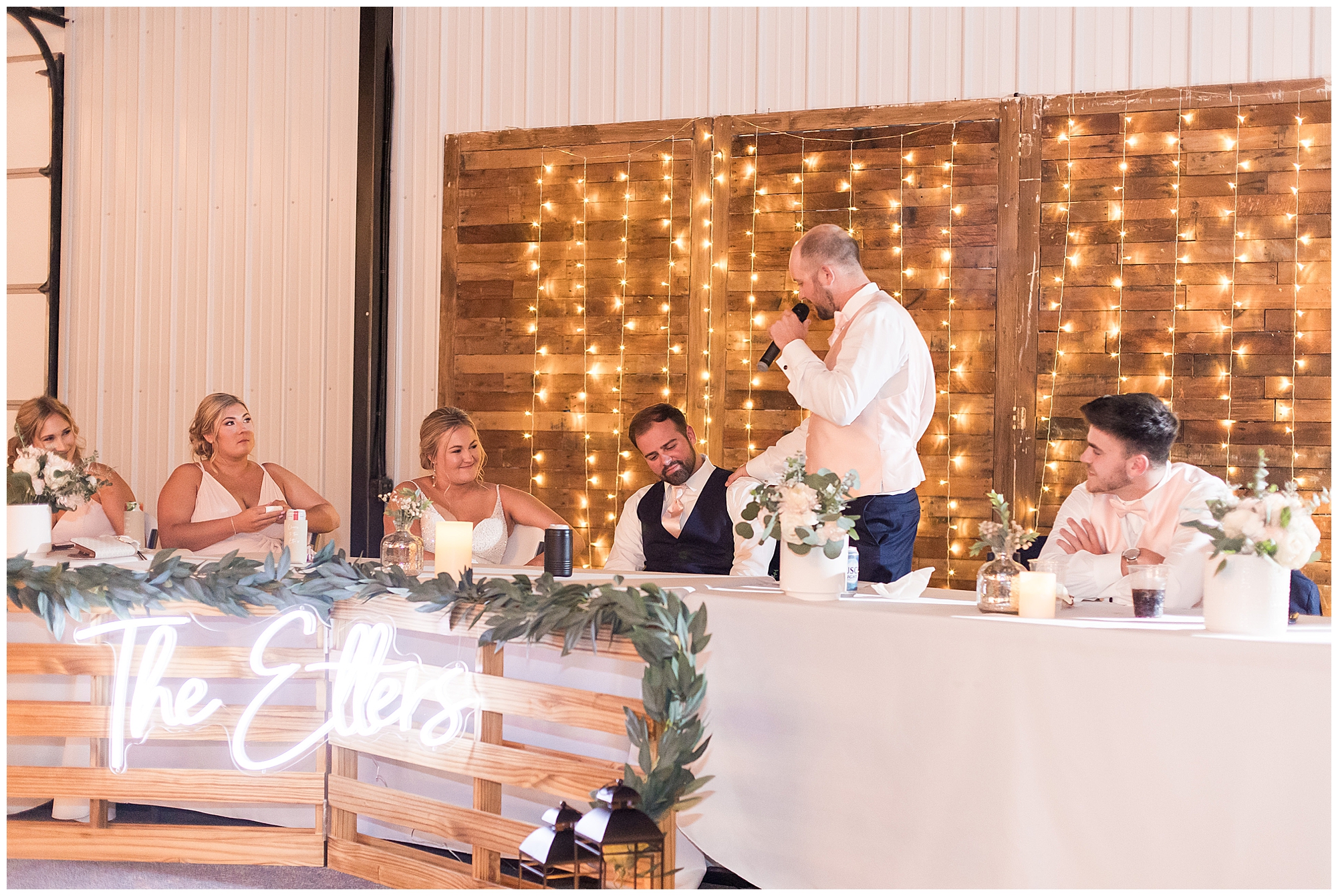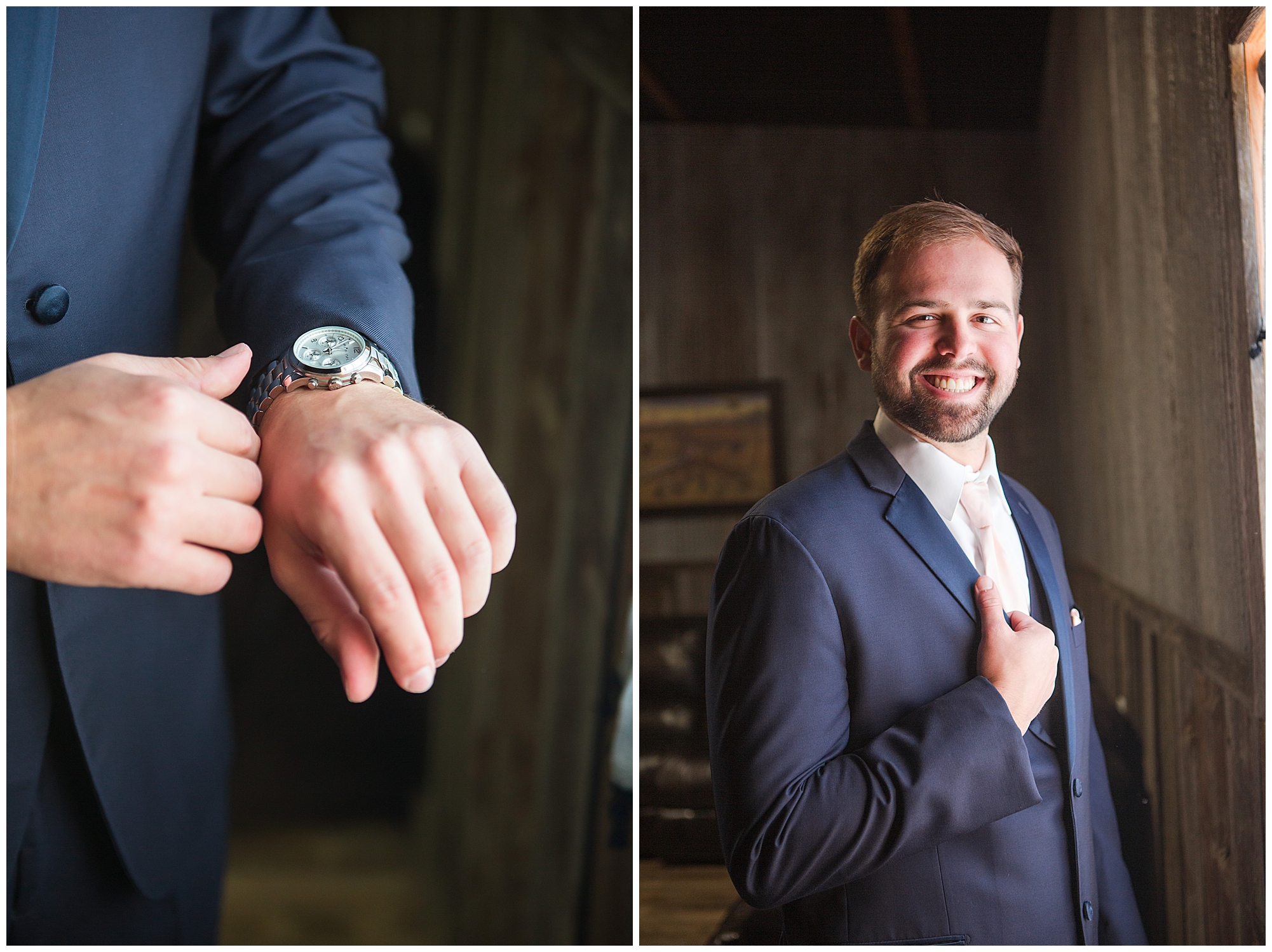 Tori and Cooper’s incredible fall wedding was simply put…Perfect! They chose to have the majority of their event at The Rustic Venues in Girard, Illinois, which is an amazing location spread out in the country surrounded by cornfields. This was my first time visiting this spot and it was a gorgeous place for this pair to celebrate their nuptials. Tori was the absolute epitome of chill bride! When I arrived, she was lounged back in the salon chair getting her hair done with a huge smile on her face! Her bridesmaids were helping prepare for the day in anyway they could and the atmosphere was full of positive energy. When it came time to get Tori dressed she was a stunner to say the least! She was sparkling in her chic gown that glided as she walked about. She was radiant for sure! Her besties were all dressed in blush pink dresses with various styles that fit each girl’s personality! I love this trend! Cooper and his gentlemen cleaned up nicely as well with navy suits and pops of pink with their accessories. Before Cooper got his first glance of his bride-to-be, he had to wait for Tori’s dad to have his chance. Within seconds of Tori and her dad seeing one another the tears started flowing. Such a sweet moment! Then when it was Cooper’s turn, he couldn’t hold back his emotions either. He said, “He didn’t think he would get emotional!” However, seeing his beautiful bride really got the feels going throughout the day.