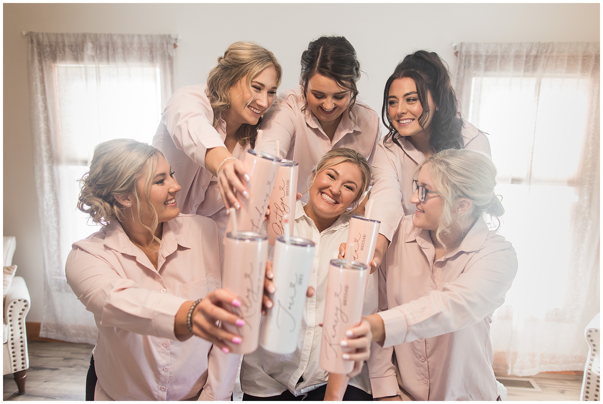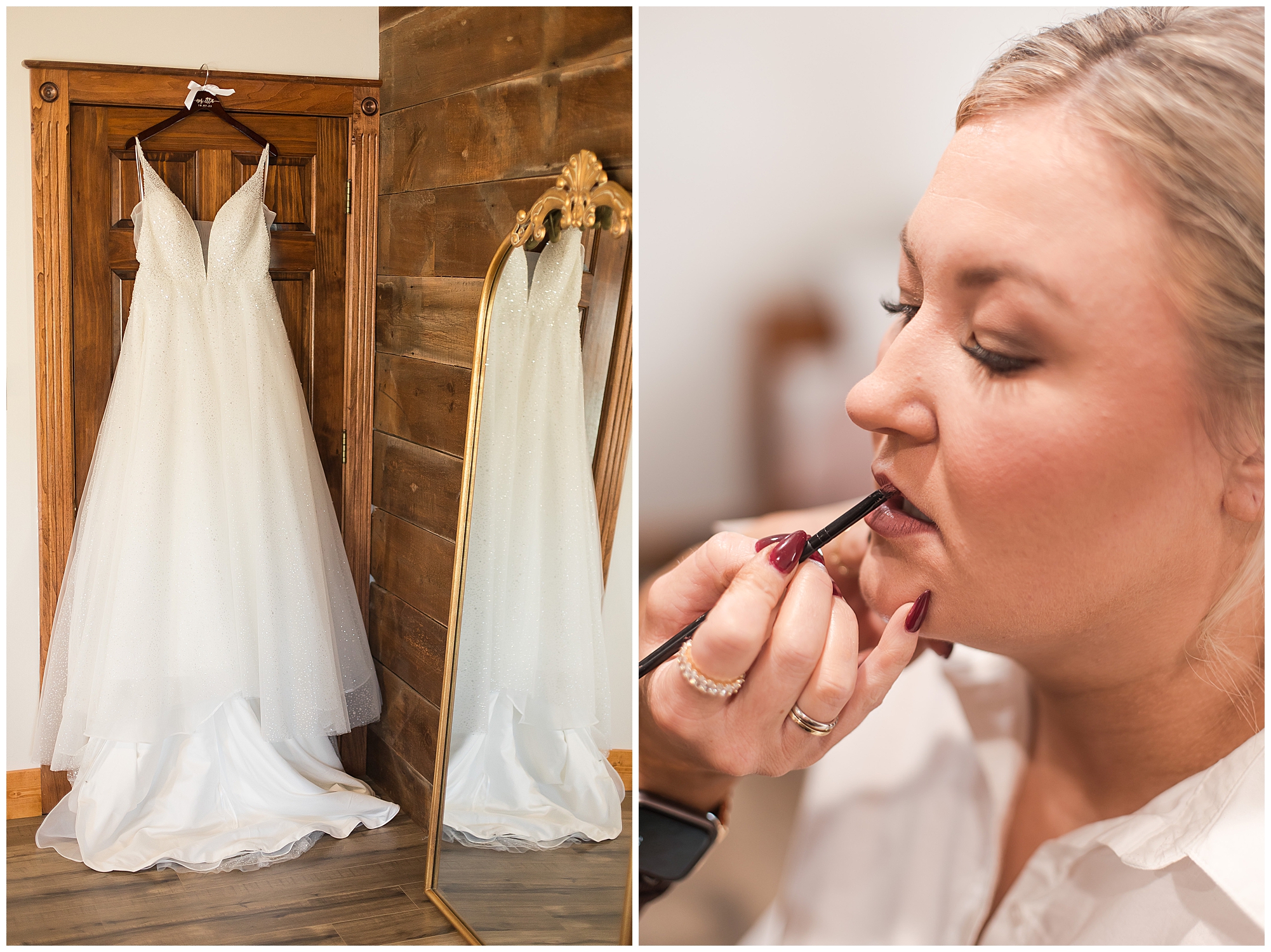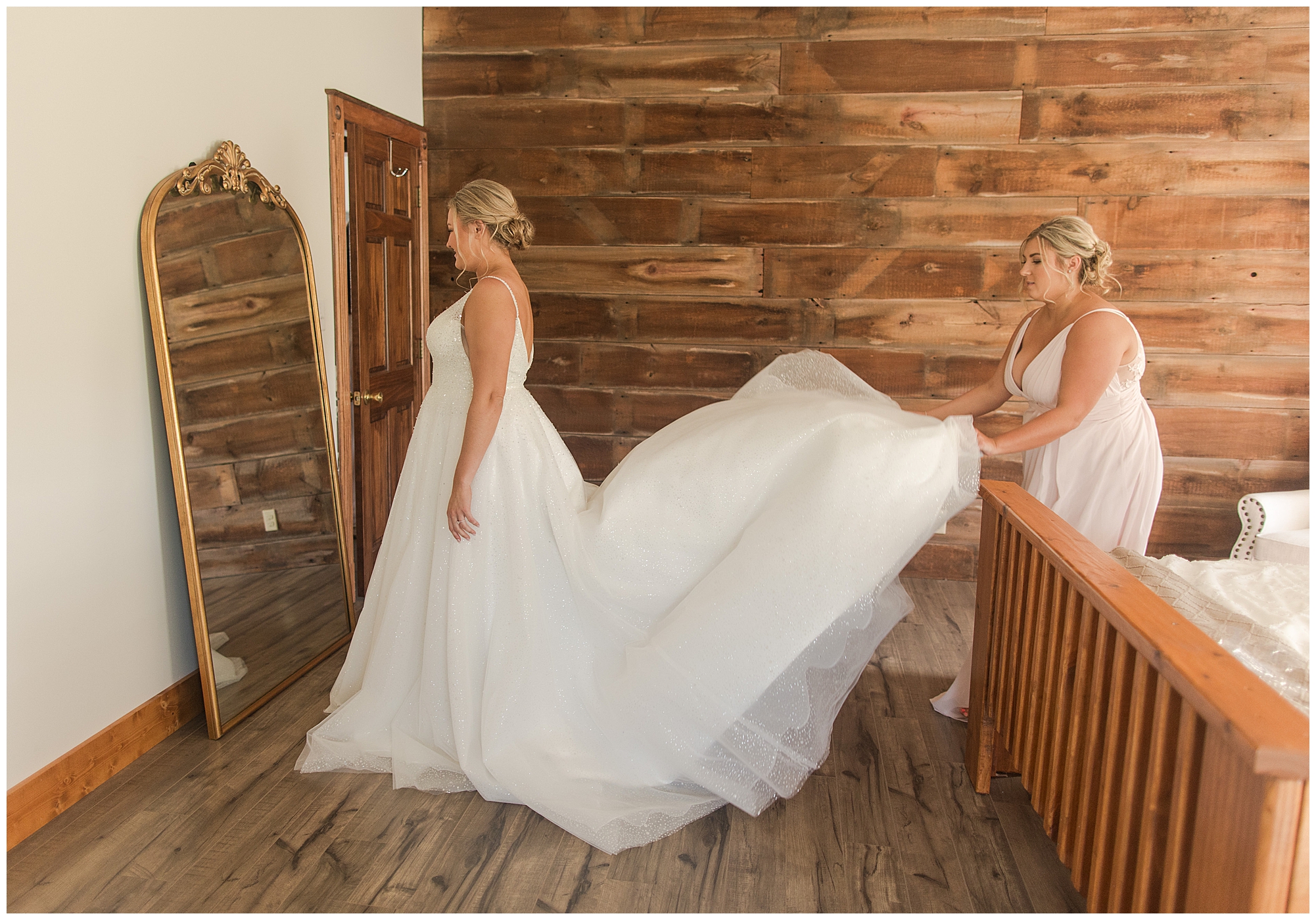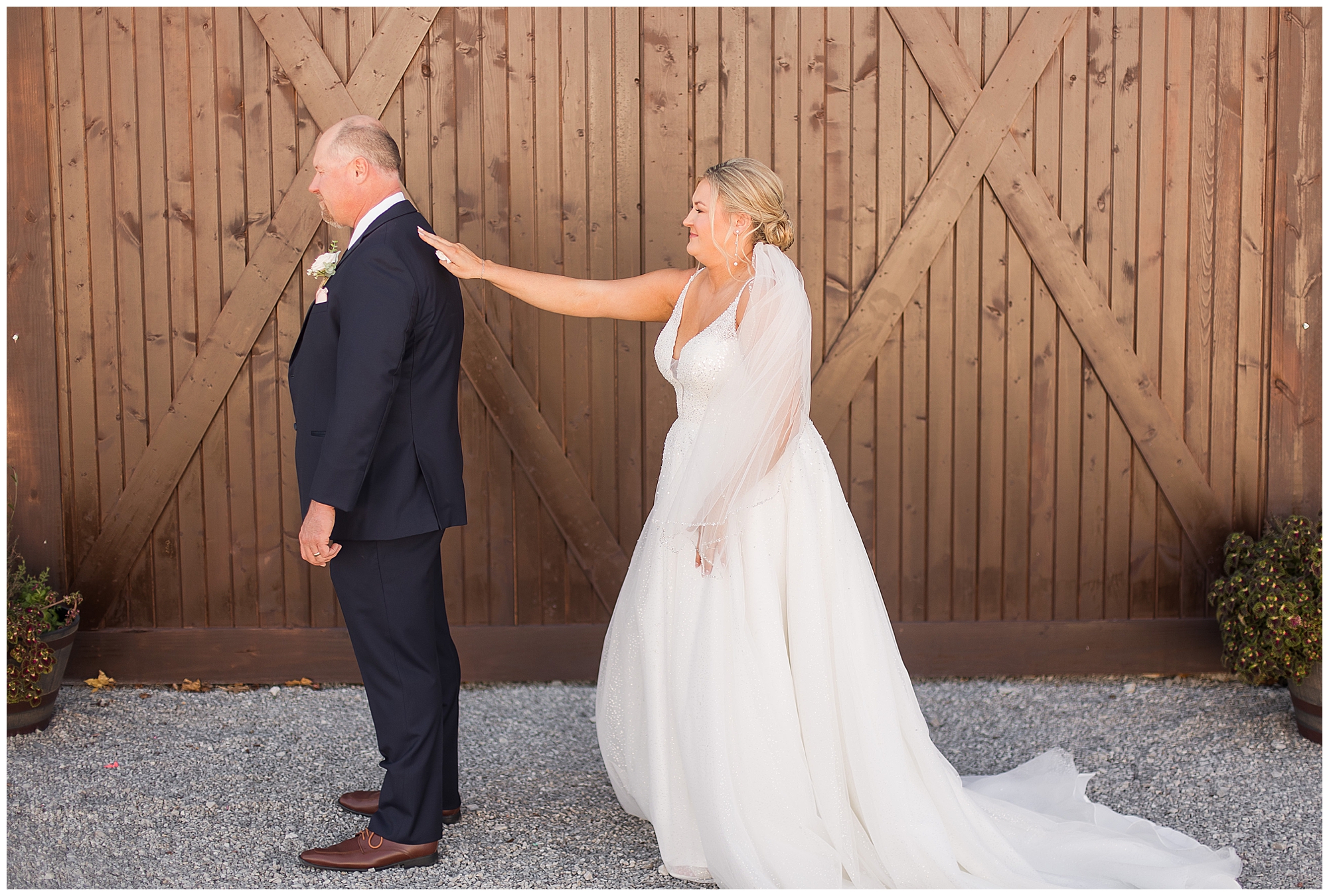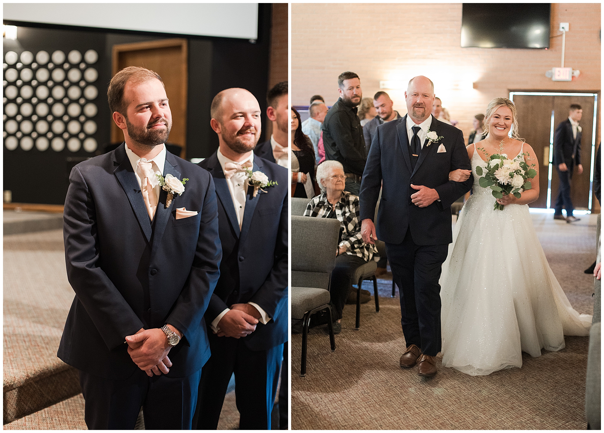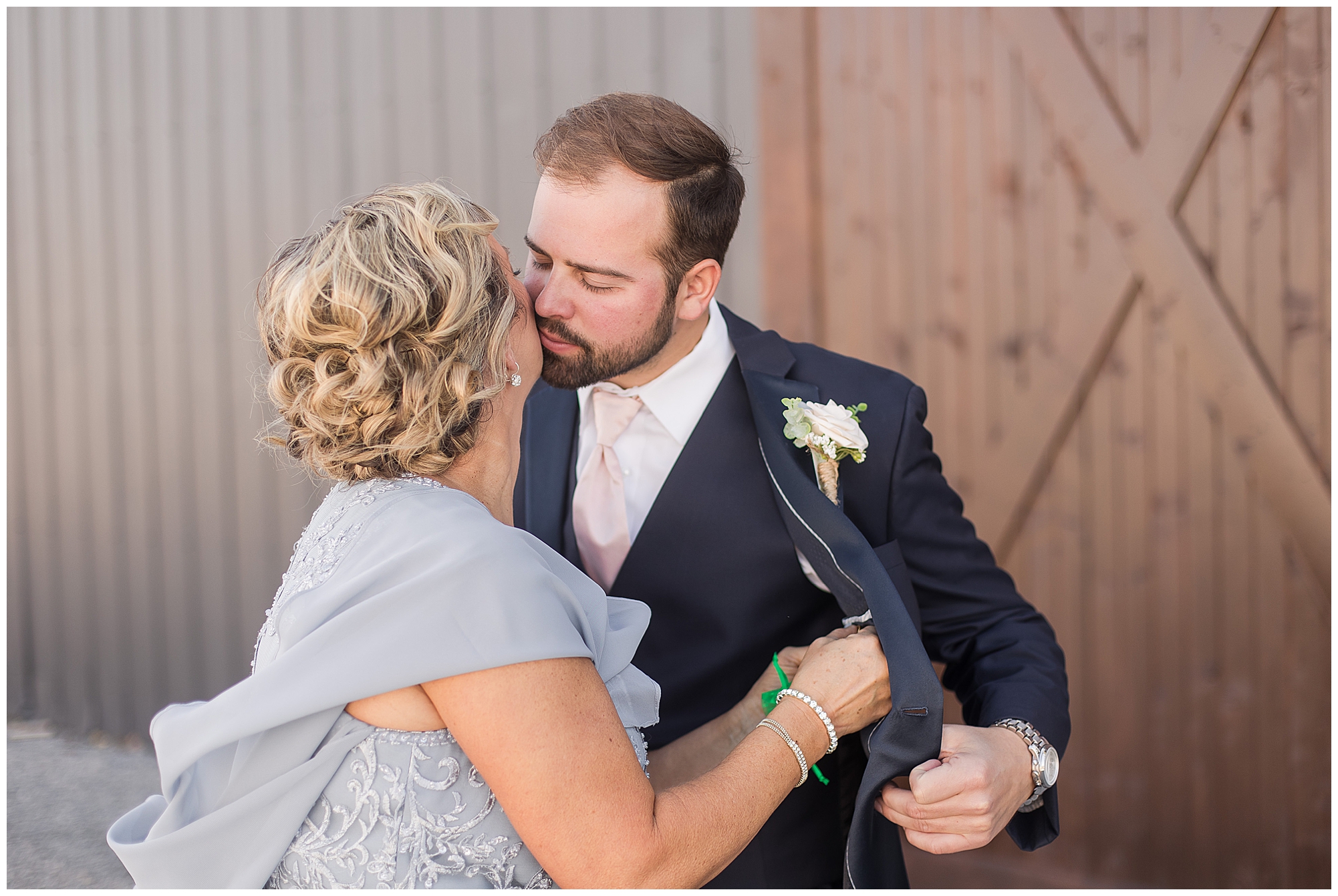 Tori and Cooper’s incredible fall wedding was simply put…Perfect! They chose to have the majority of their event at The Rustic Venues in Girard, Illinois, which is an amazing location spread out in the country surrounded by cornfields. This was my first time visiting this spot and it was a gorgeous place for this pair to celebrate their nuptials. Tori was the absolute epitome of chill bride! When I arrived, she was lounged back in the salon chair getting her hair done with a huge smile on her face! Her bridesmaids were helping prepare for the day in anyway they could and the atmosphere was full of positive energy. When it came time to get Tori dressed she was a stunner to say the least! She was sparkling in her chic gown that glided as she walked about. She was radiant for sure! Her besties were all dressed in blush pink dresses with various styles that fit each girl’s personality! I love this trend! Cooper and his gentlemen cleaned up nicely as well with navy suits and pops of pink with their accessories. Before Cooper got his first glance of his bride-to-be, he had to wait for Tori’s dad to have his chance. Within seconds of Tori and her dad seeing one another the tears started flowing. Such a sweet moment! Then when it was Cooper’s turn, he couldn’t hold back his emotions either. He said, “He didn’t think he would get emotional!” However, seeing his beautiful bride really got the feels going throughout the day.