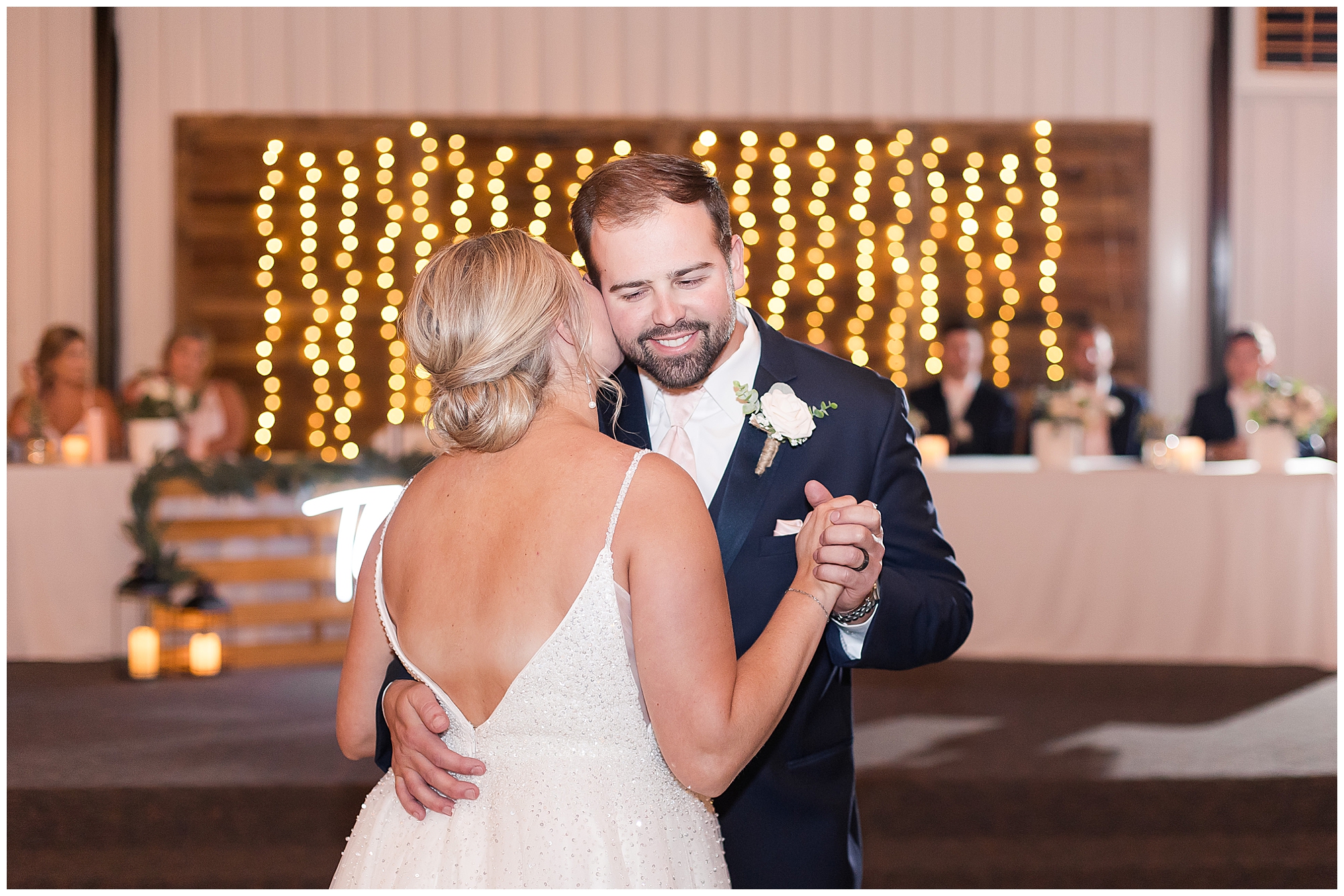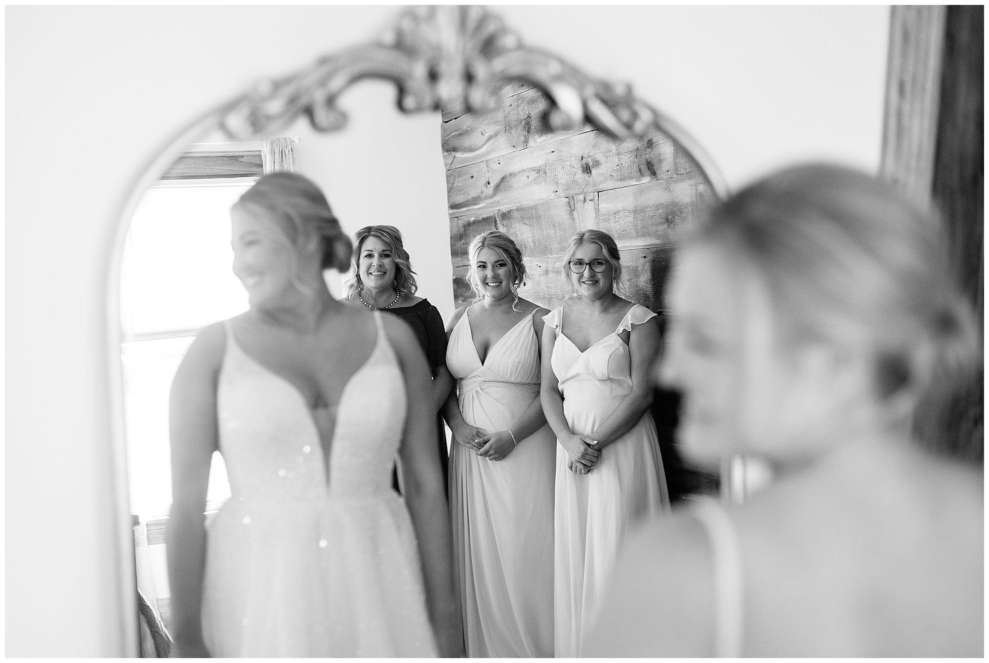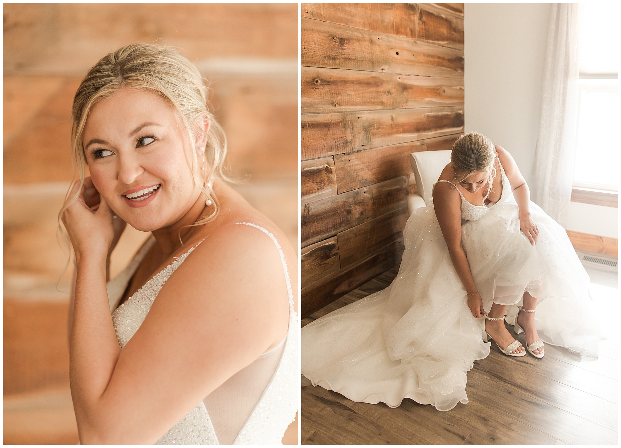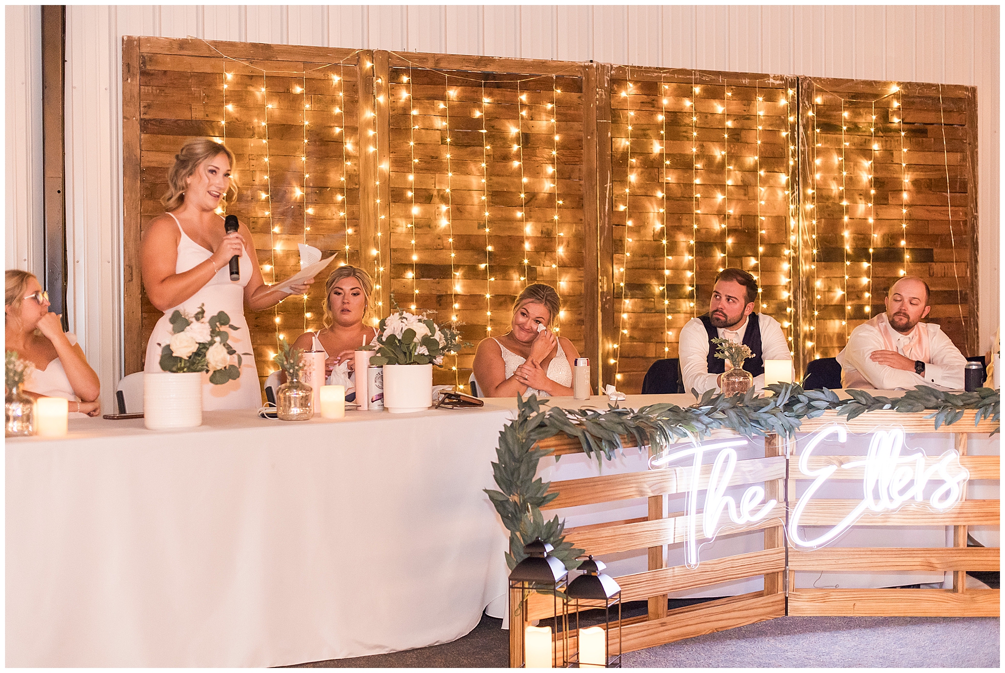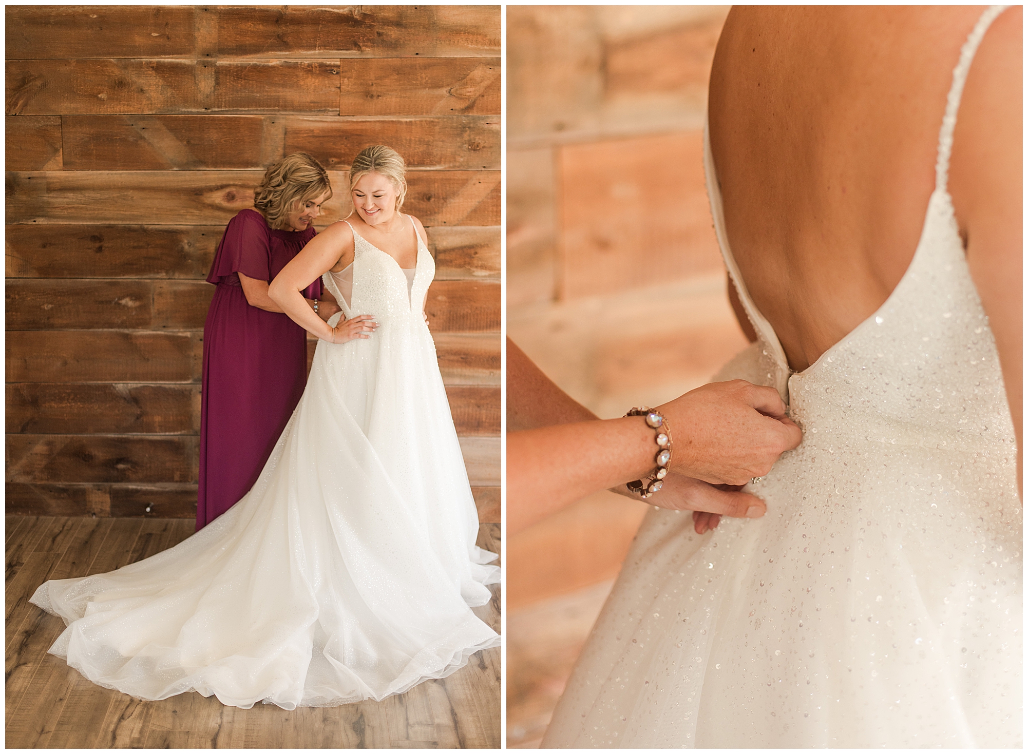Tori and Cooper’s incredible fall wedding was simply put…Perfect! They chose to have the majority of their event at The Rustic Venues in Girard, Illinois, which is an amazing location spread out in the country surrounded by cornfields. This was my first time visiting this spot and it was a gorgeous place for this pair to celebrate their nuptials. Tori was the absolute epitome of chill bride! When I arrived, she was lounged back in the salon chair getting her hair done with a huge smile on her face! Her bridesmaids were helping prepare for the day in anyway they could and the atmosphere was full of positive energy. When it came time to get Tori dressed she was a stunner to say the least! She was sparkling in her chic gown that glided as she walked about. She was radiant for sure! Her besties were all dressed in blush pink dresses with various styles that fit each girl’s personality! I love this trend! Cooper and his gentlemen cleaned up nicely as well with navy suits and pops of pink with their accessories. Before Cooper got his first glance of his bride-to-be, he had to wait for Tori’s dad to have his chance. Within seconds of Tori and her dad seeing one another the tears started flowing. Such a sweet moment! Then when it was Cooper’s turn, he couldn’t hold back his emotions either. He said, “He didn’t think he would get emotional!” However, seeing his beautiful bride really got the feels going throughout the day.