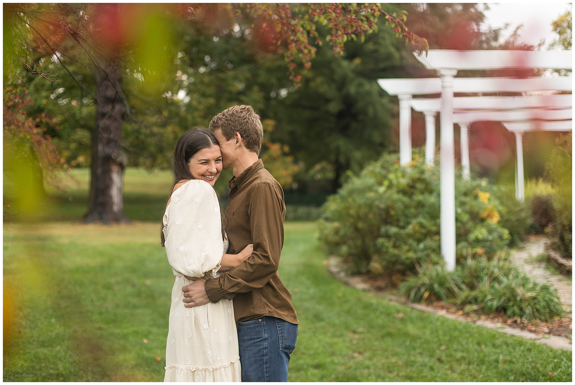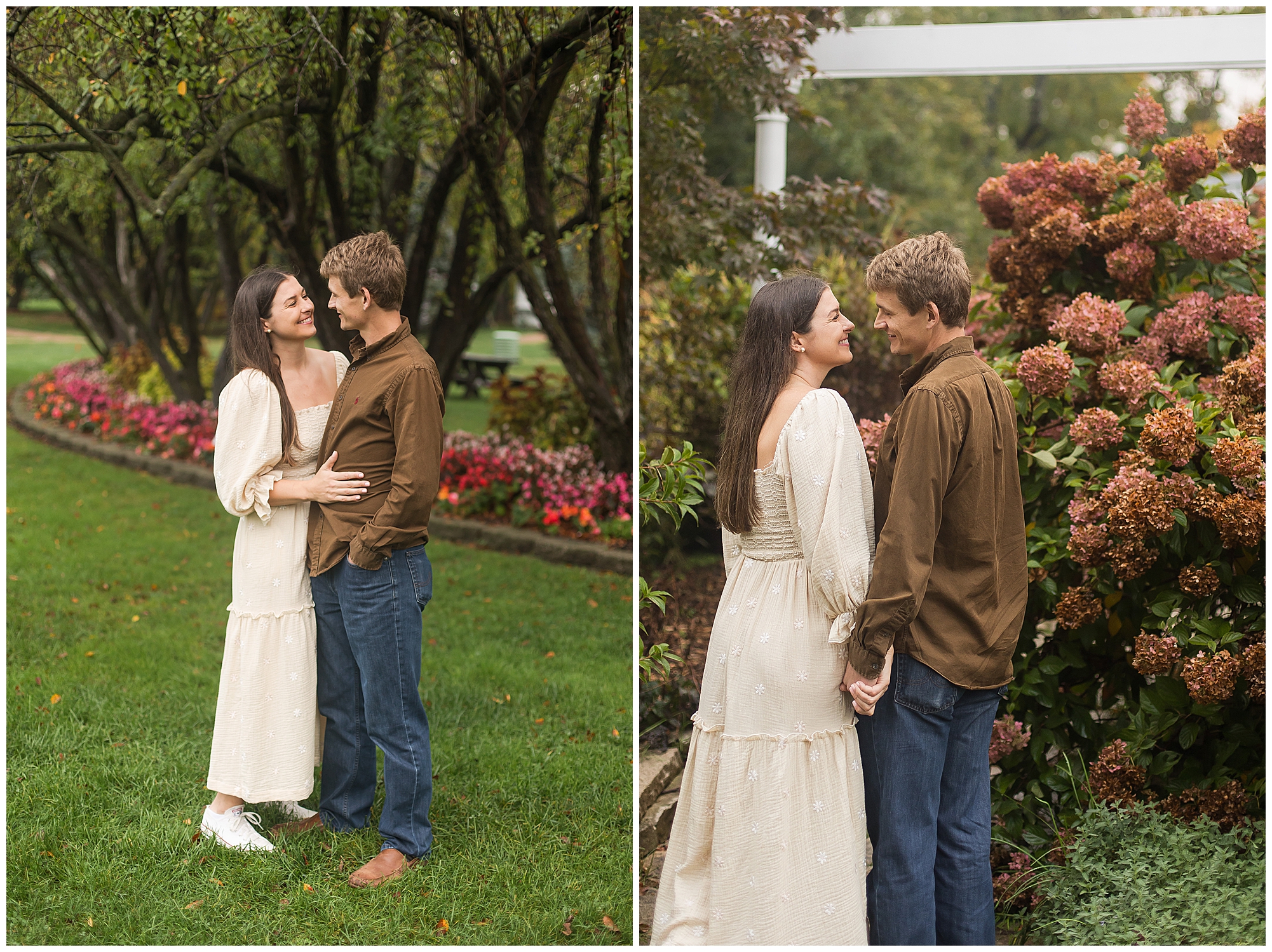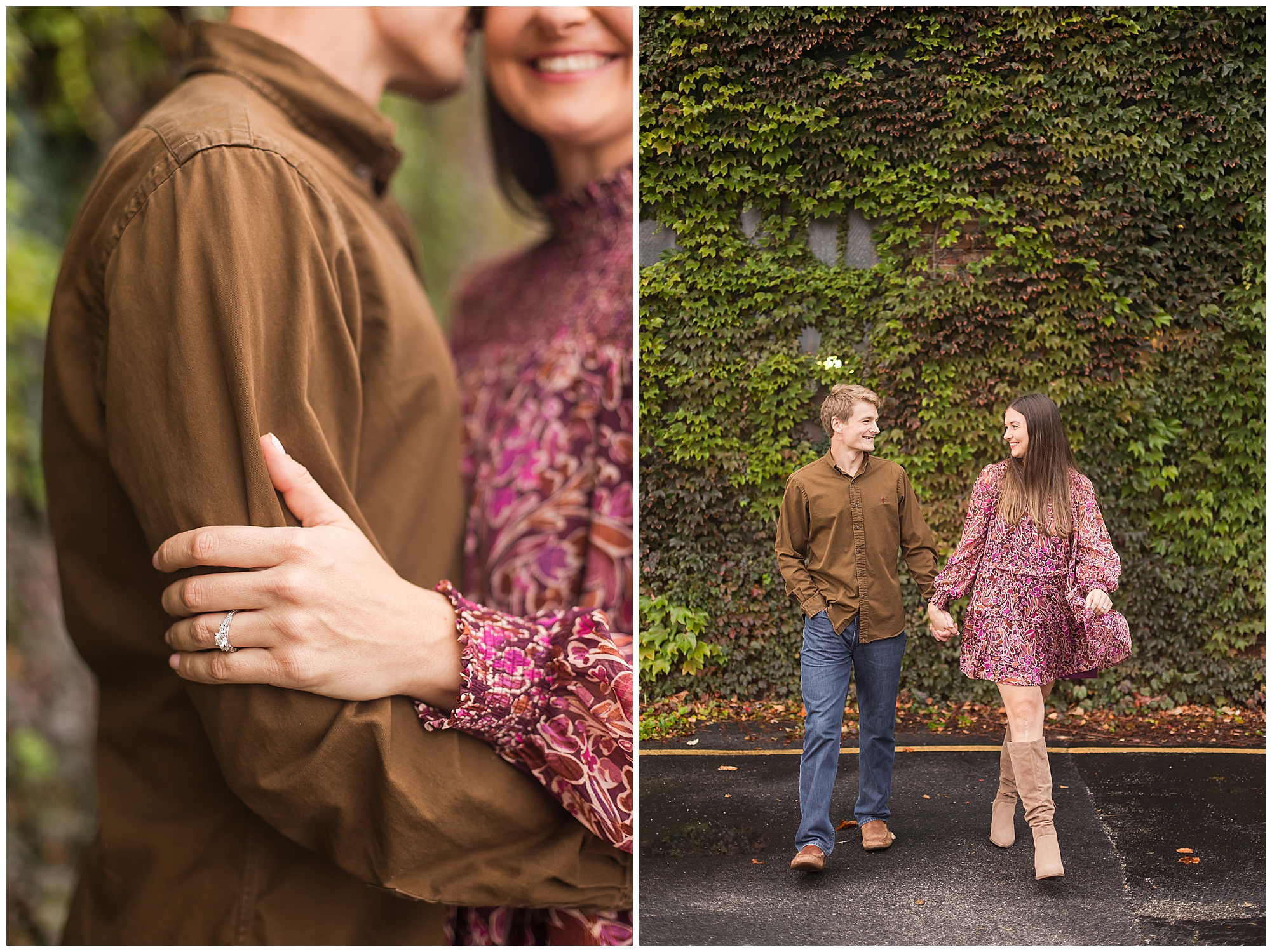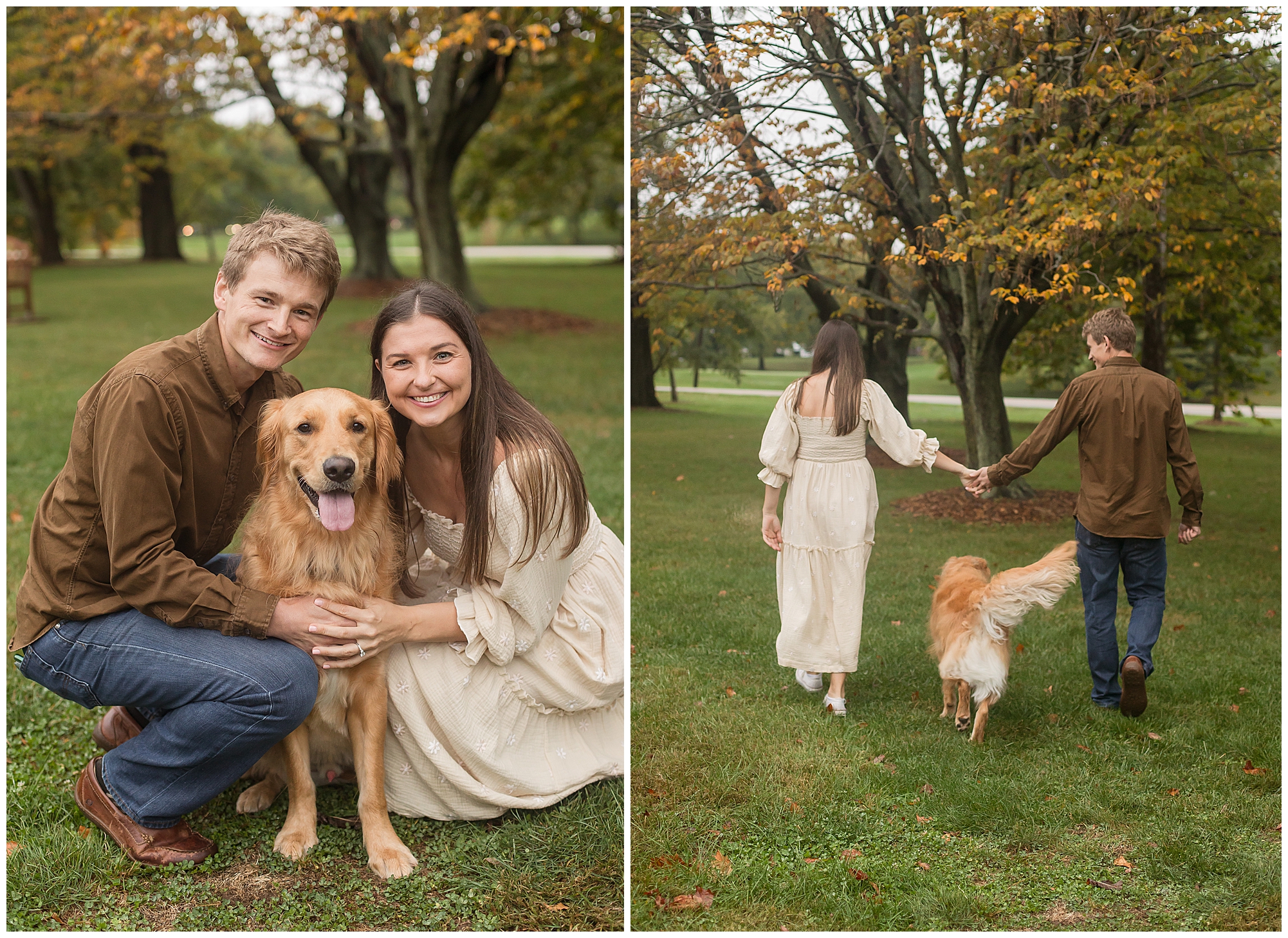 We began their session with some urban flare in front of Geitl Bros. with all the ivy and brick we could handle. But, this duo is incredibly laid back and they were up for anything from the jump, which made our session such a joy! Sloane looked amazing in a funky colorful dress with bell sleeves and suede knee-high boots! Such a vibe! Ben’s muted brown button down shirt grounded the whole look, which I loved. The way these two just giggled together was my absolute favorite though. We incorporated a ton of movement and these two were absolutely game for it all! We had a quick outfit change as we headed over to Washington Park to finish up our time together. There were still a few late flowers out here and there around the park, but we continued to luck out and found one tree that was starting to show off some fall foliage! I’ll take it! And remember when I said the cuteness meter spiked over 100%? It’s because Sloane and Ben’s furbaby, Bruno, arrived for his close up! Once I found out we were all lovers of Golden Retrievers (as my family has a one year old golden girl) I fell even harder for with Sloane and Ben! Bruno was such a good boy and I had a blast seeing these two dote on their pup! I cannot wait to be a part of this wonderful couple’s wedding day this year!
