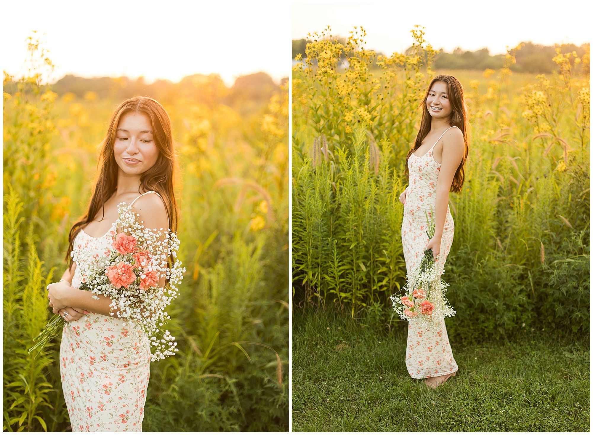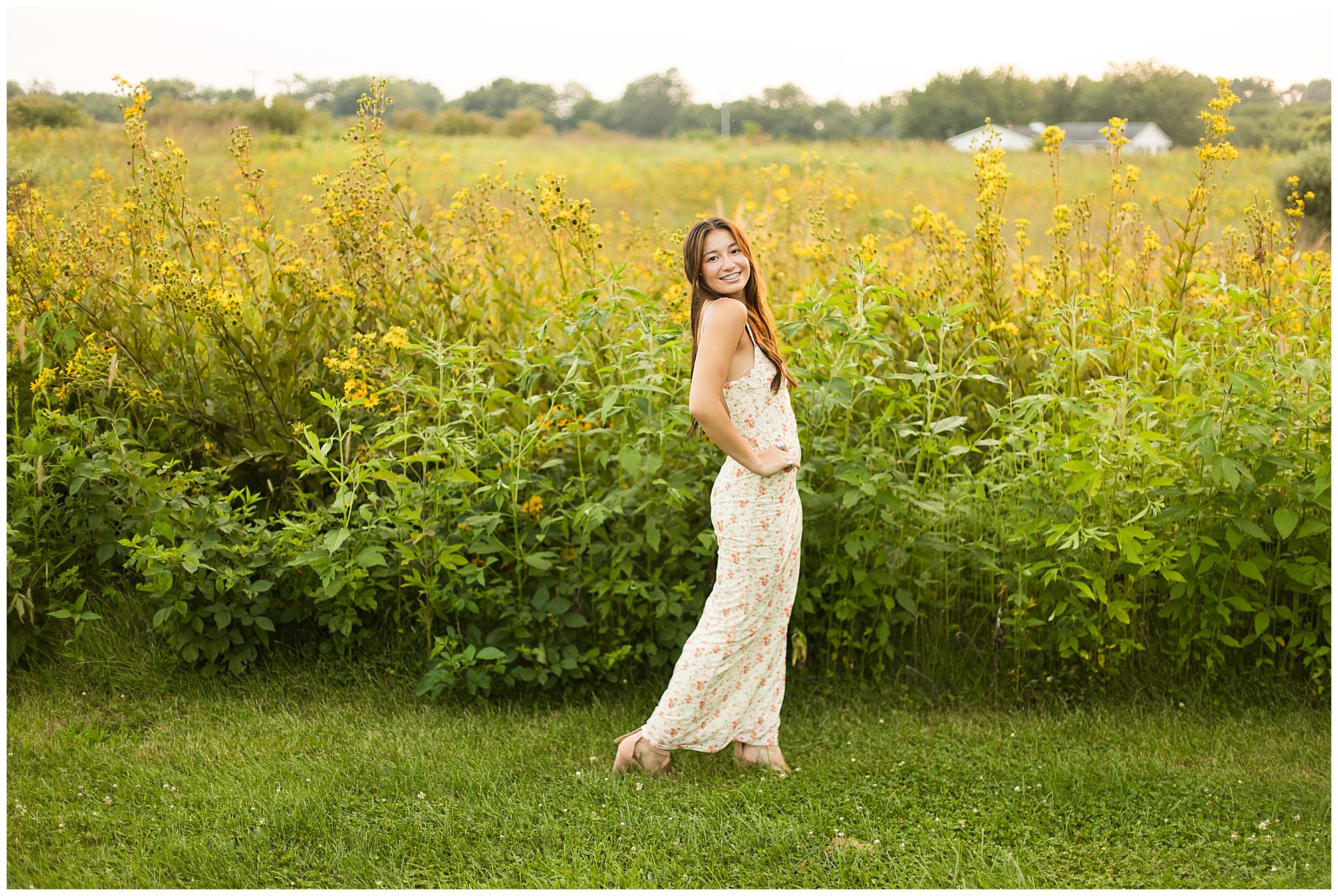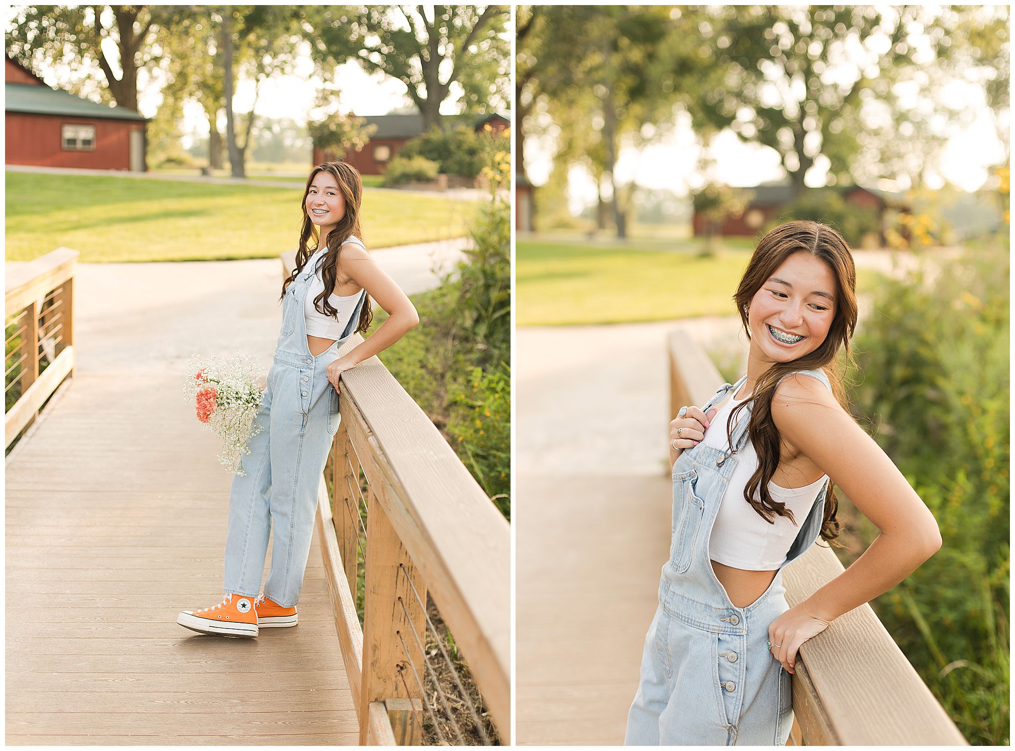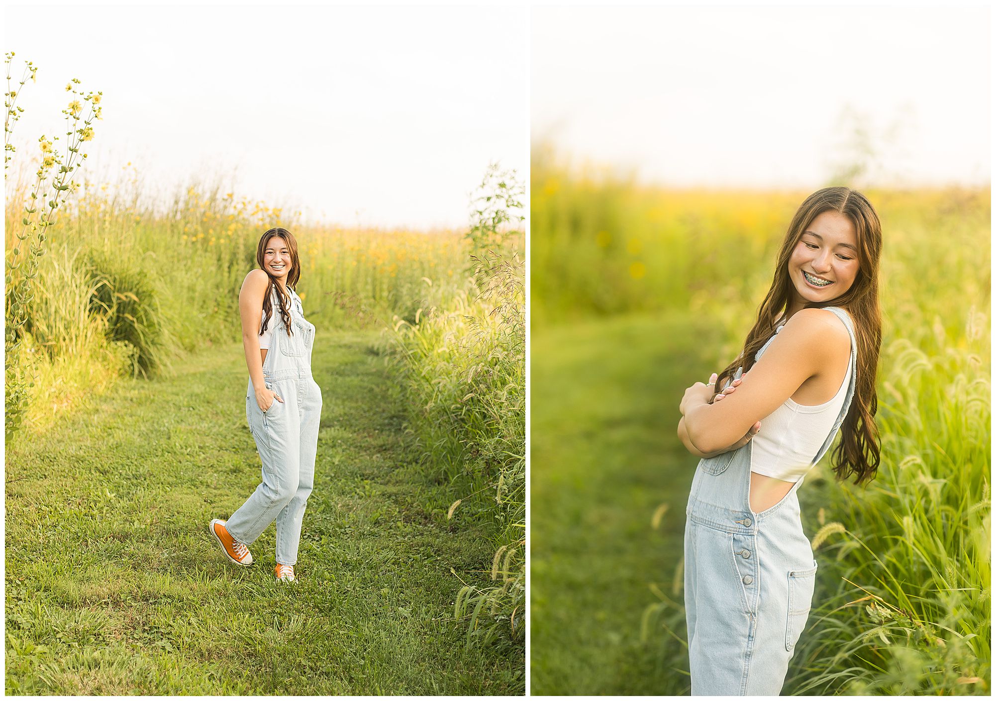 Miss Dakota is a bright shining energy, which is why I knew she would be amazing as a LWP Senior Spokesmodel for the Class of 2024! Over the summer, I met up with Dakota for her individual senior session and this beauty brought all the fun with her on a hot, but lovely evening. She started out in her casual outfit, with jean overalls, a white tank, and her favorite color high top shoes. This girl loves her some orange anything and made sure to incorporate it into her photos! She even brought along a bouquet of flowers for us to play with, which had pops of orange blooms throughout. Love this idea! We found so many incredible yellow fields of flowers during Dakota’s session it was amazing and it really highlighted her bold and fun-loving personality!