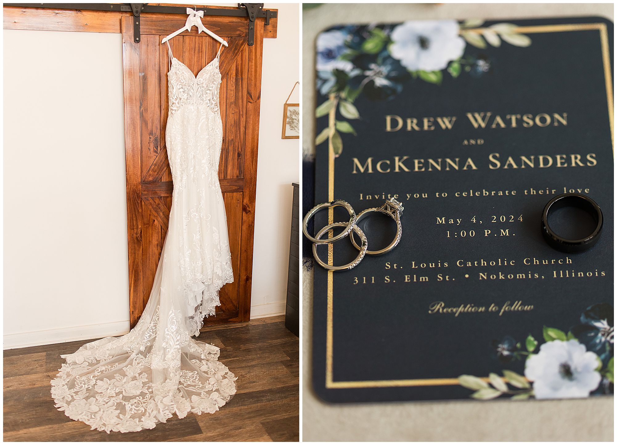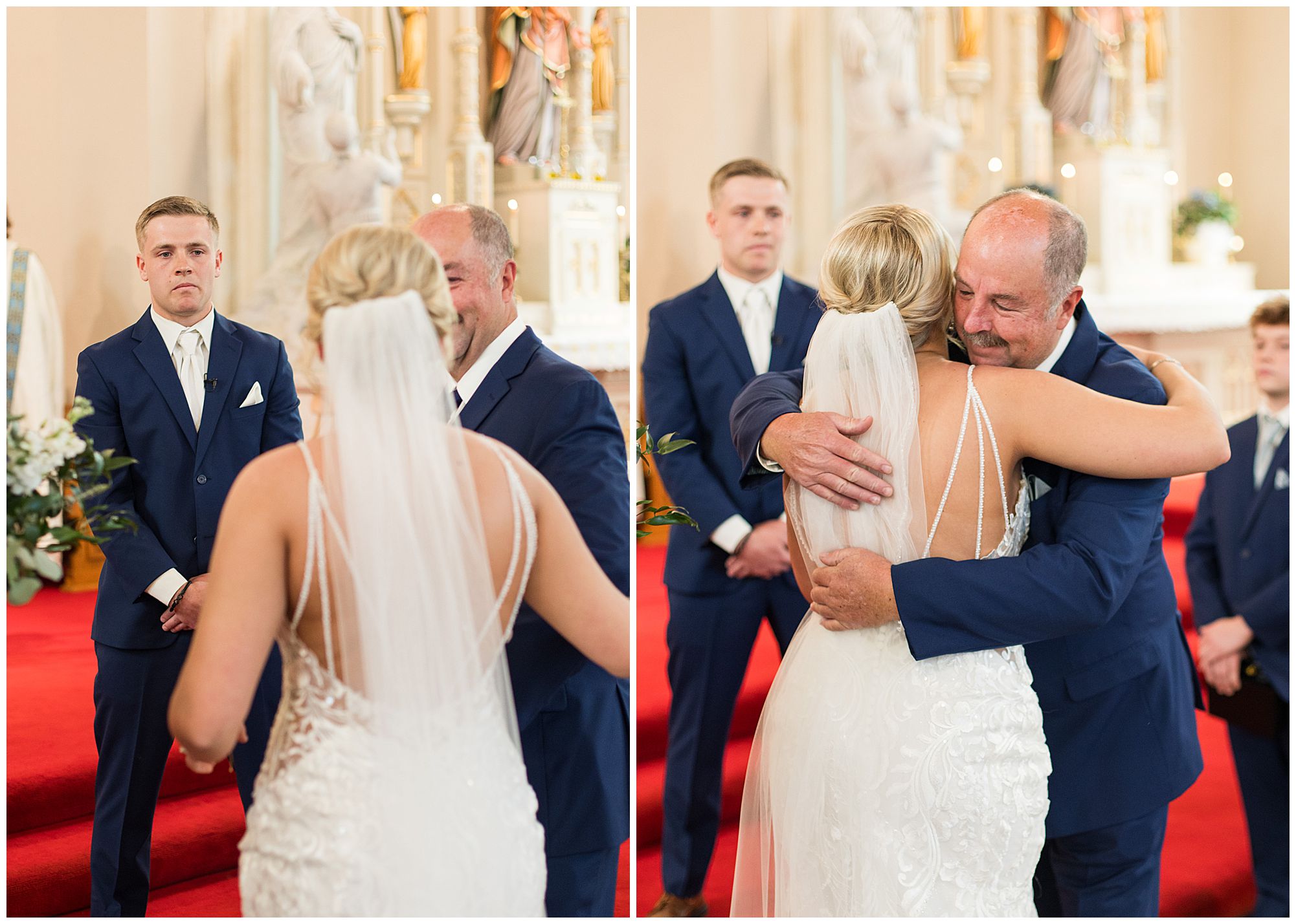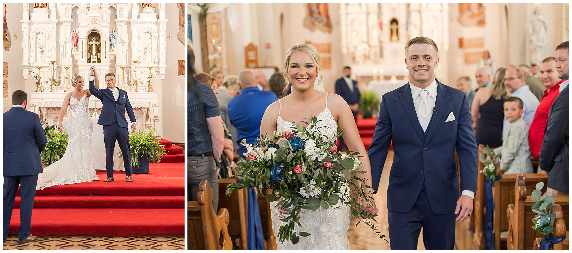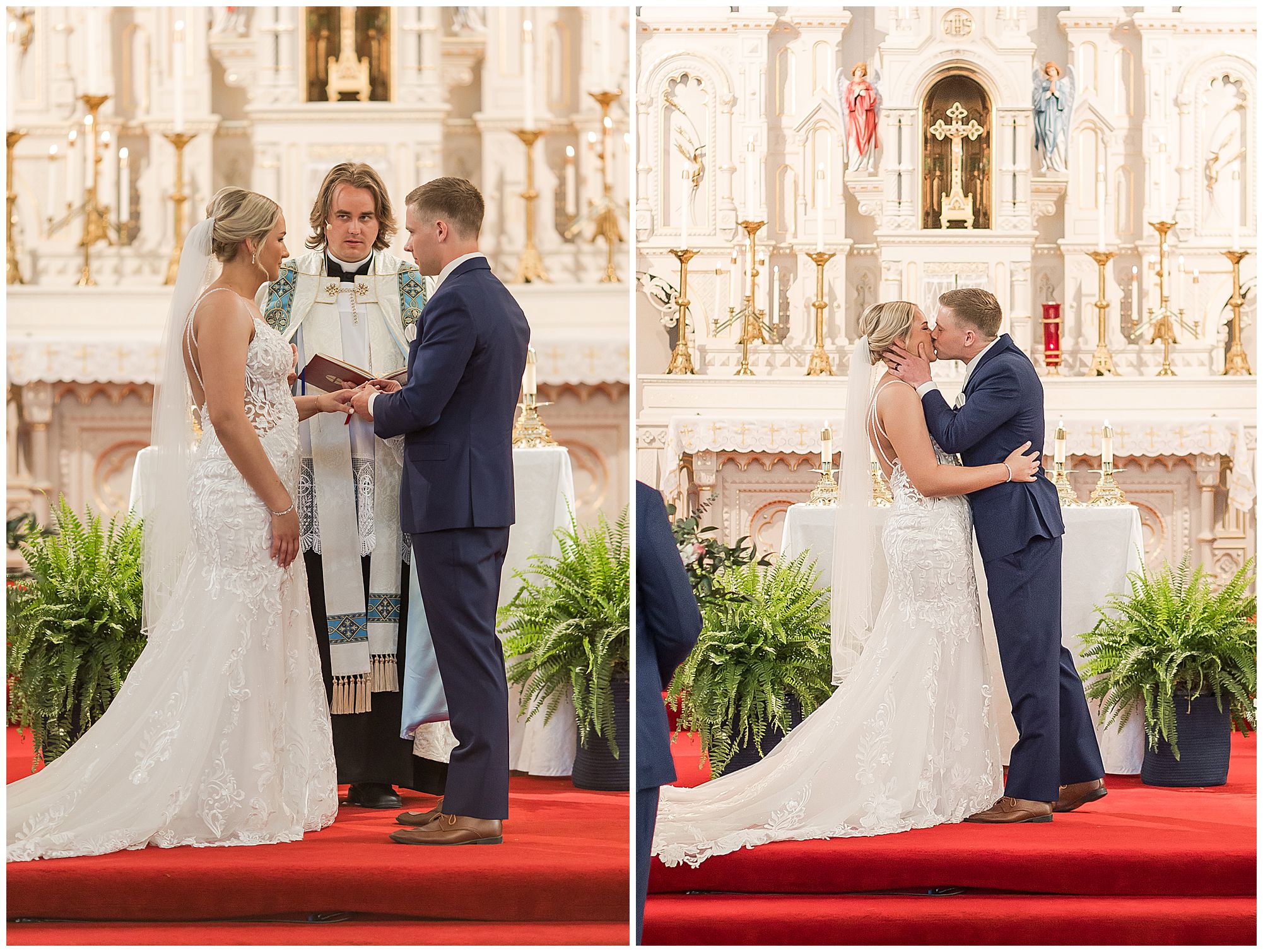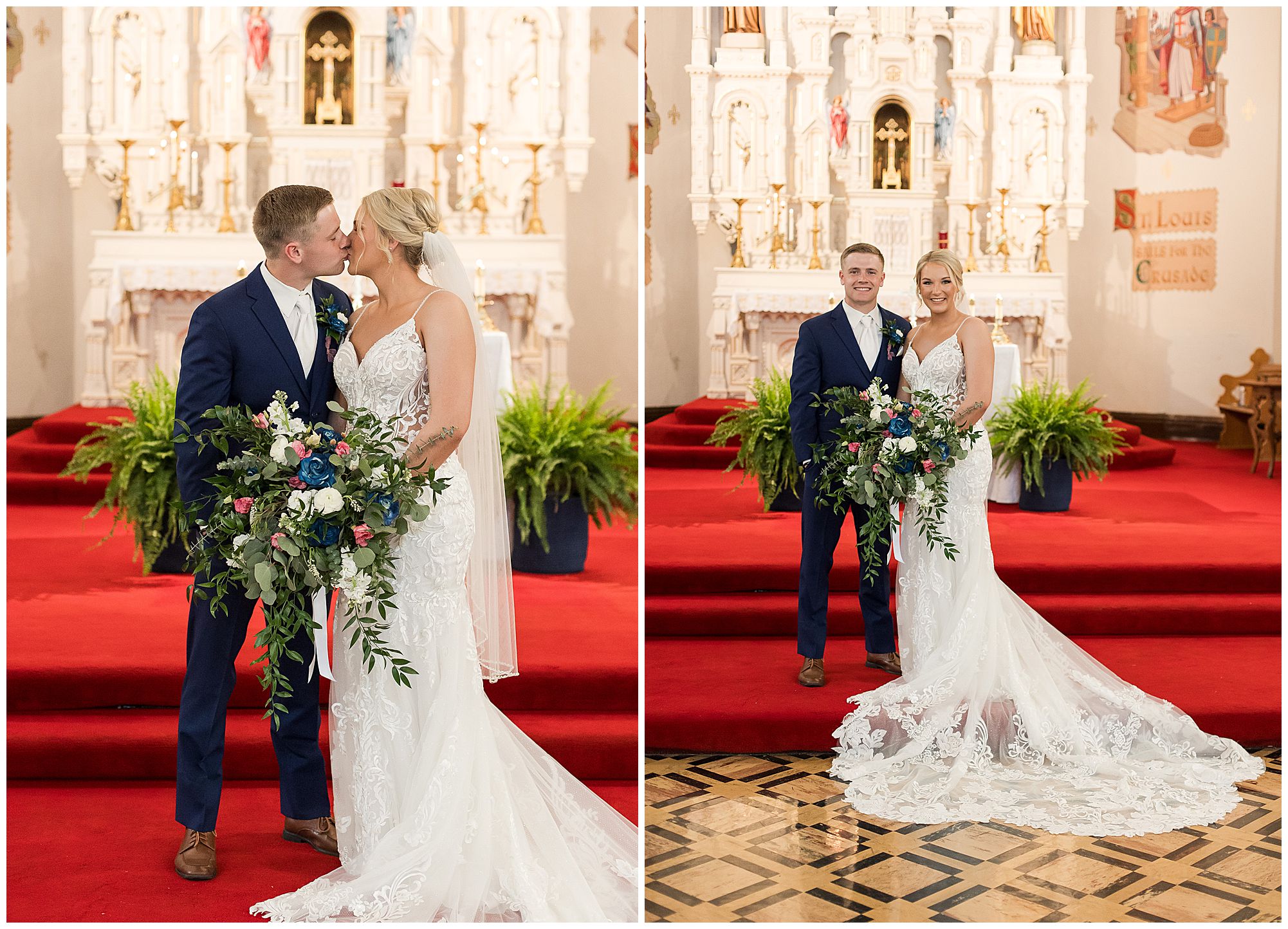 McKenna and Drew held their nuptials at the magnificent St. Louis Catholic Church in Nokomis surrounded by loved ones, who packed the pews. McKenna and her father made her big walk down the aisle towards Drew as the organ played and it really was a moment. This couple chose to get married on this meaningful date of May 4th for a reason. And if their guests listened carefully during the ceremony, they would hear McKenna and Drew weren’t only exchanging rings and vows, but they were actually celebrating their one year anniversary! Yes, I said that right! SURPRISE!!! McKenna and Drew technically tied the knot a year to the day at the same church surrounded by immediate family in an intimate lovely ceremony unbeknownst to many friends. Drew was only days away from being deployed as a firefighter in the U.S. Army (Thank You so much for your service, Drew). I had the pleasure of photographing this beautiful couple as they pledged their lives to one another and become Mr. & Mrs. Watson in this exact spot a year previous. They kept this their little secret until a year later when they could share it with the world! McKenna and Drew renewed their vows and sealed it all with a kiss! Congrats to this wonderful couple!