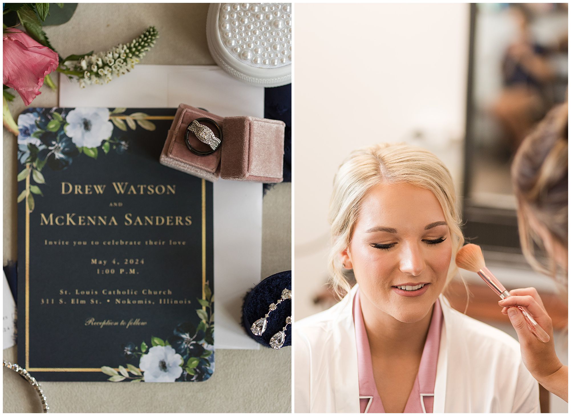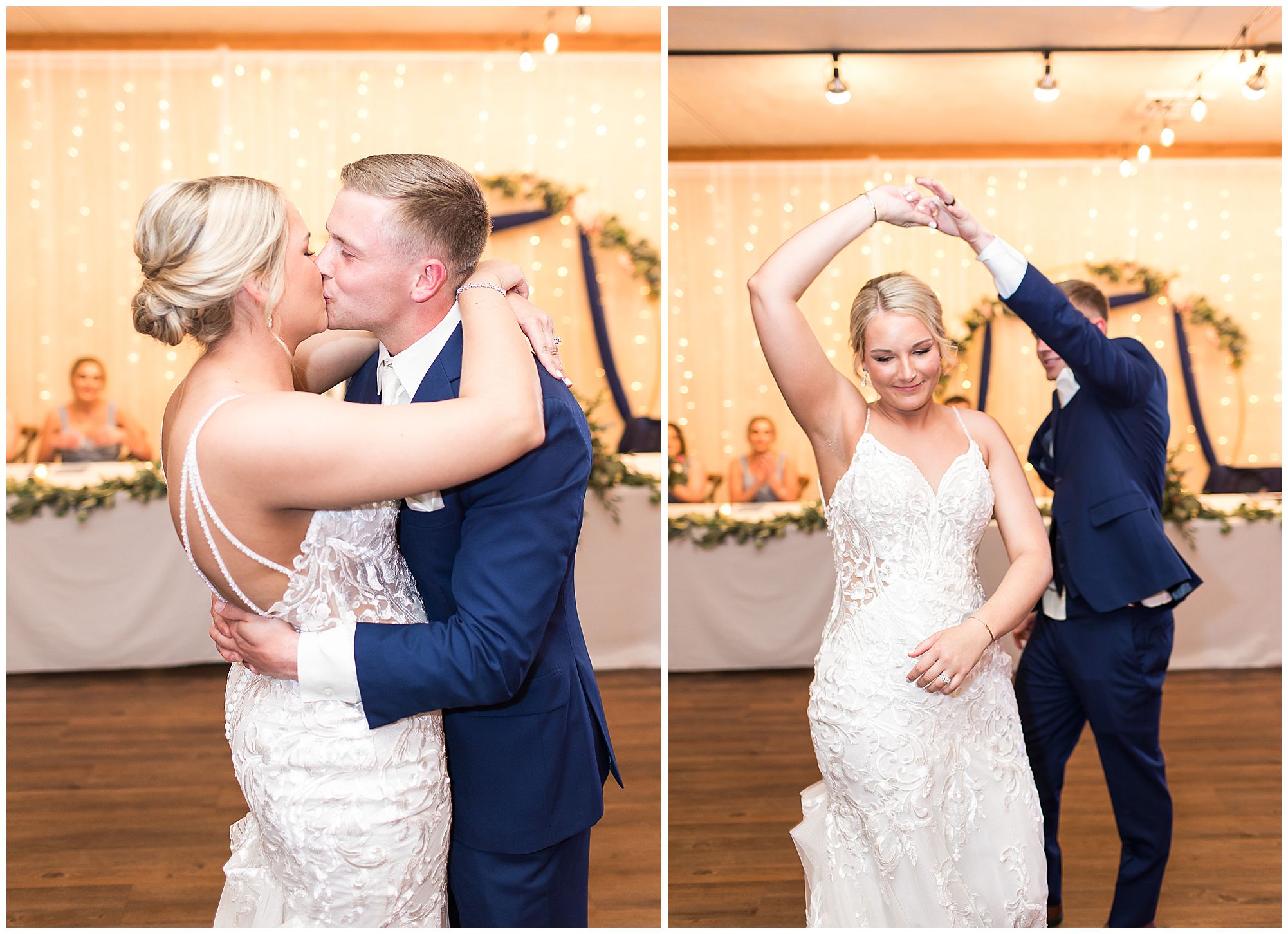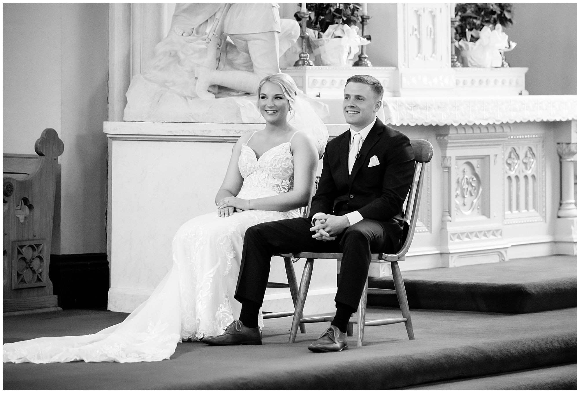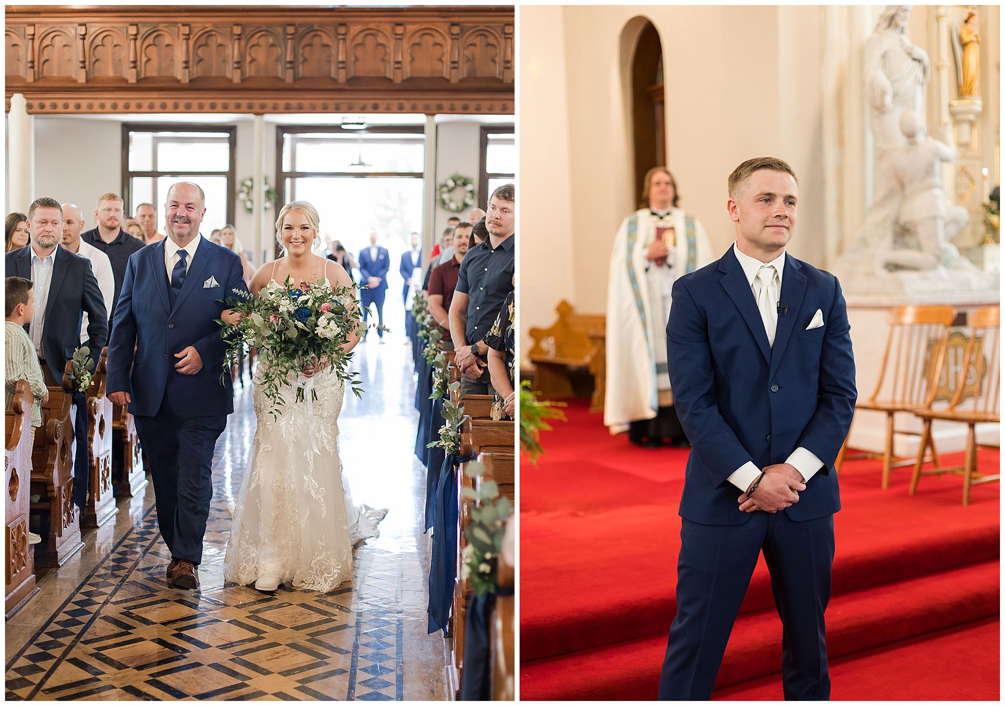 McKenna and Drew held their nuptials at the magnificent St. Louis Catholic Church in Nokomis surrounded by loved ones, who packed the pews. McKenna and her father made her big walk down the aisle towards Drew as the organ played and it really was a moment. This couple chose to get married on this meaningful date of May 4th for a reason. And if their guests listened carefully during the ceremony, they would hear McKenna and Drew weren’t only exchanging rings and vows, but they were actually celebrating their one year anniversary! Yes, I said that right! SURPRISE!!! McKenna and Drew technically tied the knot a year to the day at the same church surrounded by immediate family in an intimate lovely ceremony unbeknownst to many friends. Drew was only days away from being deployed as a firefighter in the U.S. Army (Thank You so much for your service, Drew). I had the pleasure of photographing this beautiful couple as they pledged their lives to one another and become Mr. & Mrs. Watson in this exact spot a year previous. They kept this their little secret until a year later when they could share it with the world! McKenna and Drew renewed their vows and sealed it all with a kiss! Congrats to this wonderful couple!