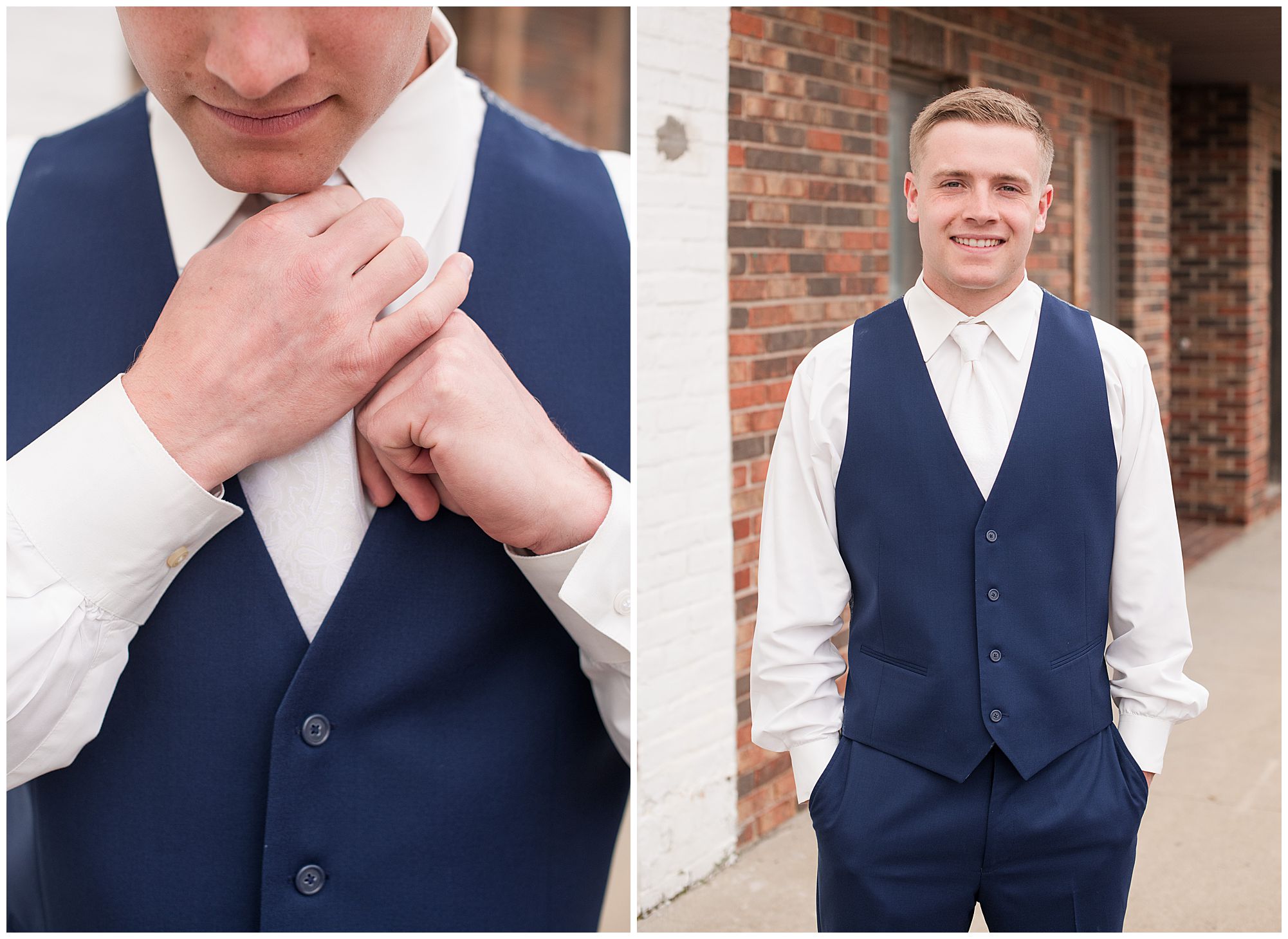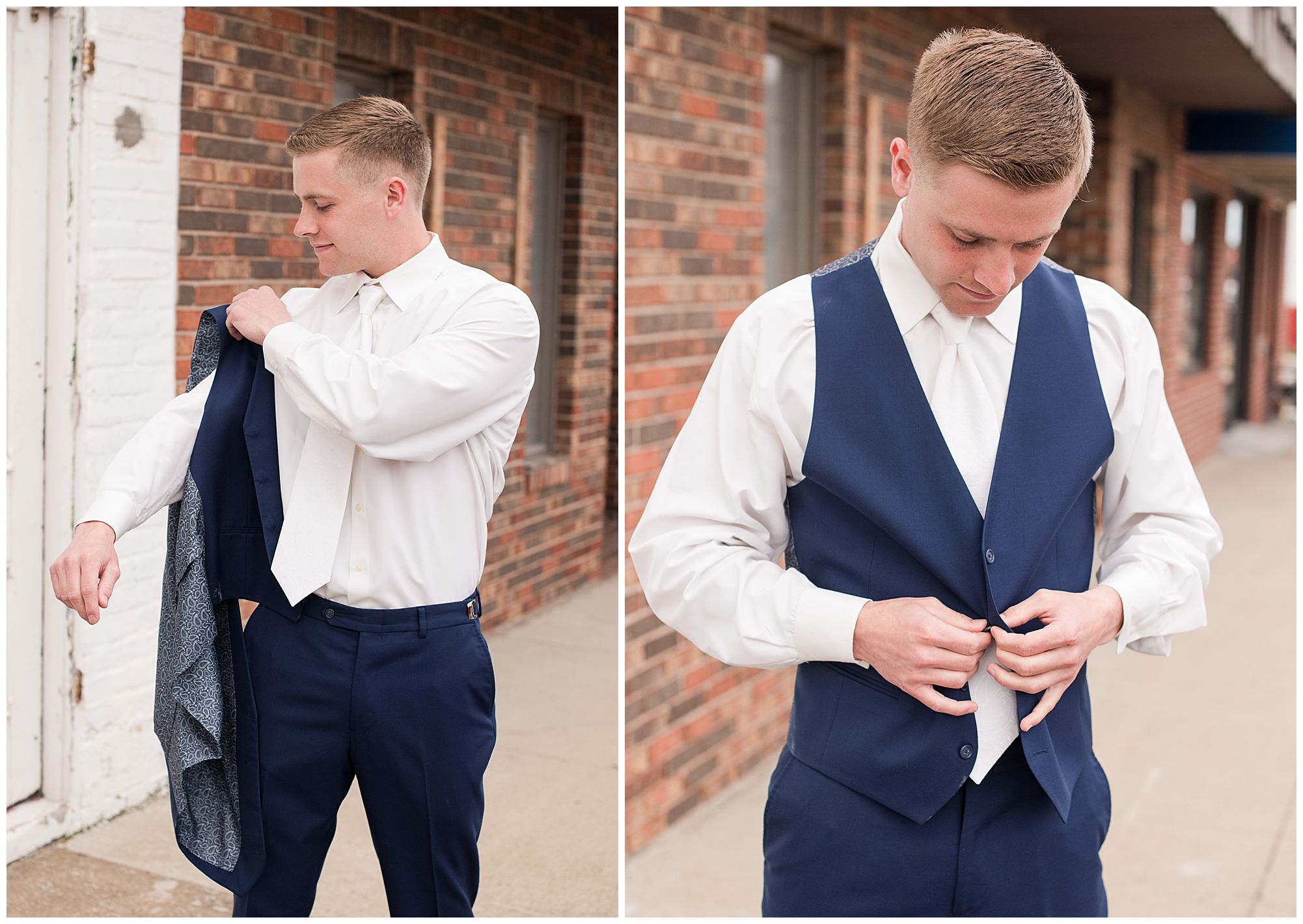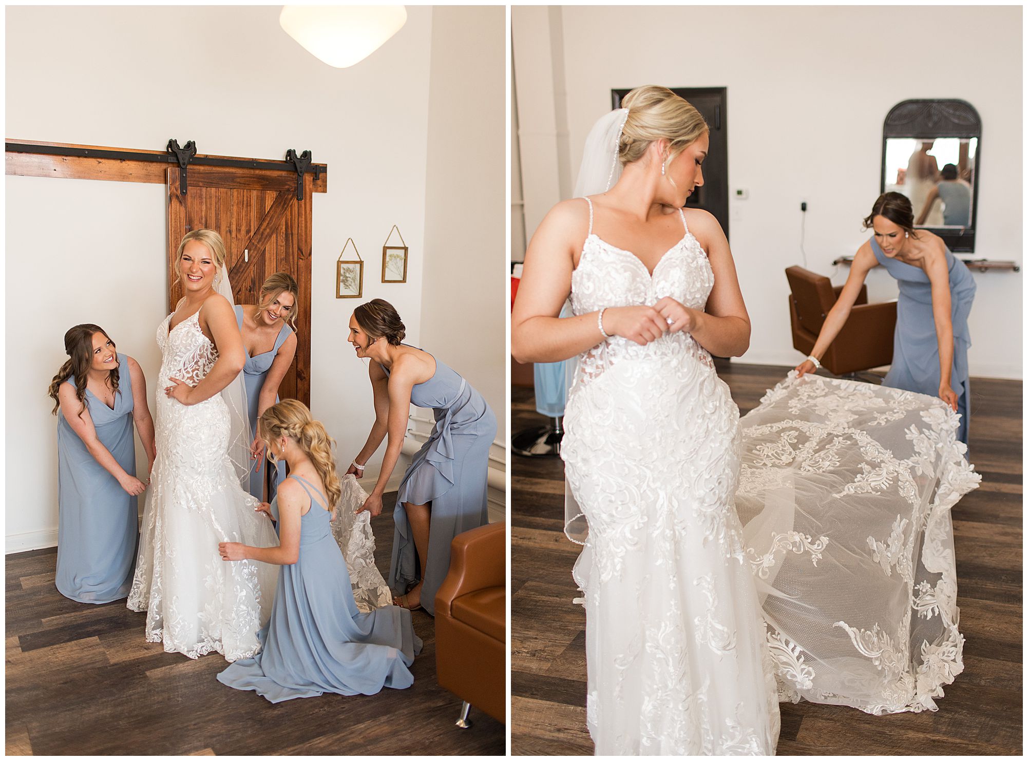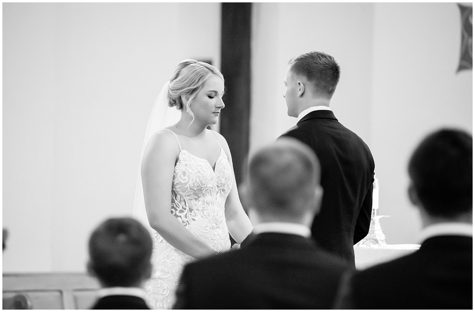 McKenna and her ladies were relaxed and in high spirits at the salon where they were getting hair and makeup done the morning of the big day. They were ahead of schedule, which made everyone happy, including myself, bringing any type of stress level way down. McKenna was laid back and enjoying her time with her bridesmaids along with her mom and Drew’s mom. When it came time for McKenna to step into her gown she was an absolute vision! Her lace dress fit her perfectly and she was simply stunning by every sense of the word! Across the street in the little town of Nokomis, Drew and his guys were hanging out at a local bar, playing games, and enjoying one another’s company on this special day. Drew couldn’t let his bride outshine him too much and cleaned up pretty well in his navy suit and white tie. Now that these two are looking incredible, let’s get them to the church!