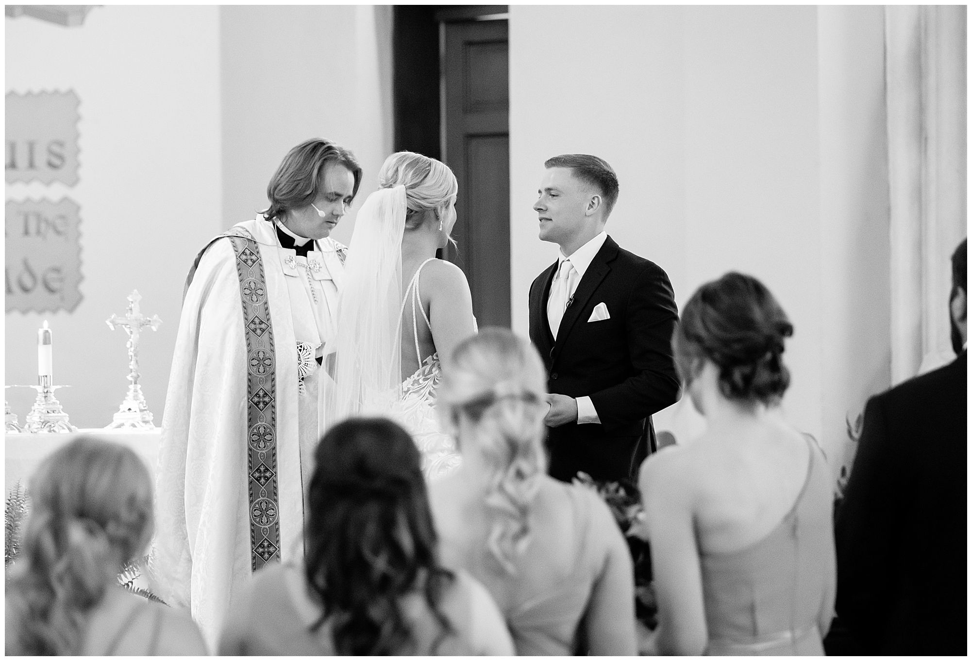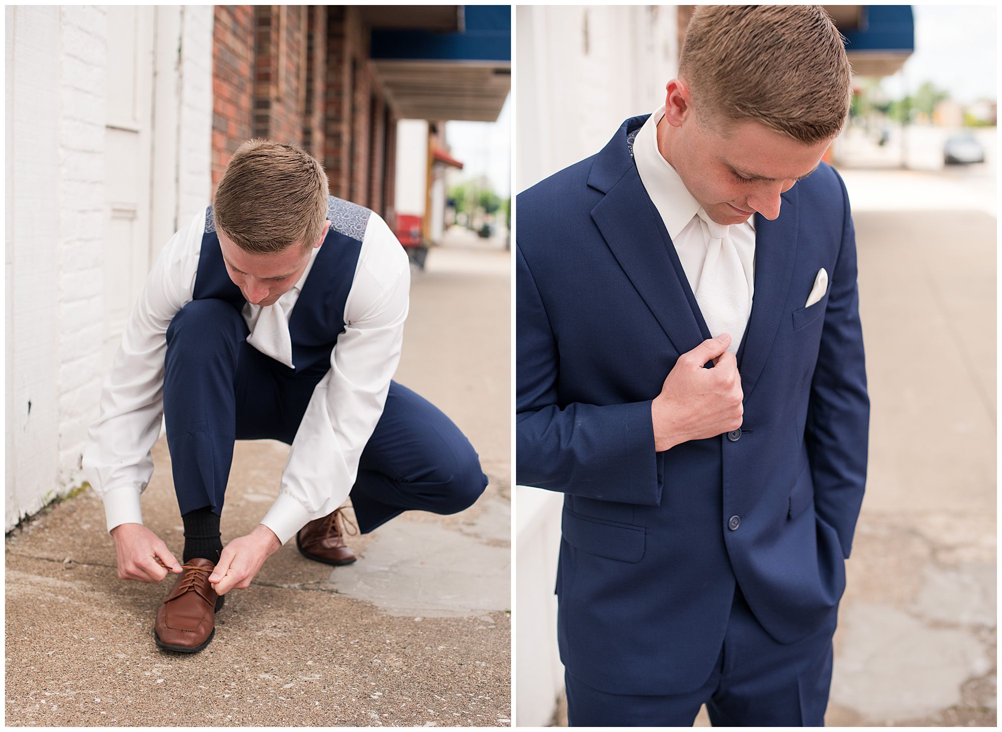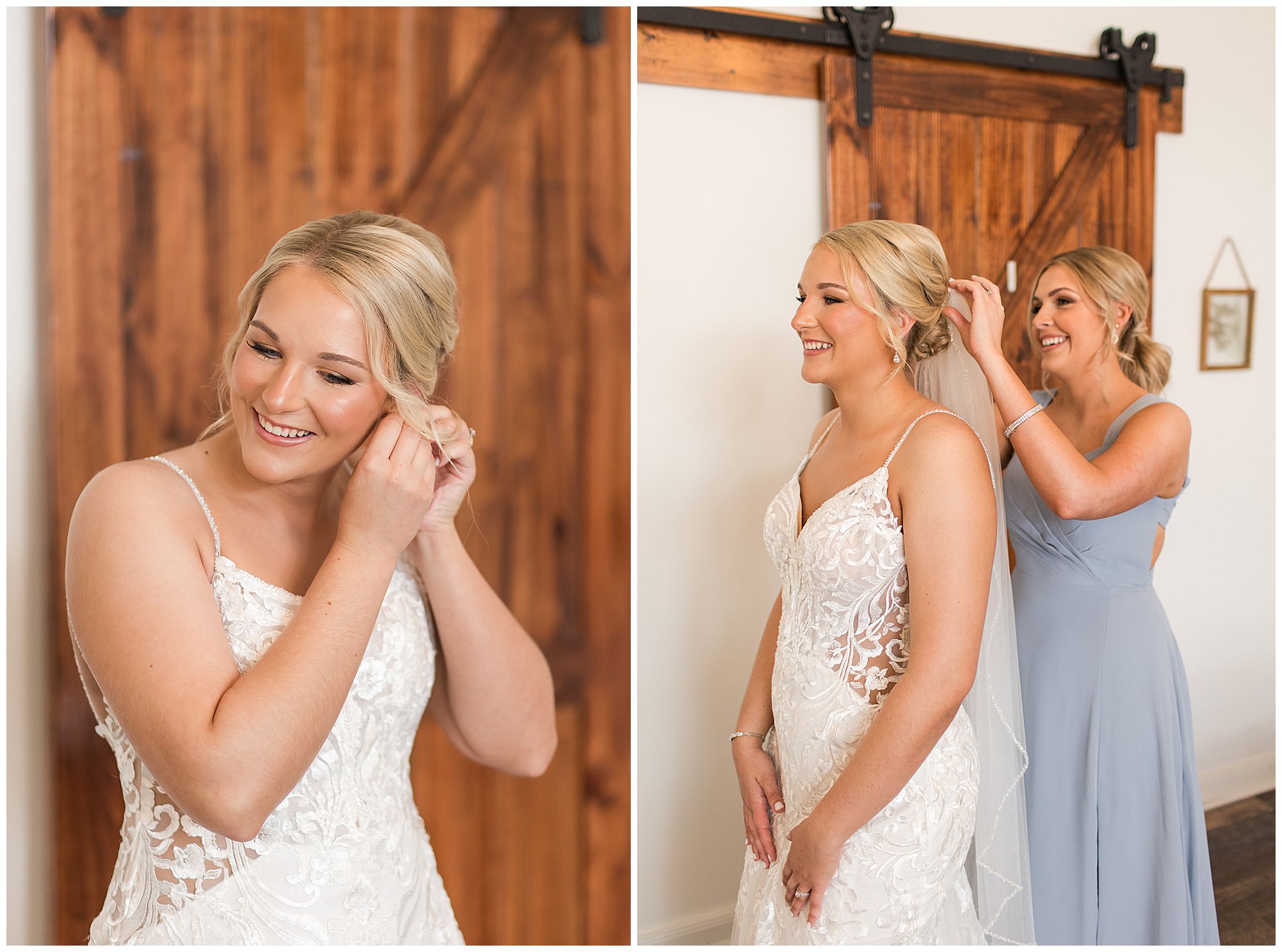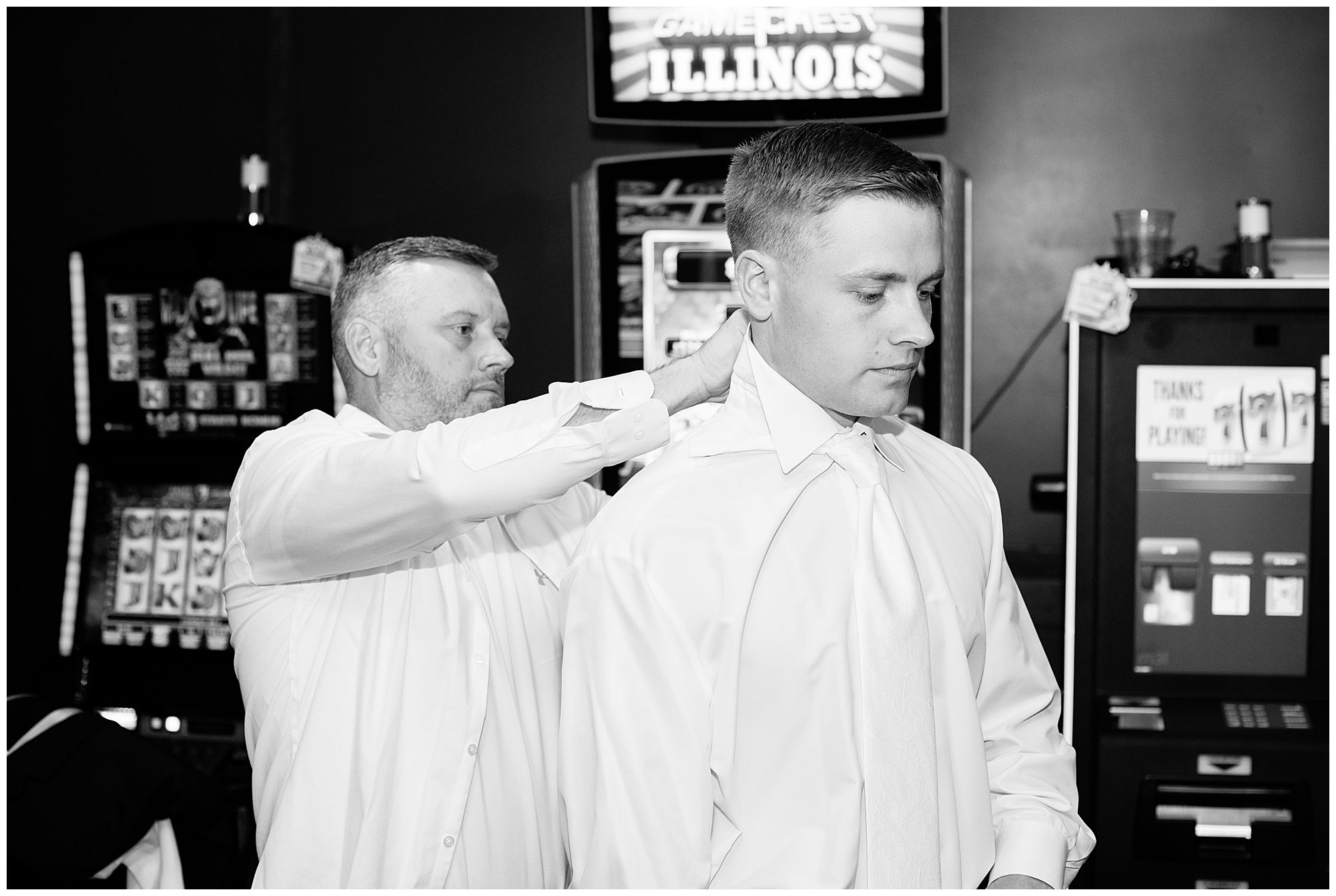McKenna and her ladies were relaxed and in high spirits at the salon where they were getting hair and makeup done the morning of the big day. They were ahead of schedule, which made everyone happy, including myself, bringing any type of stress level way down. McKenna was laid back and enjoying her time with her bridesmaids along with her mom and Drew’s mom. When it came time for McKenna to step into her gown she was an absolute vision! Her lace dress fit her perfectly and she was simply stunning by every sense of the word! Across the street in the little town of Nokomis, Drew and his guys were hanging out at a local bar, playing games, and enjoying one another’s company on this special day. Drew couldn’t let his bride outshine him too much and cleaned up pretty well in his navy suit and white tie. Now that these two are looking incredible, let’s get them to the church!