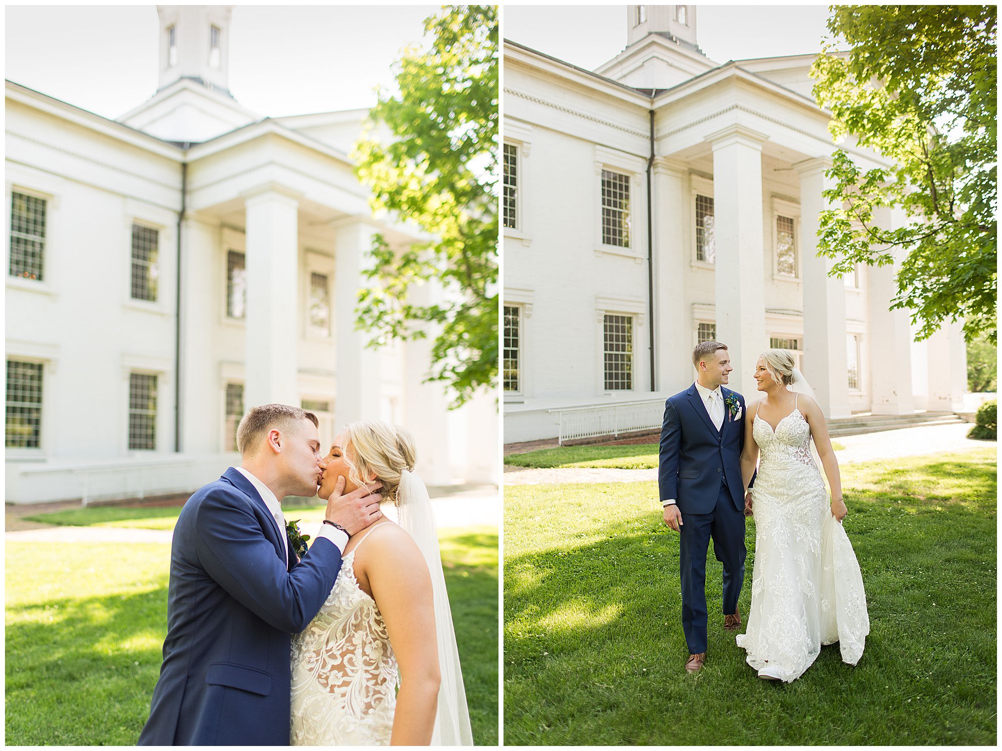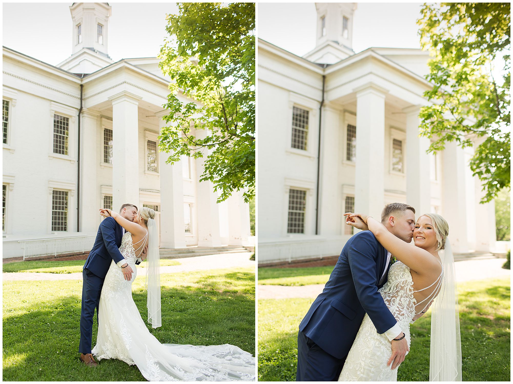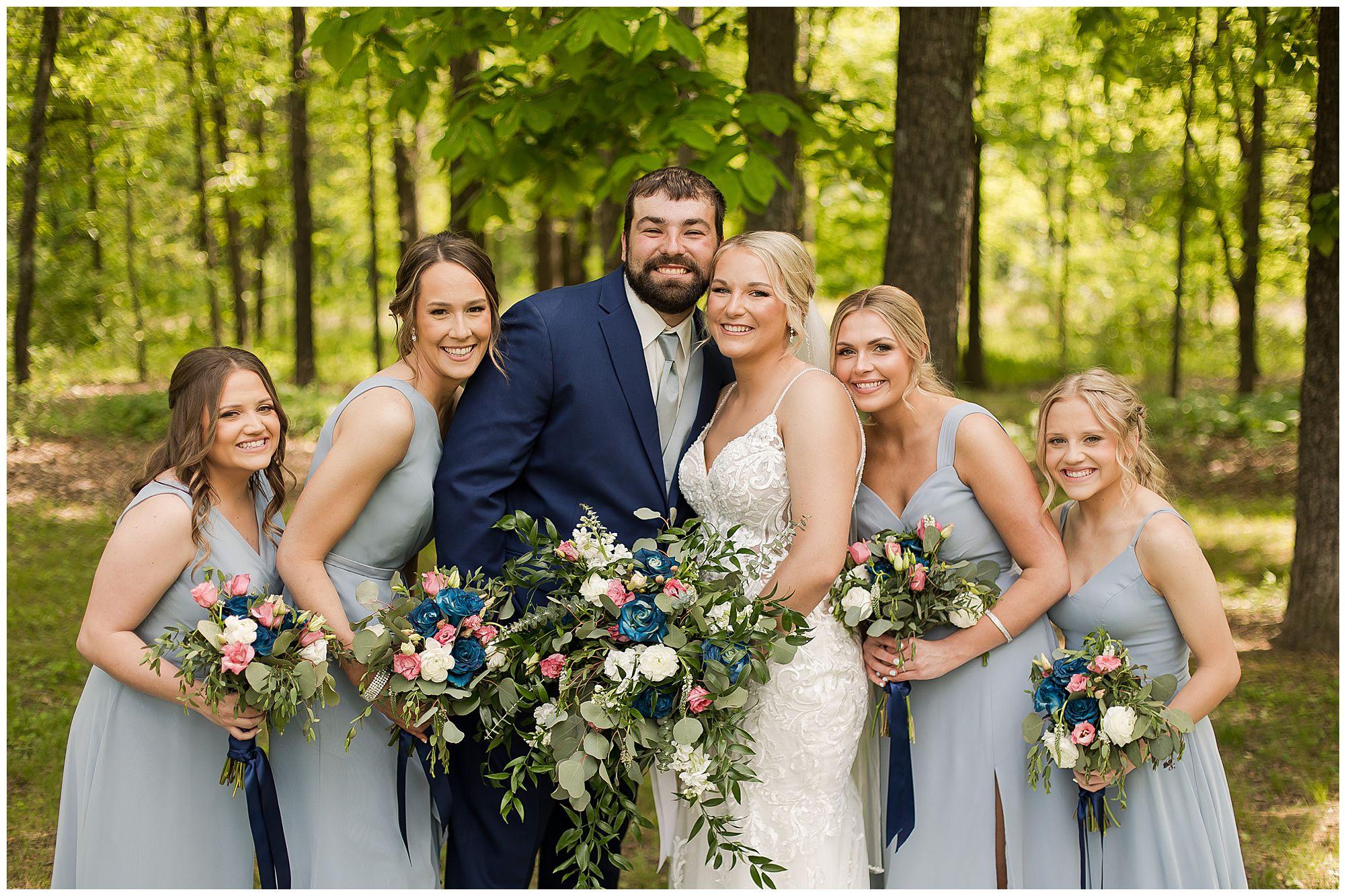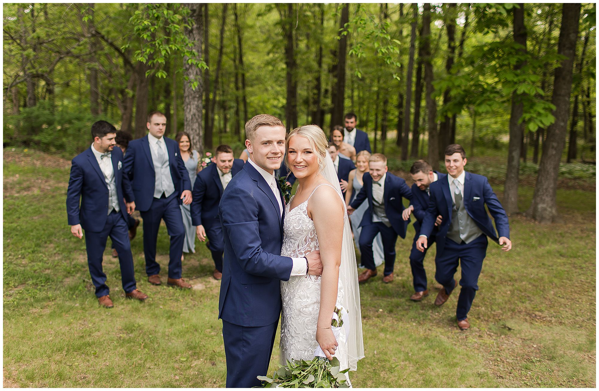 Following the ceremony, the bridal party headed to Ramsey Lake State Park, which was in between Nokomis and Vandalia (where the reception was held). This lovely park was also meaningful to McKenna and Drew as this was where he popped the question! We had a blast with their energetic bridal party with the girls in their dusty shade of blue and the gentlemen in their navy. There was so much laughter and love shared throughout this group filled with siblings and friends. Then getting the opportunity to spend more time with the newlyweds was just a joy! McKenna and Drew are easy going and adore being in one another’s company. We had some extra time, so before heading to the reception hall we took a quick stop at the Vandalia Municipal Courthouse to grab a few more photos of The Watsons! What a statement these made with the large columns and the happy couple making their way around the grounds! Absolutely incredible!