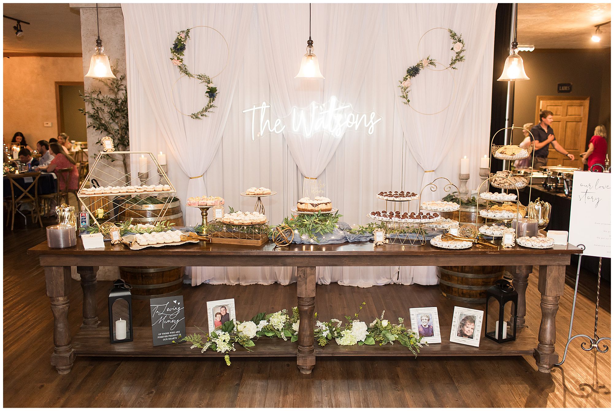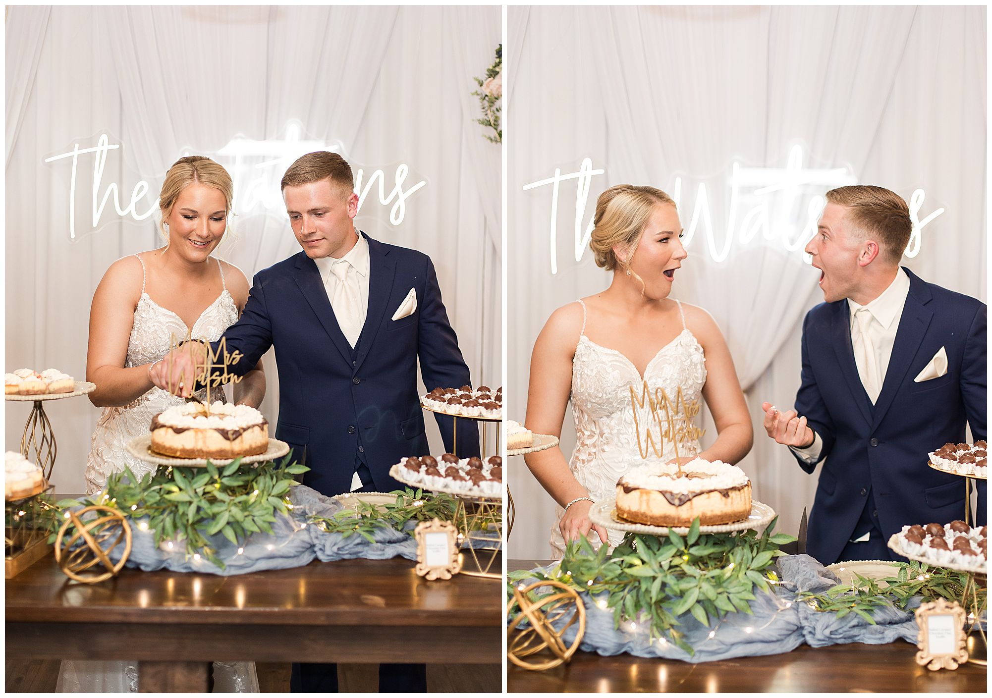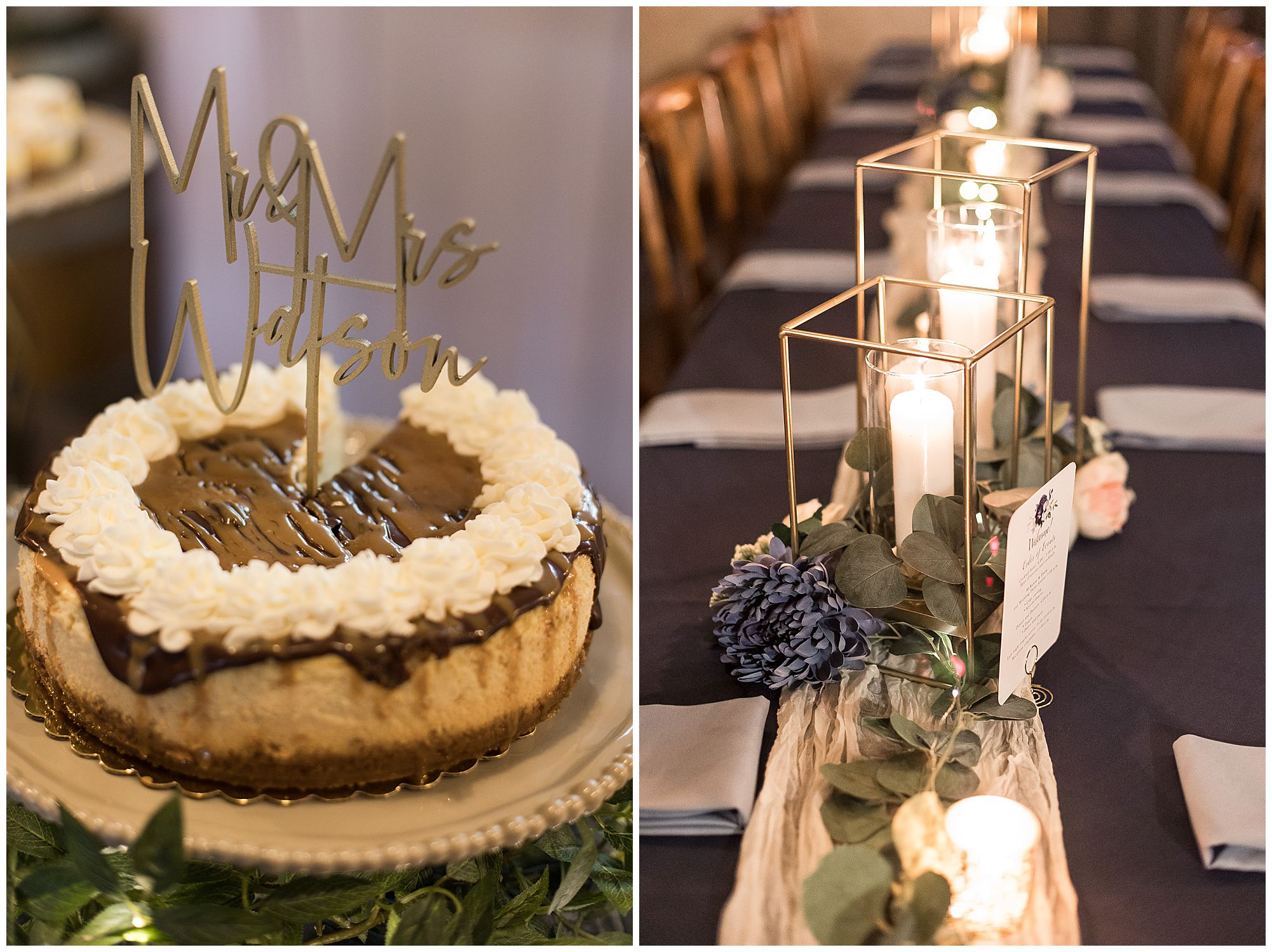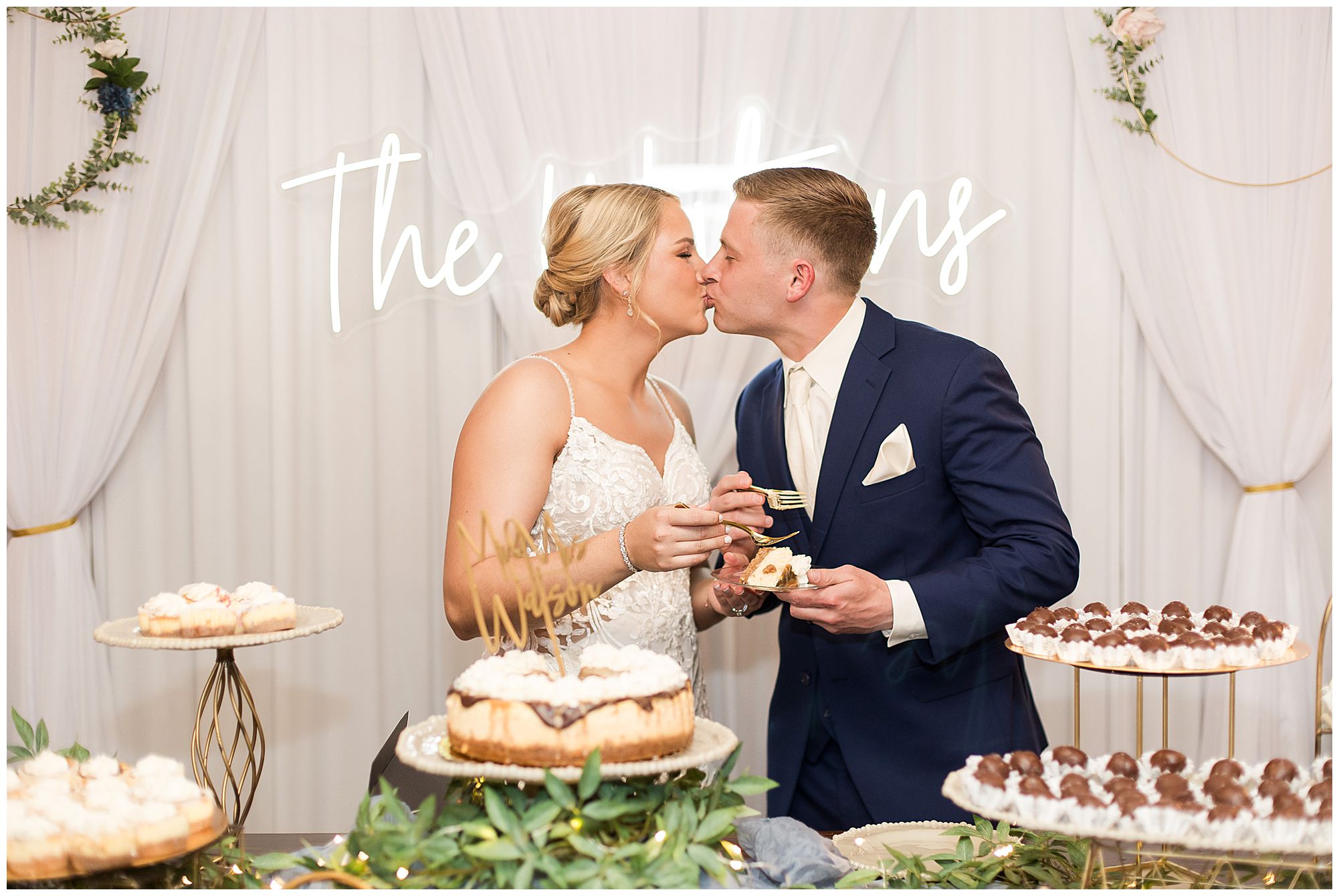 McKenna and Drew’s reception was gorgeous at 8th Day Venue with lovely touches of rustic, gold glam, and of course so much fun! They shared delightful dances as Mr. & Mrs. as well as McKenna with her father and Drew with his mother. McKenna and her mom even busted out a fun line dance and invited bridesmaids and guests to join! How amazing! And can I just tell you about their sweet table?! McKenna and Drew didn’t just cut the cake…The cut a cheesecake! And their sweet table was filled with truffles, cookies, and mini cheesecakes! I’m mean, delicious!!! I may have snuck a few home with me! We tried to sneak McKenna and Drew outside for any type of sunset photos before the impending storm (that luckily stayed at bay all day for us) rolled into town. Unfortunately, by the time they finished dinner and we went to walk out the front door, the winds kicked up and for safety we called it off! Yet, the dance floor was filled all evening and the party was on in celebration for this awesome couple! So can’t be mad at that! I’m so honored I not only could be a part of celebrating the marriage of McKenna and Drew once, but twice on their one year anniversary! I’m wishing them many more years of blessings! Cheers to The Watsons!