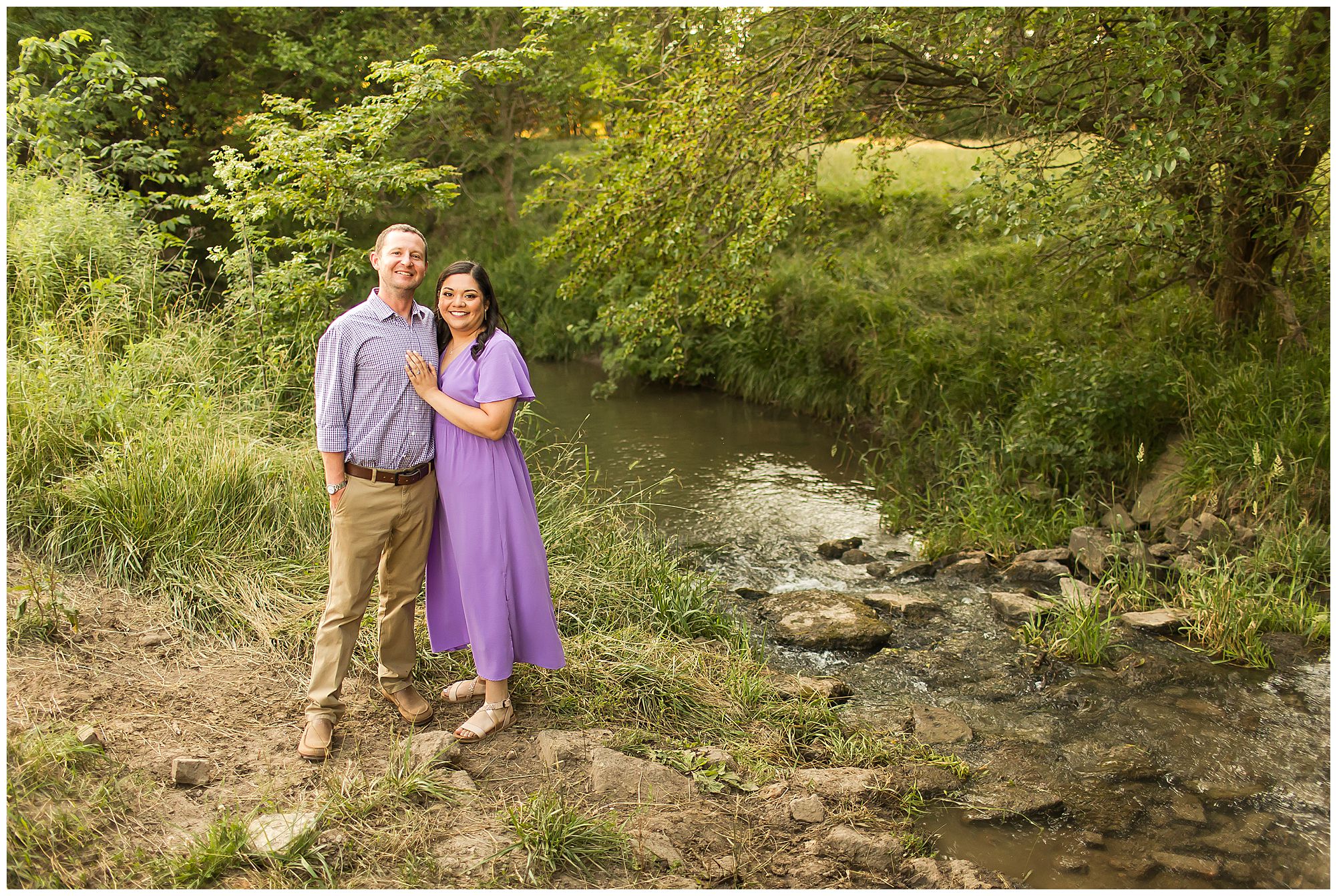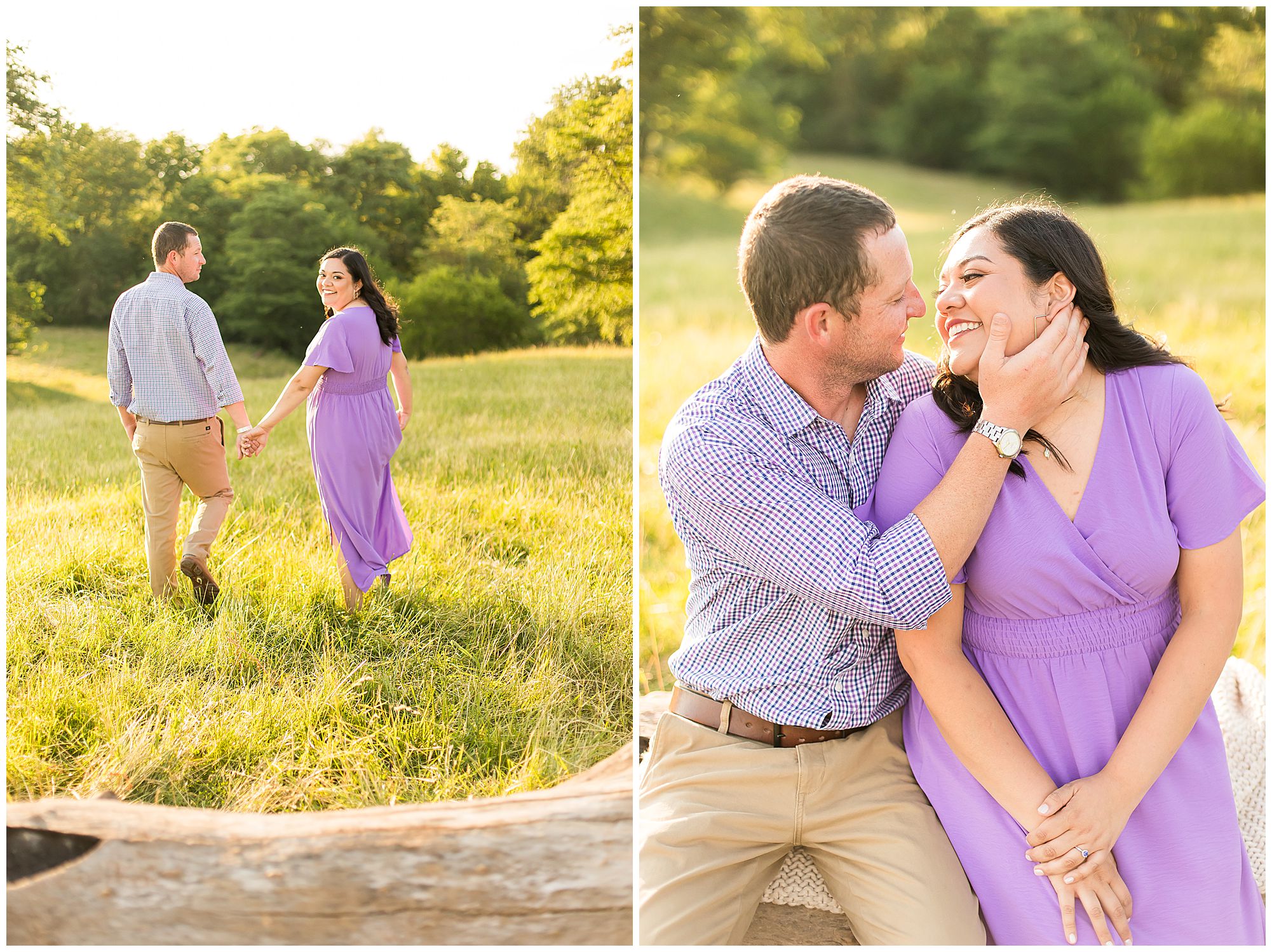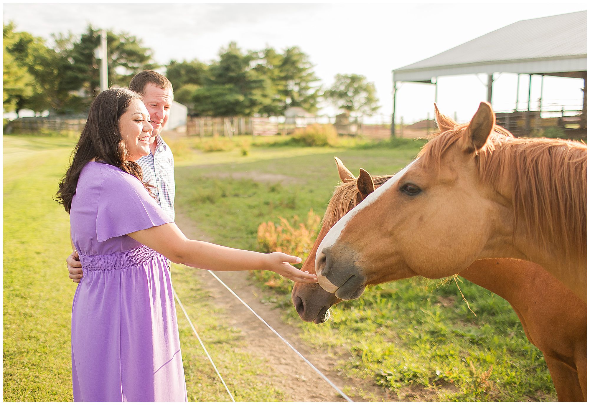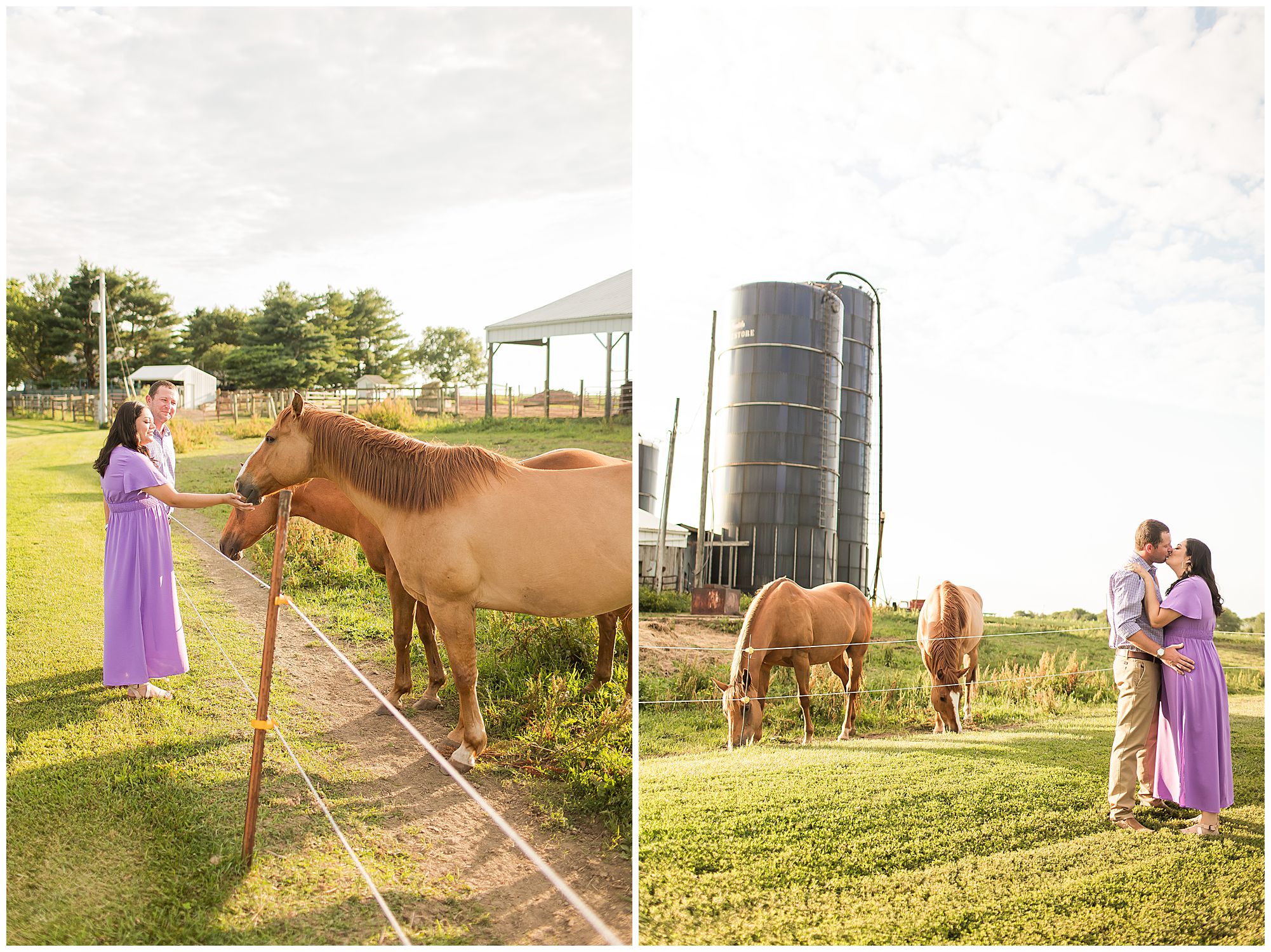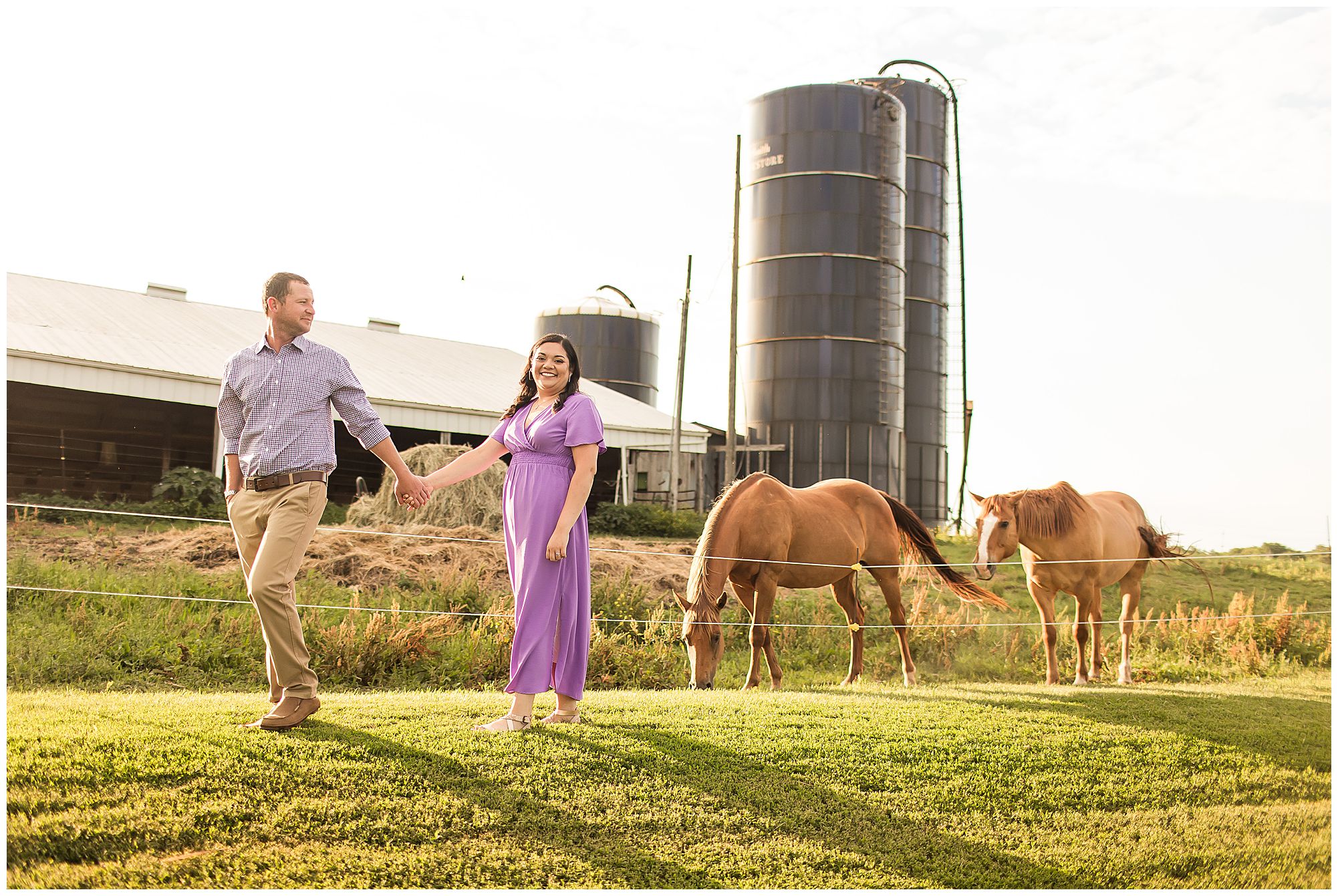 I had the pleasure of meeting Carmen and Casey out at her family’s farm in Ashland, Illinois on a gorgeous summer evening for their engagement photos. There was absolutely no question when we began talking about their photos where they would be taken. This farm holds a special place in both of their hearts, but especially for Carmen as it’s where she grew up. But, since she and Casey have begun their relationship, she has shared the property with him and he has learned all the magical spots throughout this beautiful farm. We started by the pond with the horse barn in the background and quickly the two beloved horses became part of the photoshoot. We then jumped into the side by side to head further out to a lovely spot with a fallen tree where the sun was perfectly coming through the trees. Carmen and Casey’s purple outfits were popping off the background and looking amazing. It was the perfect choice for the abundance of green surrounding them. We took one more ride down to another one of their favorite spots, which was a little creek with water serenely running through the cow pasture. Casey even commented how he wished I did video to capture how calming the sound of the creek was! I agreed, it was stunning!