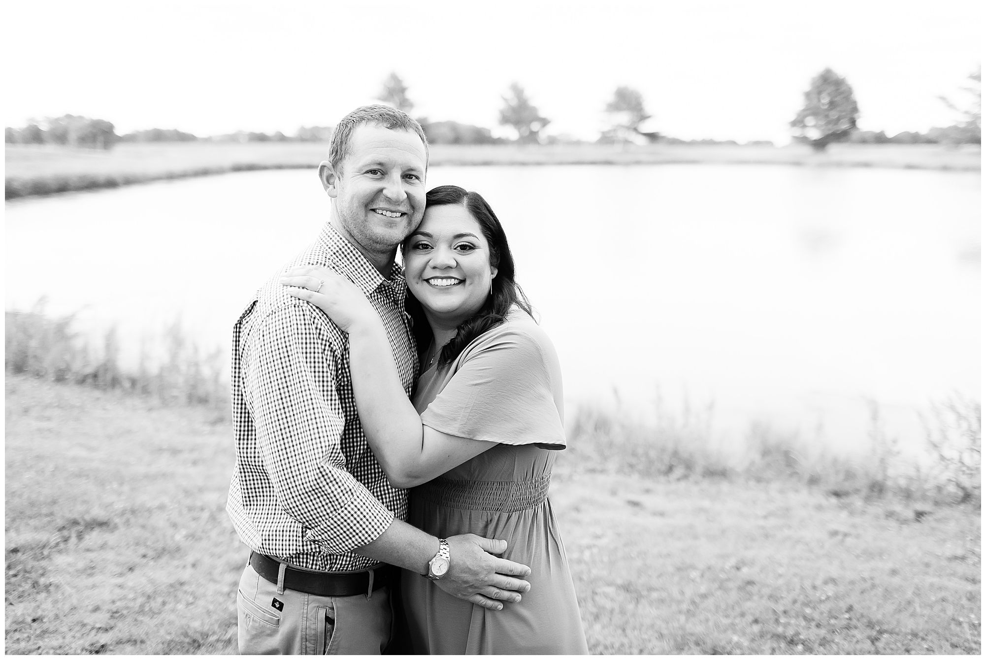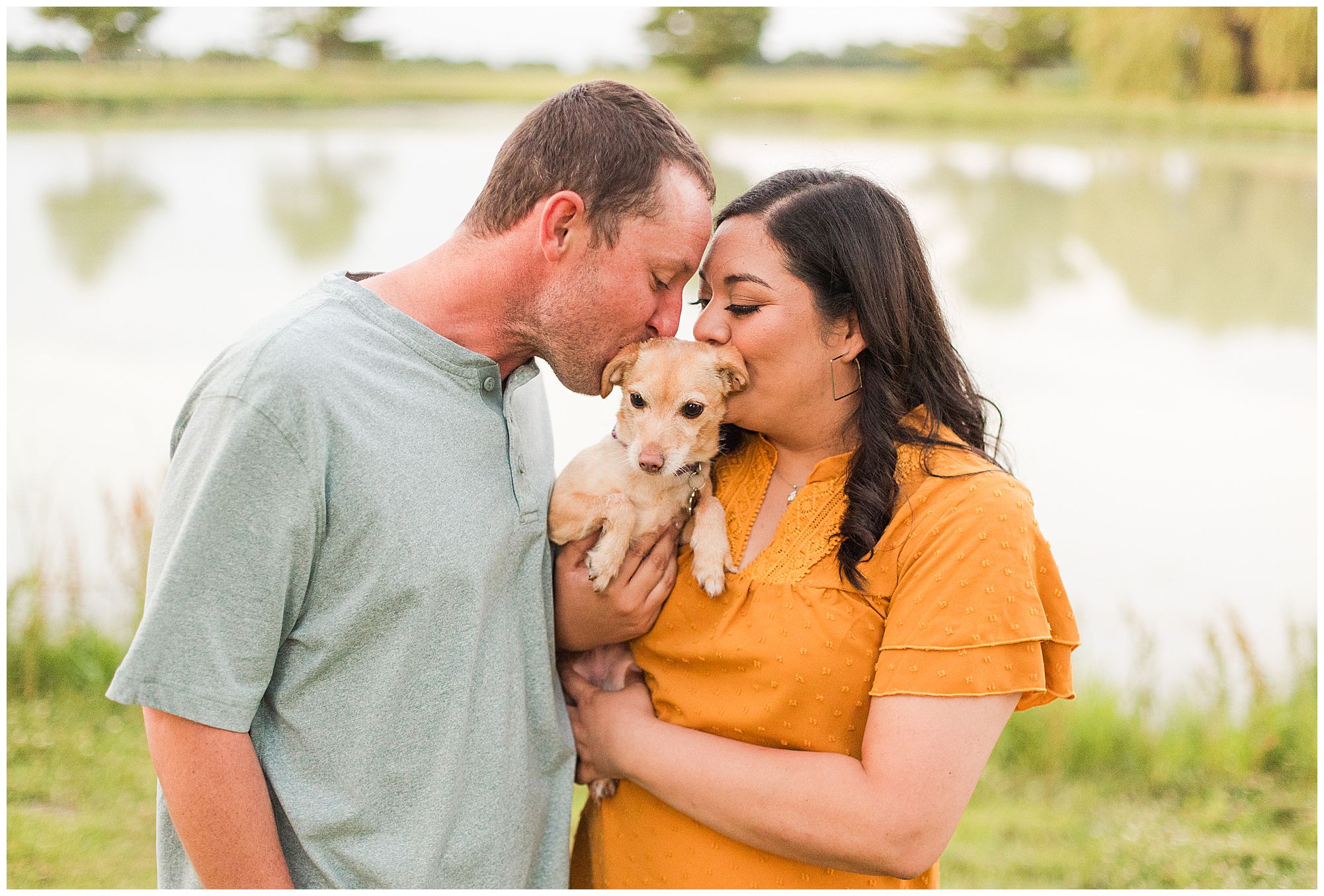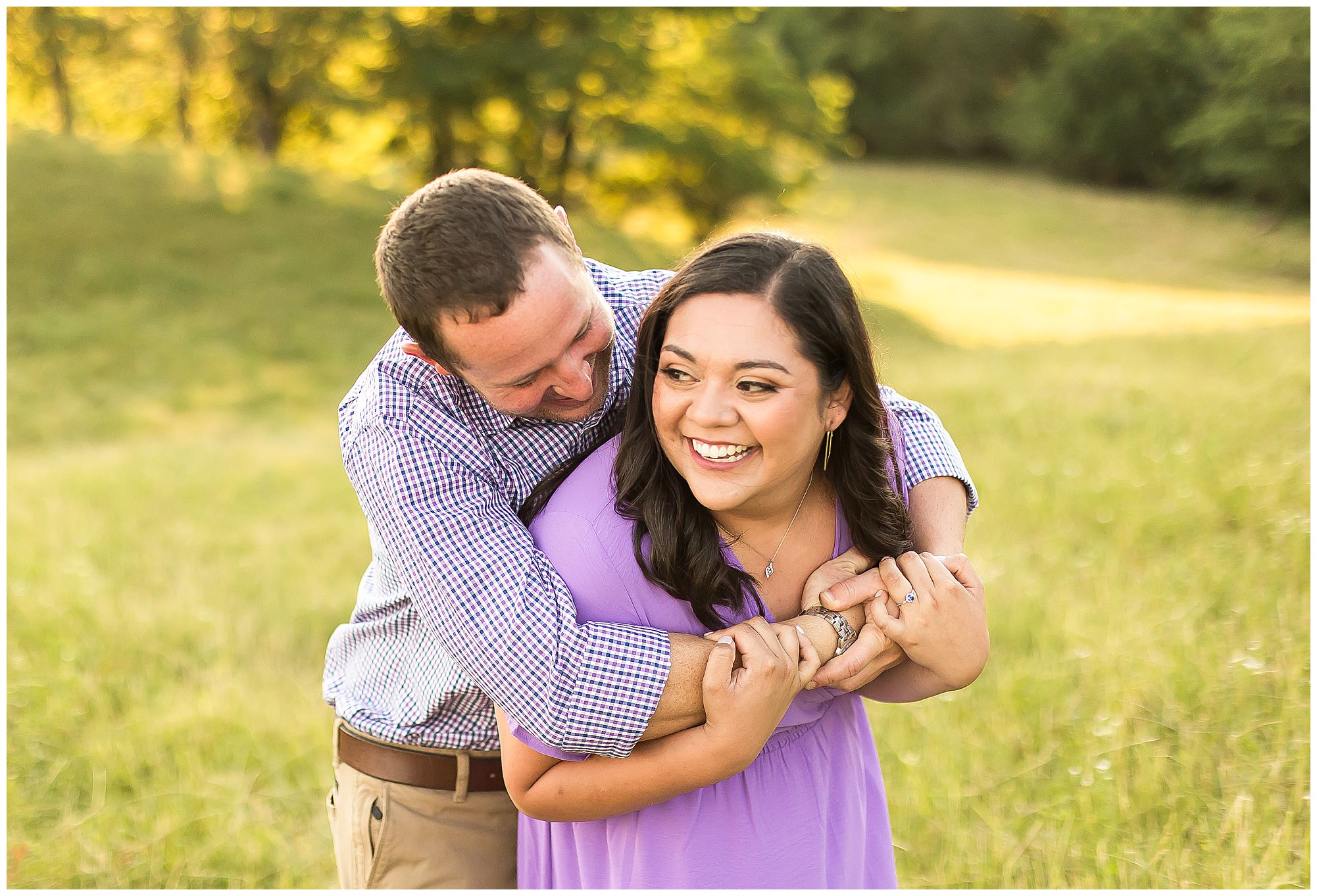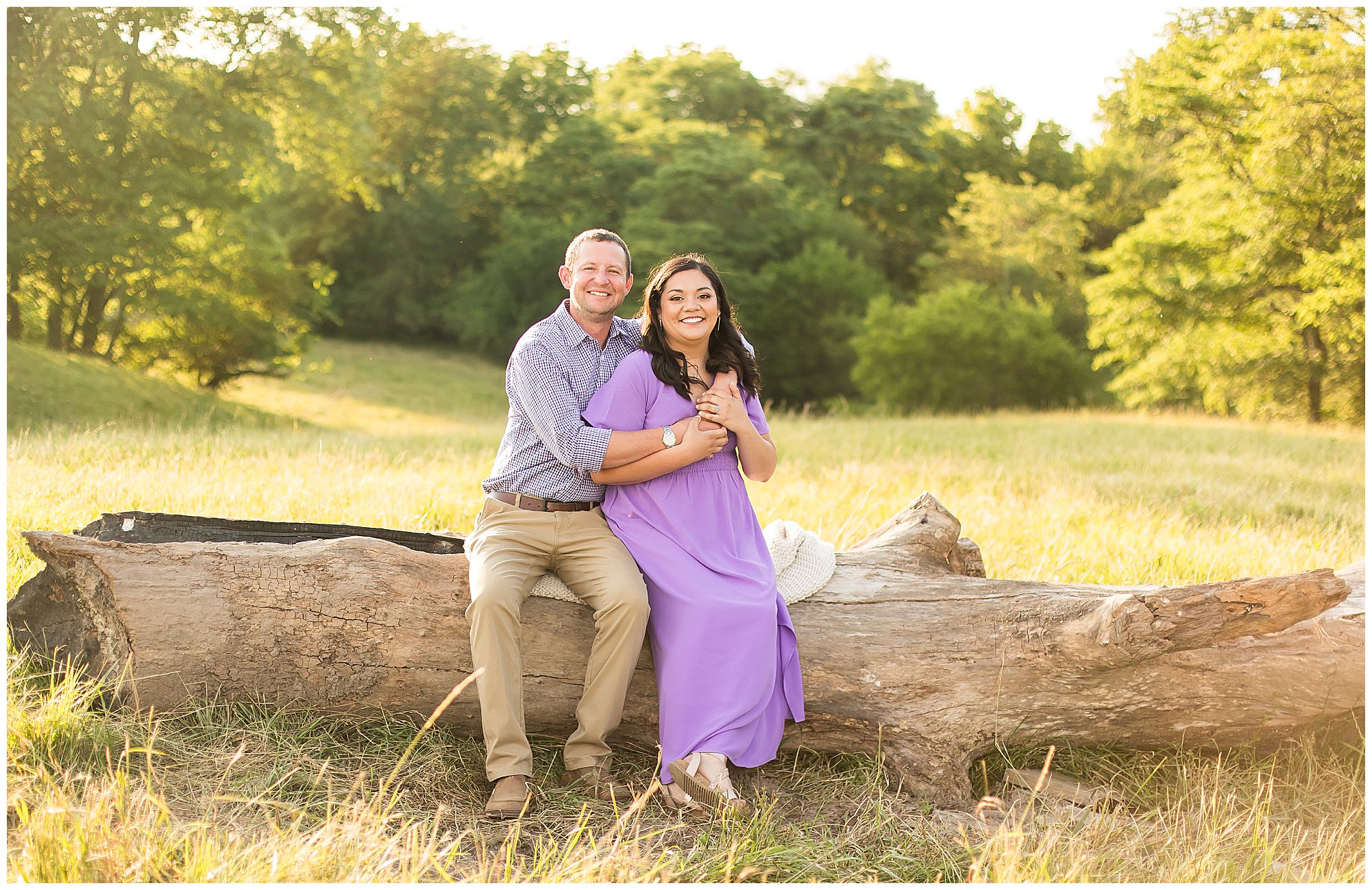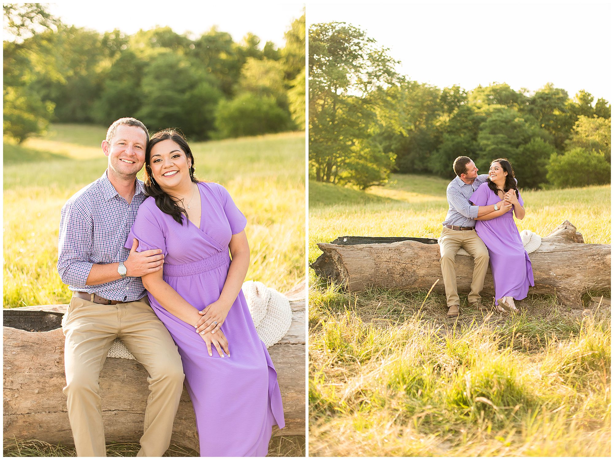 I had the pleasure of meeting Carmen and Casey out at her family’s farm in Ashland, Illinois on a gorgeous summer evening for their engagement photos. There was absolutely no question when we began talking about their photos where they would be taken. This farm holds a special place in both of their hearts, but especially for Carmen as it’s where she grew up. But, since she and Casey have begun their relationship, she has shared the property with him and he has learned all the magical spots throughout this beautiful farm. We started by the pond with the horse barn in the background and quickly the two beloved horses became part of the photoshoot. We then jumped into the side by side to head further out to a lovely spot with a fallen tree where the sun was perfectly coming through the trees. Carmen and Casey’s purple outfits were popping off the background and looking amazing. It was the perfect choice for the abundance of green surrounding them. We took one more ride down to another one of their favorite spots, which was a little creek with water serenely running through the cow pasture. Casey even commented how he wished I did video to capture how calming the sound of the creek was! I agreed, it was stunning!
