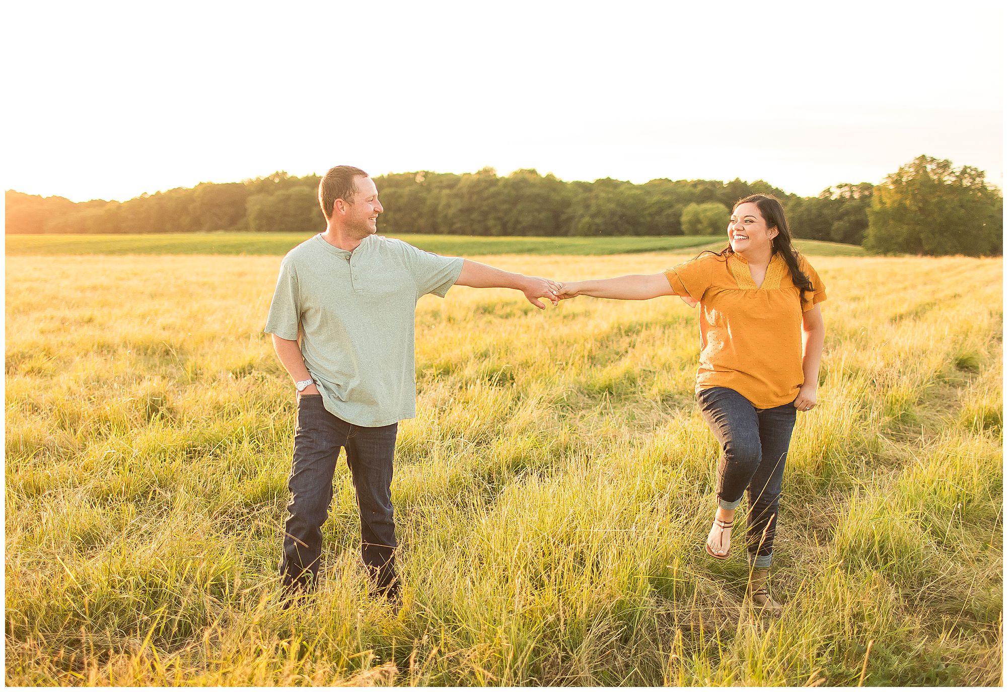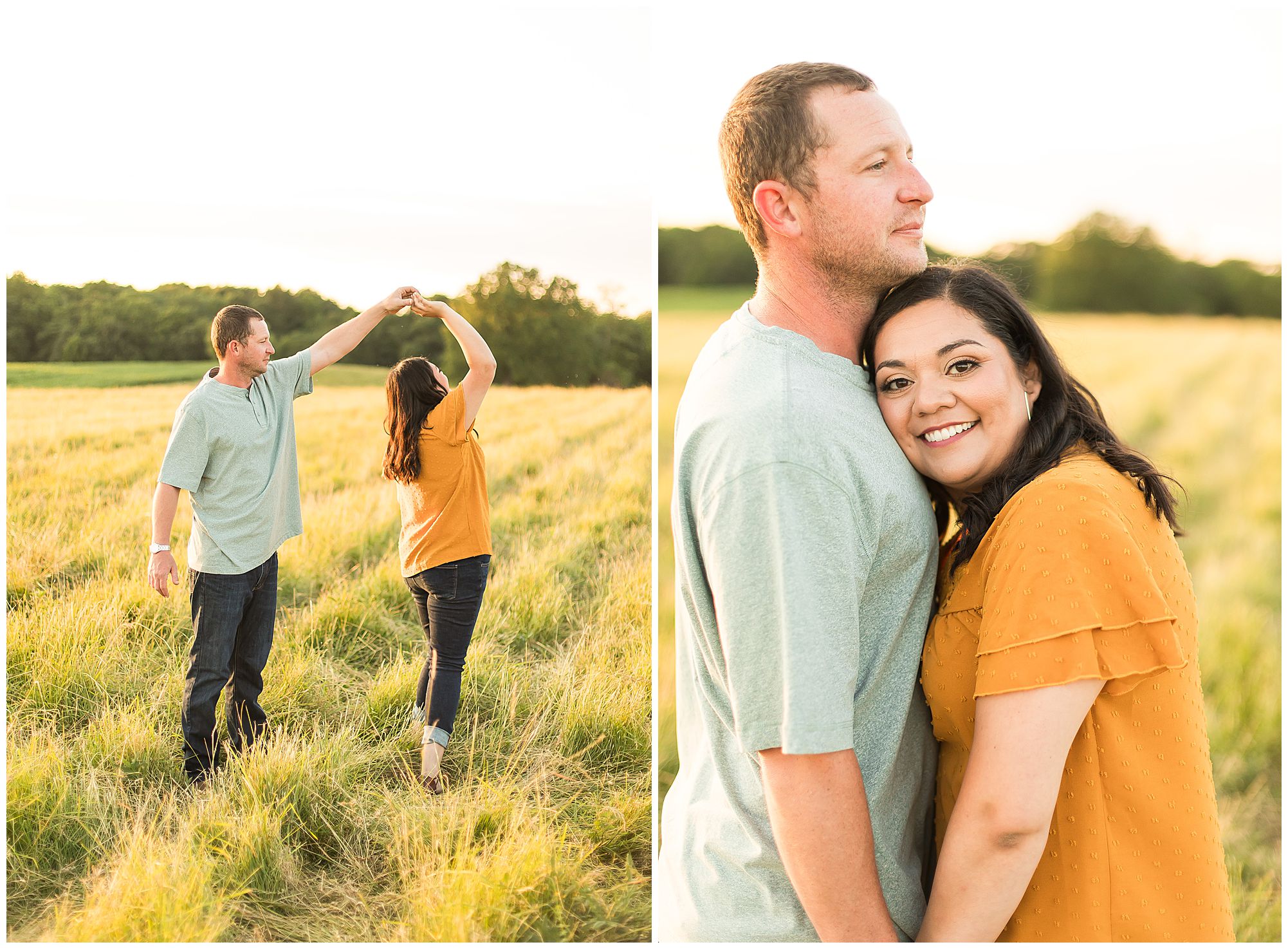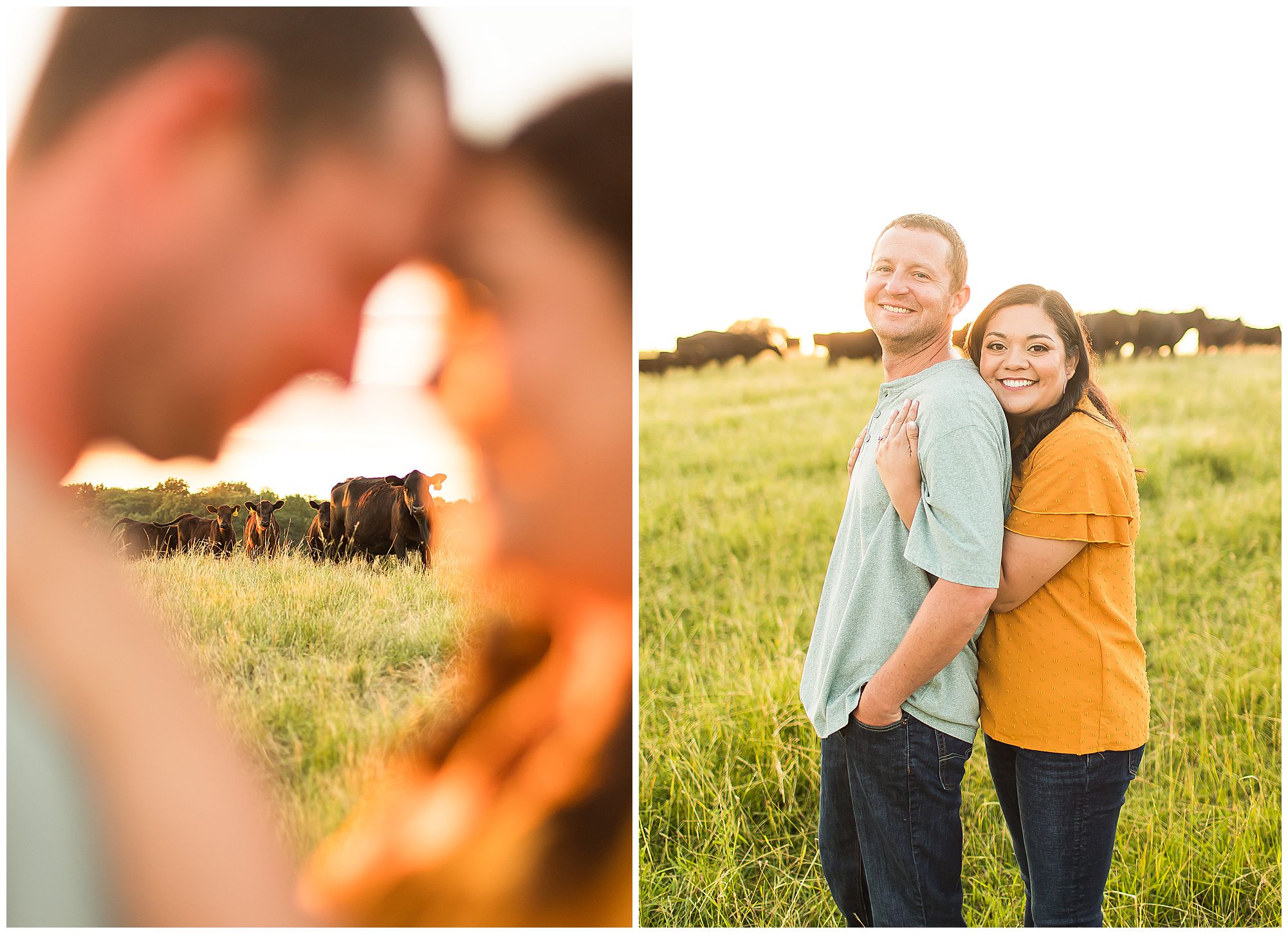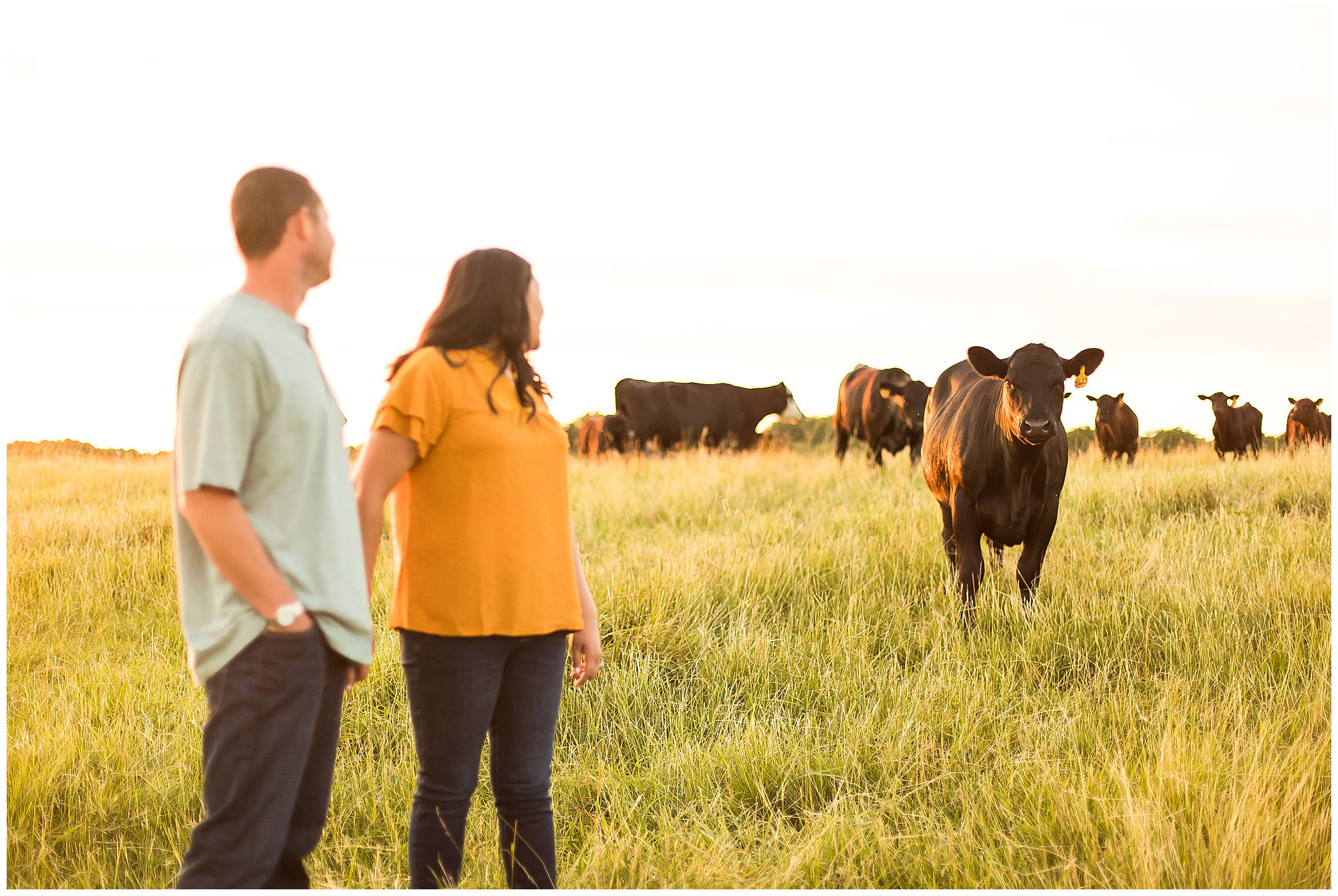 This cute duo did a quick change and we headed over to another wonderful pasture just in time for sunset! The one thing I loved about Carmen and Casey was the amount of laughter they shared the entire time we took photos! They had a blast simply being in one another’s arms, which made my job so incredibly easy! There is no better way to show off a couple who loves to laugh with each other than with a ton of movement. So that’s what we did towards the end of their session especially. But, before the sun dropped below the horizon, we had a few extra visitors grace us with their presence. The herd of cows came by for their close ups and even though they wouldn’t let us get too close allowed a few photo ops as the sun set. Carmen and Casey finished up with a few twirls and dips, as any engagement session should end, and to say I was thrilled with my time with them would be an understatement! I cannot wait to be part of their day next spring!