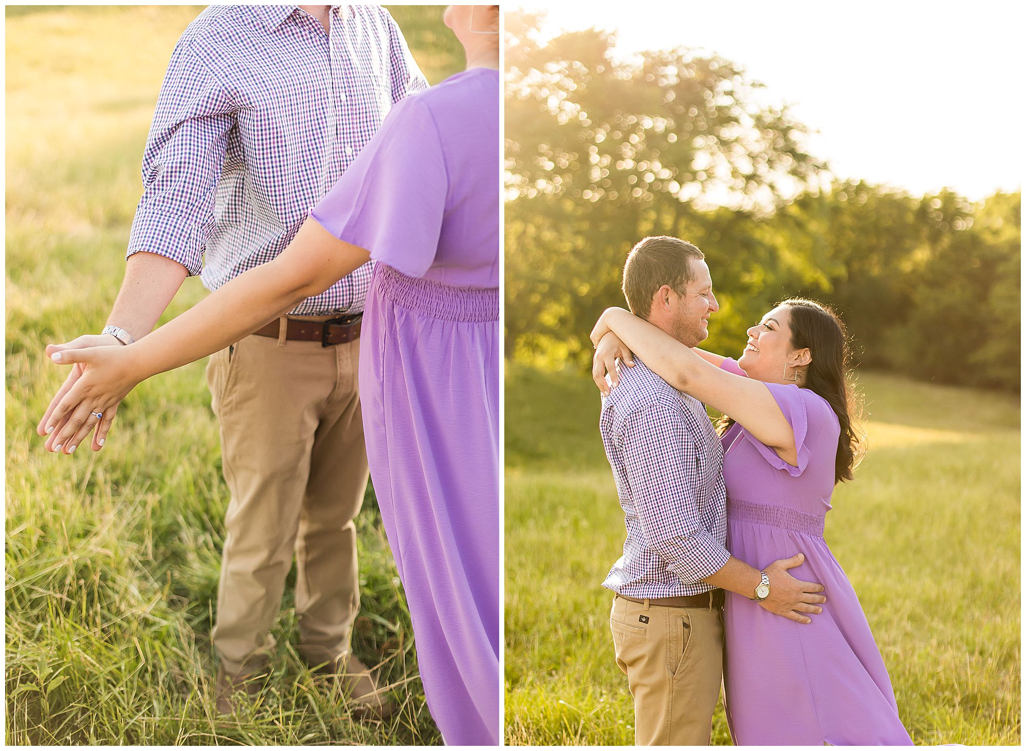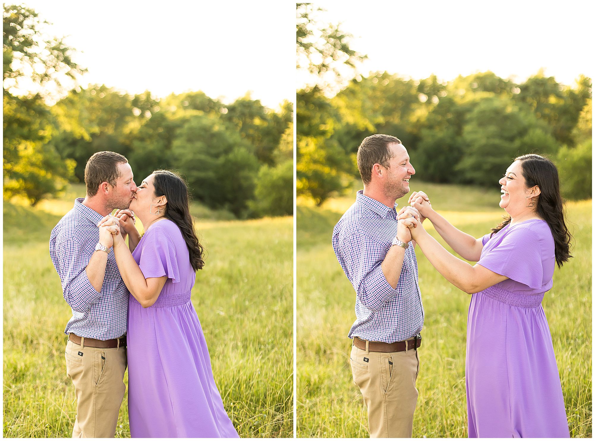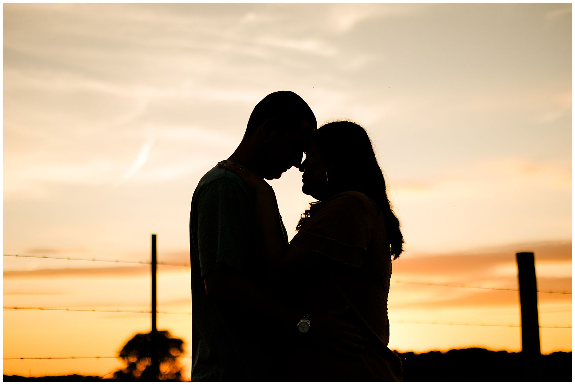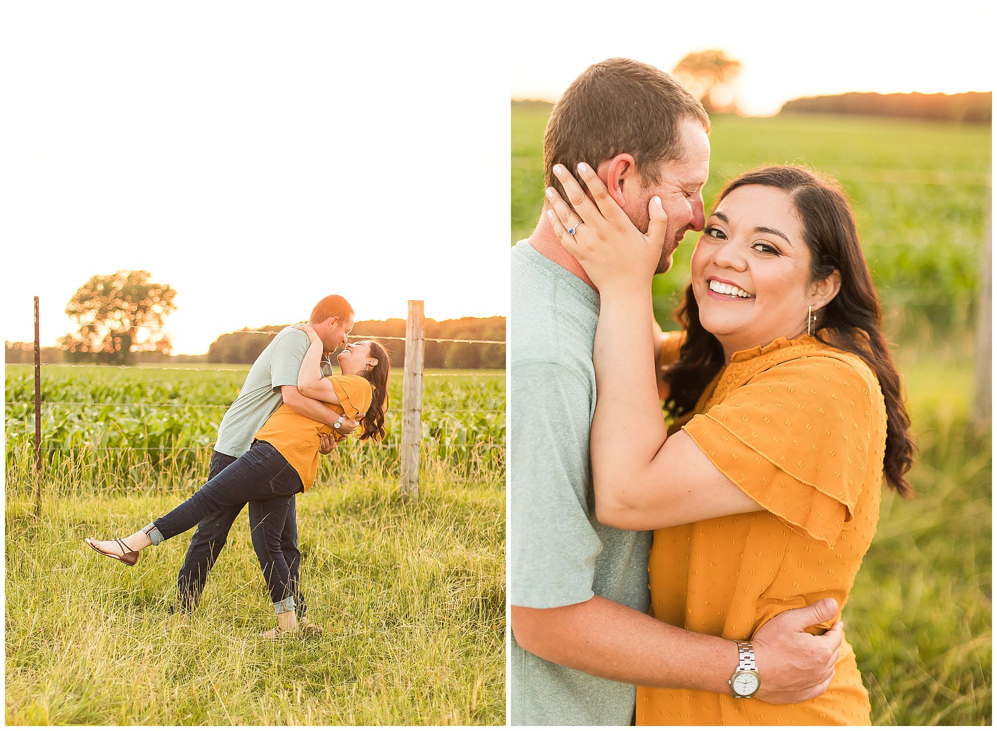 This cute duo did a quick change and we headed over to another wonderful pasture just in time for sunset! The one thing I loved about Carmen and Casey was the amount of laughter they shared the entire time we took photos! They had a blast simply being in one another’s arms, which made my job so incredibly easy! There is no better way to show off a couple who loves to laugh with each other than with a ton of movement. So that’s what we did towards the end of their session especially. But, before the sun dropped below the horizon, we had a few extra visitors grace us with their presence. The herd of cows came by for their close ups and even though they wouldn’t let us get too close allowed a few photo ops as the sun set. Carmen and Casey finished up with a few twirls and dips, as any engagement session should end, and to say I was thrilled with my time with them would be an understatement! I cannot wait to be part of their day next spring!