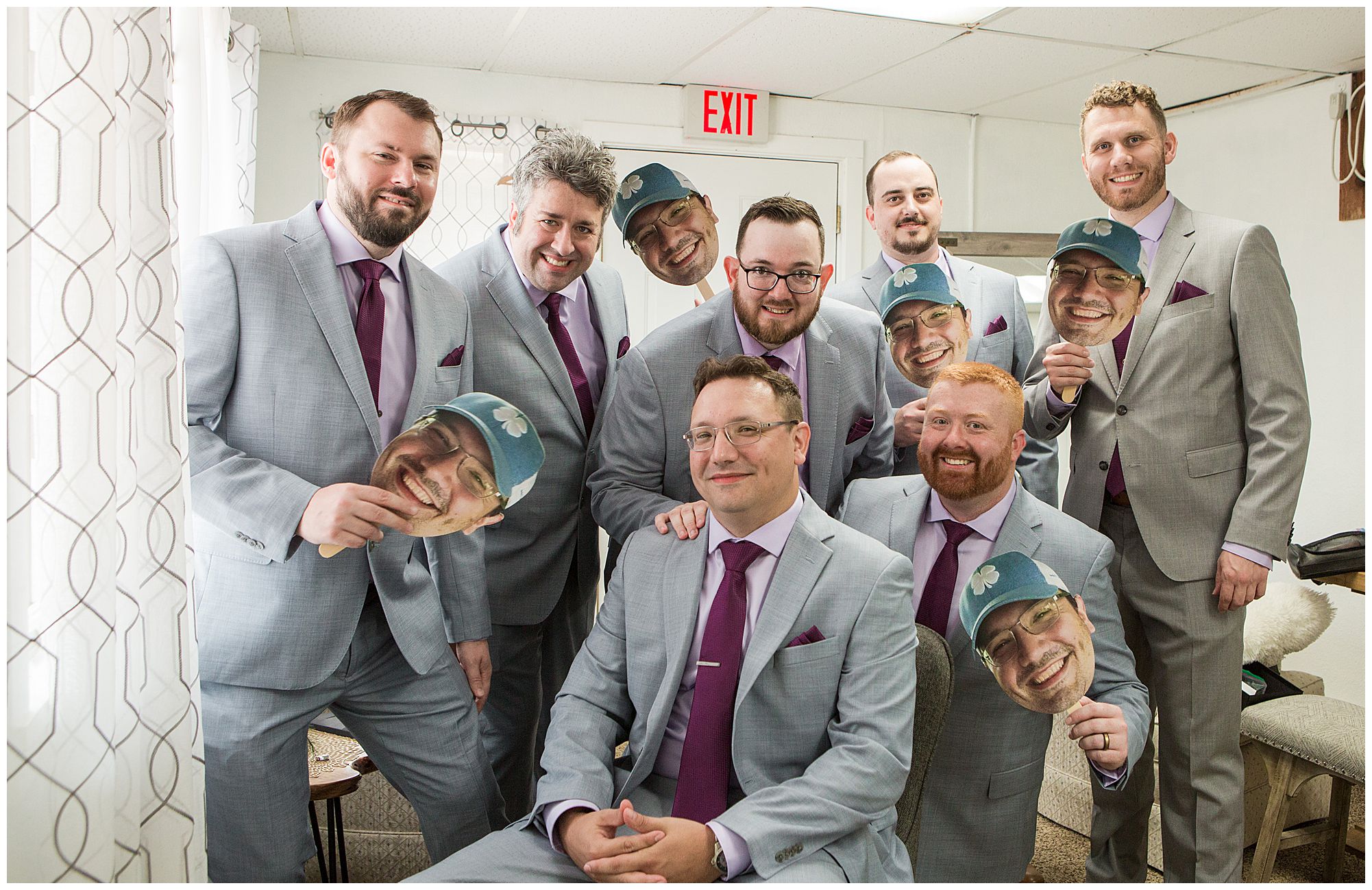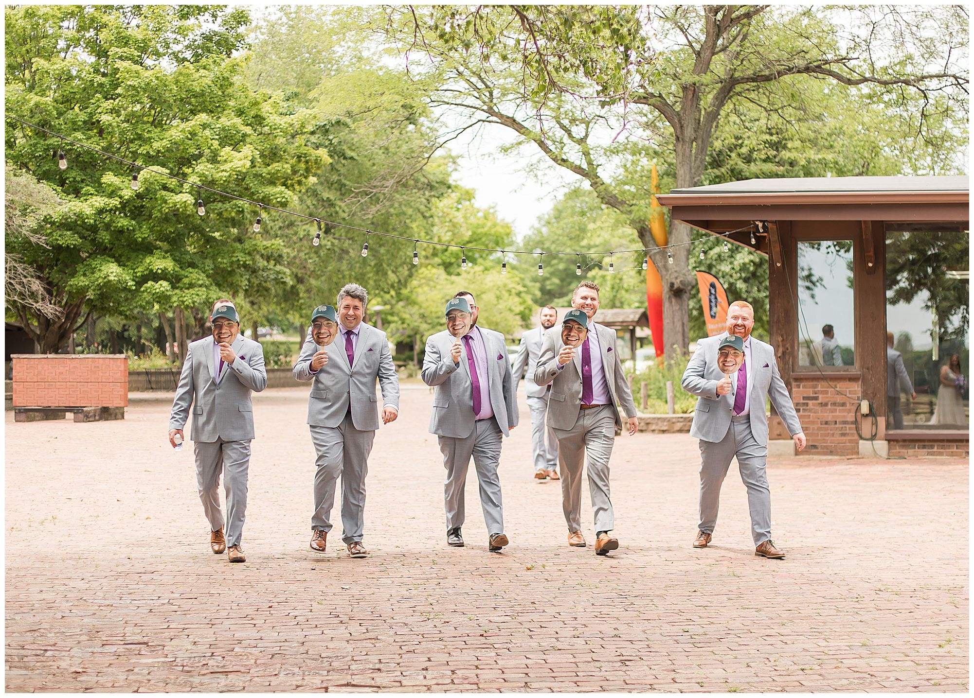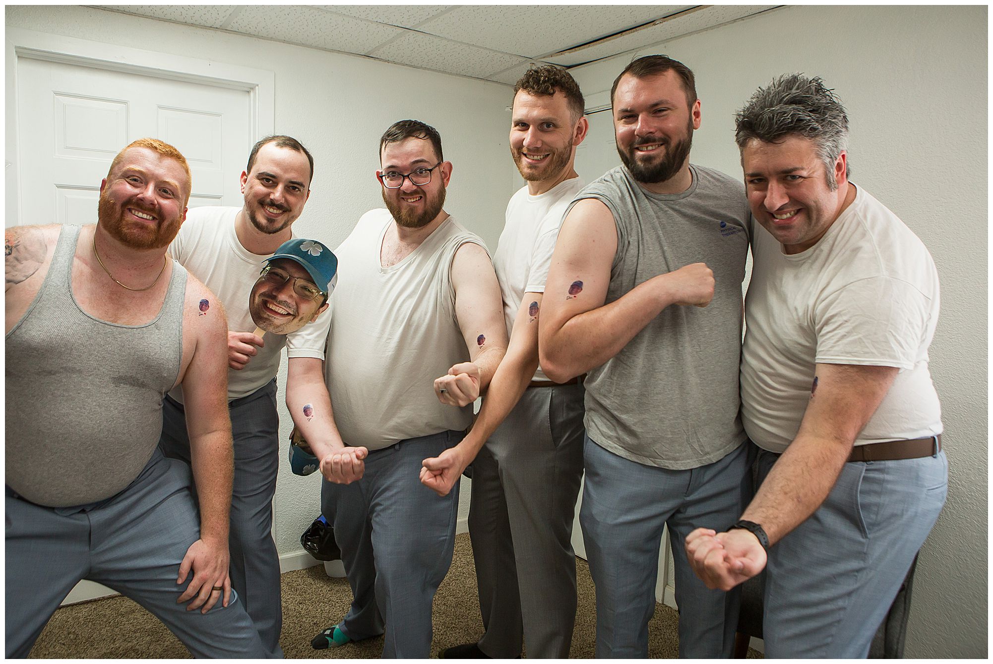 Hannah and her ladies were full of so much energy and excitement in the morning as they were getting hair and makeup done. They were reminiscing back on memories and their friendships. And while the girls were primping in one room at the park, Don and his groomsmen were literally in the room right next door prepping their game day fits! But, before the guys got in their suits they added one special detail which was very important…Temporary tattoos of Don’s face! These matched the “Fat Head Don’s” they brought to portraits later as a surprise, which was absolutely hilarious! This crew definitely kept me laughing all day! But, before we technically started bridal party photos, we had to let this bride and groom see each other first. They were both a little nervous, but so ready to see their best friend to help calm those nerves. Once Don turned to see Hannah you couldn’t have wiped the smile off his face if you tried. These two truly get so much joy in each other’s arms.