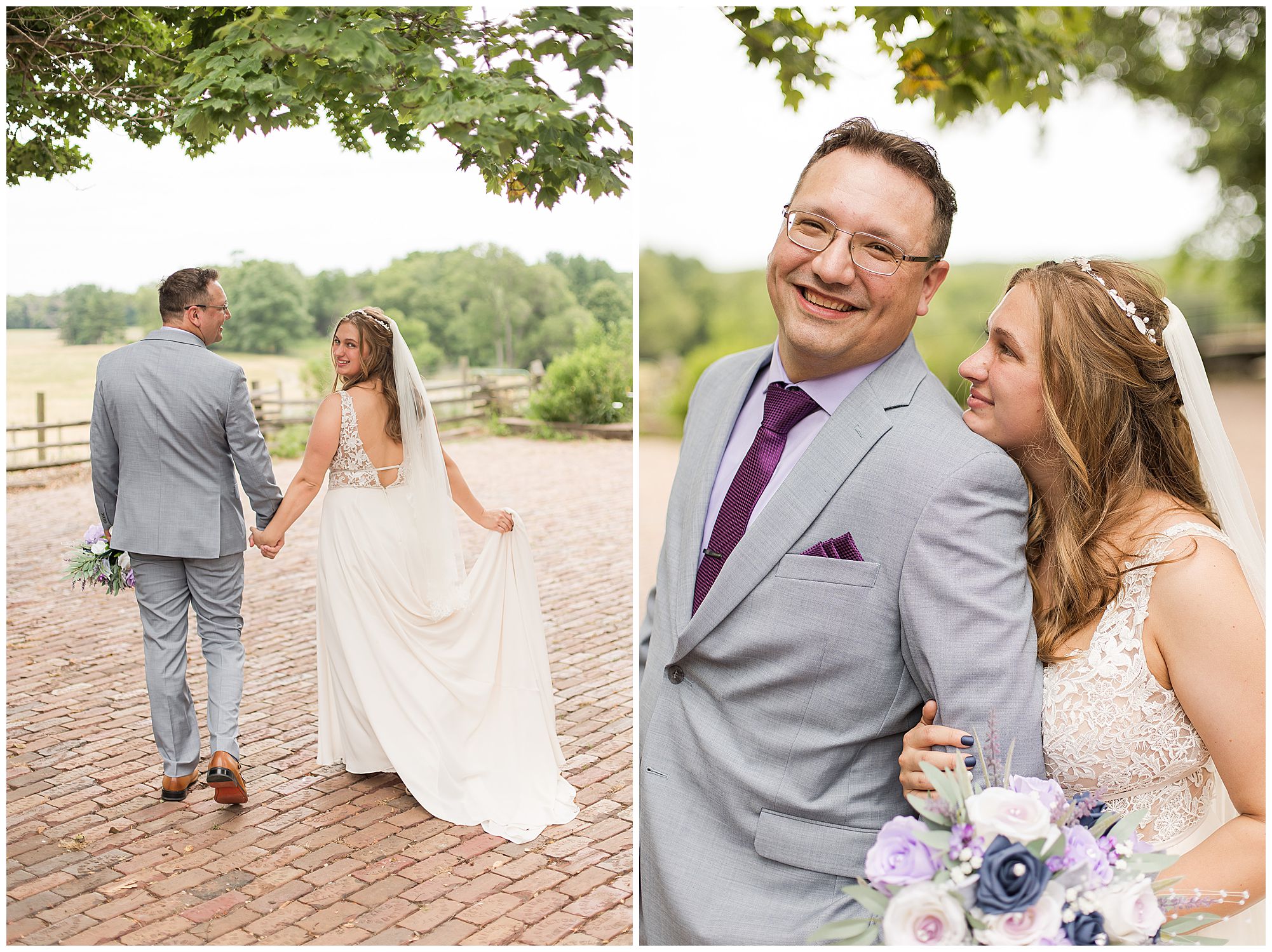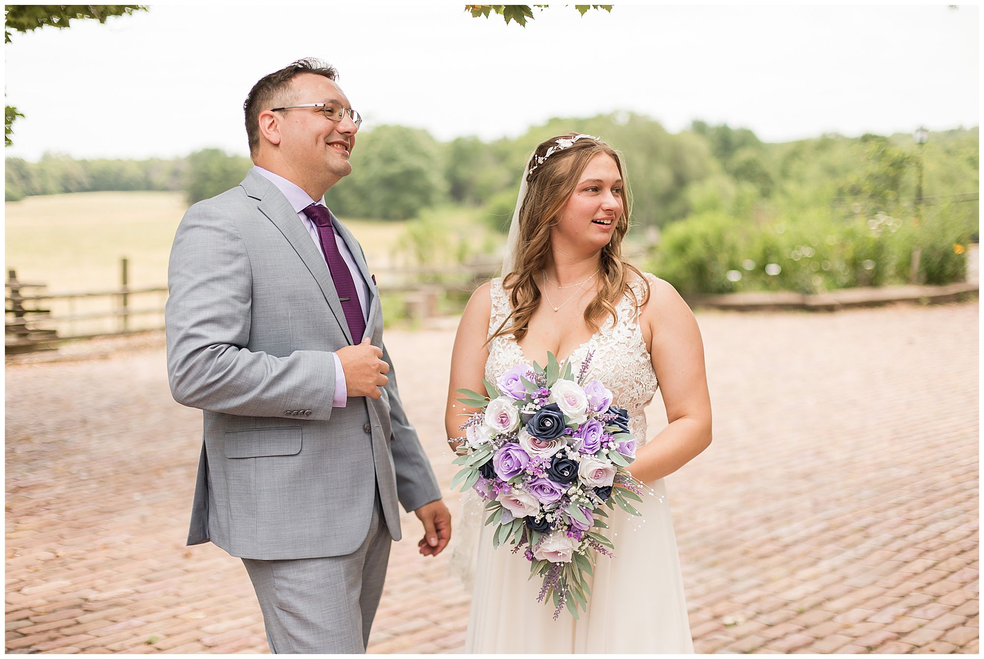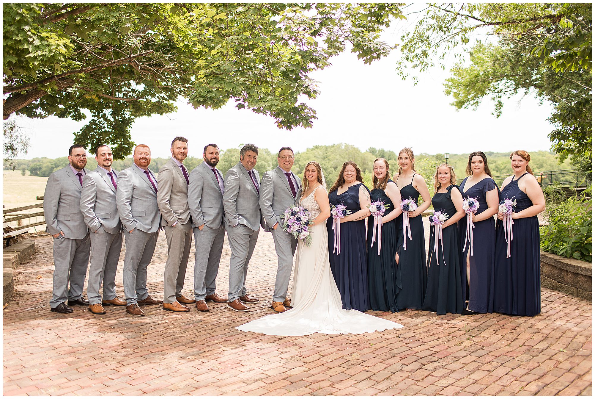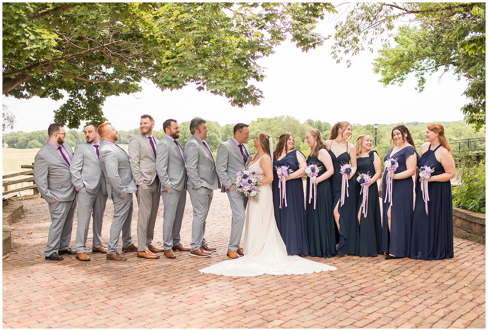 It was then time for bridal party photos with this awesome group of Hannah and Don’s family and friends! They were all polished with the ladies in different styles of navy dresses and the guys in gray suits and purple ties and matching pocket squares. The girls bouquets were delightful blooms of purples, whites, and navy. During this time, we all laughed so hard! Between the guys and their “Don Heads”, the girls giggling as they were side by side, and of course Hannah and Don having the time of their lives sharing such special moments they will never forget. They snuggled in close when it was their turn for their closeups. Though it was toasty outside, they embraced every second. They even took some time to check out the Bison roaming the grounds. But there is still one important thing we need to do…Let’s get these two married! For that, we have to head to the church!