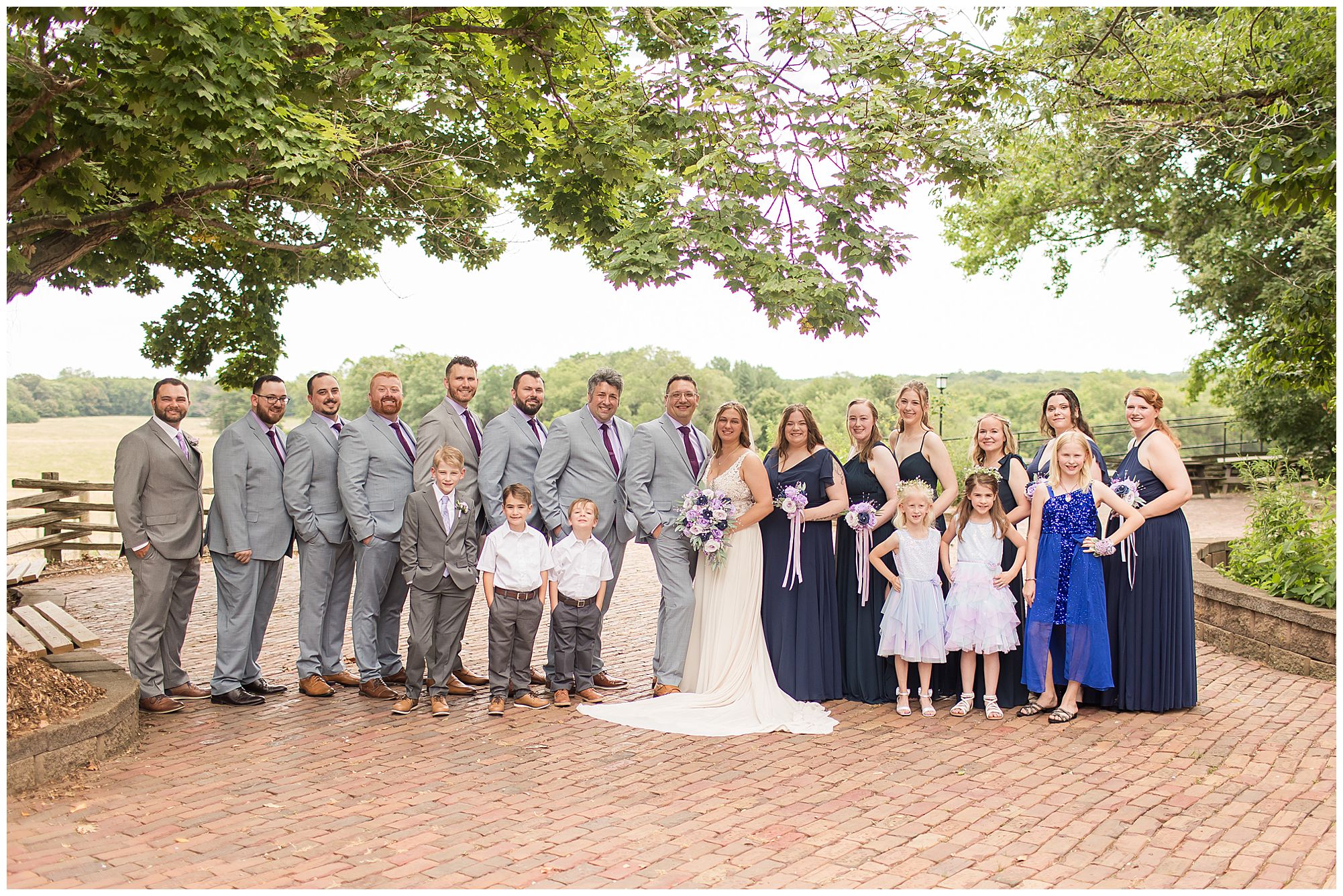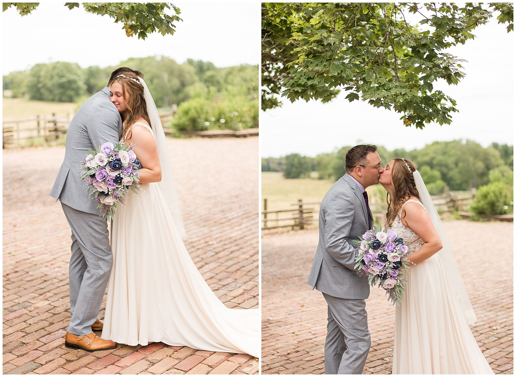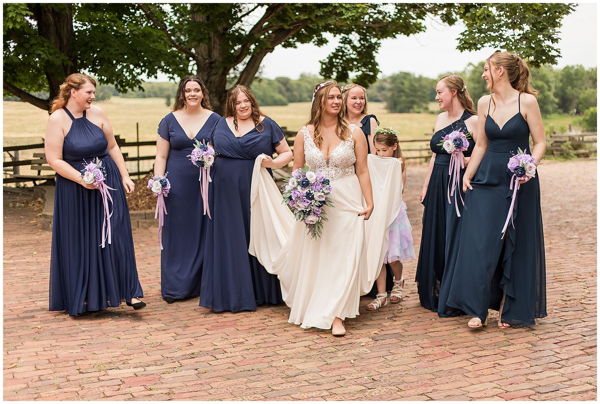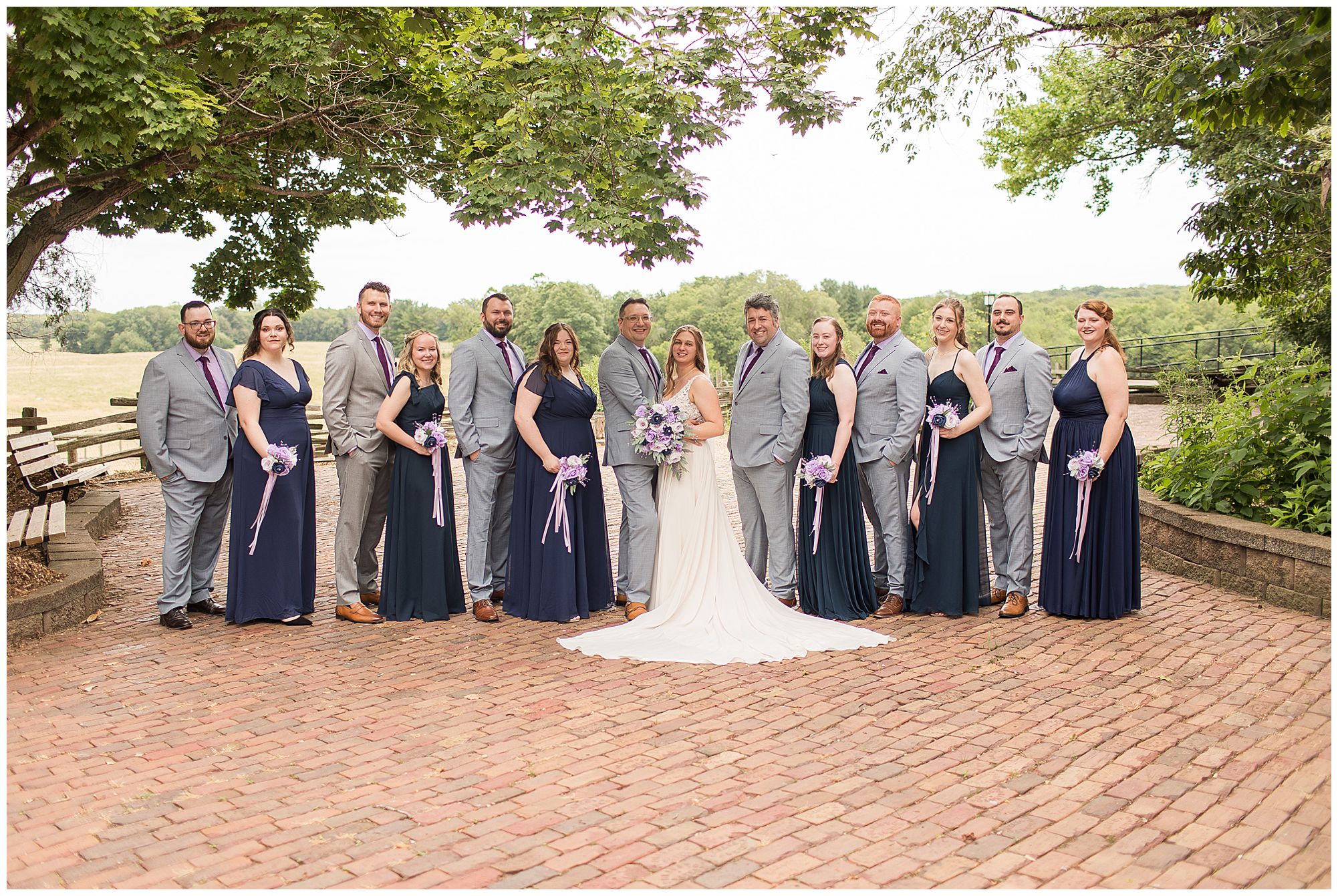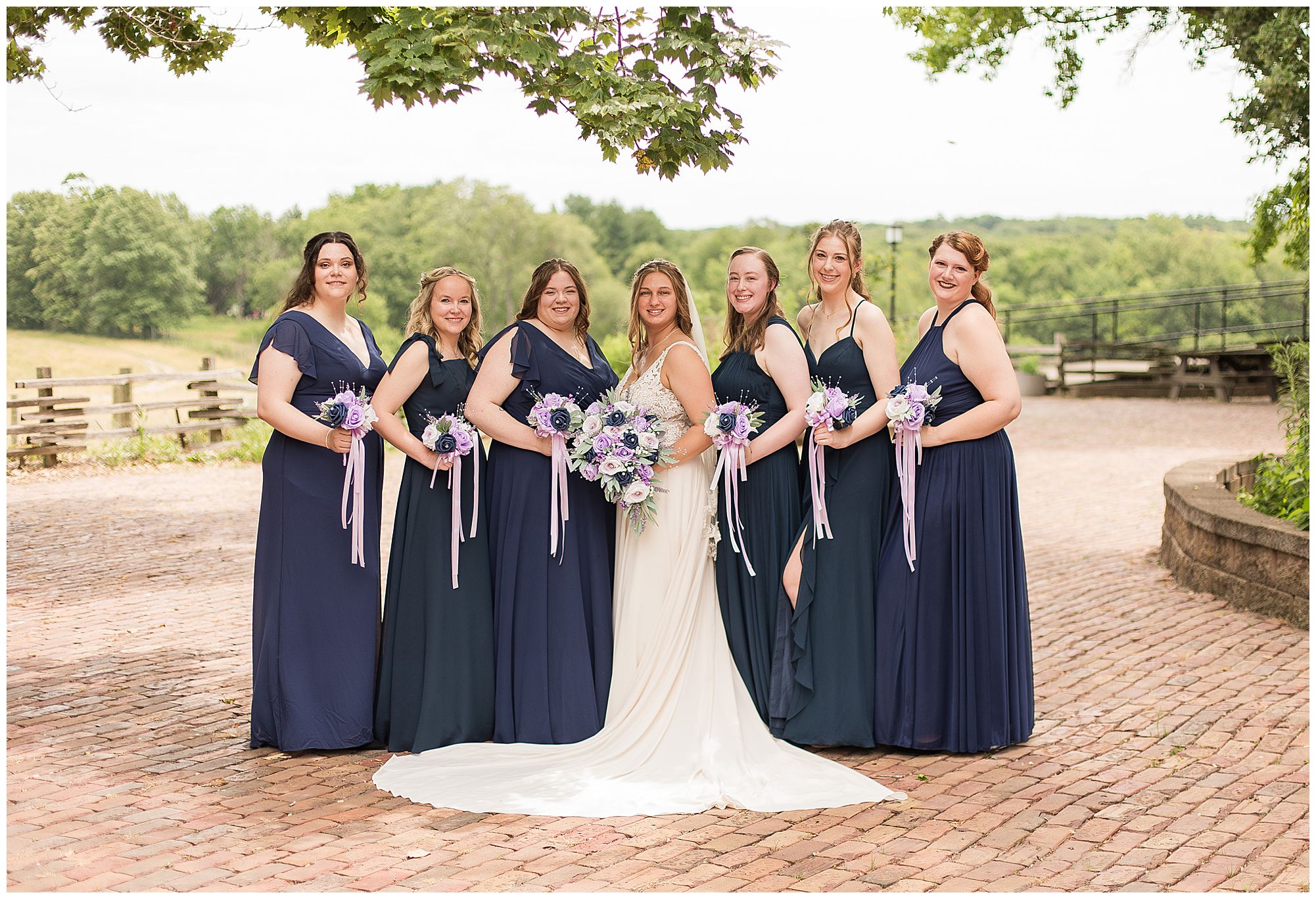 It was then time for bridal party photos with this awesome group of Hannah and Don’s family and friends! They were all polished with the ladies in different styles of navy dresses and the guys in gray suits and purple ties and matching pocket squares. The girls bouquets were delightful blooms of purples, whites, and navy. During this time, we all laughed so hard! Between the guys and their “Don Heads”, the girls giggling as they were side by side, and of course Hannah and Don having the time of their lives sharing such special moments they will never forget. They snuggled in close when it was their turn for their closeups. Though it was toasty outside, they embraced every second. They even took some time to check out the Bison roaming the grounds. But there is still one important thing we need to do…Let’s get these two married! For that, we have to head to the church!