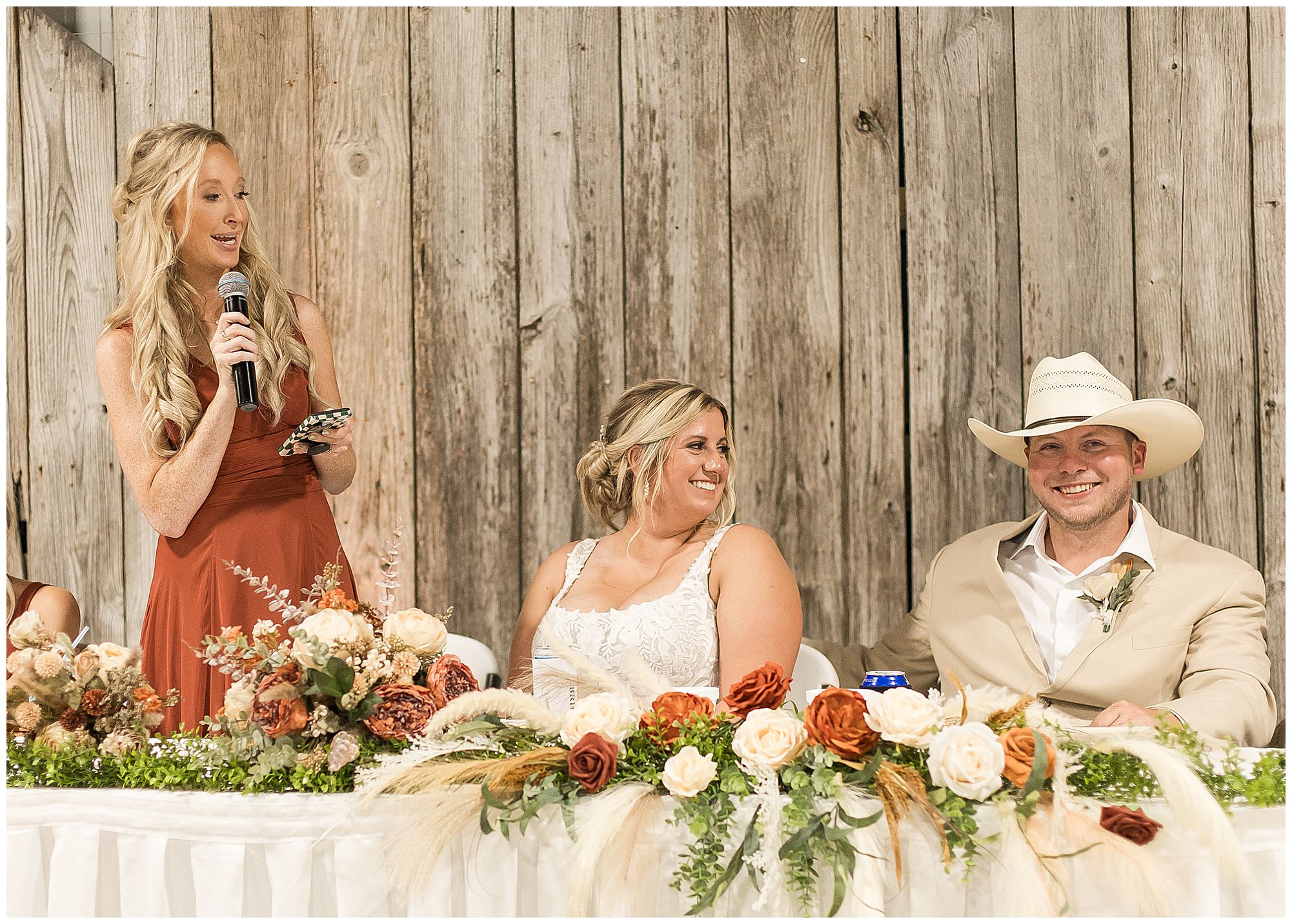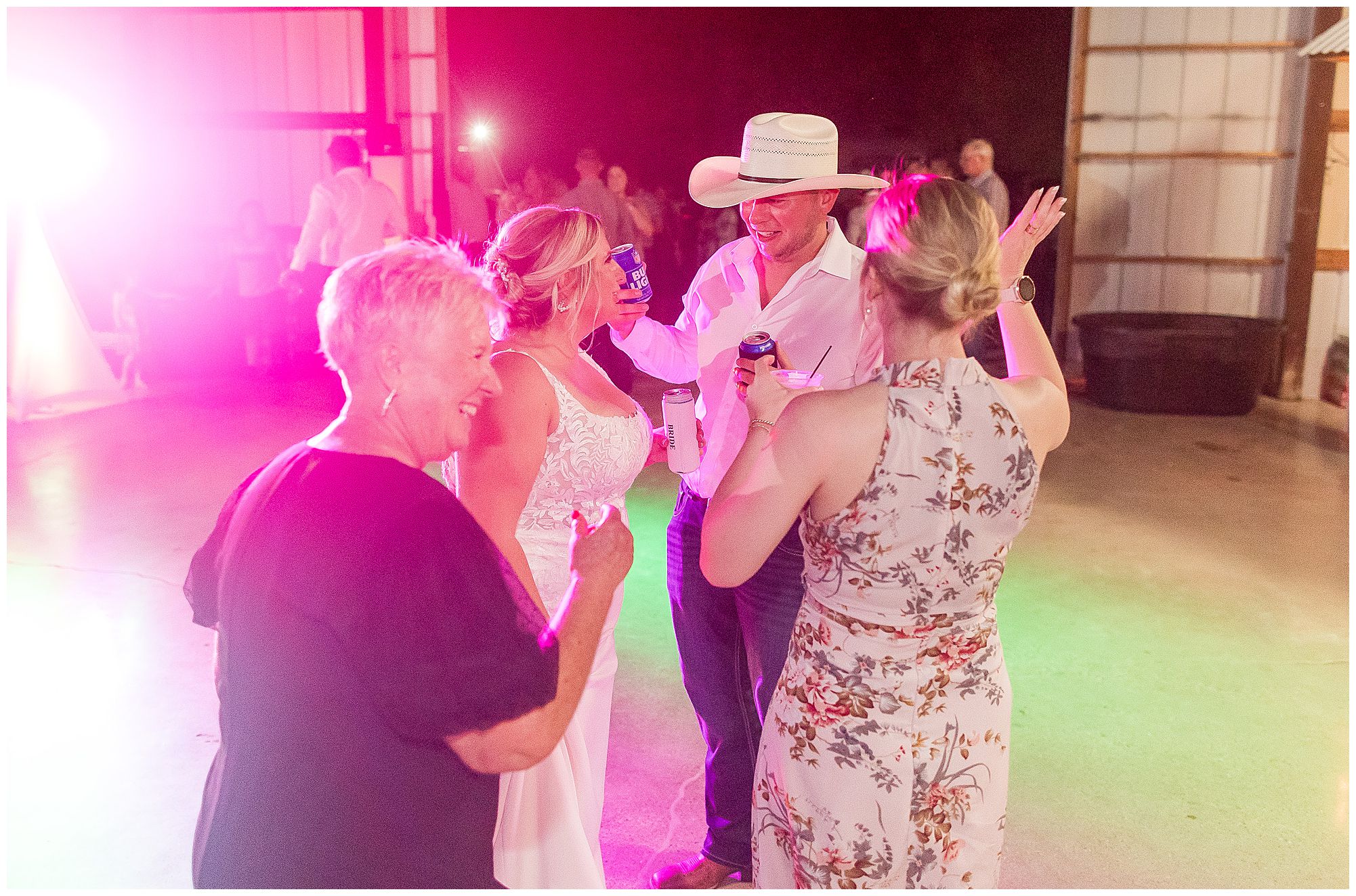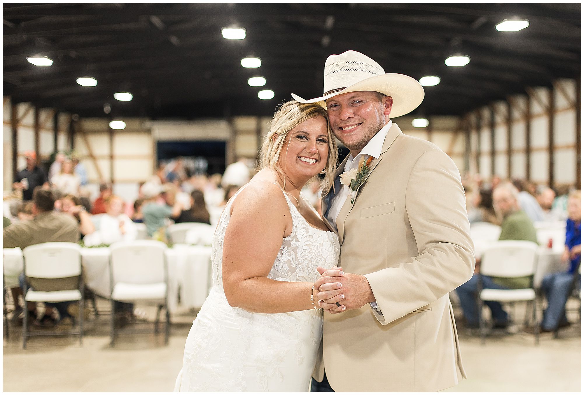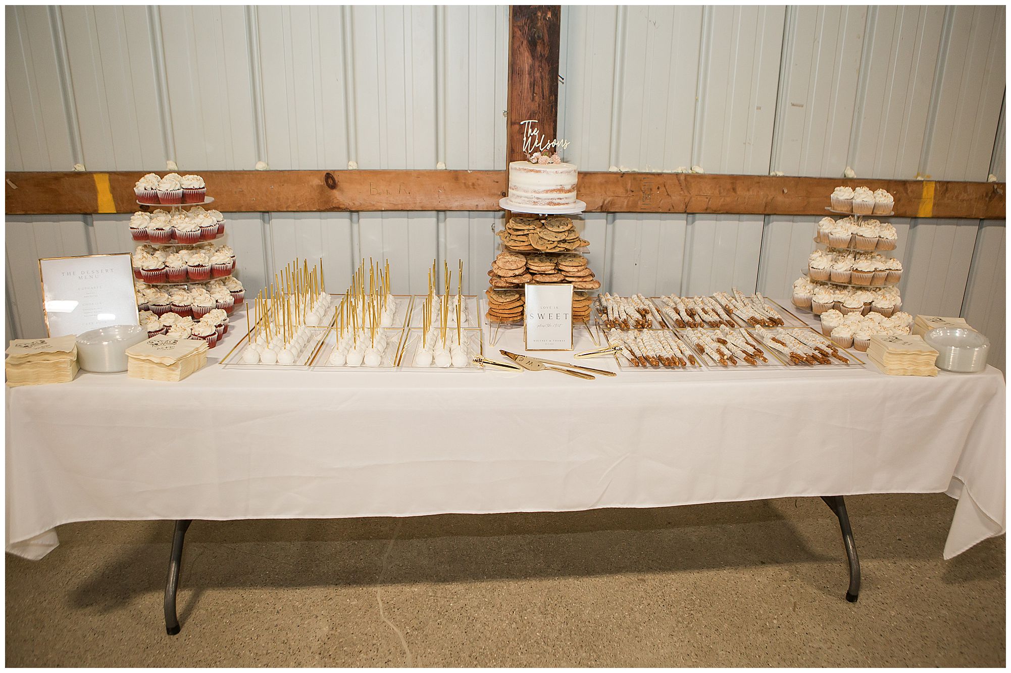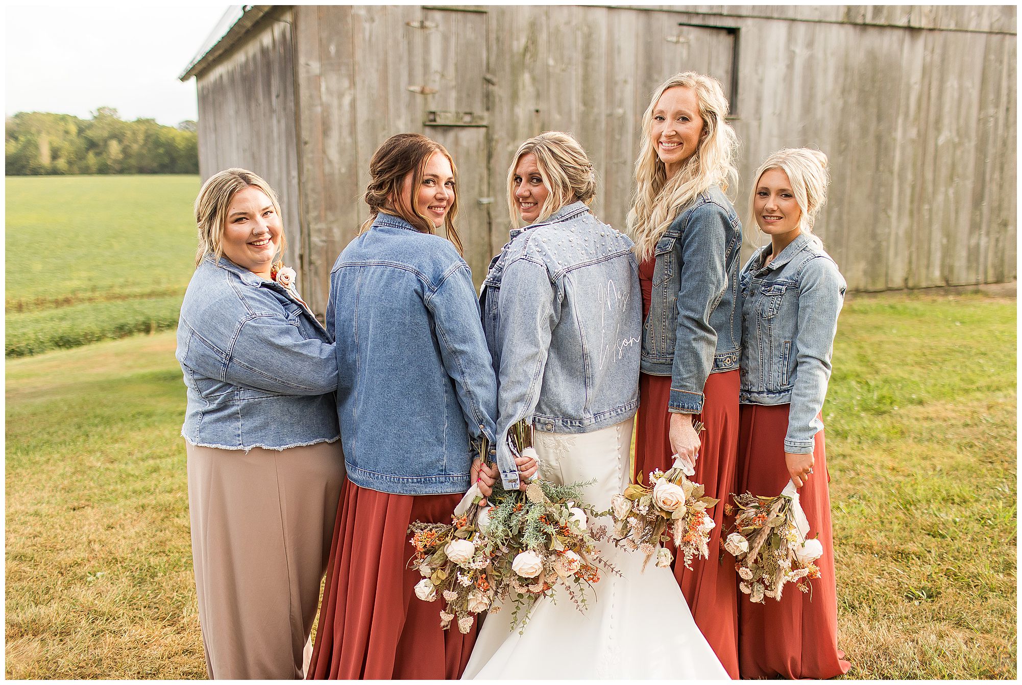 Following family photos, we headed over to a neighboring friend’s farm, where we had visited during their engagement session for a few photos in front of Whitney and Tommy’s favorite barn! The laughter was even more boisterous by now and the excitement for the newlyweds was palpable! The girls even busted out their jean jackets so the new wifey could show off her new last name! We finished with a few “Just Married” photos of these cuties before they boarded the bus to take them all to the reception at The Bates Building on the Macoupin County Fairgrounds. The family style tables were set with rustic fall decor of wooden centerpieces and lanterns along with greenery and pampas grass. The dessert table was filled to the brim with cupcakes, cookies, and truffles all mouthwatering and ready to snag. Complete with napkins of their two pups. Whitney and Tommy didn’t want to spend a ton of time on formalities and listened to a few toasts by their two maids of honor and best man. Then the couple danced their first dance before she took a spin around the dance floor with her dad and he danced with his mom. Then the party got underway and the newlyweds spent the rest of the evening celebrating with family and friends! Whitney and Tommy’s day was light-hearted, sweet, and full of down on the farm fun. I loved every second of their day and wish them all the best in their love and blessed marriage!