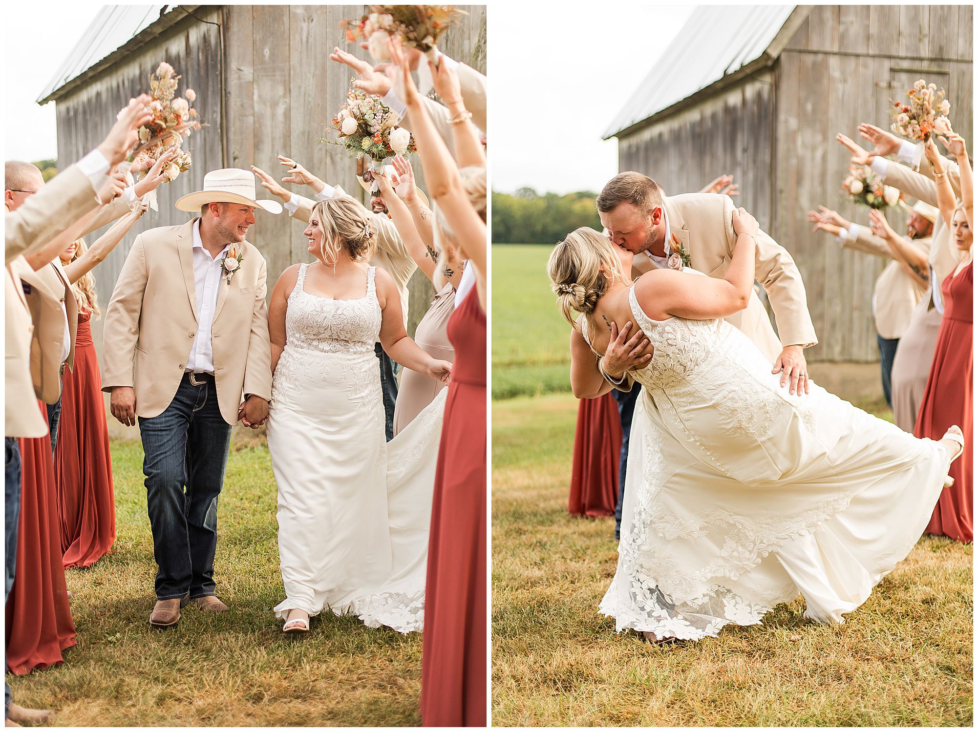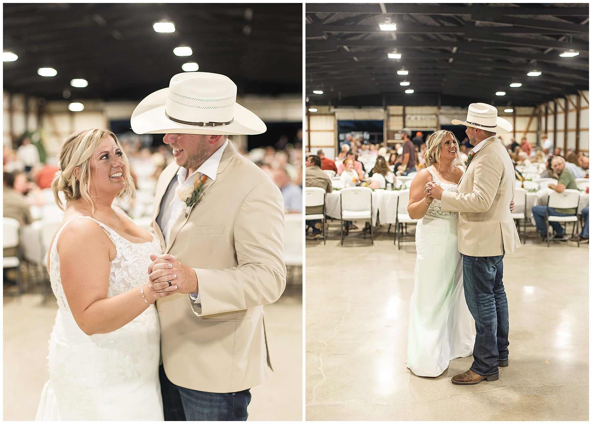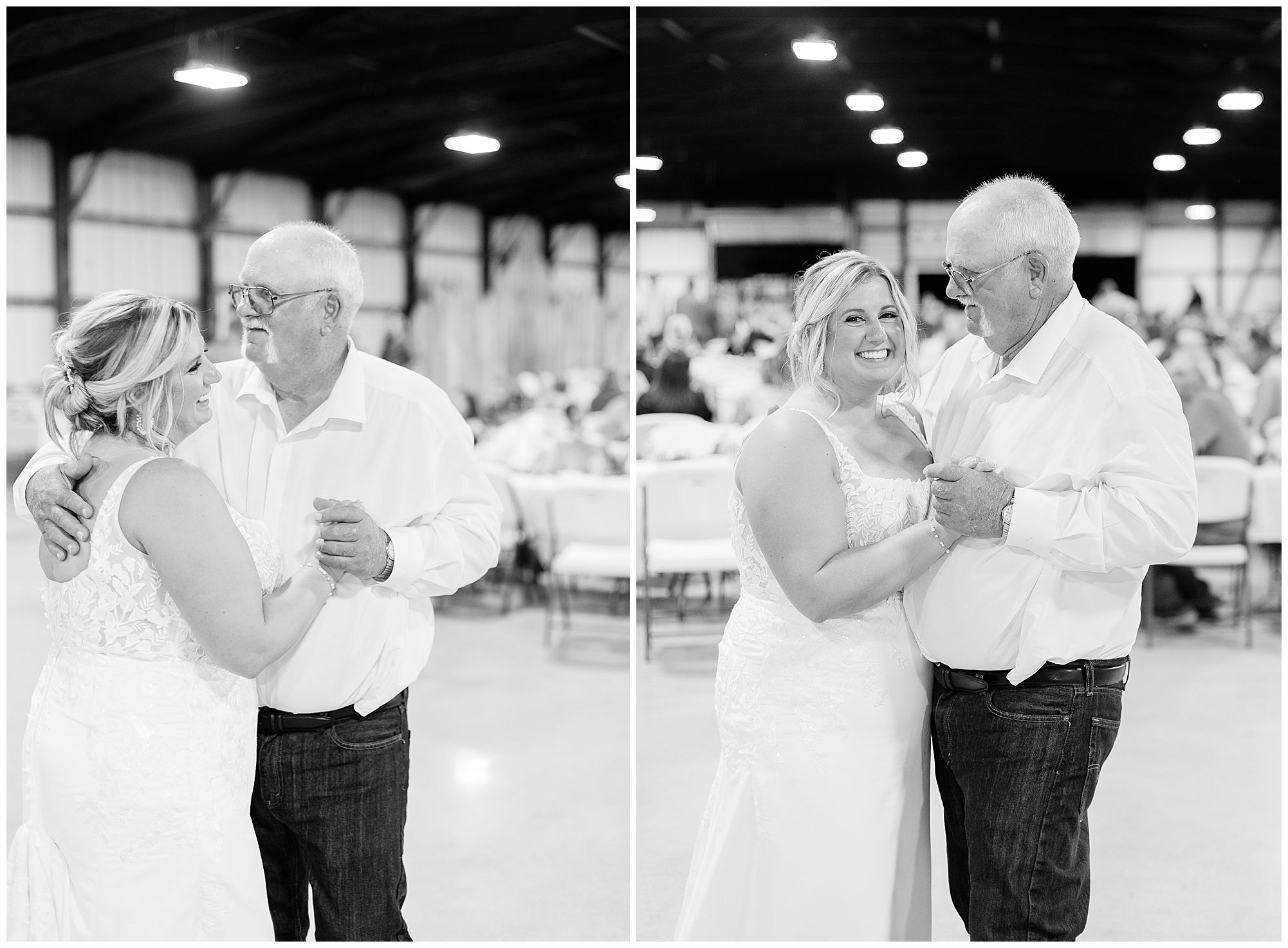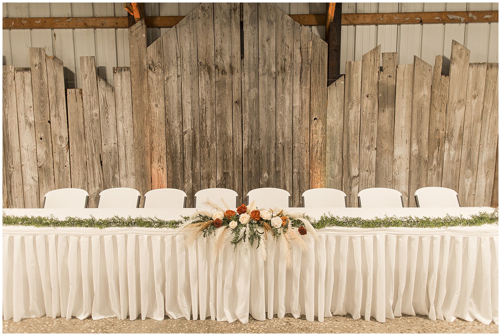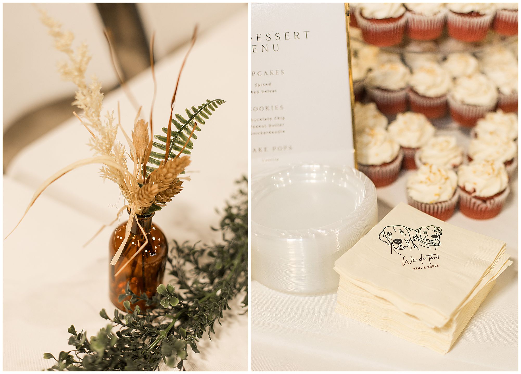 Following family photos, we headed over to a neighboring friend’s farm, where we had visited during their engagement session for a few photos in front of Whitney and Tommy’s favorite barn! The laughter was even more boisterous by now and the excitement for the newlyweds was palpable! The girls even busted out their jean jackets so the new wifey could show off her new last name! We finished with a few “Just Married” photos of these cuties before they boarded the bus to take them all to the reception at The Bates Building on the Macoupin County Fairgrounds. The family style tables were set with rustic fall decor of wooden centerpieces and lanterns along with greenery and pampas grass. The dessert table was filled to the brim with cupcakes, cookies, and truffles all mouthwatering and ready to snag. Complete with napkins of their two pups. Whitney and Tommy didn’t want to spend a ton of time on formalities and listened to a few toasts by their two maids of honor and best man. Then the couple danced their first dance before she took a spin around the dance floor with her dad and he danced with his mom. Then the party got underway and the newlyweds spent the rest of the evening celebrating with family and friends! Whitney and Tommy’s day was light-hearted, sweet, and full of down on the farm fun. I loved every second of their day and wish them all the best in their love and blessed marriage!