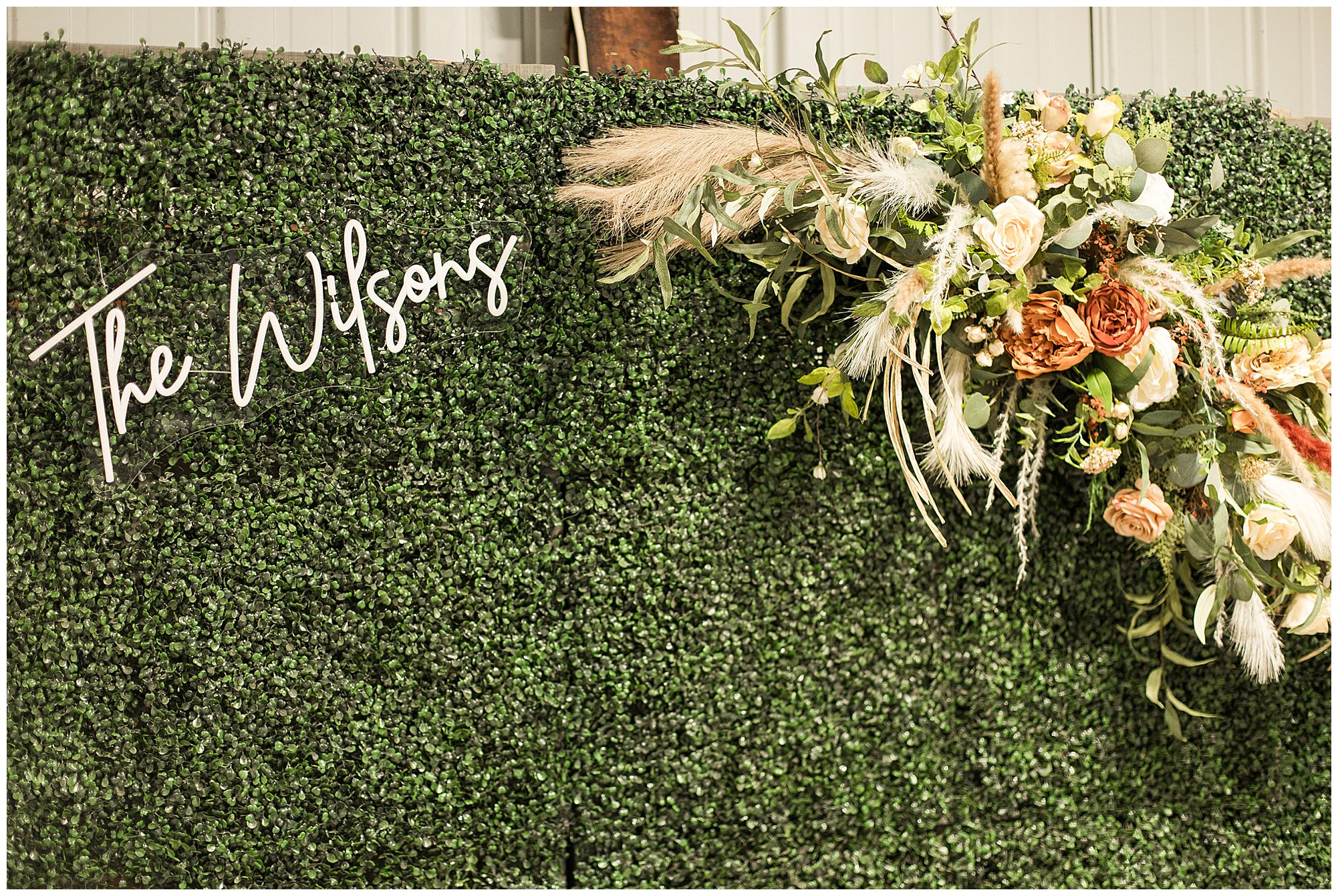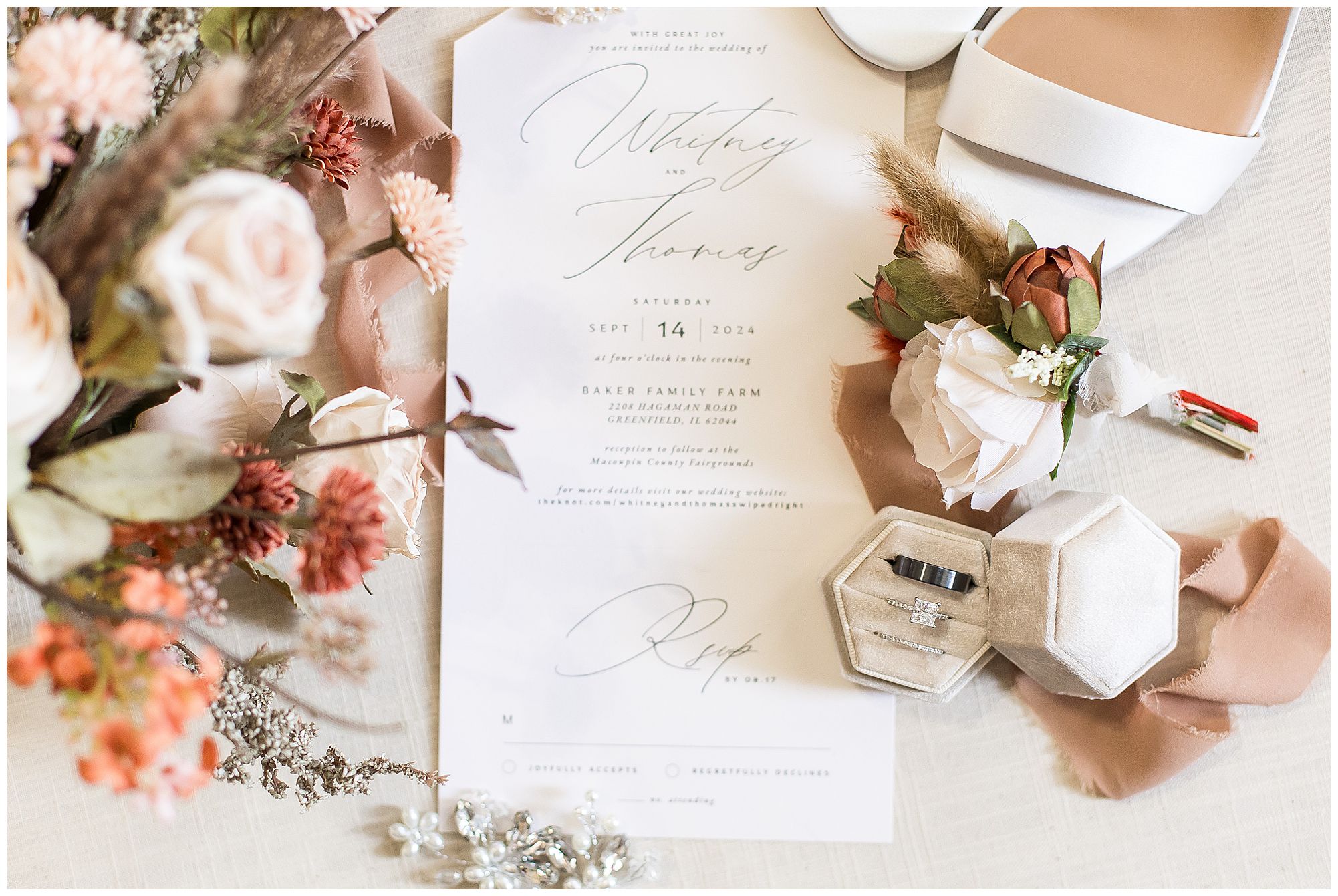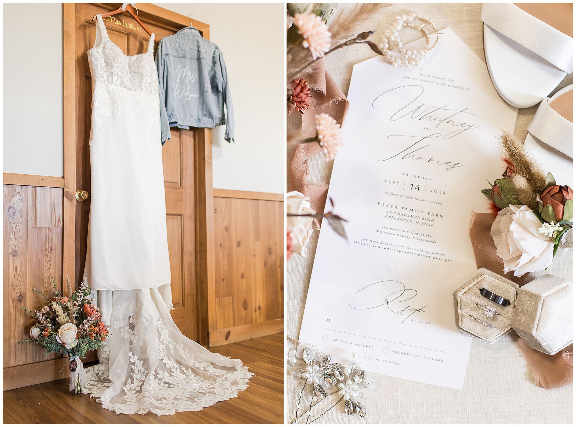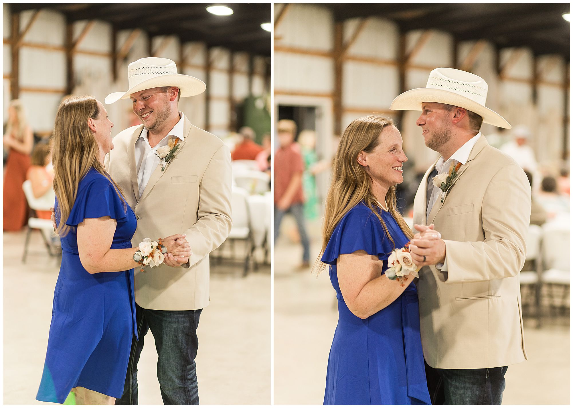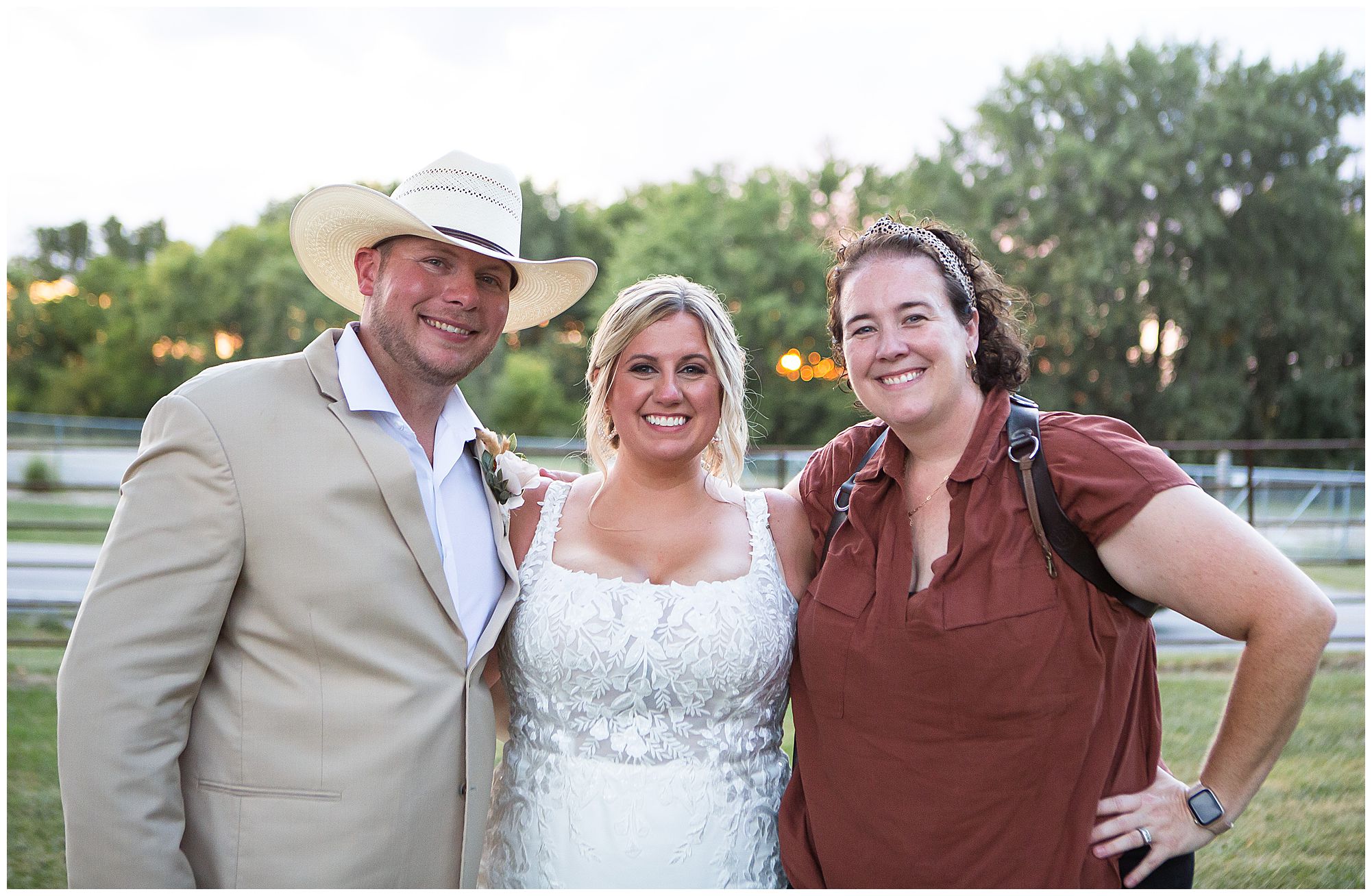 Following family photos, we headed over to a neighboring friend’s farm, where we had visited during their engagement session for a few photos in front of Whitney and Tommy’s favorite barn! The laughter was even more boisterous by now and the excitement for the newlyweds was palpable! The girls even busted out their jean jackets so the new wifey could show off her new last name! We finished with a few “Just Married” photos of these cuties before they boarded the bus to take them all to the reception at The Bates Building on the Macoupin County Fairgrounds. The family style tables were set with rustic fall decor of wooden centerpieces and lanterns along with greenery and pampas grass. The dessert table was filled to the brim with cupcakes, cookies, and truffles all mouthwatering and ready to snag. Complete with napkins of their two pups. Whitney and Tommy didn’t want to spend a ton of time on formalities and listened to a few toasts by their two maids of honor and best man. Then the couple danced their first dance before she took a spin around the dance floor with her dad and he danced with his mom. Then the party got underway and the newlyweds spent the rest of the evening celebrating with family and friends! Whitney and Tommy’s day was light-hearted, sweet, and full of down on the farm fun. I loved every second of their day and wish them all the best in their love and blessed marriage!