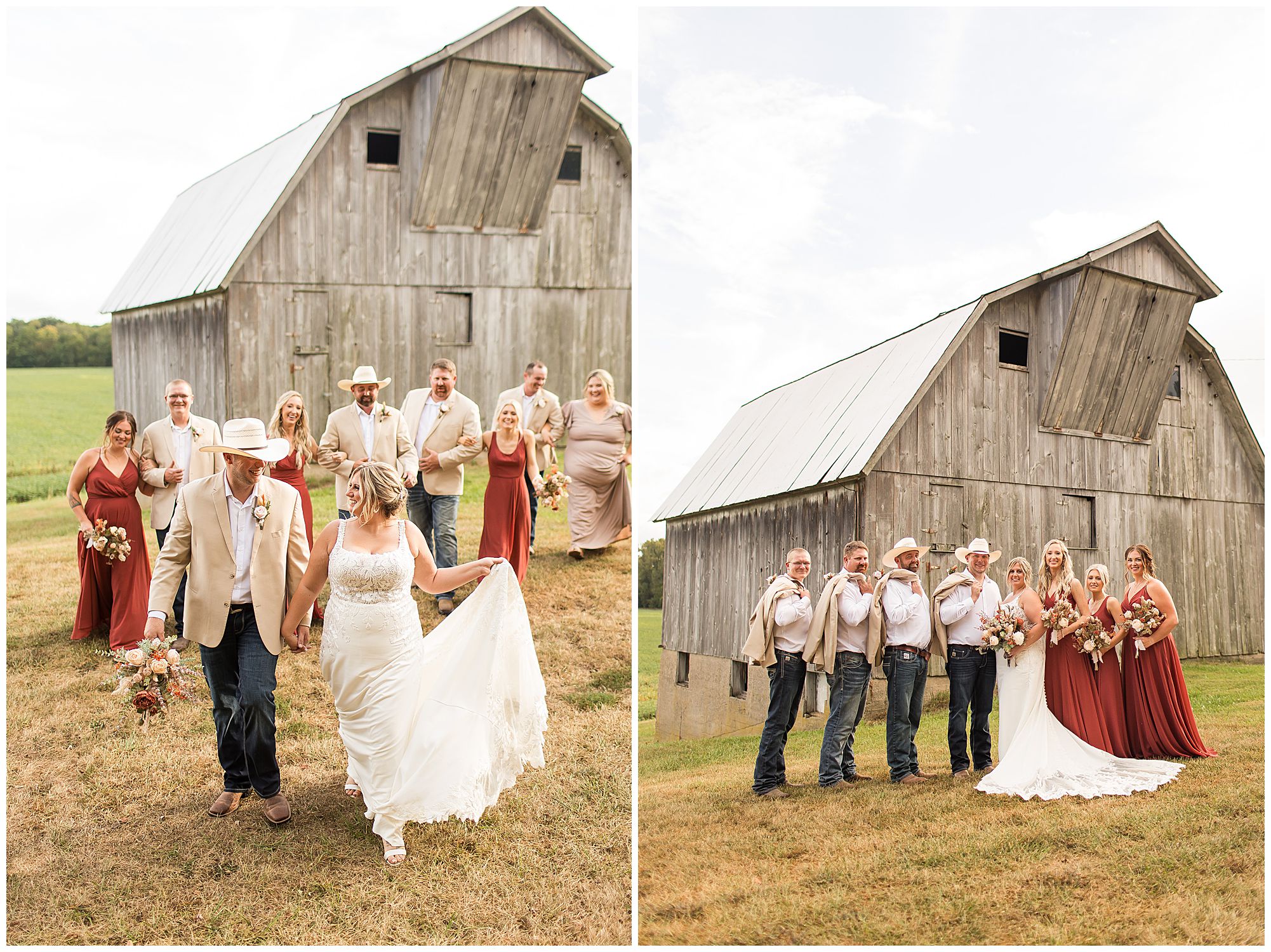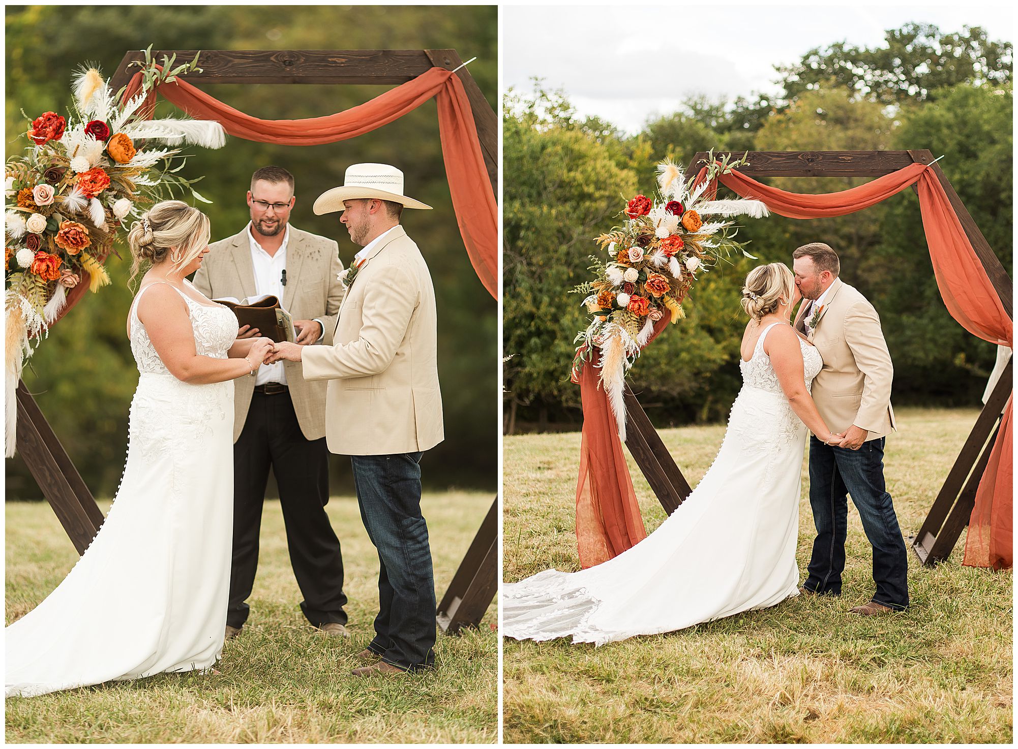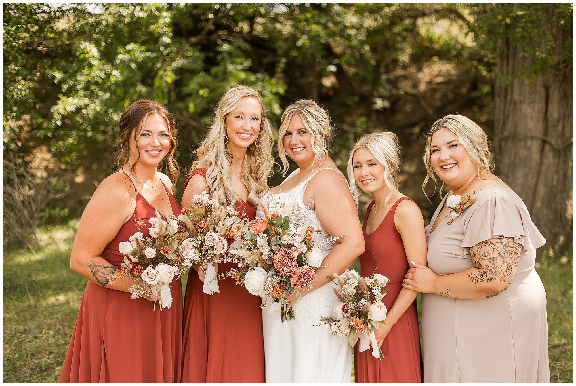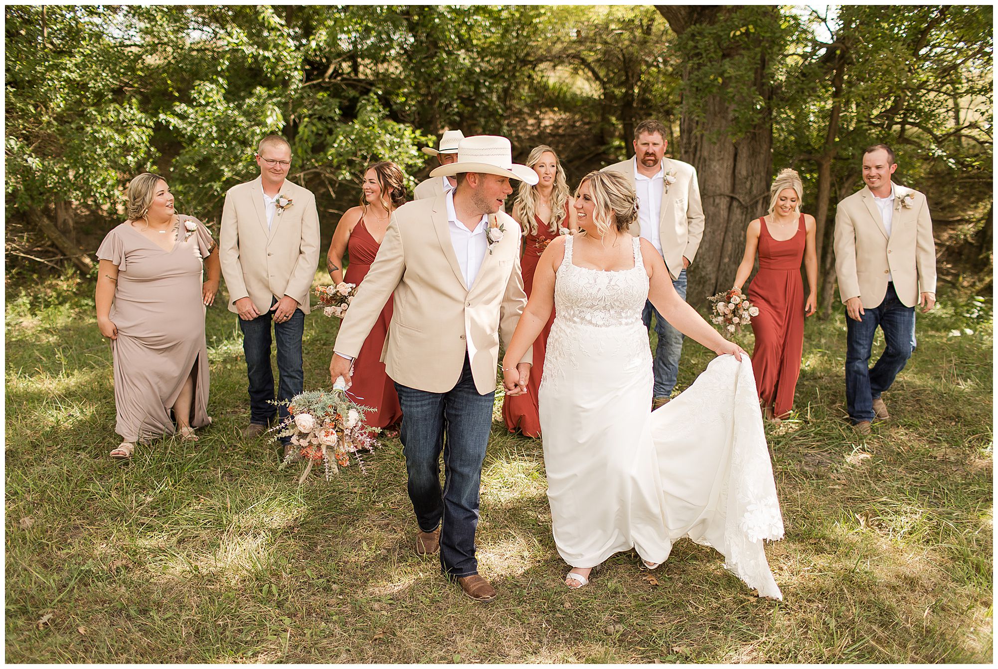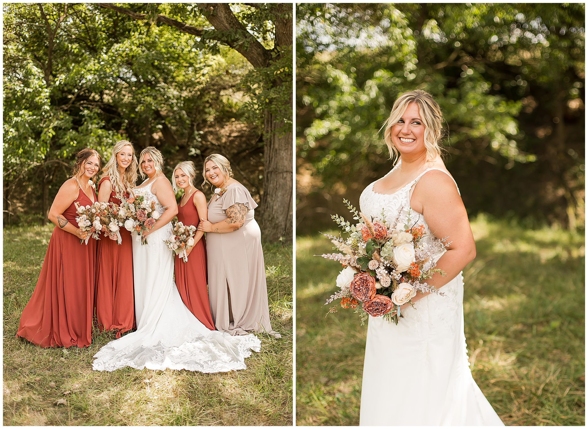 The Baker Family Farm has been part of Whitney’s history since 1883. She and Tommy both live and breathe farming. They help raise the cattle, they know the land for miles around, they each work in the Ag service industry (and are even taking their honeymoon later to an Ag conference!) And one day…The Baker Farm will continue to be worked by Whitney and her family. Which is why it meant so much to her to hold her and Tommy’s nuptials on this farm! Their mid-September wedding day was warmer than predicted, but the sun was out and it was lovely! Whitney and her ladies got ready at her dad’s house right in front of where the ceremony was going to be held, making logistics for the day super easy. The color pallet of burnt orange, tan, and greenery along with lots of fall textures made such a statement when it came time for details and the bridesmaids to get dressed. Whitney also had a first for me with her friend, Teddy, standing in and helping out as an, “Usherette”! Love the coined new term! Then it was time for Whitney to step into her gown and this moment was special. She was beaming with joy as she stood in her lace dress with buttons all the way down the long train. Her ladies assisted her with all the final details before she had a first look with her dad followed by Tommy. Both her dad and her soon-to-be husband grinned from ear to ear when they saw this beautiful bride! Tommy got a little emotional while he and Whitney took some time to read private vows to one another. So sweet! Before we get these two hitched though, they decided to knock out some photos!
