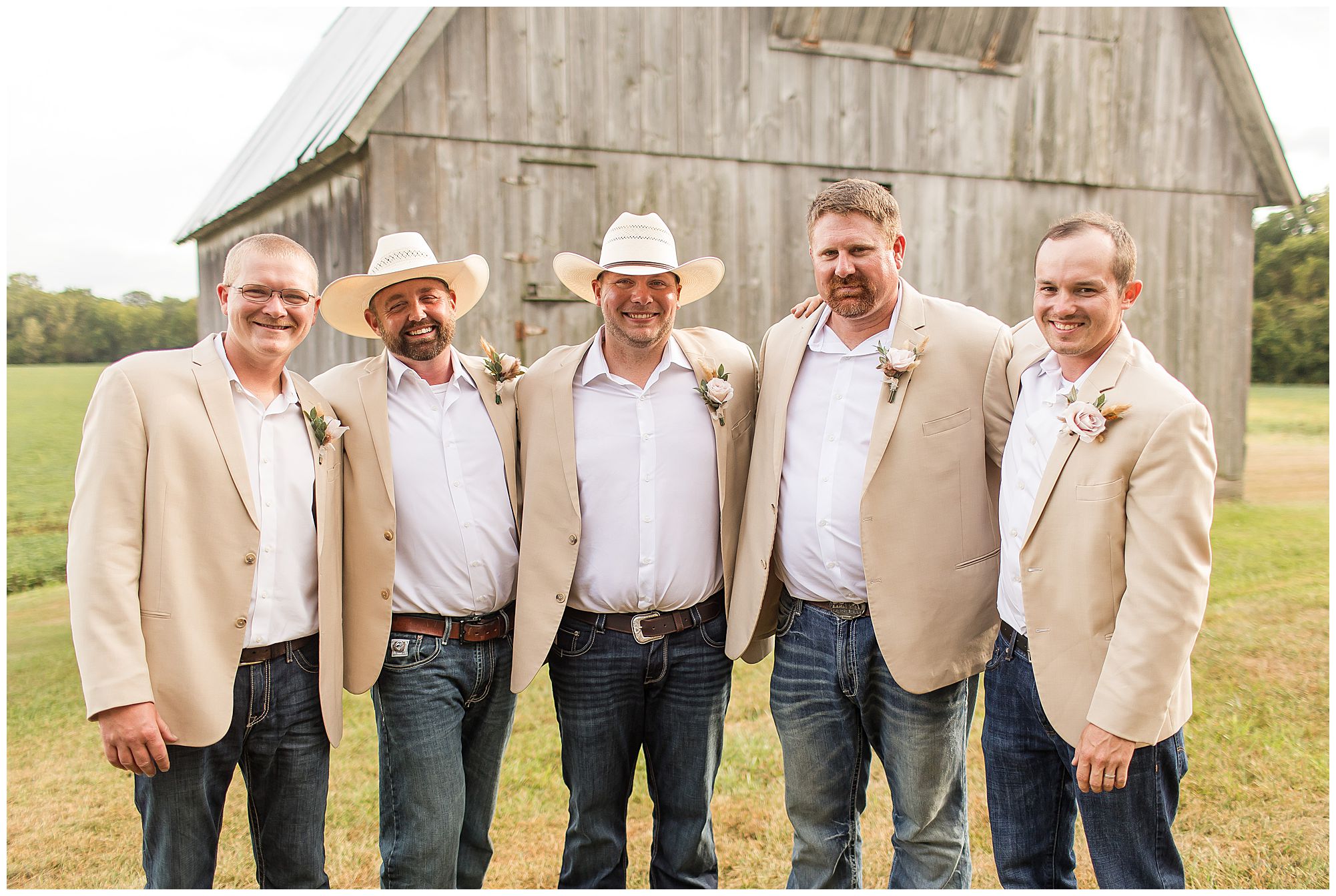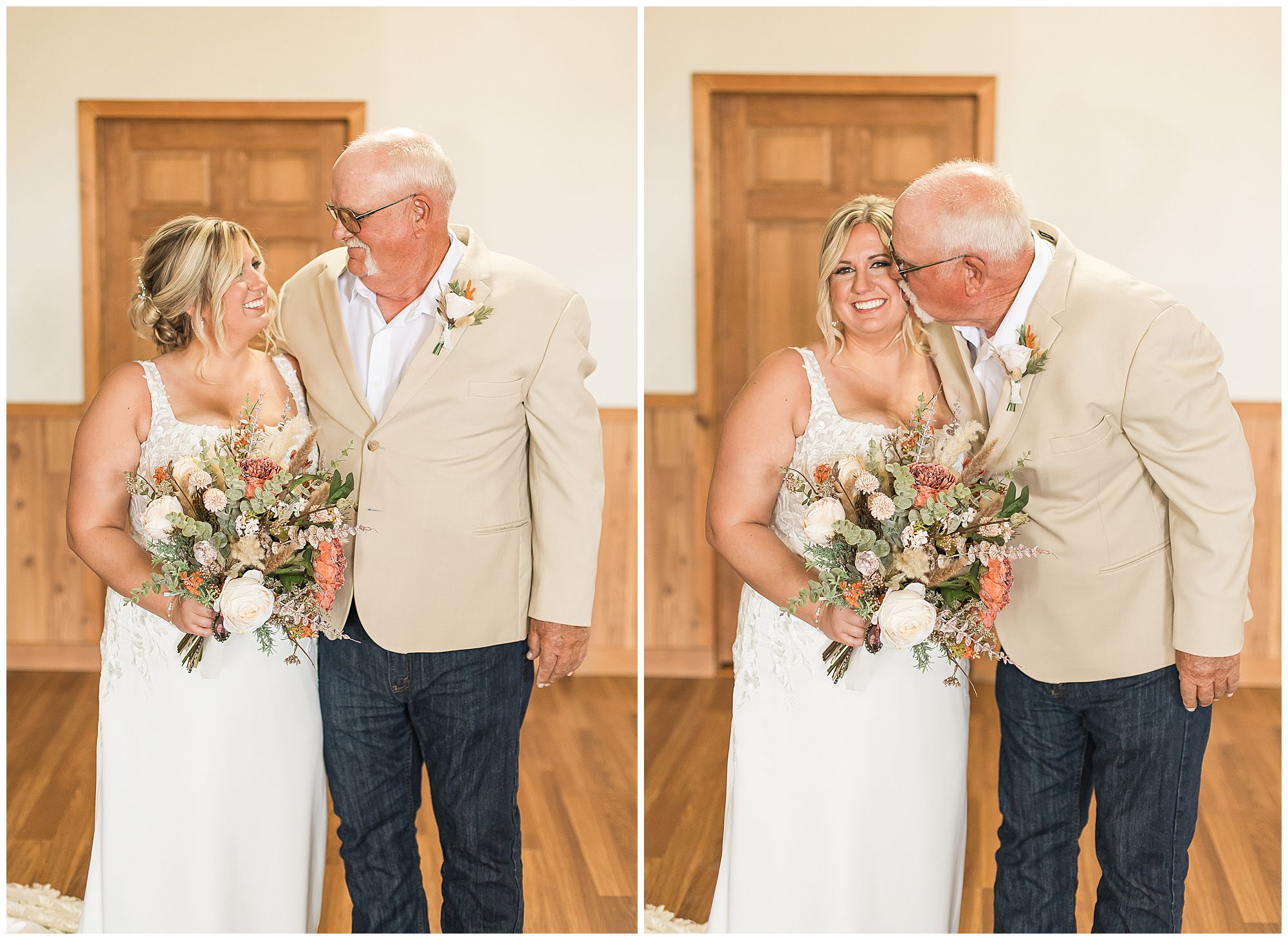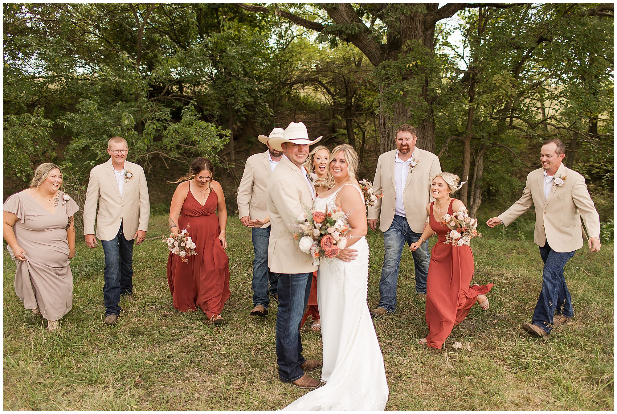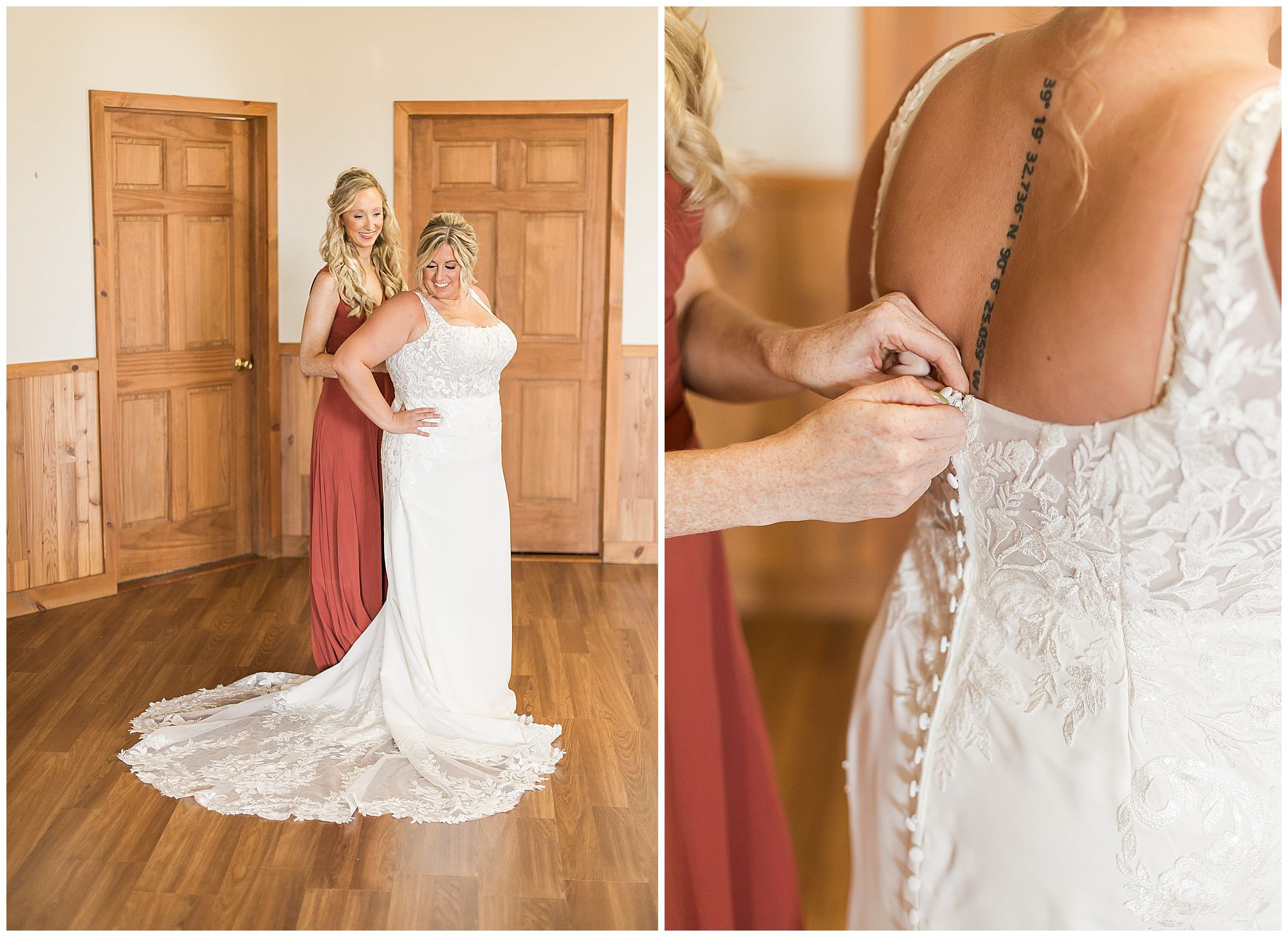 The Baker Family Farm has been part of Whitney’s history since 1883. She and Tommy both live and breathe farming. They help raise the cattle, they know the land for miles around, they each work in the Ag service industry (and are even taking their honeymoon later to an Ag conference!) And one day…The Baker Farm will continue to be worked by Whitney and her family. Which is why it meant so much to her to hold her and Tommy’s nuptials on this farm! Their mid-September wedding day was warmer than predicted, but the sun was out and it was lovely! Whitney and her ladies got ready at her dad’s house right in front of where the ceremony was going to be held, making logistics for the day super easy. The color pallet of burnt orange, tan, and greenery along with lots of fall textures made such a statement when it came time for details and the bridesmaids to get dressed. Whitney also had a first for me with her friend, Teddy, standing in and helping out as an, “Usherette”! Love the coined new term! Then it was time for Whitney to step into her gown and this moment was special. She was beaming with joy as she stood in her lace dress with buttons all the way down the long train. Her ladies assisted her with all the final details before she had a first look with her dad followed by Tommy. Both her dad and her soon-to-be husband grinned from ear to ear when they saw this beautiful bride! Tommy got a little emotional while he and Whitney took some time to read private vows to one another. So sweet! Before we get these two hitched though, they decided to knock out some photos!